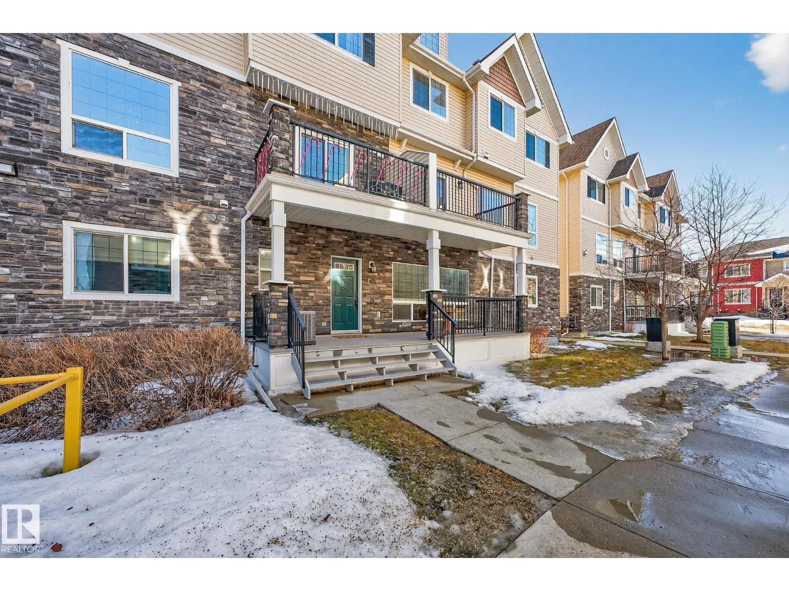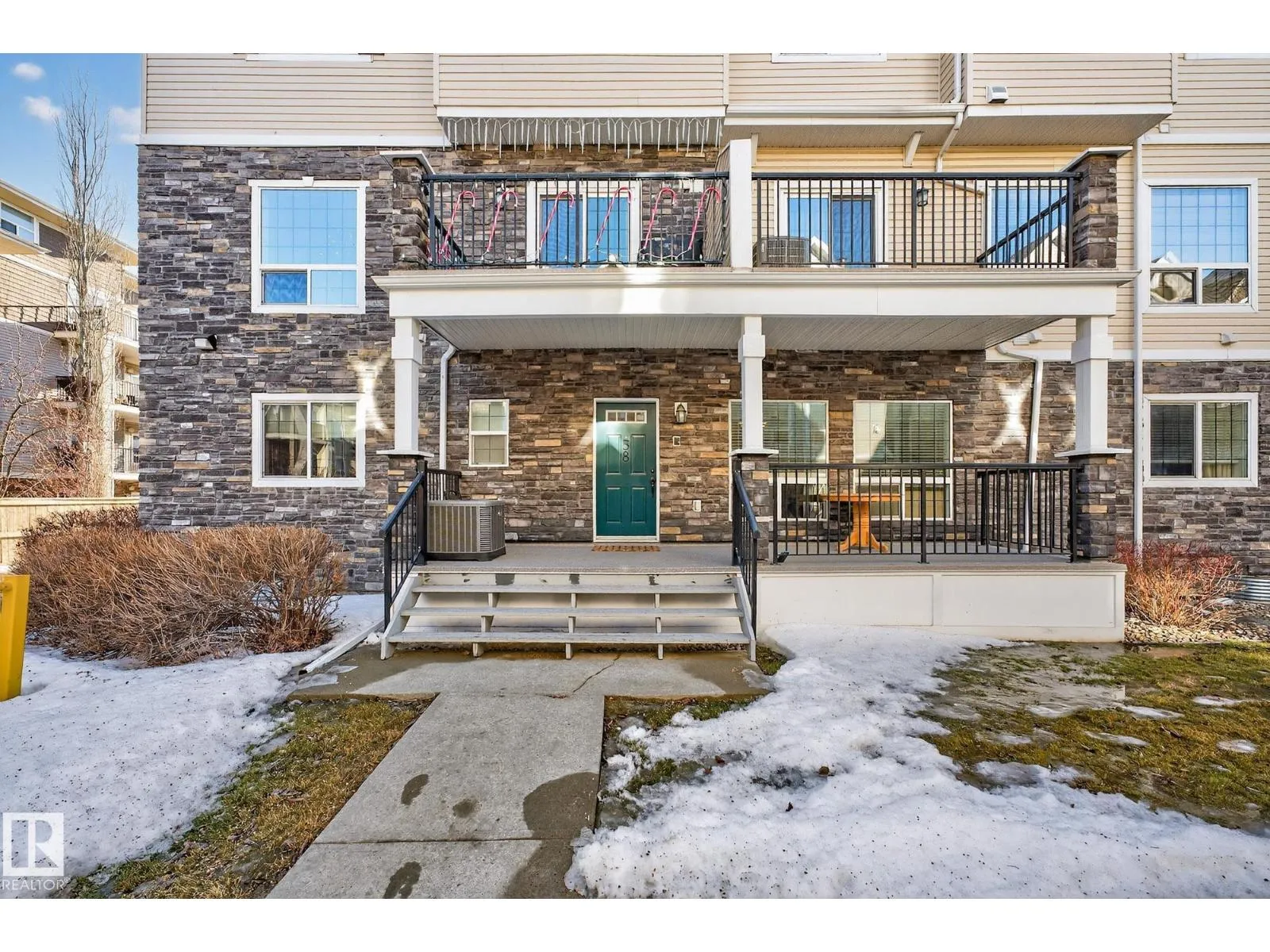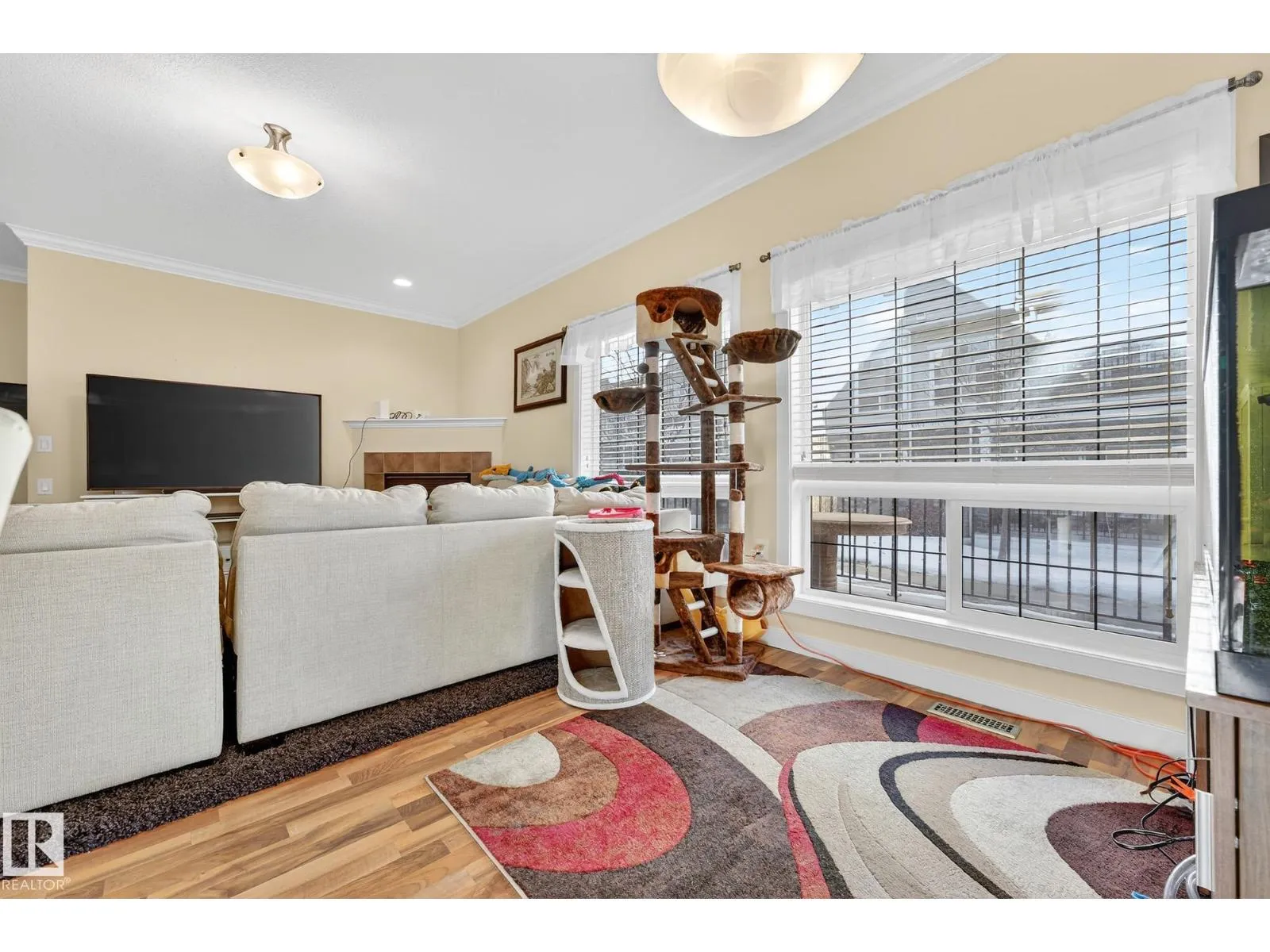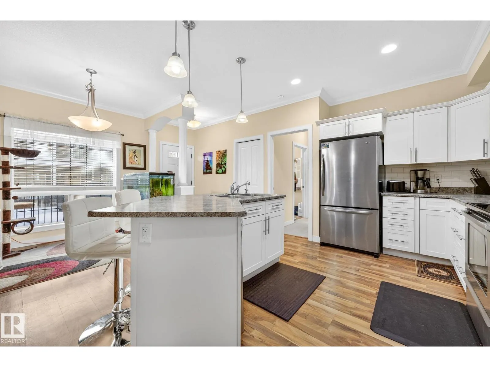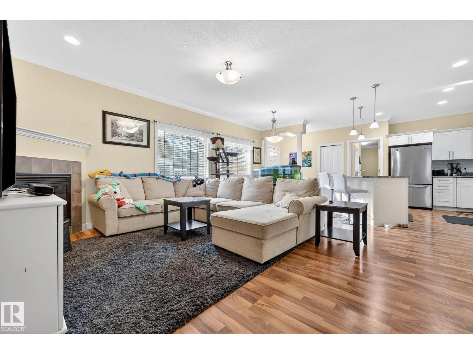 Nestled in a quiet southwest Edmonton community, this thoughtfully designed bungalow-style townhouse offers an inviting open layout ideal for both everyday living and hosting. The modern kitchen is a standout, showcasing stainless steel appliances, sleek cabinetry, generous counter space, and a central island with seating. The dining space overlooks the front veranda and yard, flowing seamlessly into a warm living area highlighted by a gas fireplace. The primary bedroom includes a walk-in closet and a private three-piece ensuite, while the second bedroom is positioned on the opposite side of the home for added privacy, adjacent to another full three-piece bathroom. A dedicated laundry room on the main floor provides direct access to the attached single garage. Downstairs, the fully developed lower level expands your living space with a large recreation room and an additional four-piece bathroom. An exceptional opportunity to enjoy comfort, function, and tranquility in a beautiful setting. (id:27476)