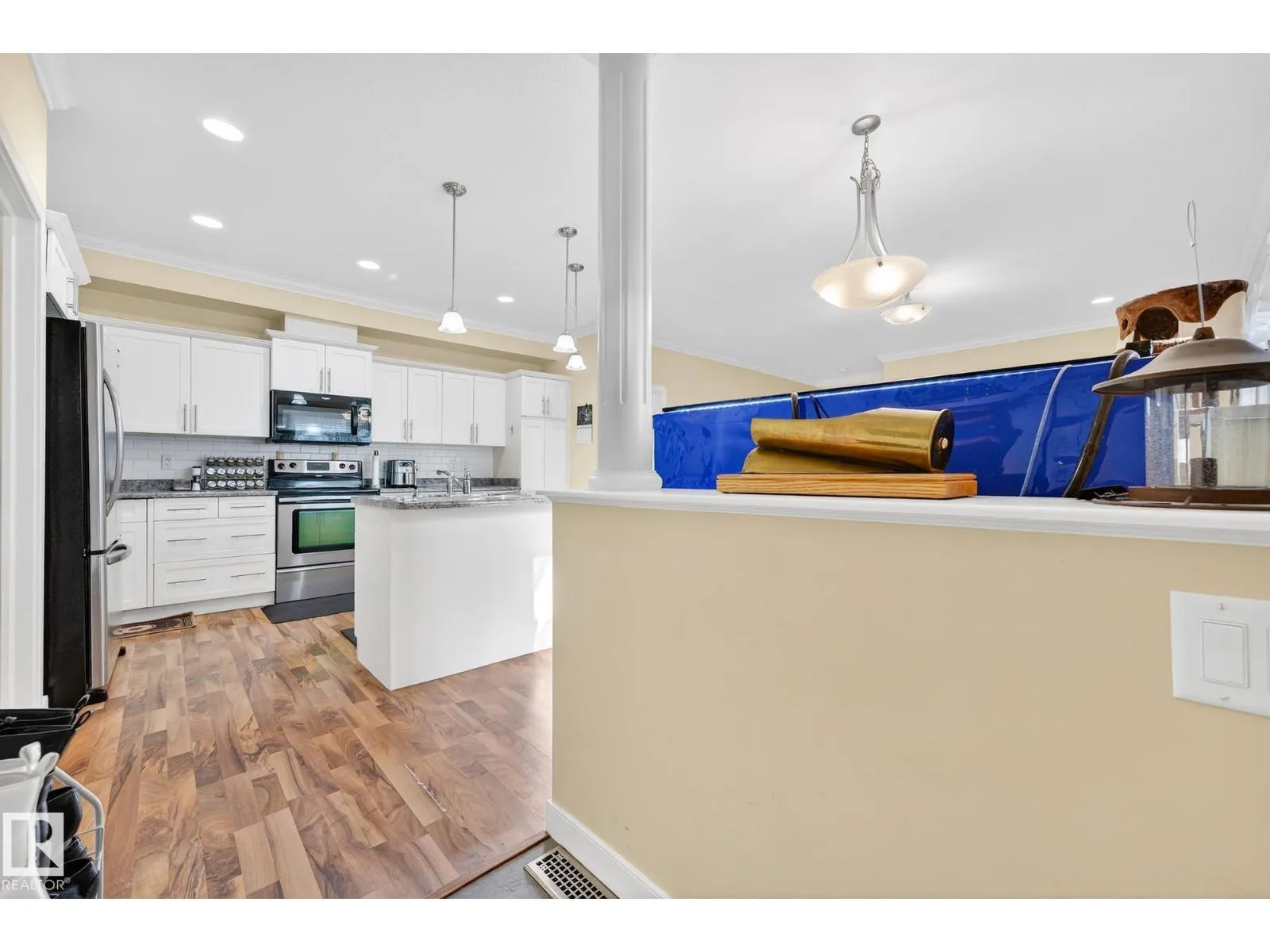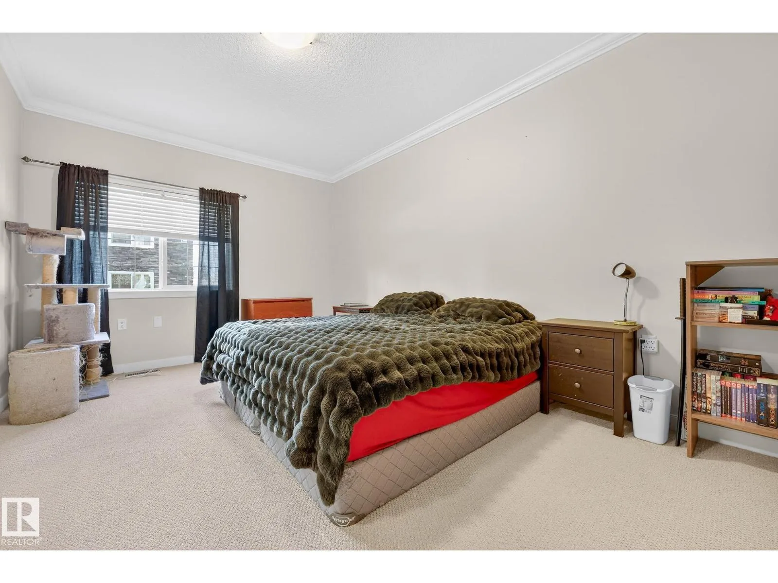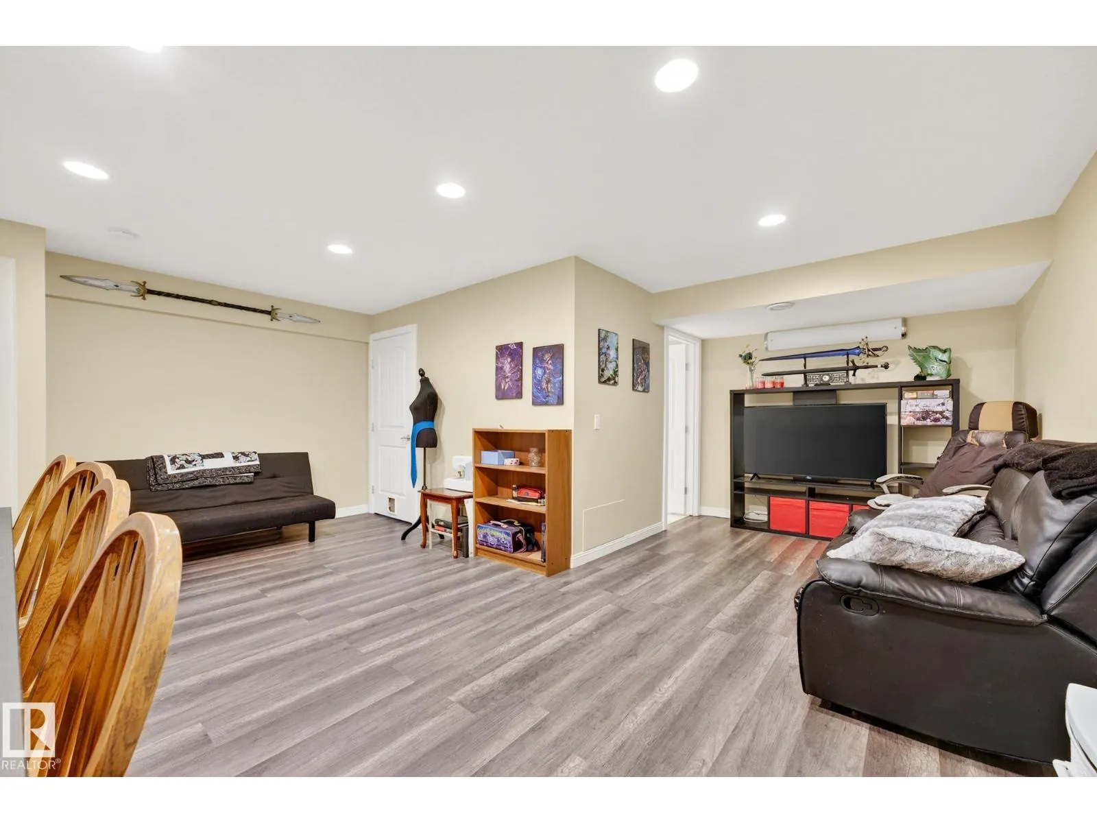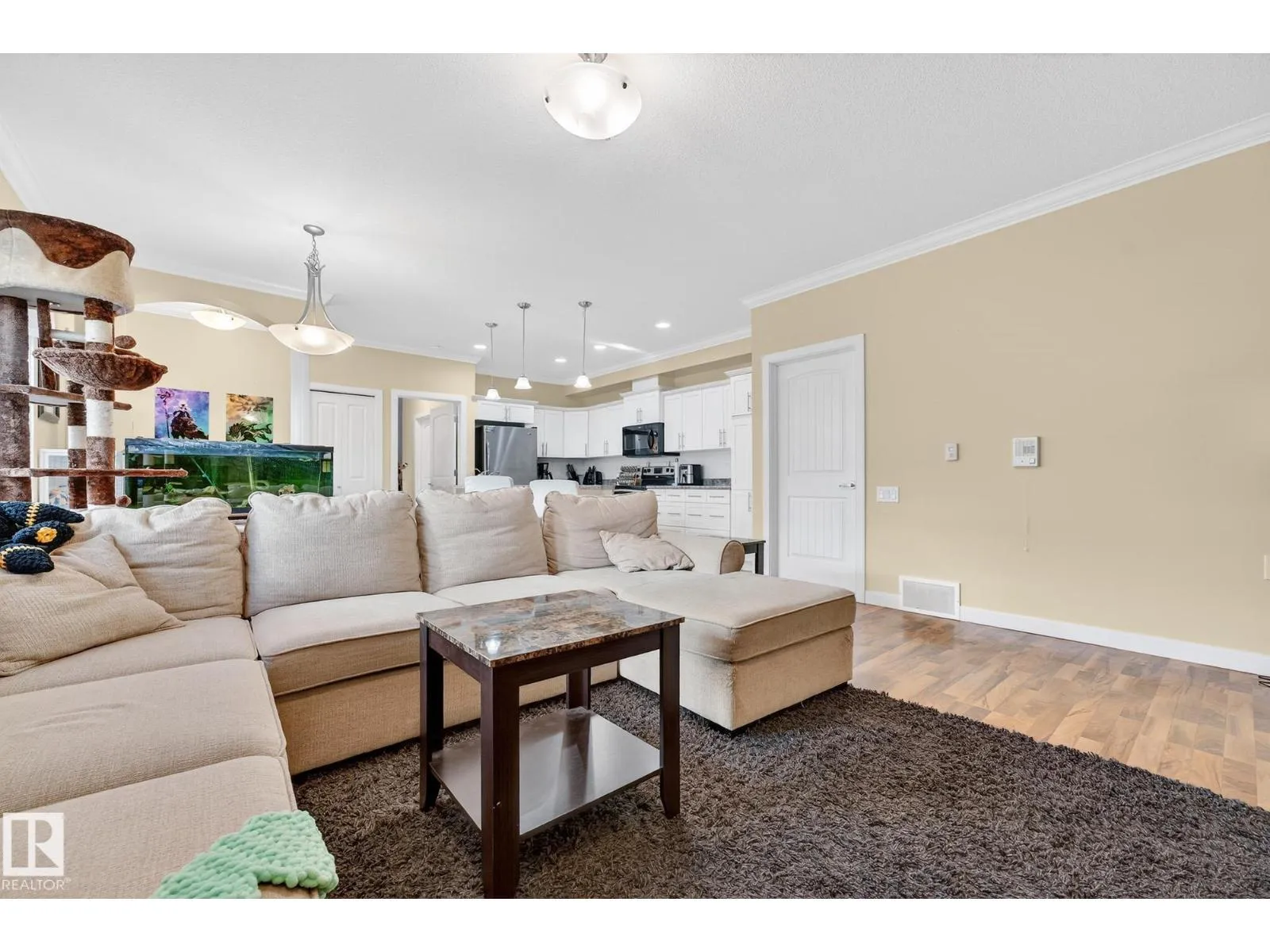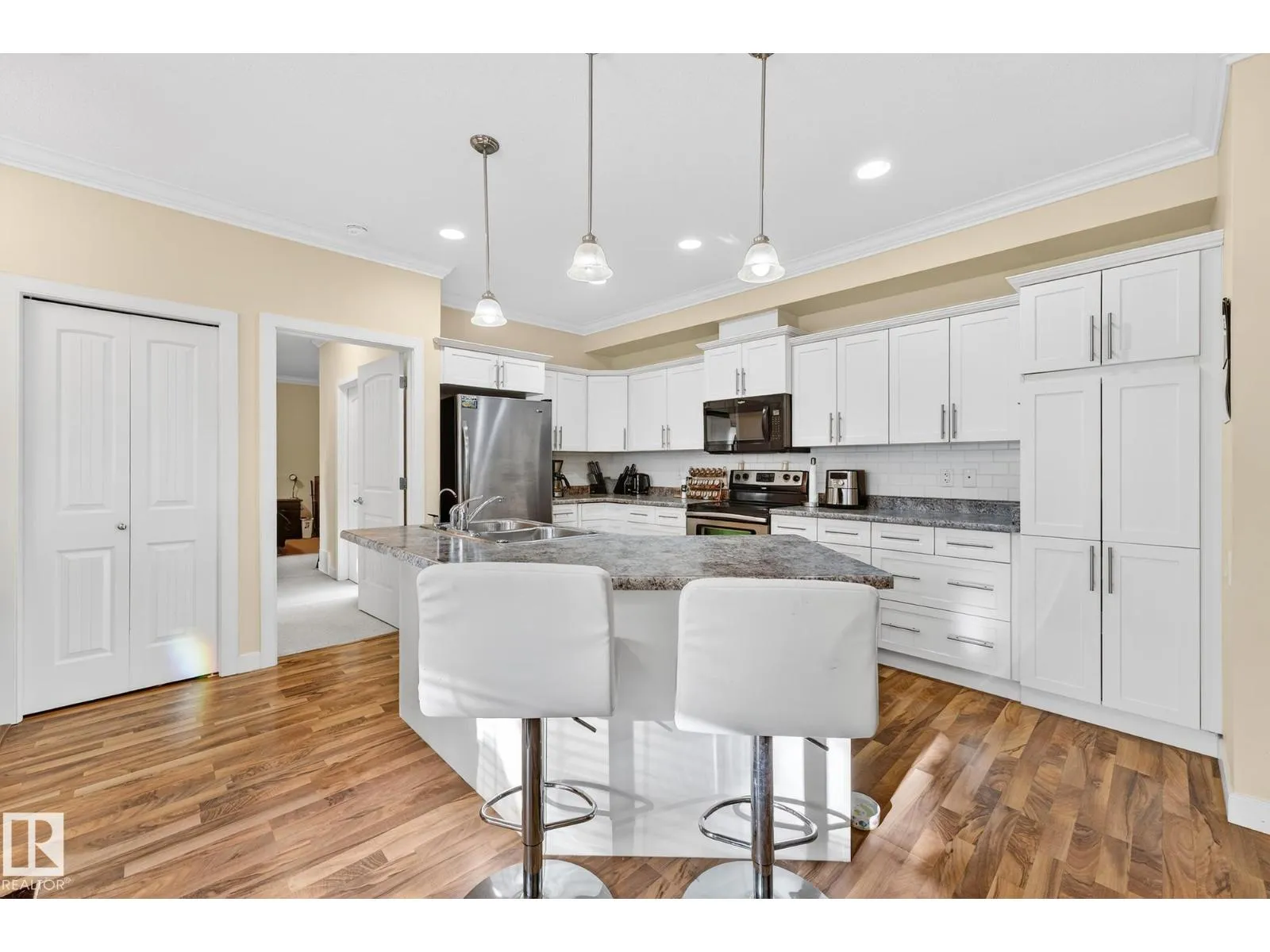 Nestled in a quiet southwest Edmonton community, this thoughtfully designed bungalow-style townhouse offers an inviting open layout ideal for both everyday living and hosting. The modern kitchen is a standout, showcasing stainless steel appliances, sleek cabinetry, generous counter space, and a central island with seating. The dining space overlooks the front veranda and yard, flowing seamlessly into a warm living area highlighted by a gas fireplace. The primary bedroom includes a walk-in closet and a private three-piece ensuite, while the second bedroom is positioned on the opposite side of the home for added privacy, adjacent to another full three-piece bathroom. A dedicated laundry room on the main floor provides direct access to the attached single garage. Downstairs, the fully developed lower level expands your living space with a large recreation room and an additional four-piece bathroom. An exceptional opportunity to enjoy comfort, function, and tranquility in a beautiful setting. (id:27476)