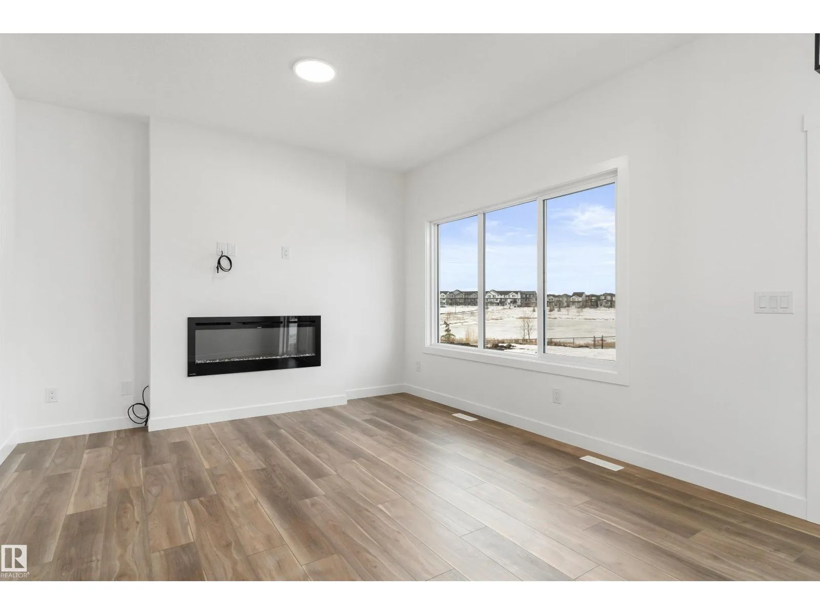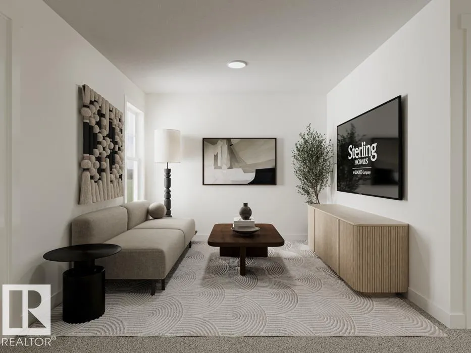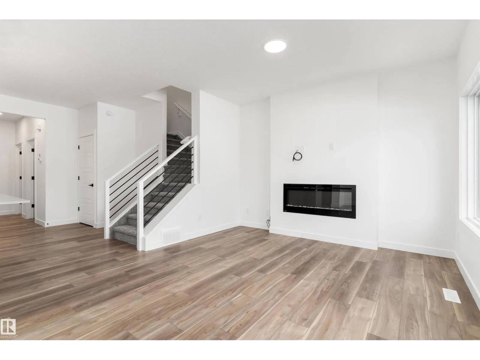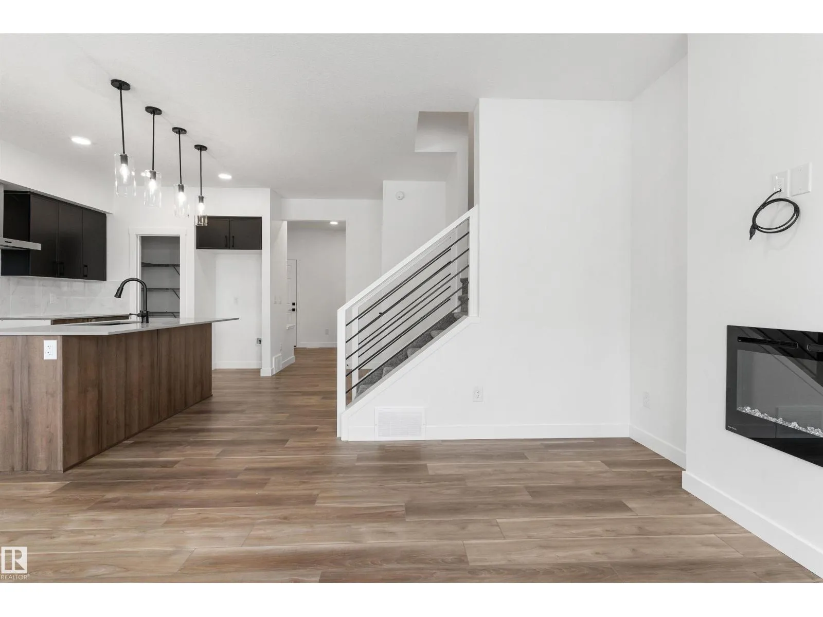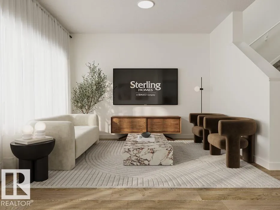 Built by Sterling Homes, this beautifully designed front-attached home in The Uplands at Riverview offers bright, modern living near trails, parks, and the river valley. Triple pane windows and 9â ceilings create an airy main floor with a welcoming foyer, built-in bench, and walk-in closet for everyday organization. The open layout features a stylish kitchen with quartz countertops, a large island with seating, upgraded cabinetry, chimney hood fan, full-height tile backsplash, and a corner pantry. The great room feels warm with an electric fireplace and large windows, while a sliding patio door opens to the backyard. Upstairs, the primary suite includes two walk-in closets and a 4-piece ensuite with double sinks and a glass shower. A cozy loft, two bedrooms, full bath, and upper laundry complete the level. With luxury vinyl plank flooring, upgraded railings, side entrance, basement rough-ins, and an oversized double attached garage with floor drain, this home blends comfort and thoughtful design. (id:27476)