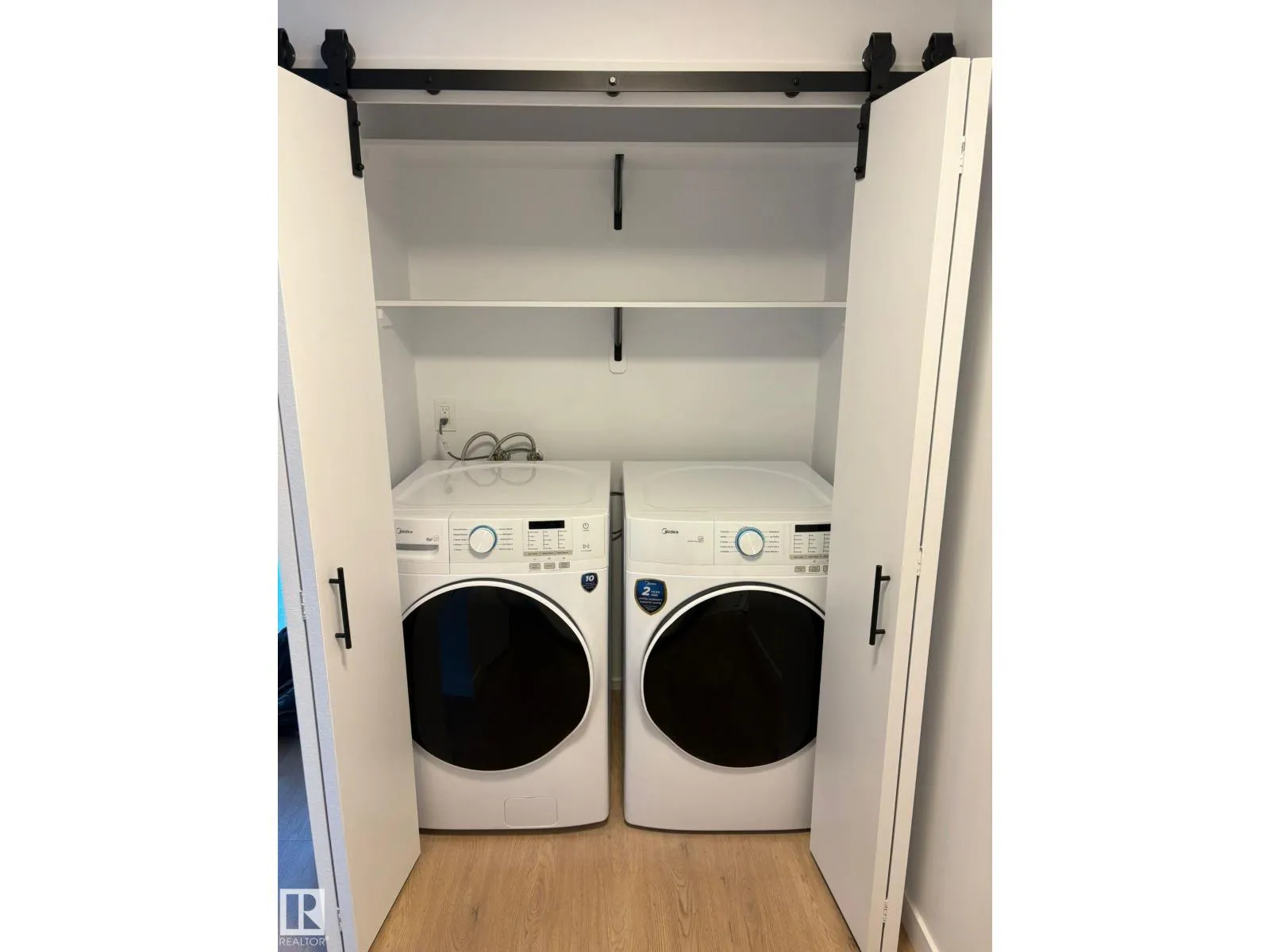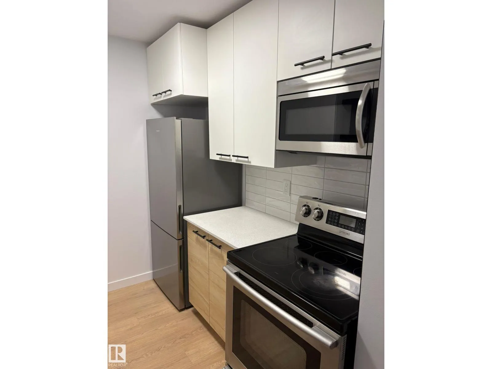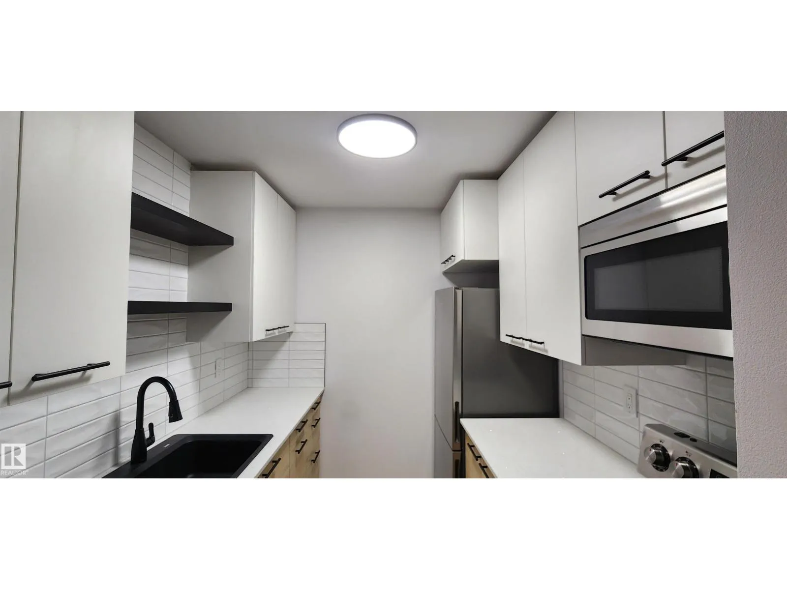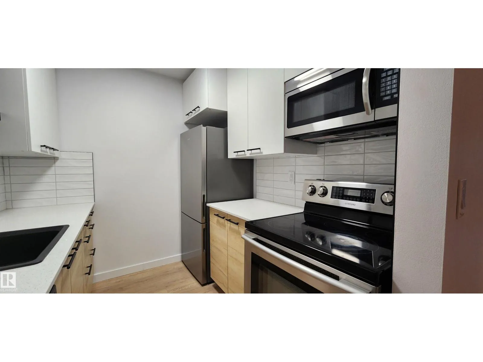 First-time buyers, students & investors alert! Welcome to this fully renovated 1-bedroom + den condoâmodern, move-in ready, and perfectly positioned in a well-maintained building in a prime central location just minutes to MacEwan University, NAIT, LRT, Rogers Place, and downtown. This stylish unit features laminate flooring throughout, brand-new stylish light fixtures, a cozy wood-burning fireplace, private balcony, and in-suite laundry. The versatile den doubles as a flex spaceâideal for a home office, gym, or reading nook. The sleek kitchen shines with stainless steel appliances, quartz countertops, modern cabinetry, and a Silgranit sink, while the fully renovated bathroom offers crisp white tile and new cabinets. The spacious primary bedroom includes French doors and a walk-in closet with ample storage. An energized parking stall and elevator access complete this exceptional city-living package. Donât miss your chance to view this stunning, fully upgraded condoâmove-in ready and perfectly located! (id:27476)