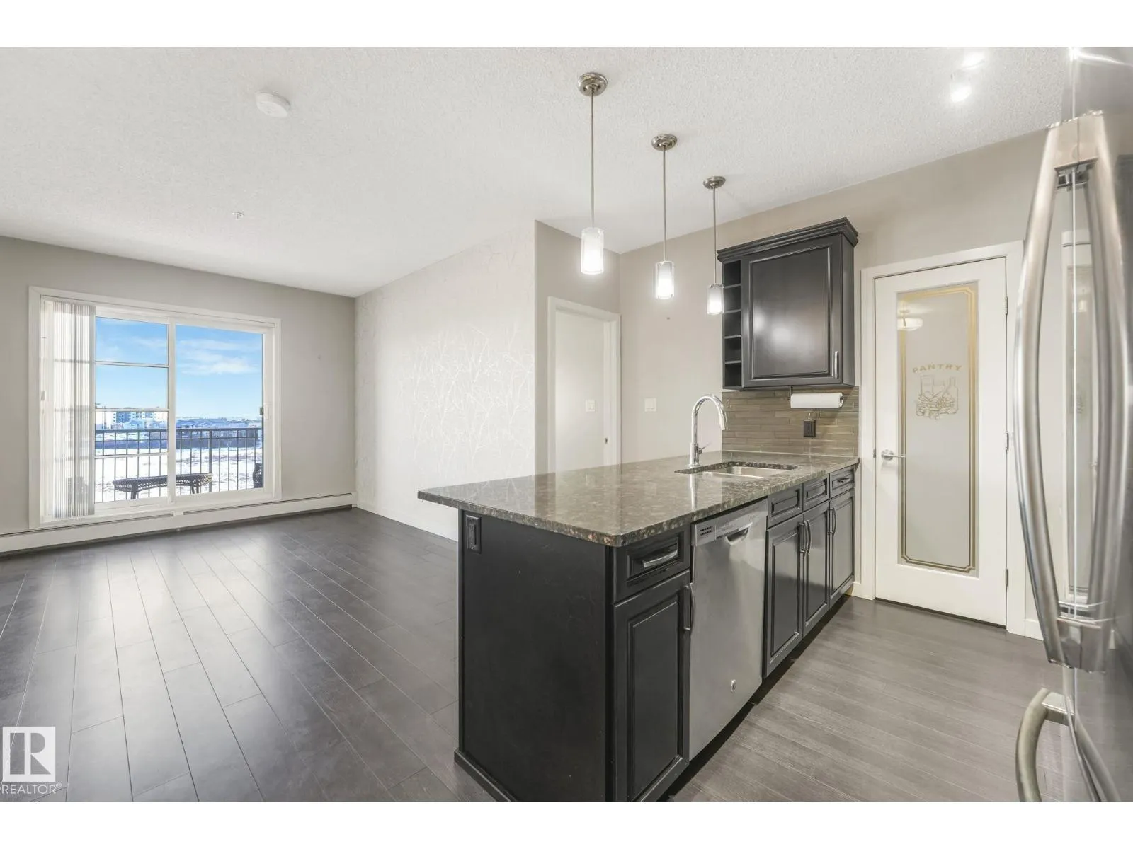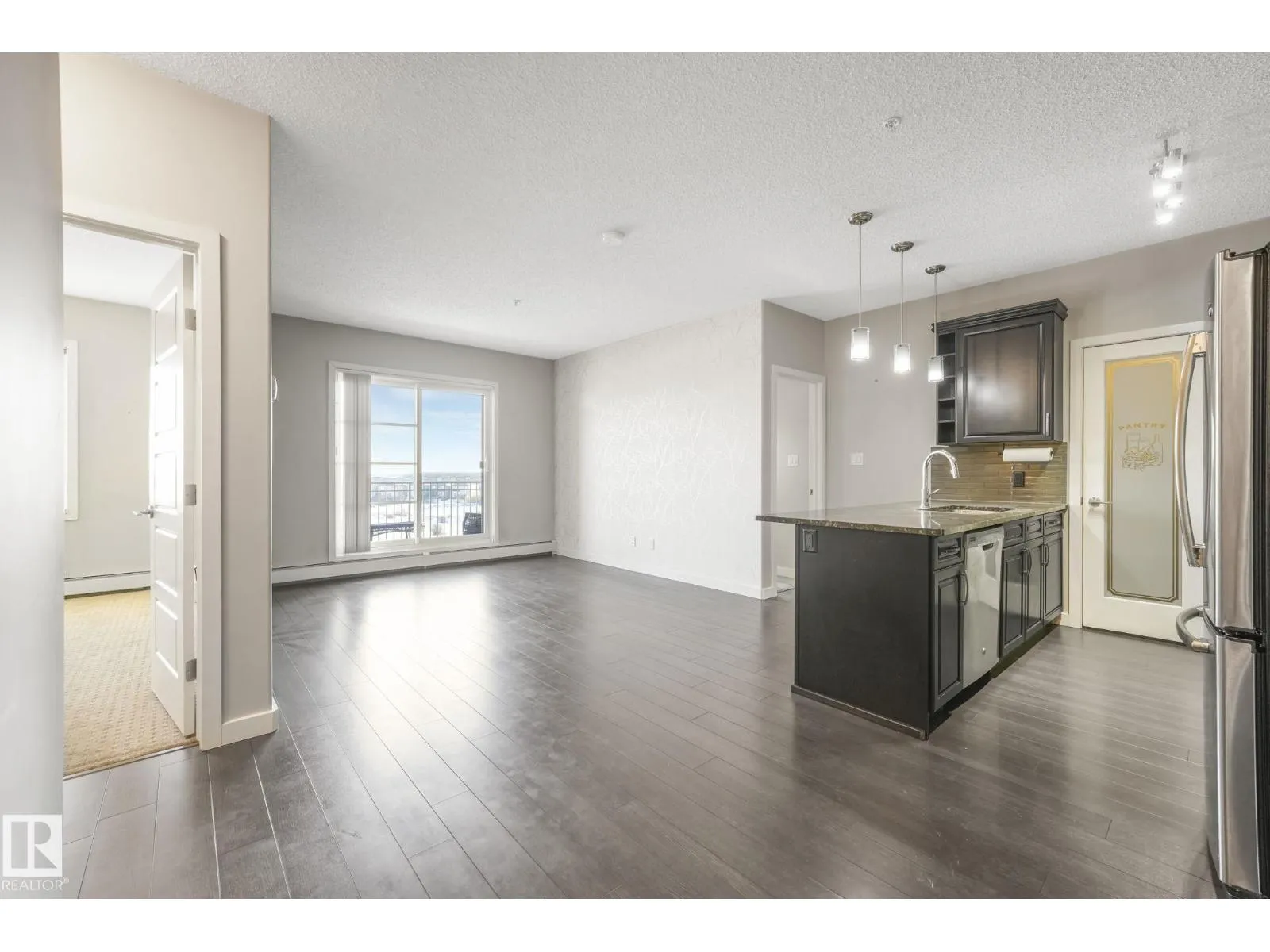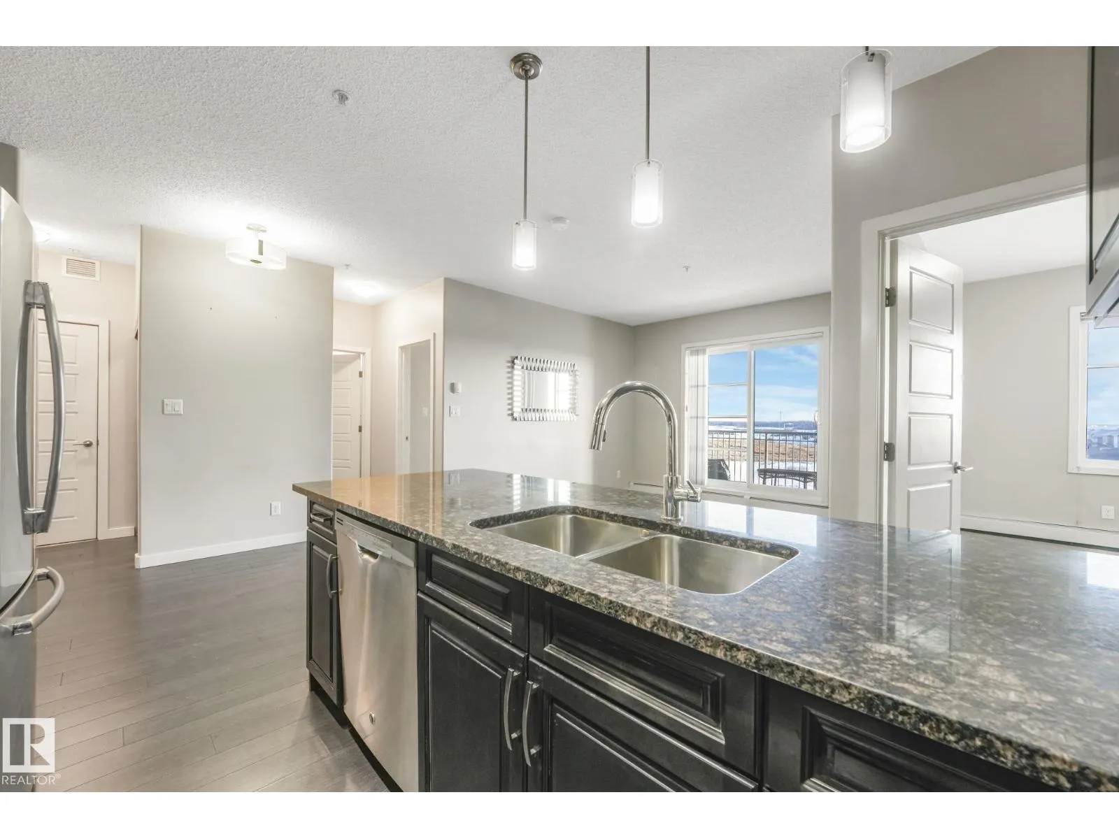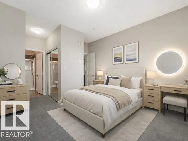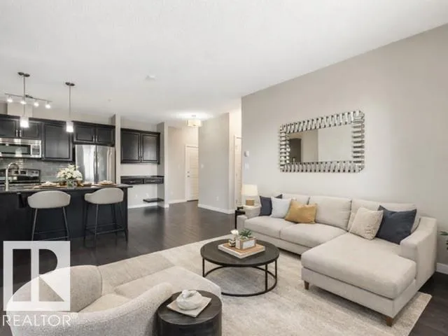Welcome to this stylish 2 bedroom, 2 bath TOP FLOOR unit at Aviva Condos in Albany. The inviting open concept space features 9â ceilings, laminate flooring, & well-appointed kitchen with espresso-stained cabinetry, granite countertops, sleek stainless steel appliances, eat-up peninsula, walk-in pantry, & an adjacent dining area. The spacious living lets in plenty of natural light from the patio doors, leading to the covered balcony, with views towards the GREENSPACE-no direct rear neighbours. The primary bedroom includes a walk-through closet & a 3pc ensuite, while the second bedroom is thoughtfully located on the opposite side of the unit for privacy, along with a 4pc main bath. Youâll appreciate your own in-suite laundry room & the ability to park with ease with TWO TITLED parking stalls (underground & surface), which also includes a storage cage. Great location with direct access to walking & biking trails, shopping, transit, & a quick connection to the Anthony Henday. Move-in ready & waiting for you! (id:27476)