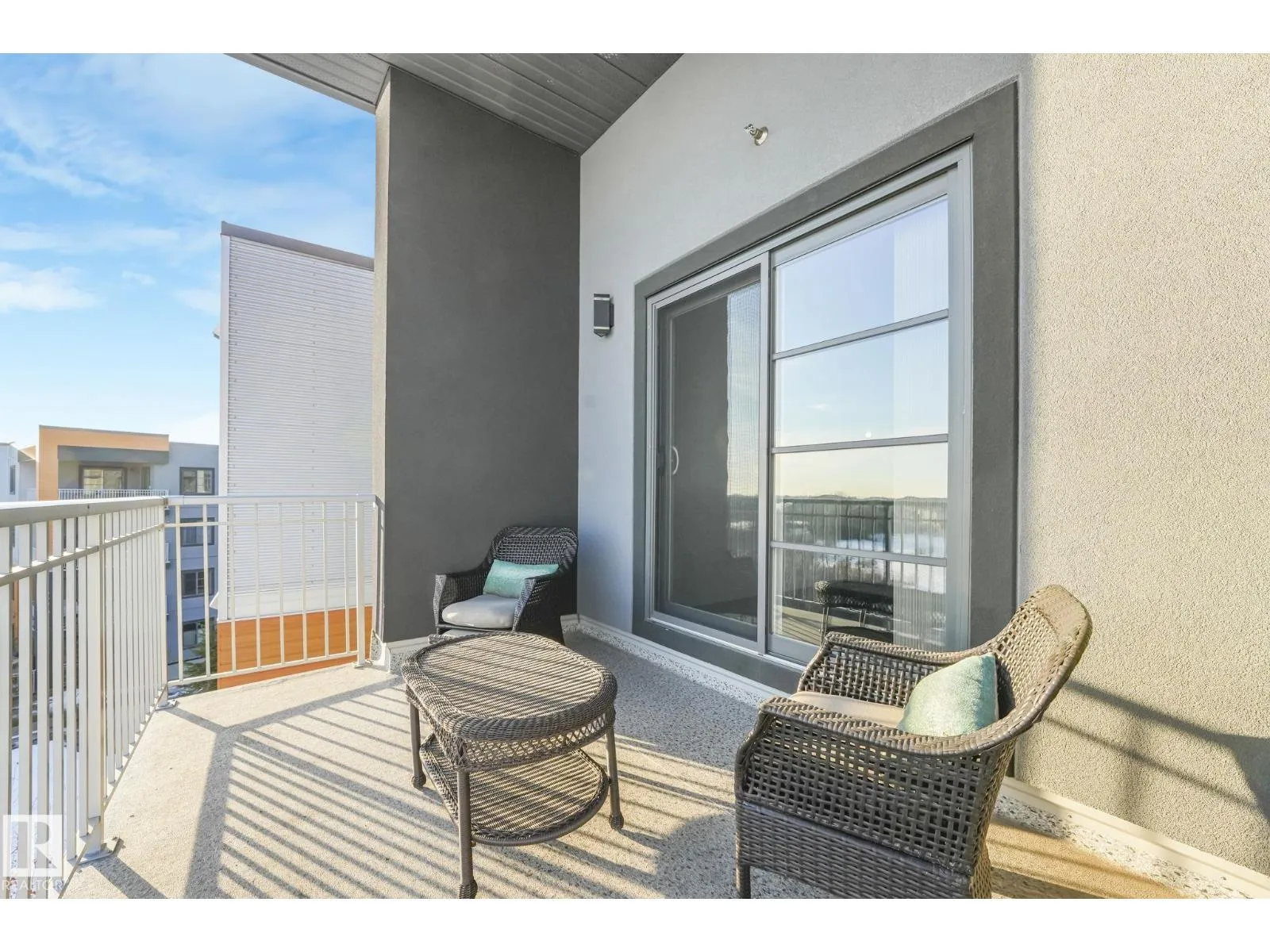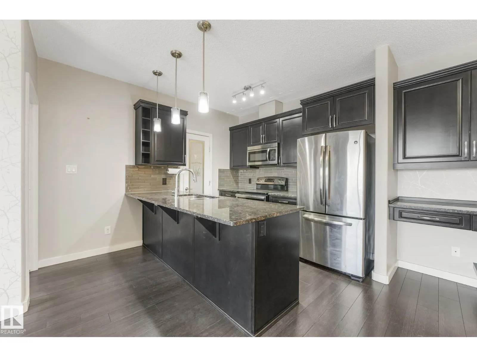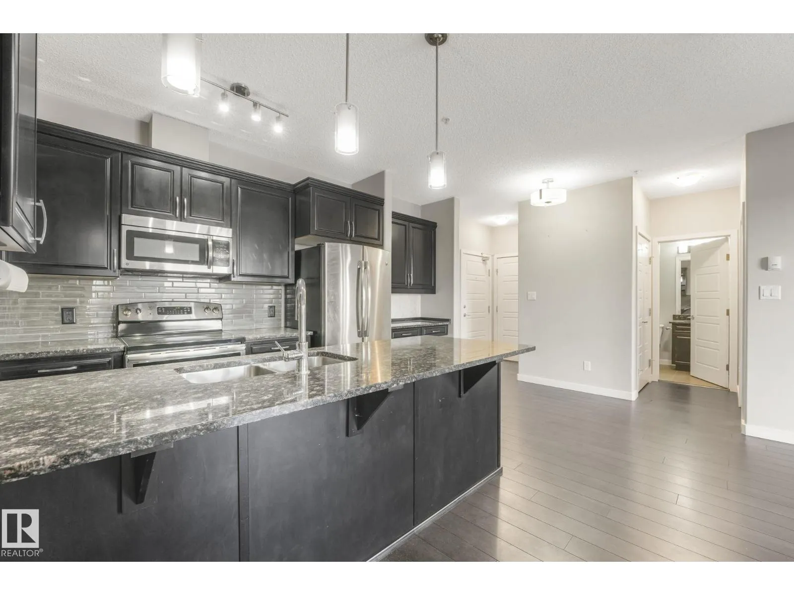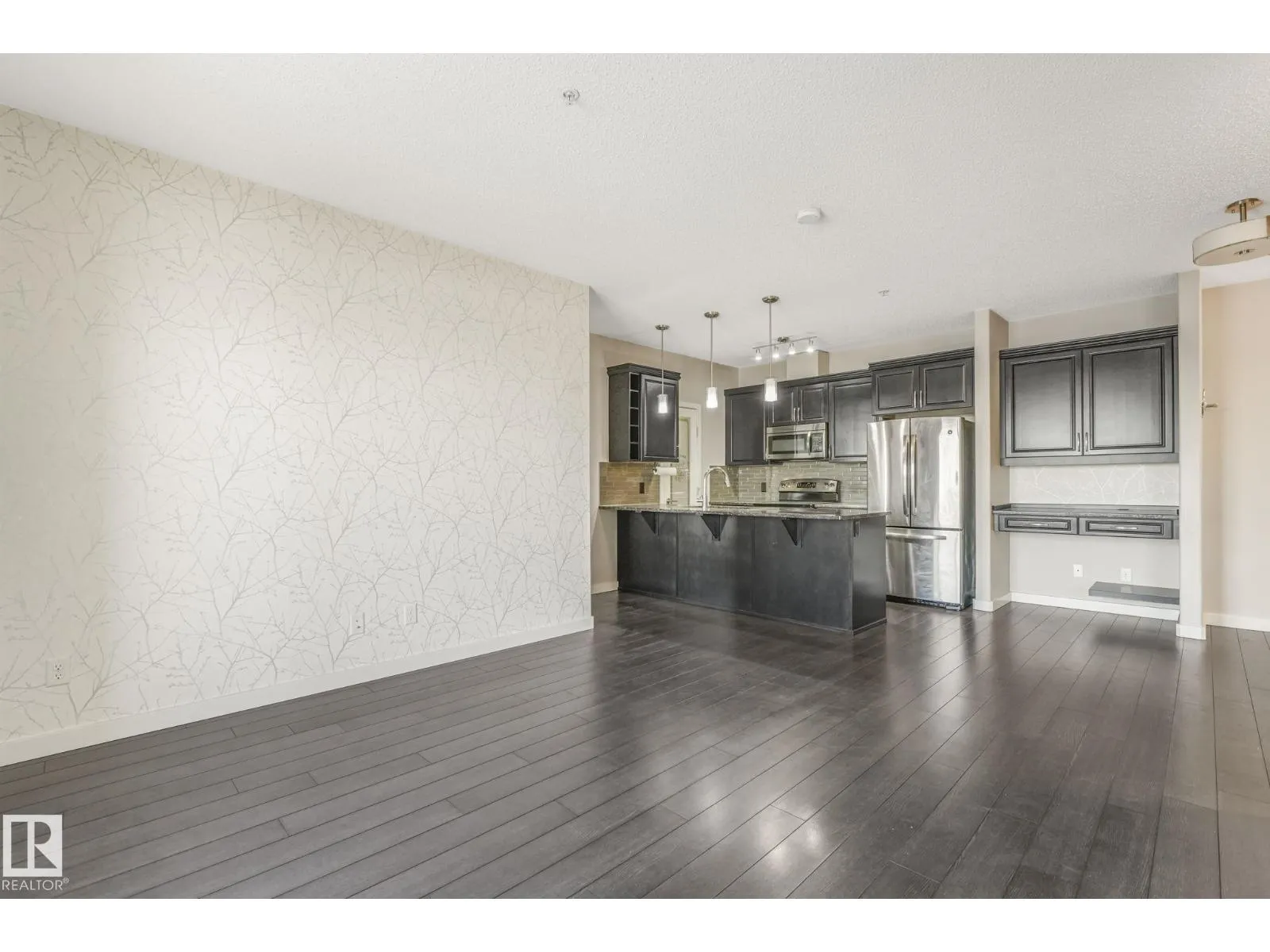Welcome to this stylish 2 bedroom, 2 bath TOP FLOOR unit at Aviva Condos in Albany. The inviting open concept space features 9â ceilings, laminate flooring, & well-appointed kitchen with espresso-stained cabinetry, granite countertops, sleek stainless steel appliances, eat-up peninsula, walk-in pantry, & an adjacent dining area. The spacious living lets in plenty of natural light from the patio doors, leading to the covered balcony, with views towards the GREENSPACE-no direct rear neighbours. The primary bedroom includes a walk-through closet & a 3pc ensuite, while the second bedroom is thoughtfully located on the opposite side of the unit for privacy, along with a 4pc main bath. Youâll appreciate your own in-suite laundry room & the ability to park with ease with TWO TITLED parking stalls (underground & surface), which also includes a storage cage. Great location with direct access to walking & biking trails, shopping, transit, & a quick connection to the Anthony Henday. Move-in ready & waiting for you! (id:27476)