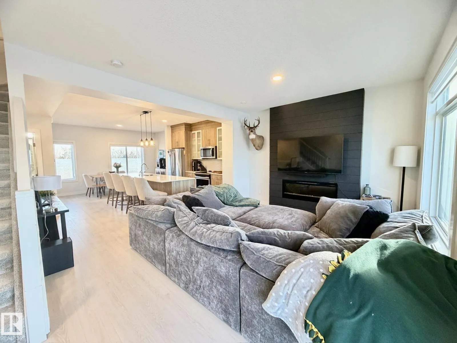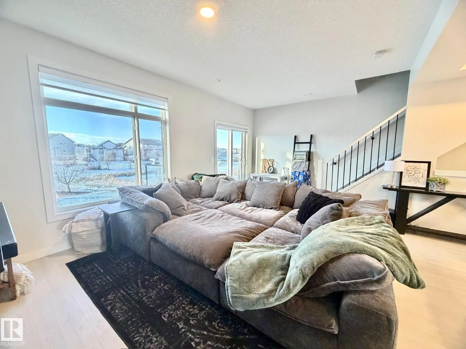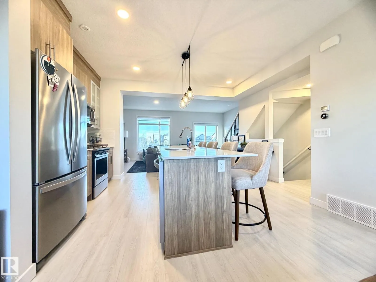 Welcome to this stunning 3-storey townhome offering breathtaking views of a naturalized pond & the rolling greens of Jagare Ridge Golf Course. With approximately 1635 sq ft, this bright & spacious home features 3 beds, 2.5 baths, a den or optional bedroom & a dbl att garage. The open-concept main floor showcases 9â ceilings, luxury vinyl plank flooring, and a striking electric fireplace with a shiplap feature wall. The kitchen is a showstopper with quartz countertops, under-mount sink, upgraded S/S appliances, pantry, ample cabinetry, and an impressive 10â islandâperfect for entertaining. Step onto the balcony with gas line & soak in the incredible views. Enjoy modern comforts including on-demand hot water, HRV system, LED lighting, upgraded fixtures, and an enhanced smart home package with Nest thermostat, Ring doorbell camera, keyless entry & WiFi-enabled garage door. Ideally located near trails, green spaces, shopping, schools & amenitiesâthis home offers elevated living in a truly exceptional setting. (id:27476)