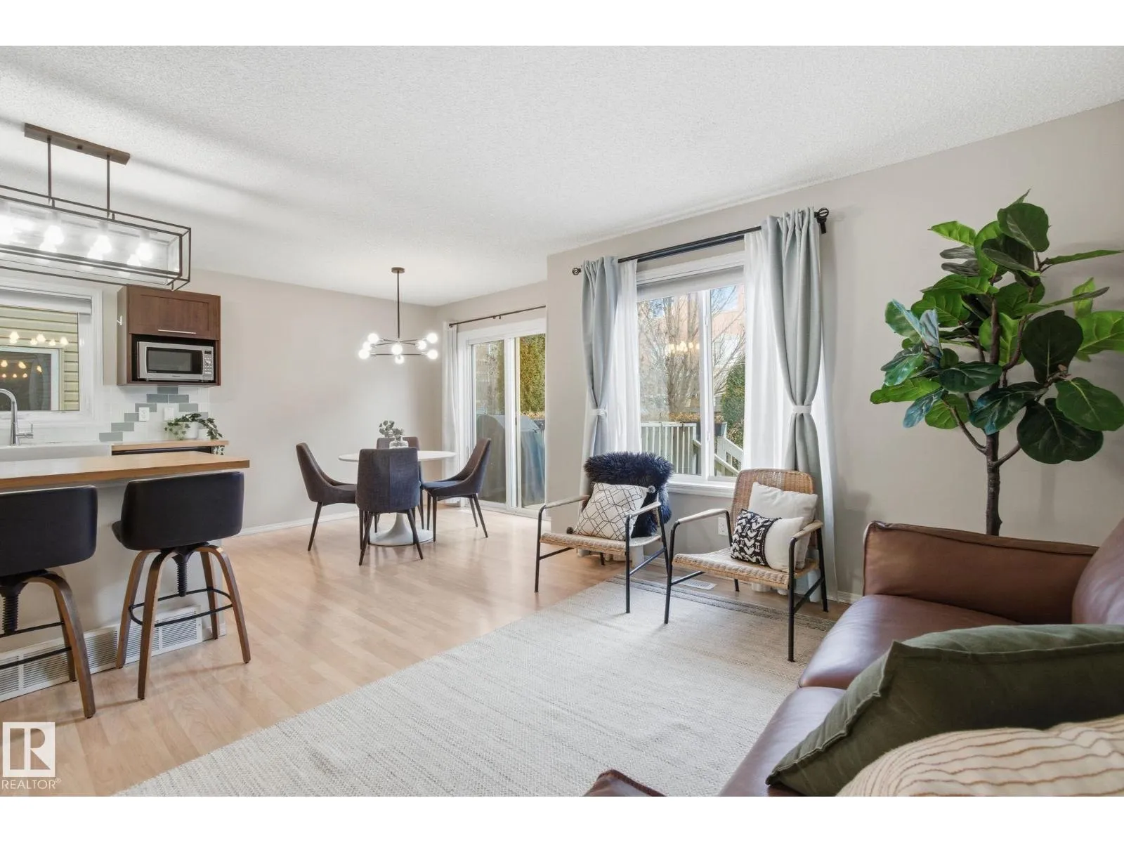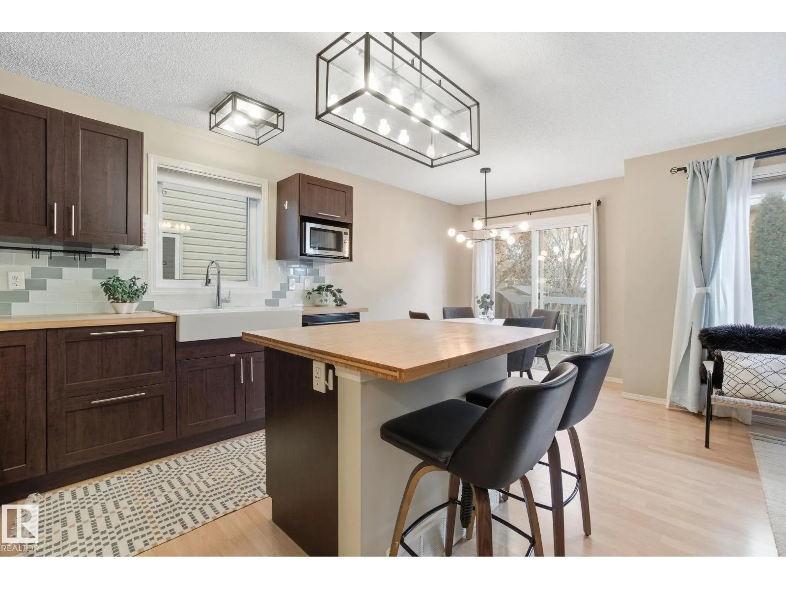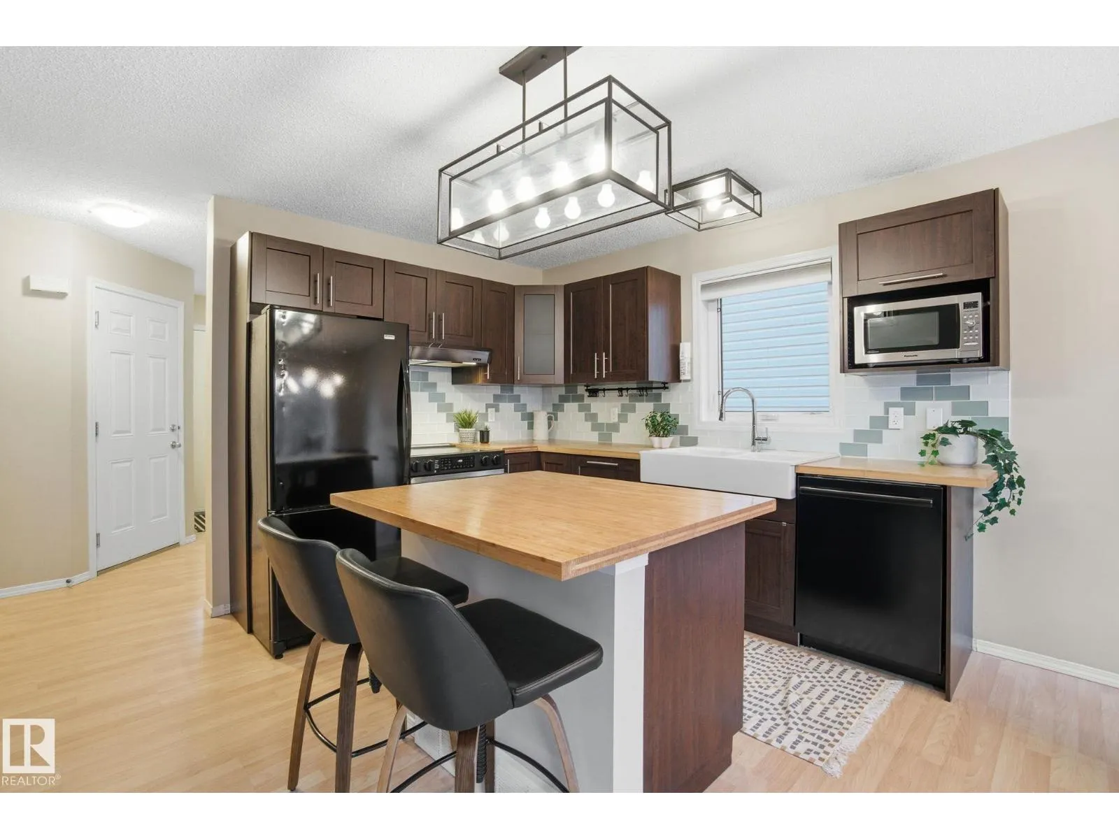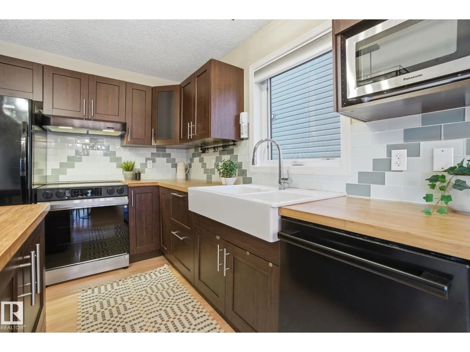 Well kept & nicely updated! This 1300sf 2 story duplex has a finished basement, fenced in yard & attached garage! Open concept floor plan anchored by a beautiful kitchen with dark cabinets, chop block counters, glass subway tile backsplash & an island for extra work space. The dining area features modern lighting & access to the SE facing deck & yard. The living room is a comfortable size & is flexible for furniture placement. Upstairs are 3 bedrooms & 2 full baths. Large primary with ensuite. The basement is finished with a great rec room featuring surround sound & a built-in media unit. Off of this is the utility, laundry & storage area. Single garage with room for another vehicle on the driveway. Lots of room for visitors to park & easy ETS access on Macewan Road a few units down. Great location across the street from Macewan Park, nearby trails & Blackmud Ravine. All amenities walkable on 111th St and Ellerslie. Quick to Henday! New hot water tank, smart electric range, dishwasher & central A/C ! (id:27476)