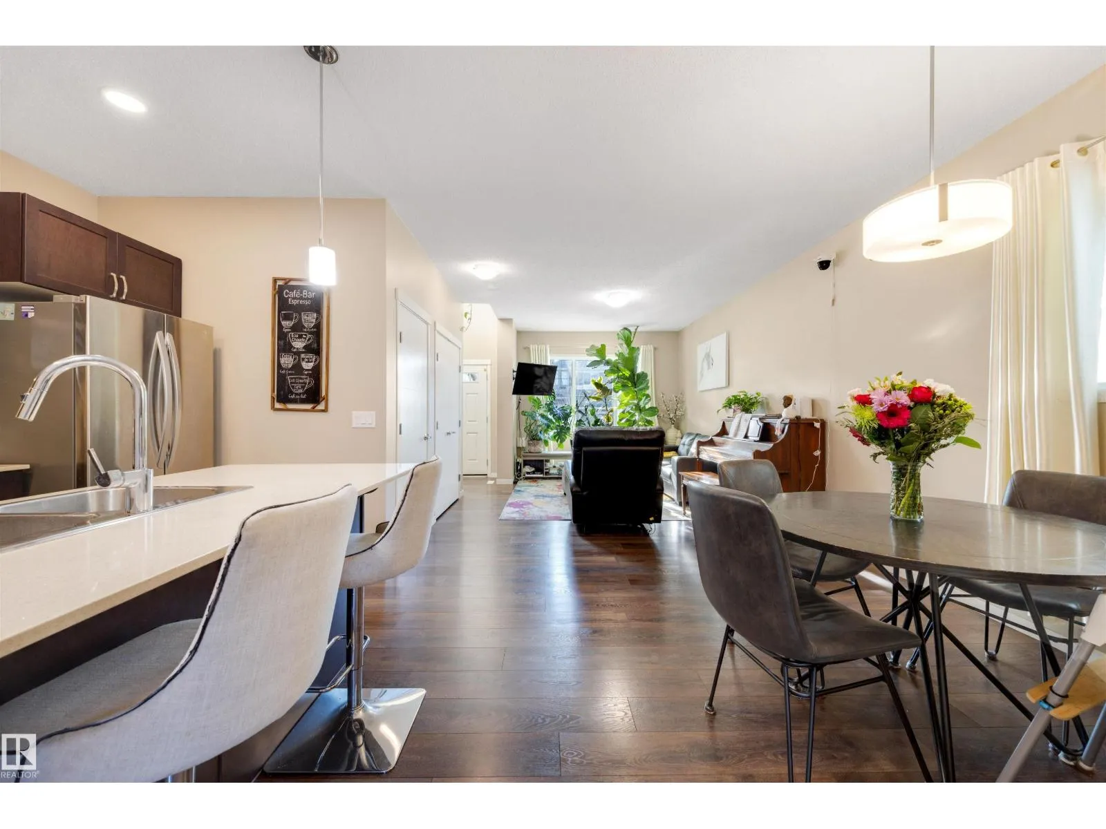 Welcome to this stunning end-unit Sterling Homes 2-storey in the heart of Tamarack, one of Southeast Edmontonâs most walkable communities with no condo fees. Offering 1,435sqft, 4 bedrooms, and 3.5 bathrooms, this home features a bright open-concept main floor with 9 ft ceilings and large windows, a kitchen finished with quartz countertops, tiled backsplash, pantry, and an oversized island with eating bar flowing into the dining area, plus a convenient main floor half bath and laundry. Upstairs includes three generous bedrooms, including a king-sized primary suite with a walk-in closet and a 4-piece ensuite, along with an additional full bathroom. The basement adds a spacious family room, fourth bedroom, and 3-piece bathroom, while the fenced yard with deck and double detached garage completes the package. Located steps from schools, the Meadows Recreation Centre, library, parks, shopping, and transit, with quick access to major routes, this home offers exceptional convenience and an unbeatable lifestyle. (id:27476)