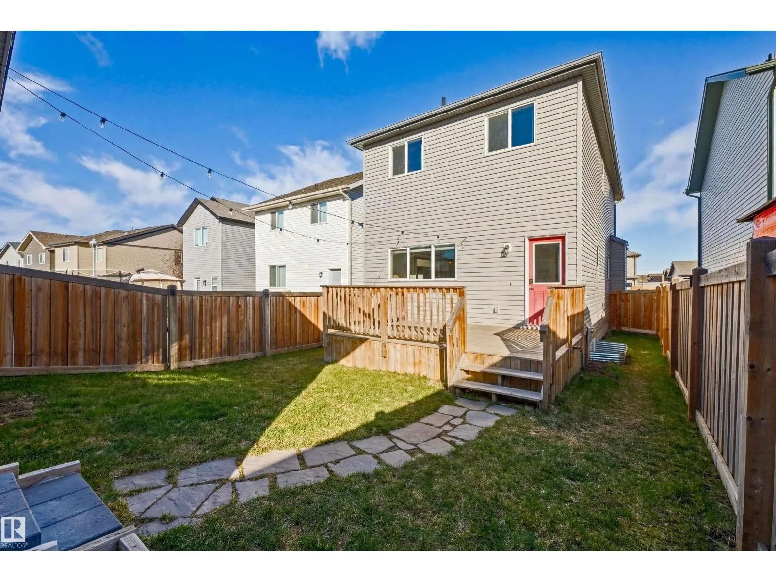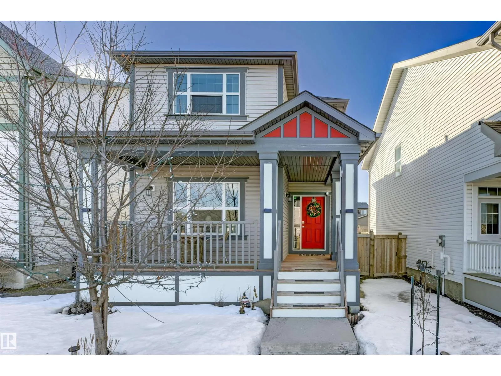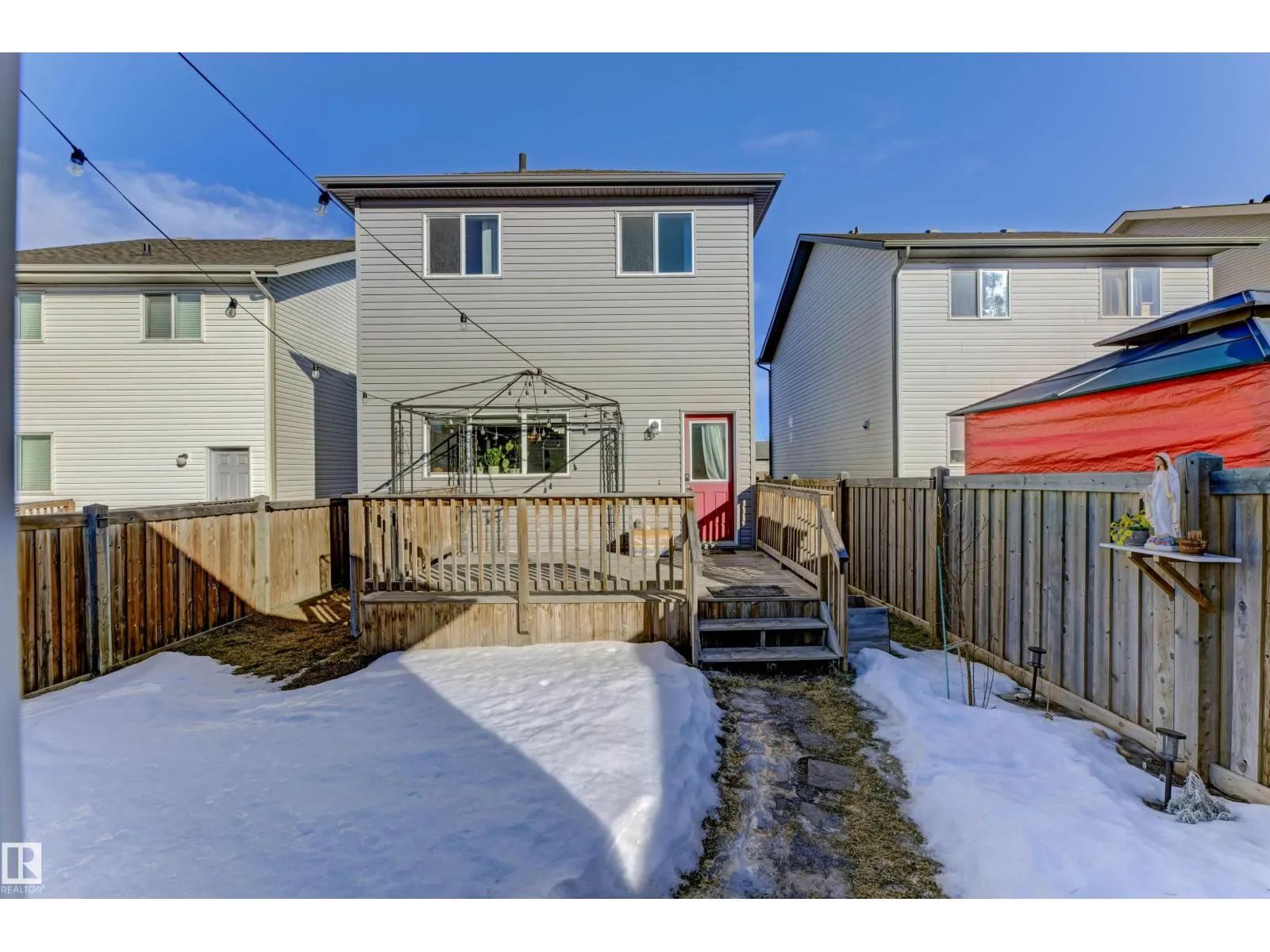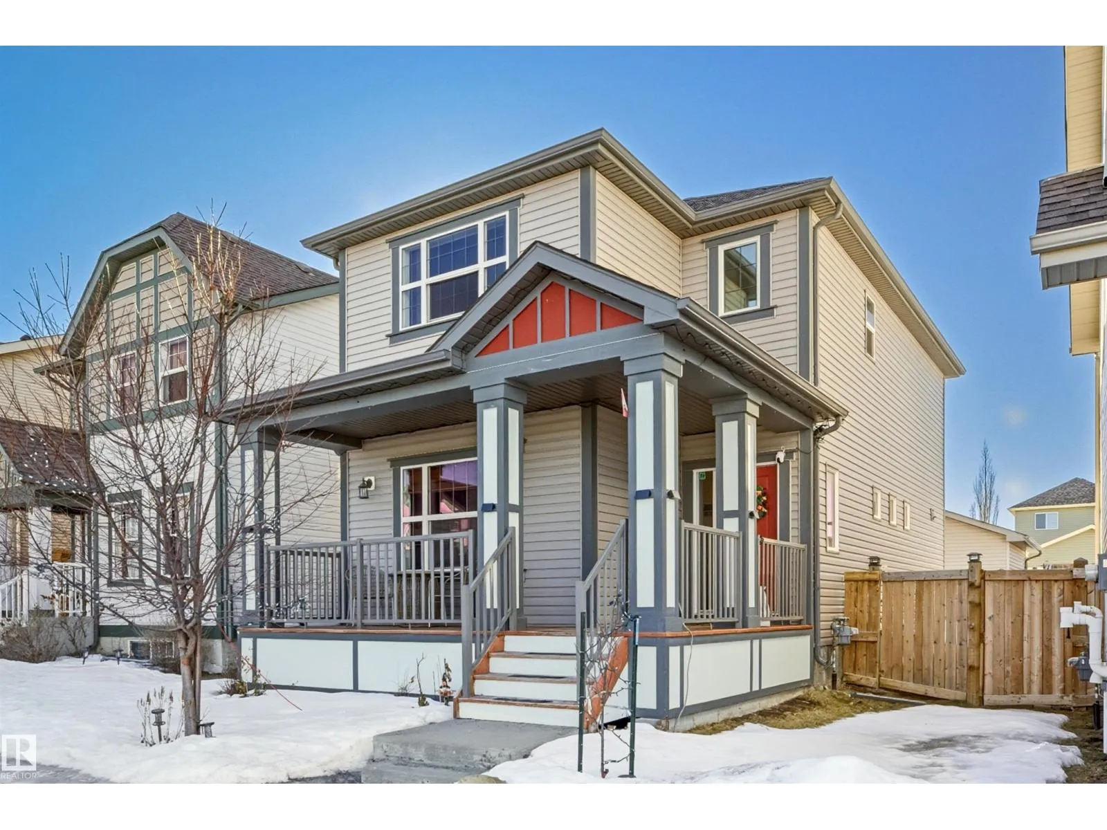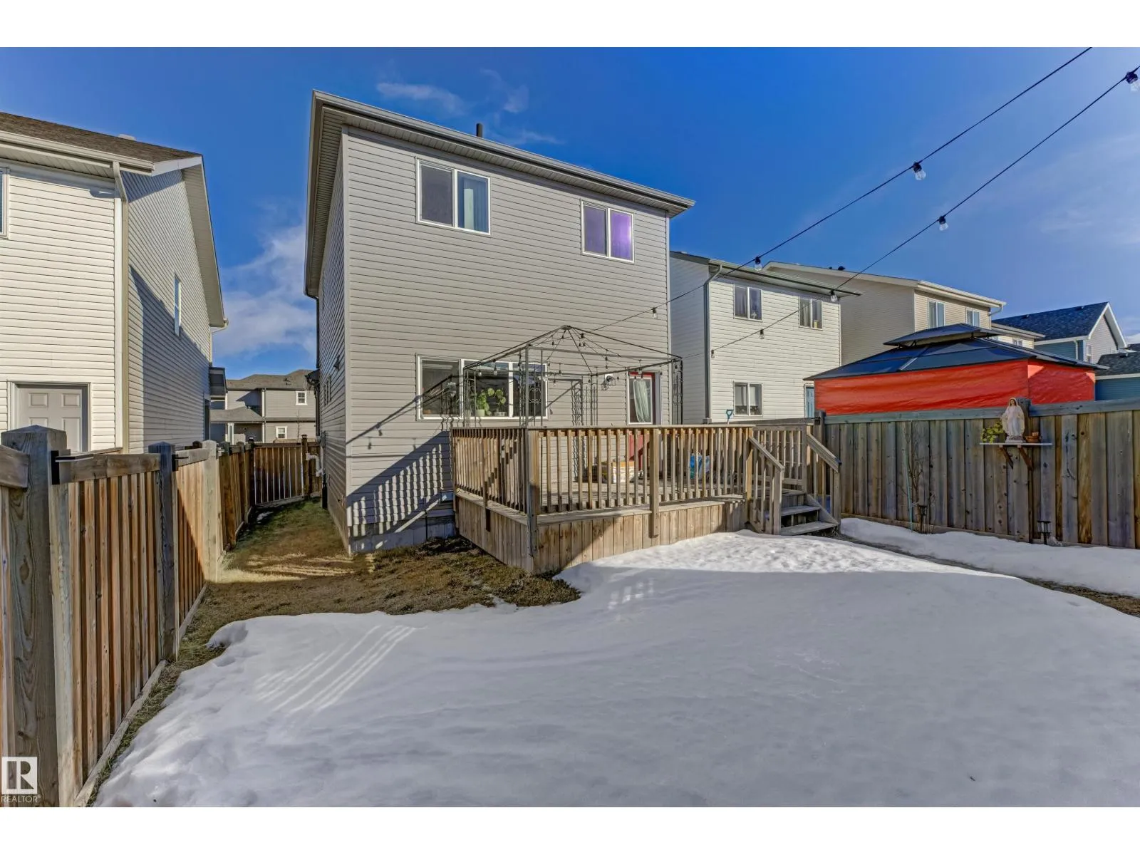 Welcome to this well-maintained 2-storey home in the family-friendly community of McConachie! Offering 1,604 sqft of above-grade living space, the main floor features a bright open-concept layout with spacious living and dining areas. The kitchen includes ample cabinetry, modern appliances, and a central island for added prep and seating space. Upstairs offers three well-sized bedrooms, including a primary suite with a private ensuite featuring a stand-up shower and a relaxing air-jetted soaker tub. The laundry room is conveniently located on the upper level. In total, the home offers 2.1 bathrooms. The unfinished basement provides great potential for future development. Enjoy the front porch, rear deck, fully fenced yard, and double detached garage. Situated directly across from a playground and bus stop, with schools and shopping just a short drive away, and easy access to Anthony Henday Drive. This home offers comfort, functionality, and everyday convenience in Northeast of Edmonton. (id:27476)