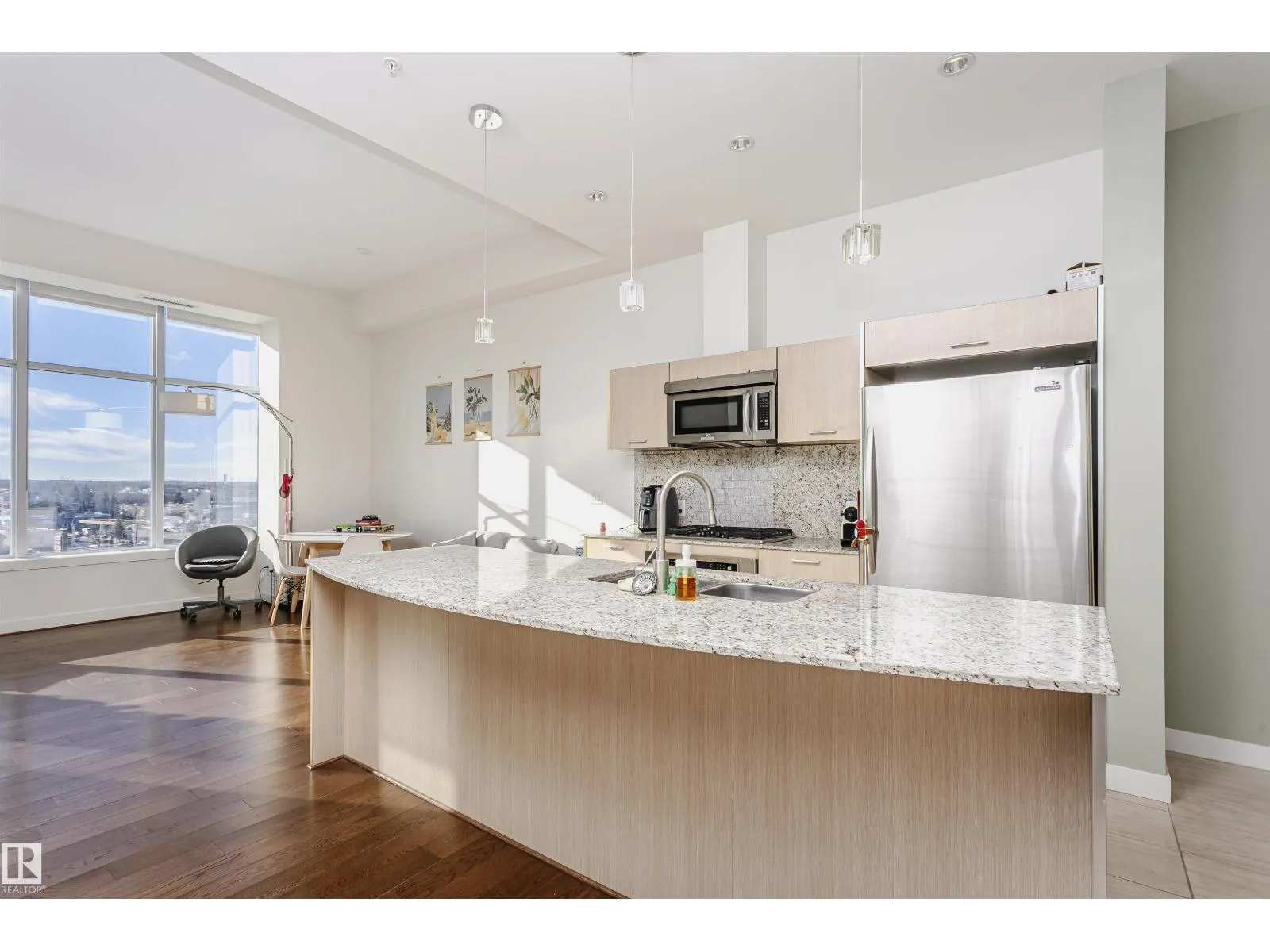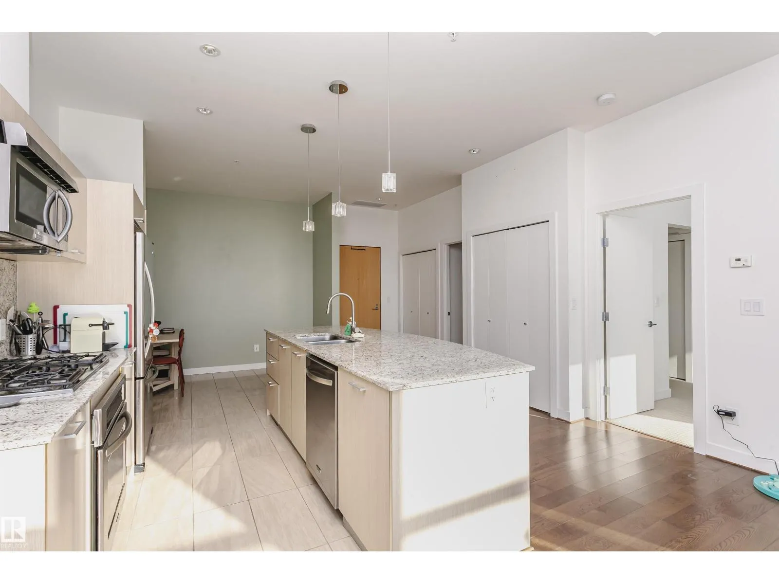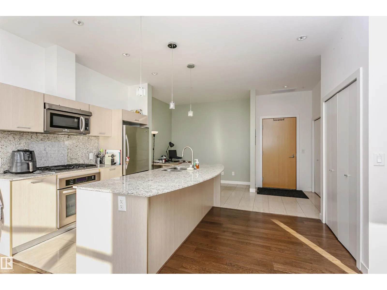 Top-floor, south-facing in sought-after Century Park! Soaring ceilings and expansive windows flood the open-concept layout with natural light, creating a bright and airy atmosphere. Just off the entrance, a versatile flex space offers the perfect spot for a home office, dining area, or reading nook. The modern kitchen showcases granite countertops, a gas stovetop, built-in oven and microwave, plus a large island. The spacious bedroom features dual closets and convenient dual-entry access to the 4-piece ensuite. Relax outdoors on your sunny private balcony with gas BBQ hookup. Complete with titled underground parking, a separate titled storage cage, fitness centre access, and ALL utilities included in the condo fees. Just steps to the LRT, shopping, restaurants, and minutes to major routes. This is urban convenience at its best! (id:27476)