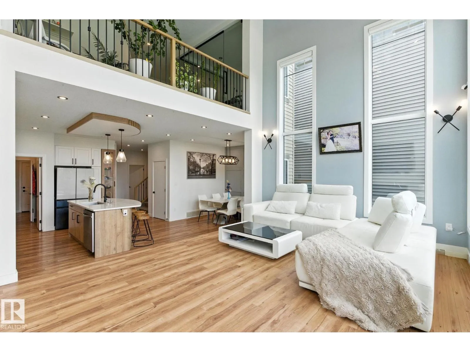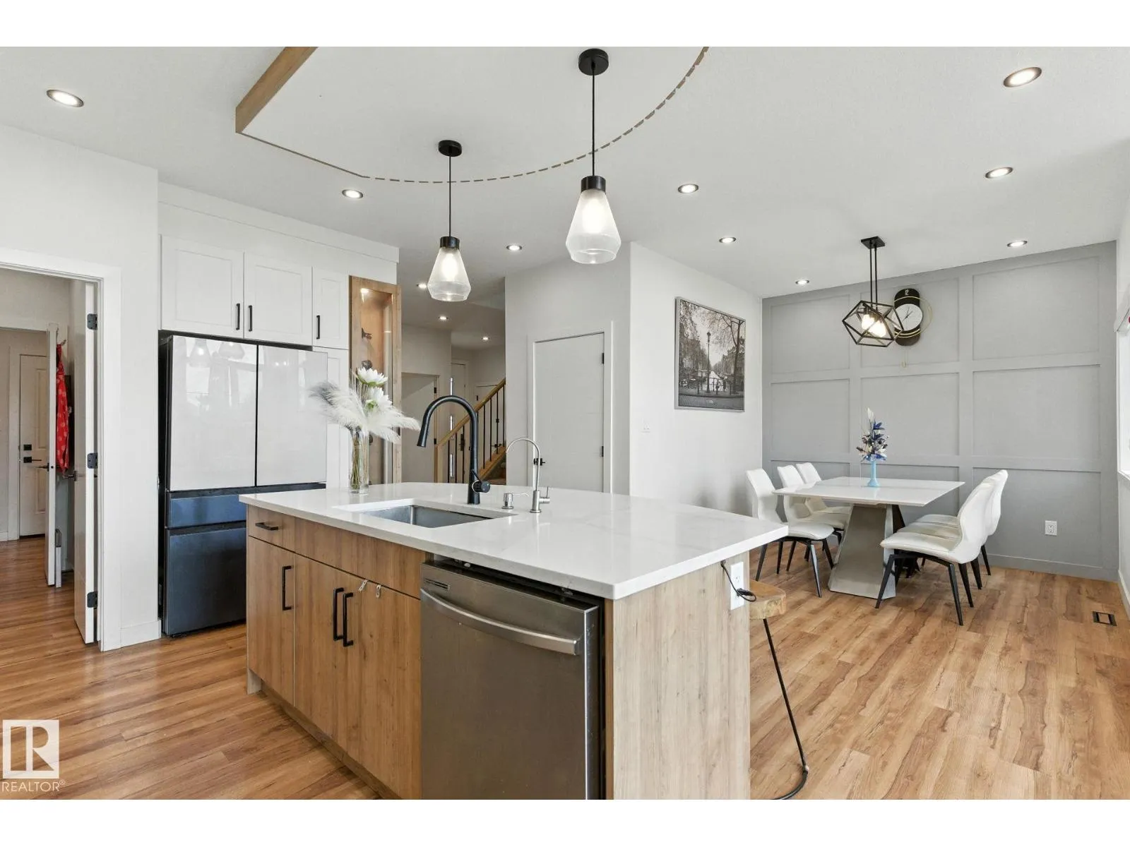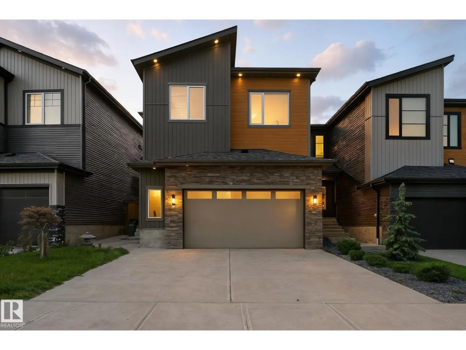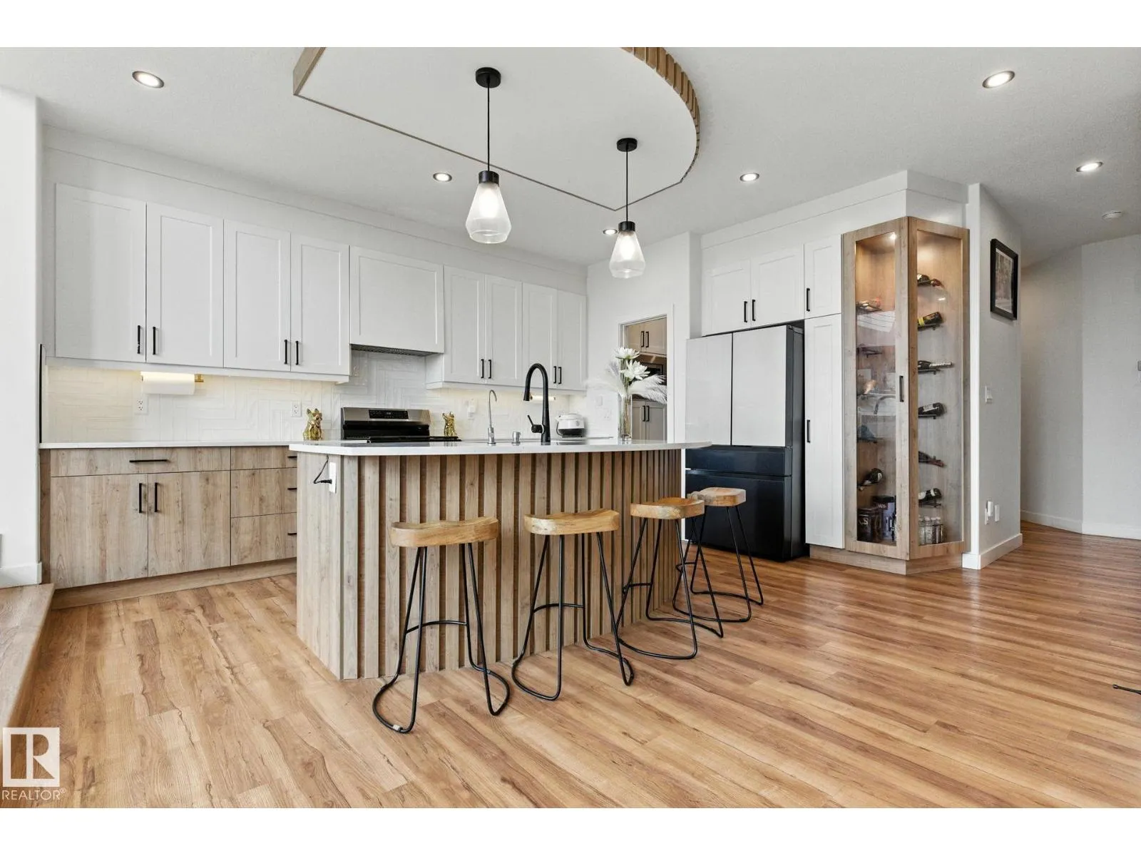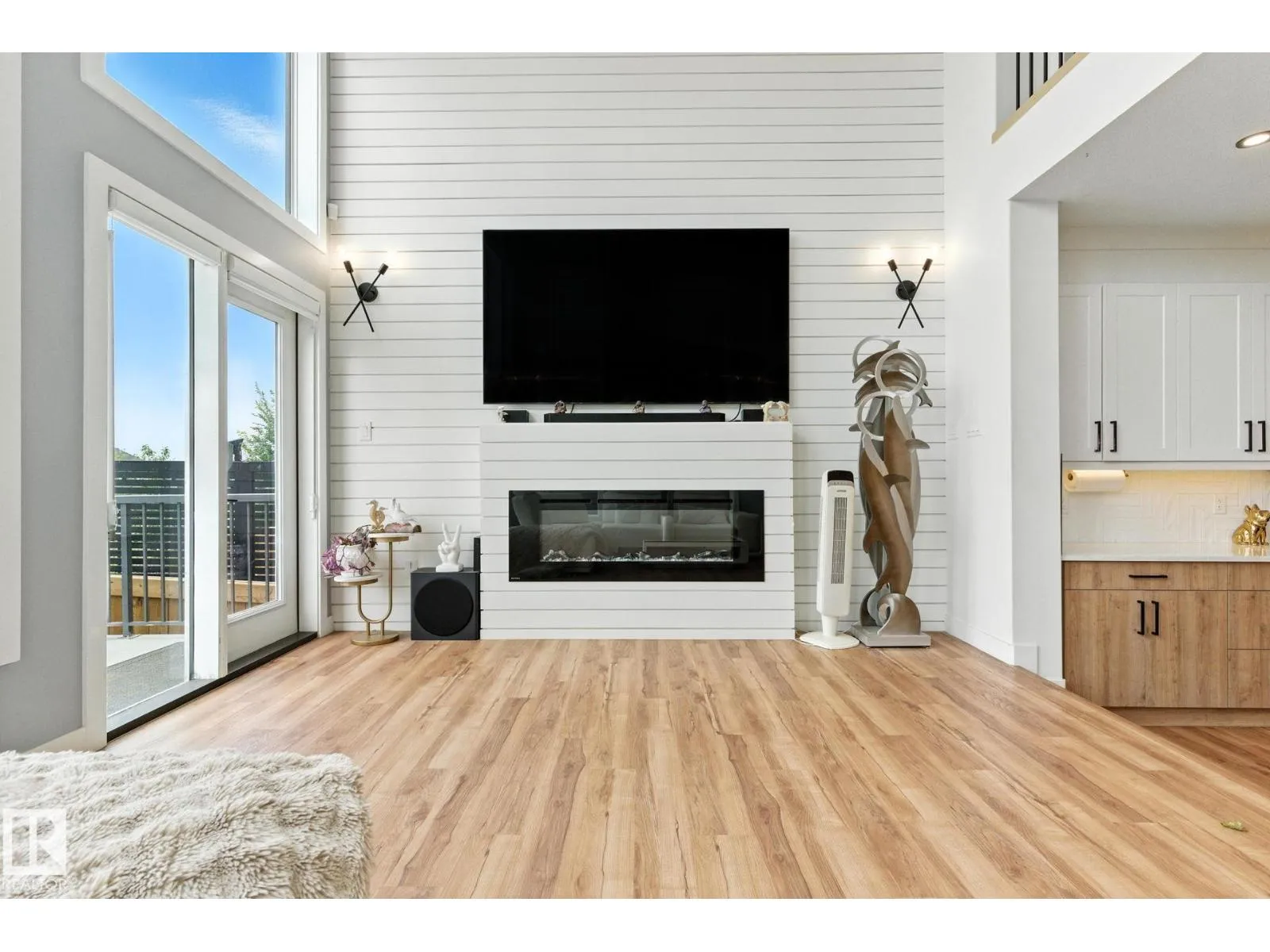 In the growing community of Kinglet Gardens, this home combines style and functionality, featuring elegant flooring, accent walls, upgraded lighting, and a kitchen with warm wood tones, built-in wine storage, and modern appliances. The main floor offers a dining area, full bathroom, and a flexible office or bedroom, while the open-to-above living room with floor-to-ceiling windows allows natural light to fill the space and creates a sense of openness. Upstairs includes a bonus room, a space suitable for a gym or meditation area, and a primary suite with coffered ceilings, barn door, ensuite with dual sinks, and a walk-in closet connected to the laundry, along with two additional bedrooms and a full bathroom. The finished basement features a separate side entrance, wet bar, entertainment area, and a den that can be used for work, guests, or hobbies, with additional storage and utility spaces. Located near schools, parks, and main roadways, the home supports a well-connected and convenient lifestyle. (id:27476)