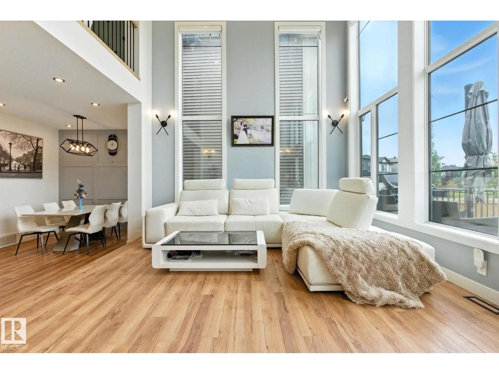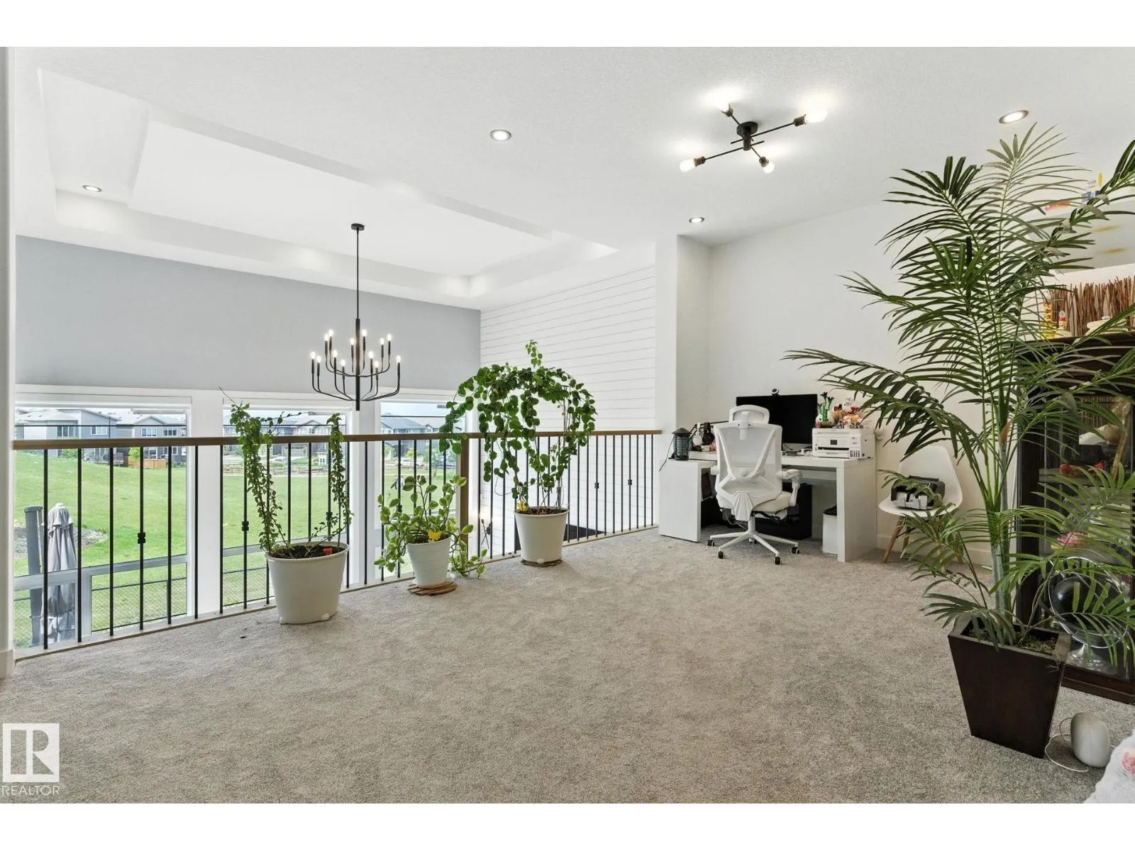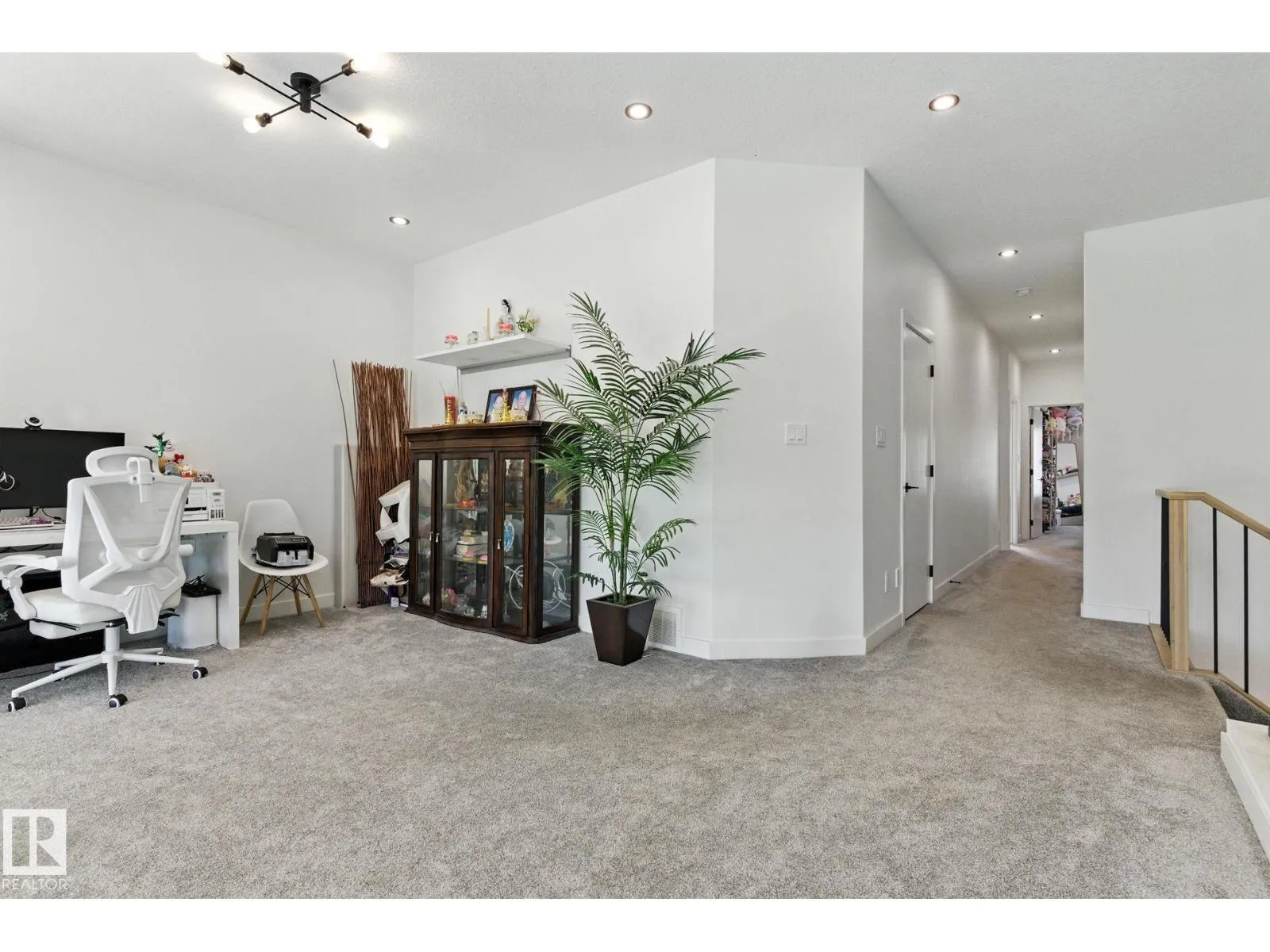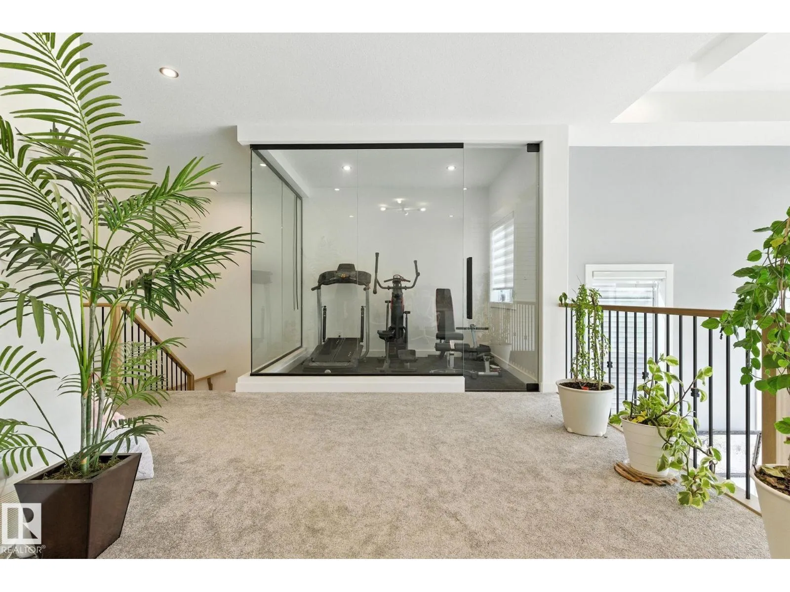 In the growing community of Kinglet Gardens, this home combines style and functionality, featuring elegant flooring, accent walls, upgraded lighting, and a kitchen with warm wood tones, built-in wine storage, and modern appliances. The main floor offers a dining area, full bathroom, and a flexible office or bedroom, while the open-to-above living room with floor-to-ceiling windows allows natural light to fill the space and creates a sense of openness. Upstairs includes a bonus room, a space suitable for a gym or meditation area, and a primary suite with coffered ceilings, barn door, ensuite with dual sinks, and a walk-in closet connected to the laundry, along with two additional bedrooms and a full bathroom. The finished basement features a separate side entrance, wet bar, entertainment area, and a den that can be used for work, guests, or hobbies, with additional storage and utility spaces. Located near schools, parks, and main roadways, the home supports a well-connected and convenient lifestyle. (id:27476)