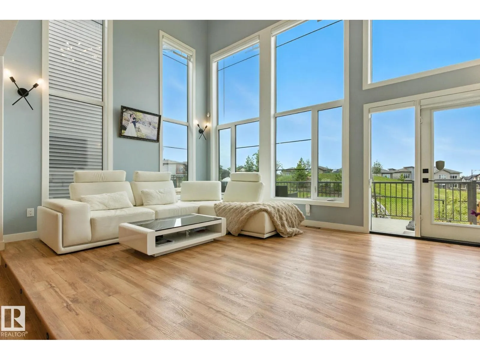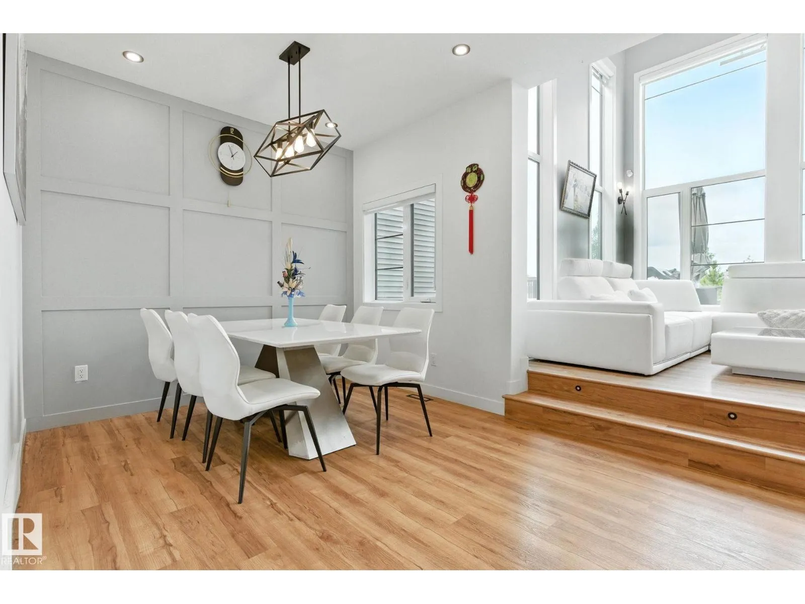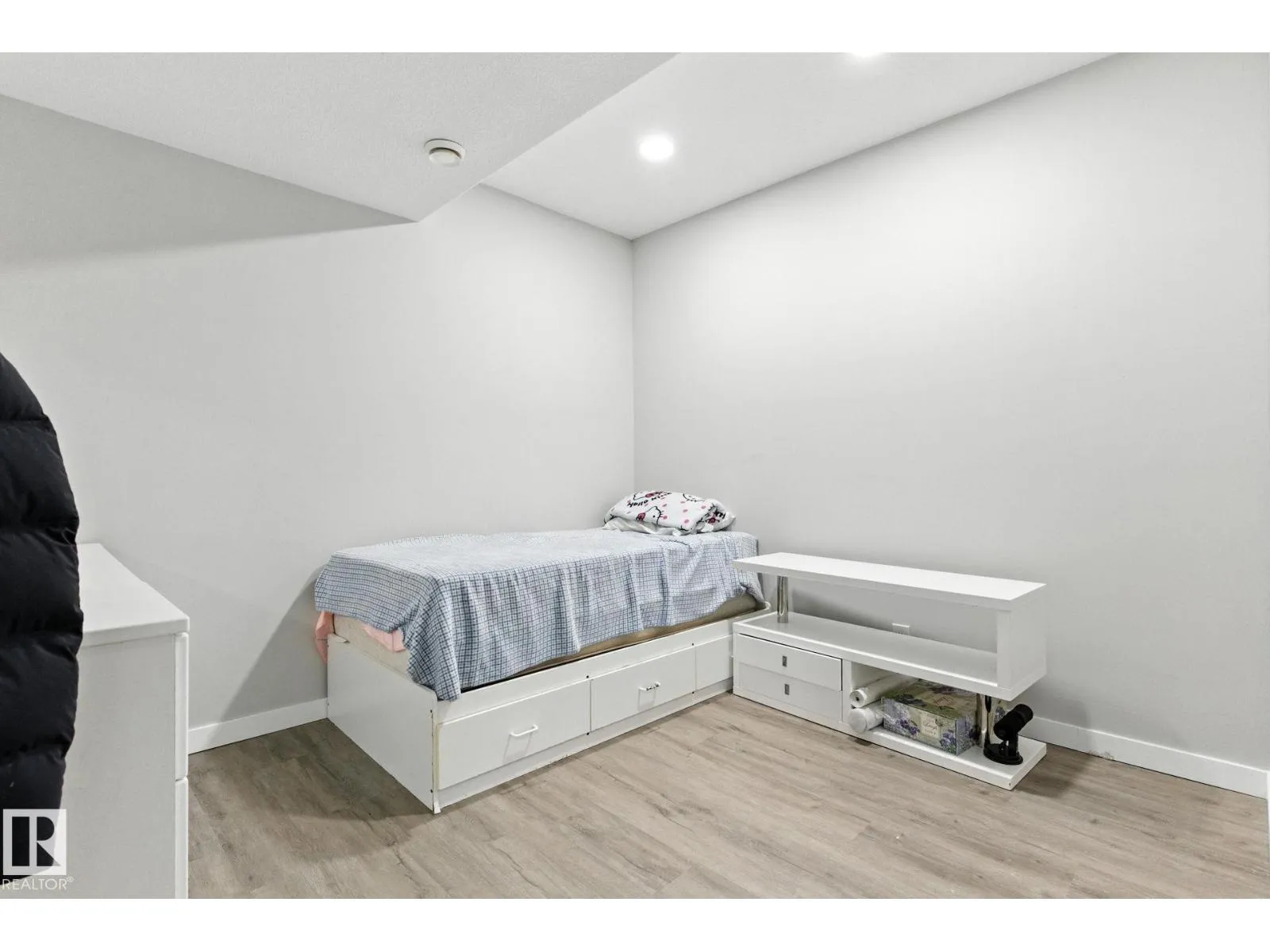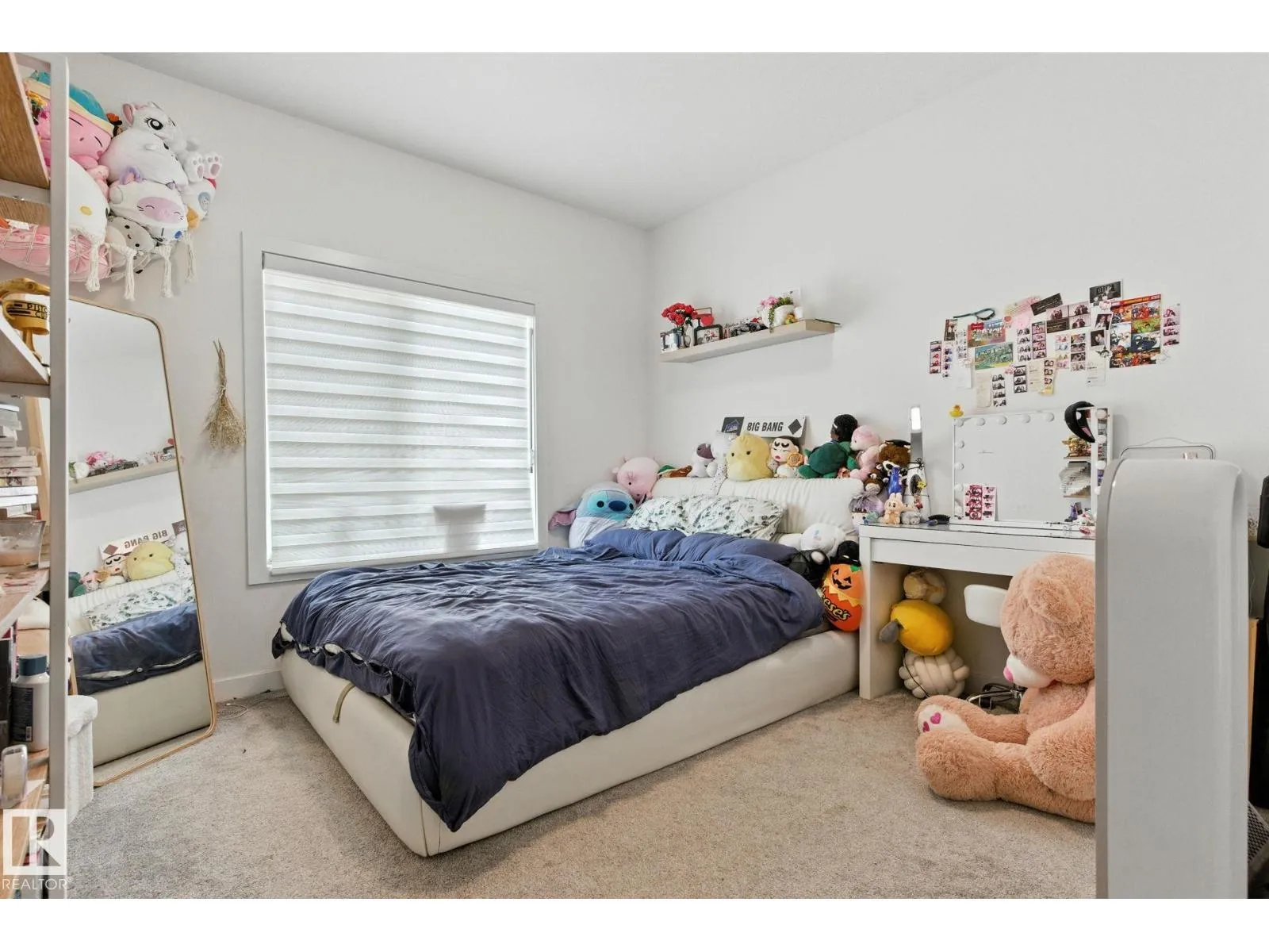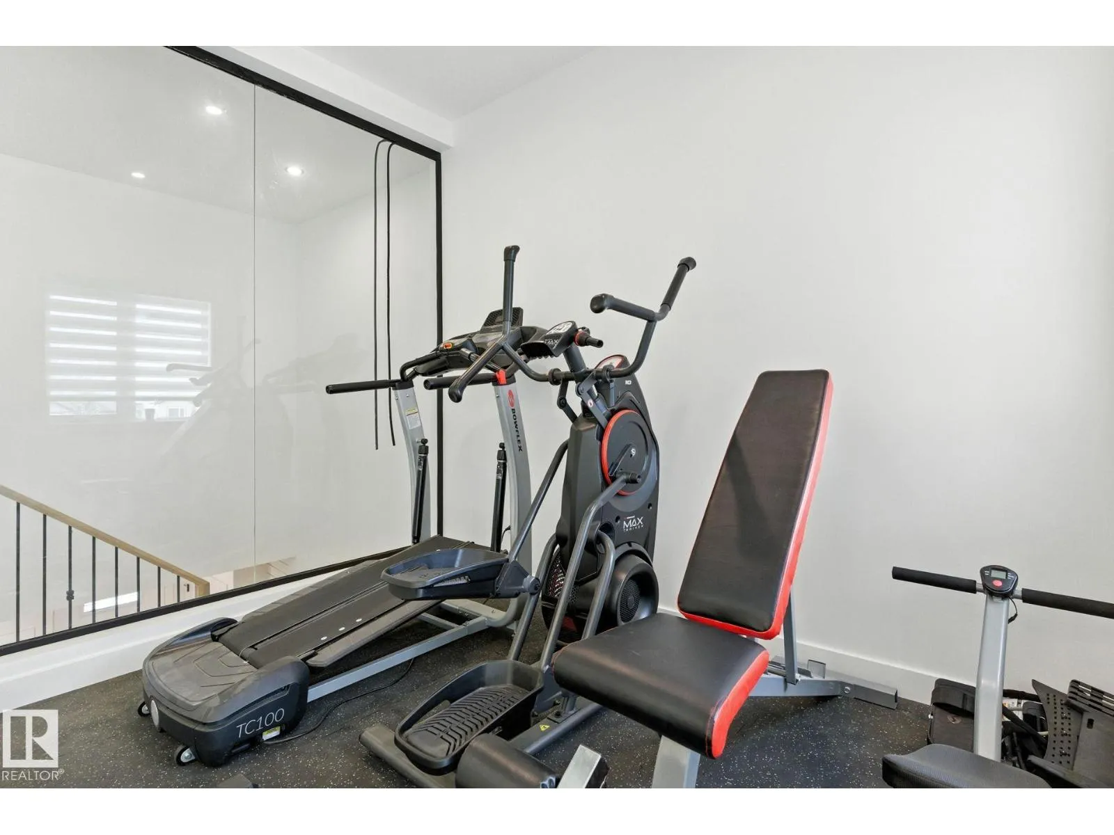 In the growing community of Kinglet Gardens, this home combines style and functionality, featuring elegant flooring, accent walls, upgraded lighting, and a kitchen with warm wood tones, built-in wine storage, and modern appliances. The main floor offers a dining area, full bathroom, and a flexible office or bedroom, while the open-to-above living room with floor-to-ceiling windows allows natural light to fill the space and creates a sense of openness. Upstairs includes a bonus room, a space suitable for a gym or meditation area, and a primary suite with coffered ceilings, barn door, ensuite with dual sinks, and a walk-in closet connected to the laundry, along with two additional bedrooms and a full bathroom. The finished basement features a separate side entrance, wet bar, entertainment area, and a den that can be used for work, guests, or hobbies, with additional storage and utility spaces. Located near schools, parks, and main roadways, the home supports a well-connected and convenient lifestyle. (id:27476)