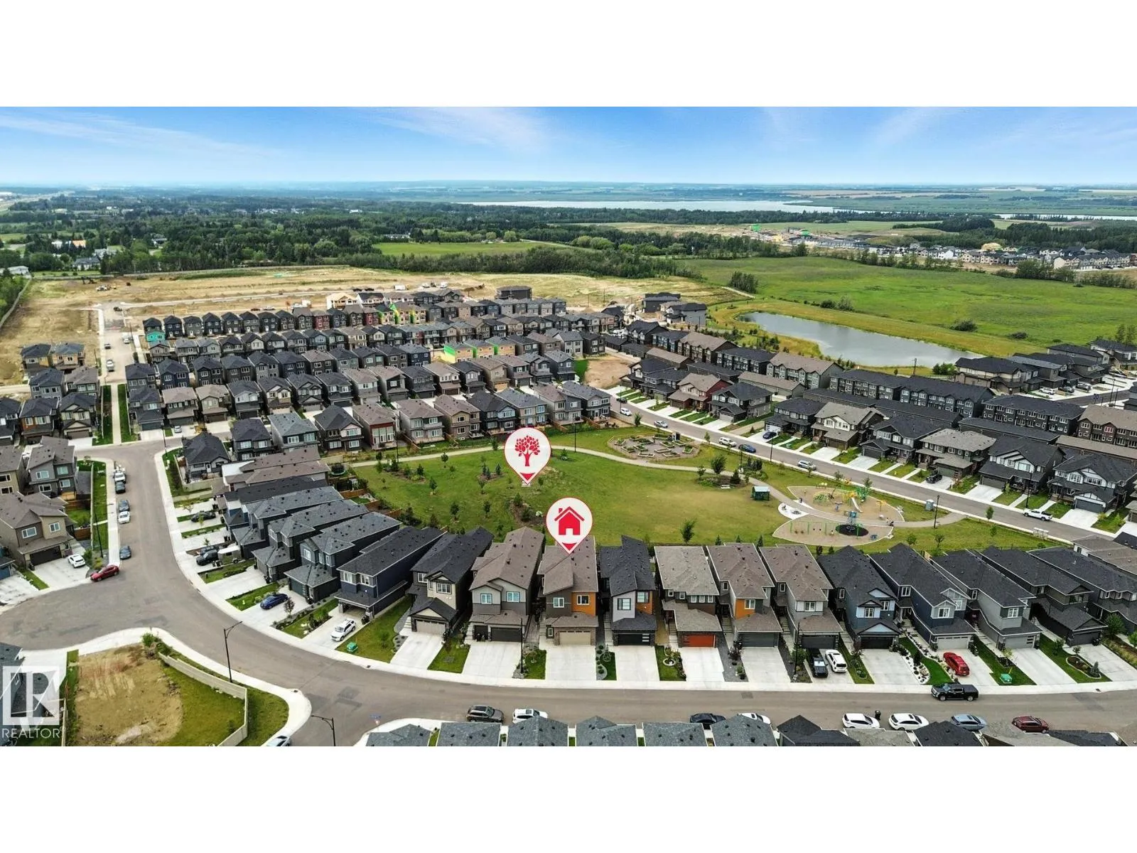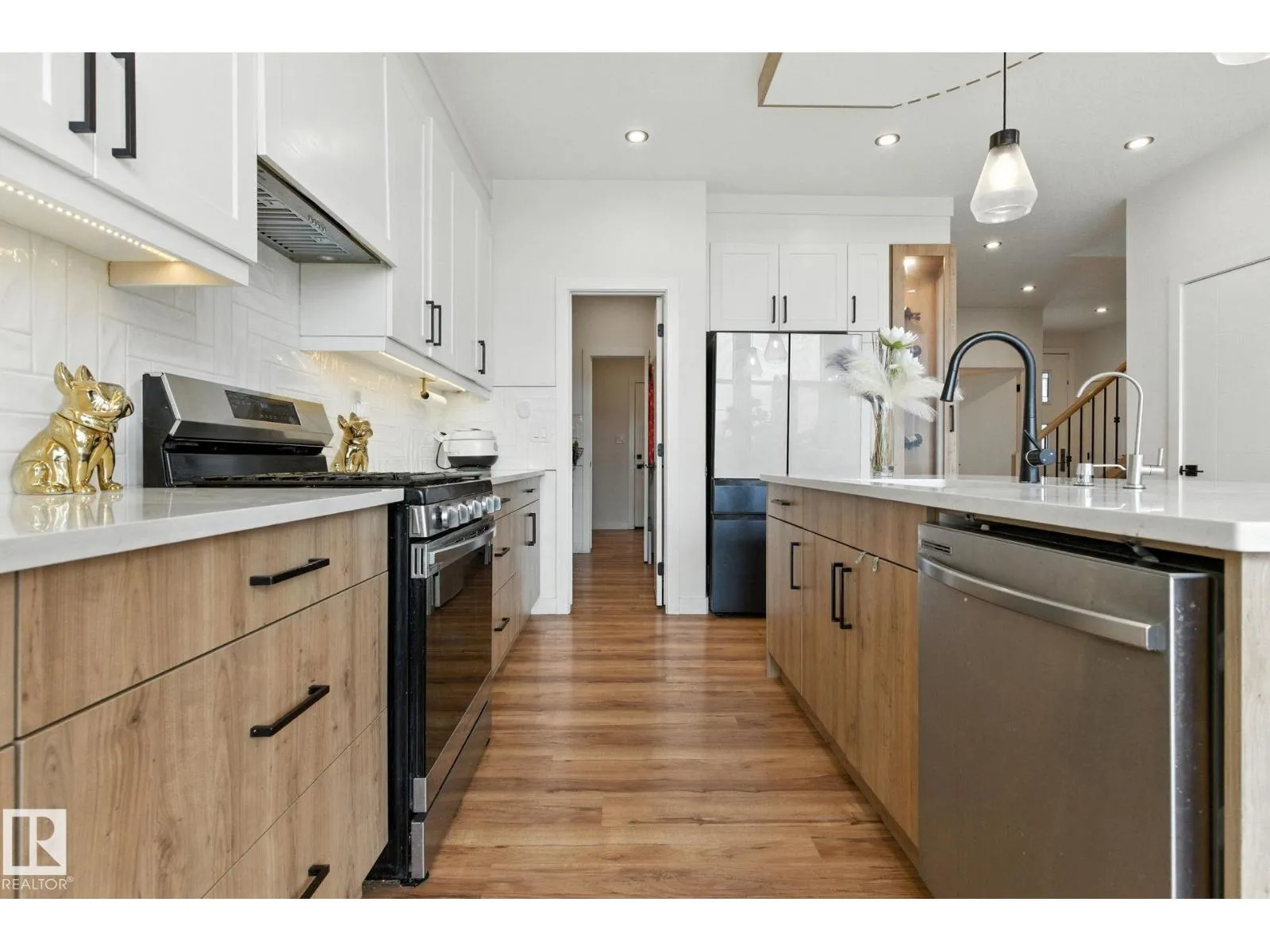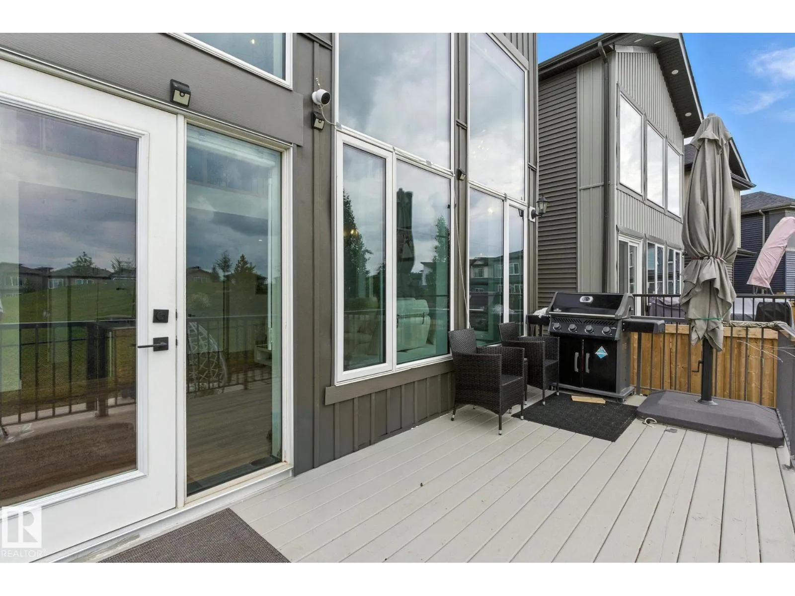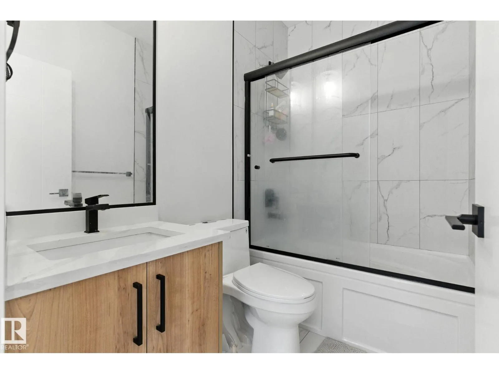 In the growing community of Kinglet Gardens, this home combines style and functionality, featuring elegant flooring, accent walls, upgraded lighting, and a kitchen with warm wood tones, built-in wine storage, and modern appliances. The main floor offers a dining area, full bathroom, and a flexible office or bedroom, while the open-to-above living room with floor-to-ceiling windows allows natural light to fill the space and creates a sense of openness. Upstairs includes a bonus room, a space suitable for a gym or meditation area, and a primary suite with coffered ceilings, barn door, ensuite with dual sinks, and a walk-in closet connected to the laundry, along with two additional bedrooms and a full bathroom. The finished basement features a separate side entrance, wet bar, entertainment area, and a den that can be used for work, guests, or hobbies, with additional storage and utility spaces. Located near schools, parks, and main roadways, the home supports a well-connected and convenient lifestyle. (id:27476)
