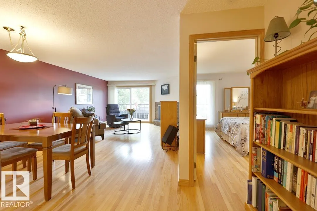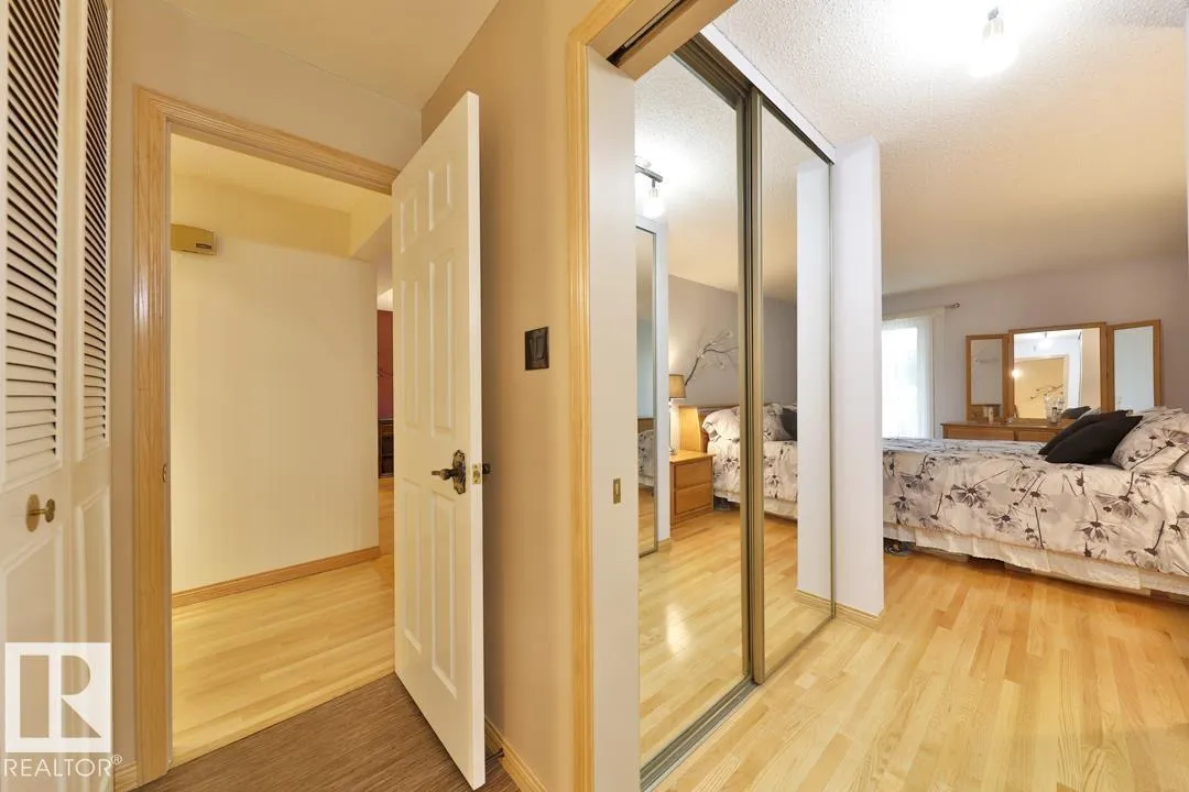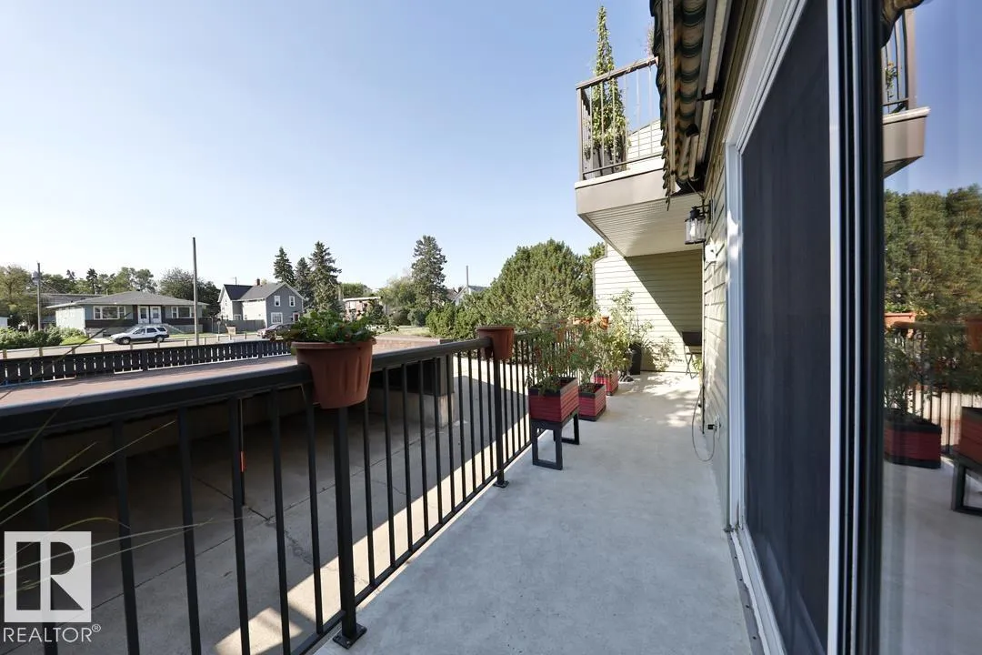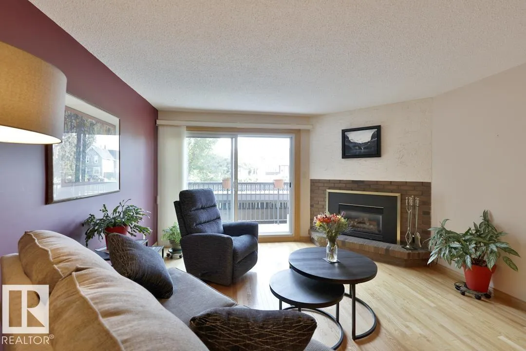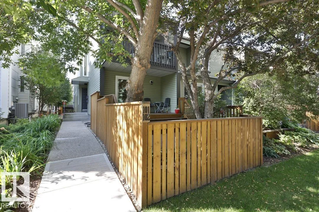Experience urban living in this private Strathcona gem on a quiet, tree-lined street. Surrounded by mature trees, stunning in fall, this central location is steps from Saskatchewan Drive, the river valley, walking & biking trails, & a 15-minute walk to the U of A. Ideal for outdoor enthusiasts and pet lovers, the home offers 2 bedrooms, each with an ensuite. The main living area features a cozy gas fireplace and sliding doors to a large south-facing balcony, partially covered and complete with a gas BBQ line, perfect for morning coffee or evening relaxation. The 2nd b/r opens to a north-facing fenced patio, creating a private outdoor retreat. Additional storage is available in the lower-level & a double carport adds convenience. Recent upgrades include Hunter Douglas blinds, lighting, some appliances & a new awning cover. Close to shops, the Strathcona Farmers Market, & Arts District, this meticulously maintained home blends nature, lifestyle, and city convenience. (id:27476)