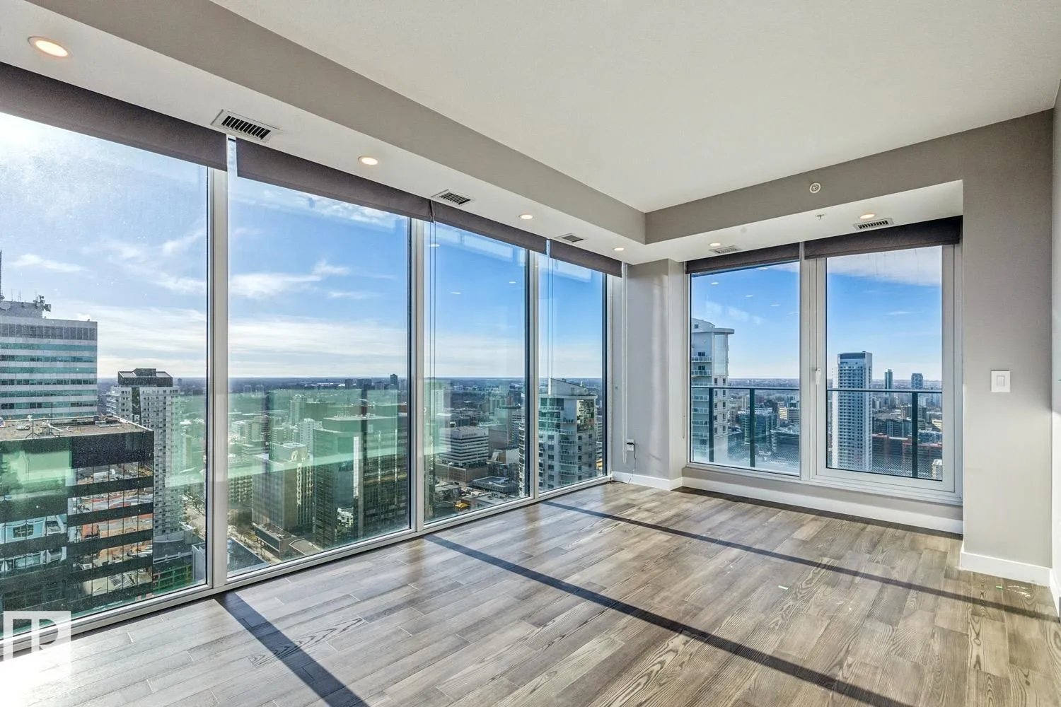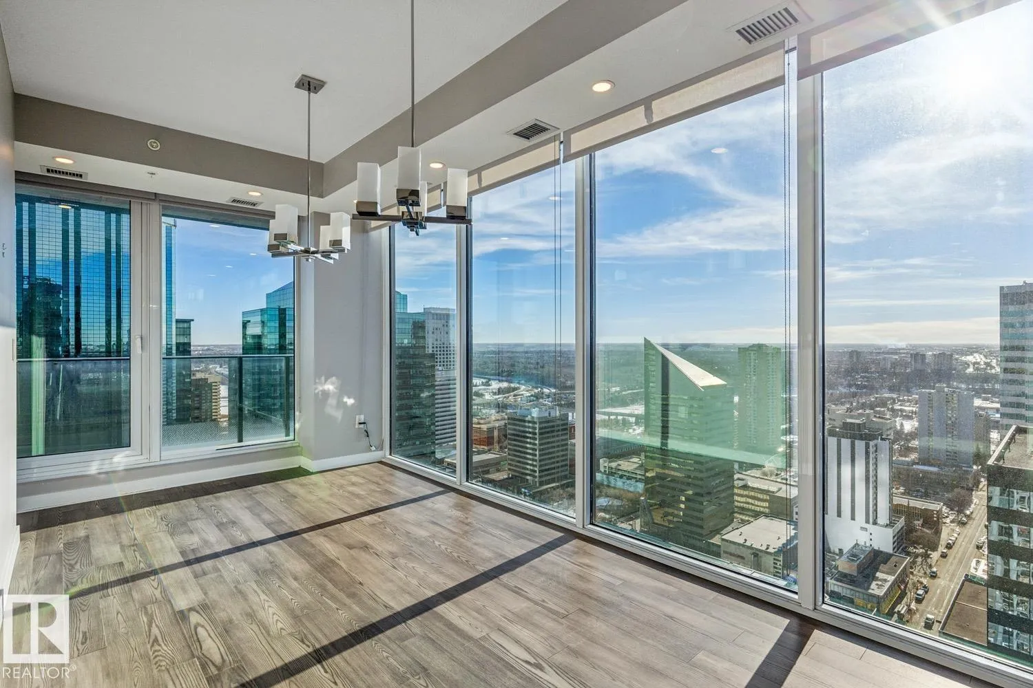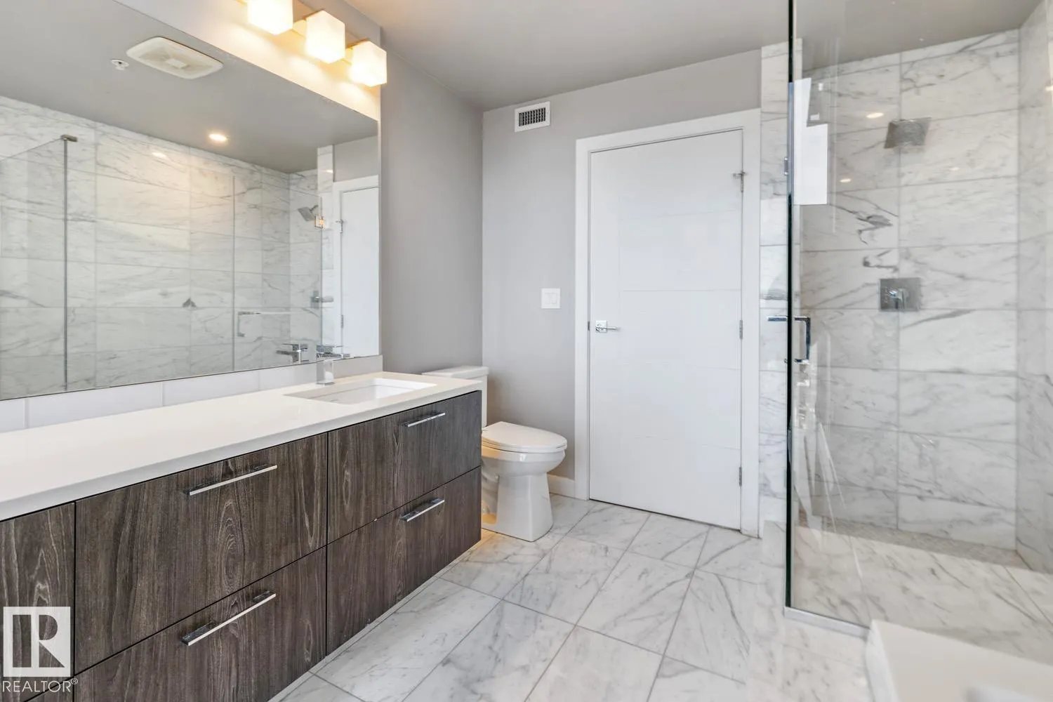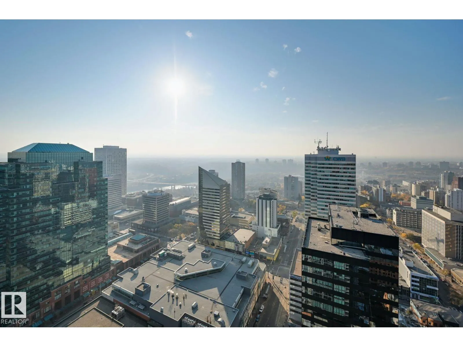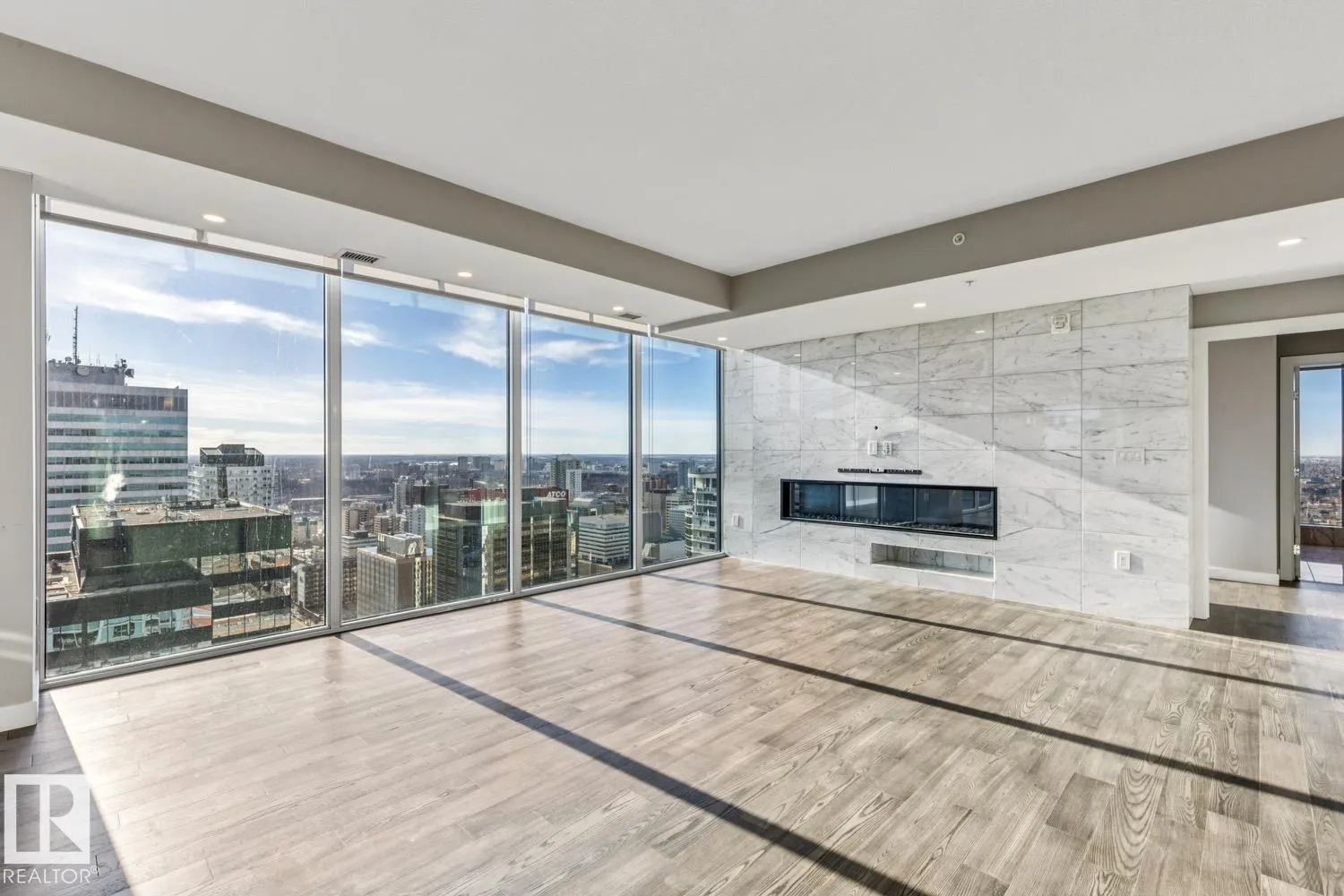 Too many upgrades to mention!! Welcome to Suite #3300 @ Encore Tower, an amazing 2 Bedroom, 2 Full Bath that is located on the ENTIRE SOUTH WALL of the Tower! This property offers some of the best city and rivervalley views that Edmonton has to offer! Suite upgrades include; Carrara Marble throughout: a fireplace feature wall, tile surfaces in both bathrooms, and front entry tile, as well as engineered glue-down hardwood floors. The unit offers a 100ft+ span of floor-to ceiling windows, with window coverings. Modern design includes a stylish kitchen with full-size stainless steel appliances, quartz countertops, a spacious island with seating, 9-foot ceilings* and in-suite laundry (full-size). Life at Encore includes many conveniences - friendly concierge, an inviting party-room, 4th floor sundeck and a private fitness room. Steps from ICE District, numerous dining choices, and an al fresco market?... Do not miss this opportunity at the city's ultimate central location, and best new-construction value! (id:27476)