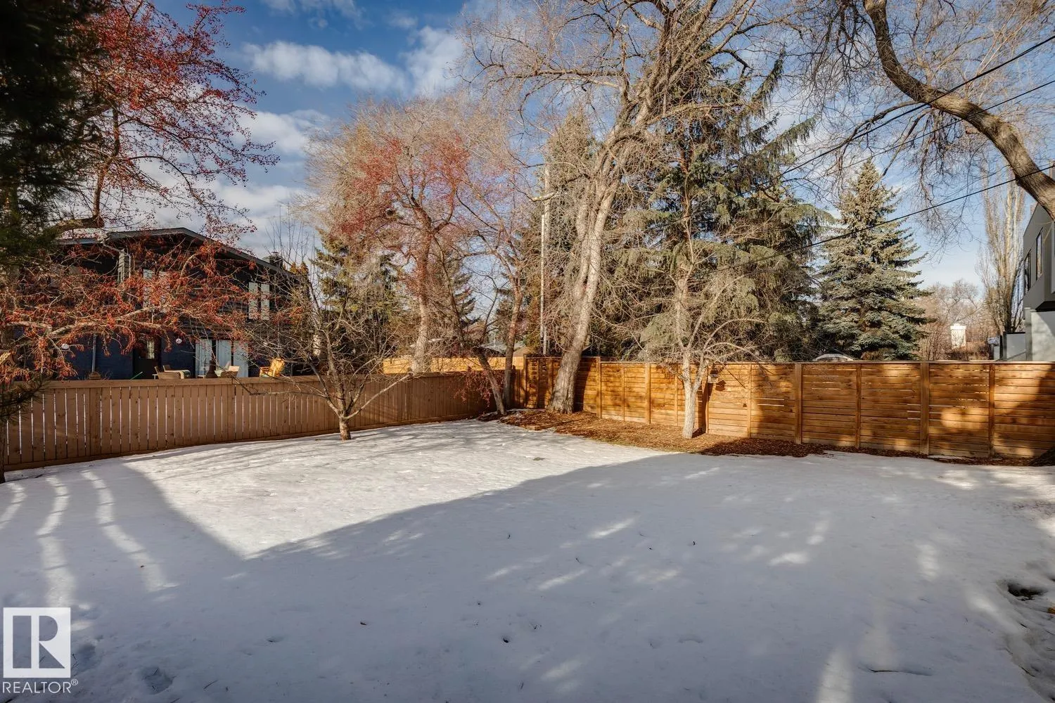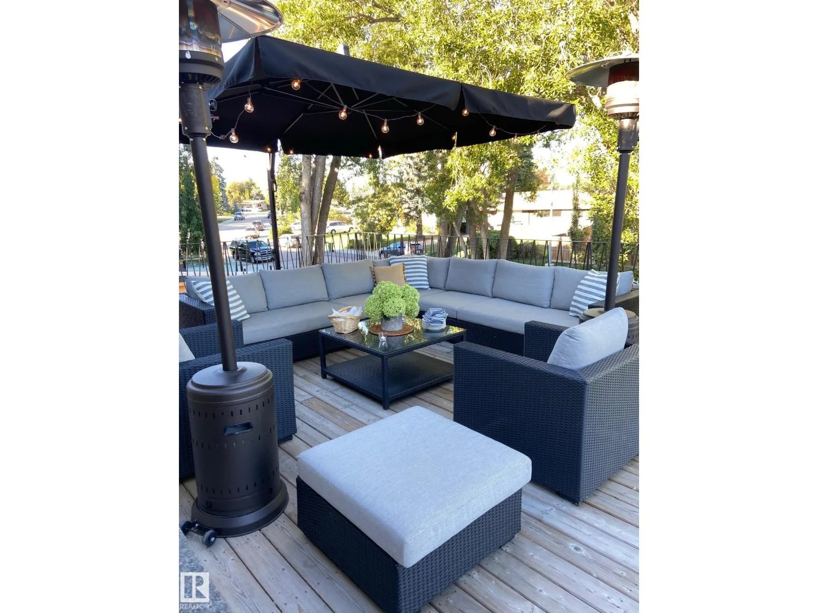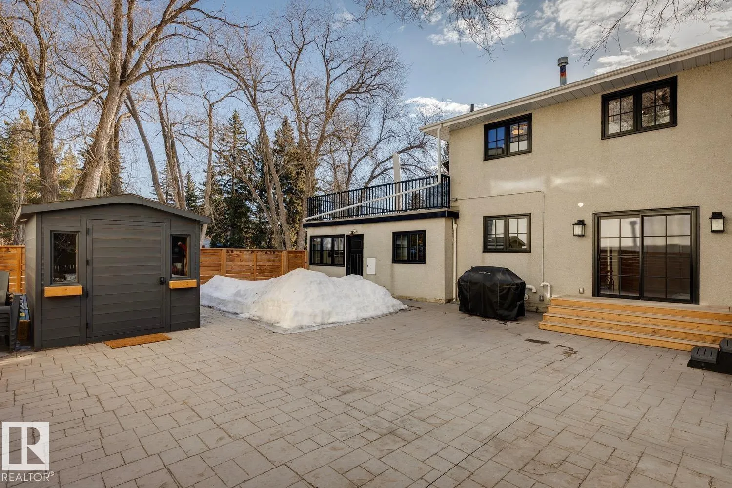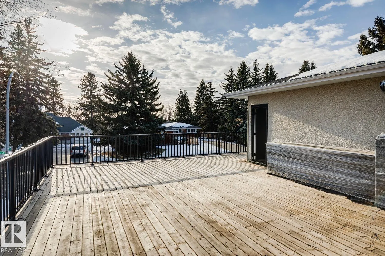 This is the one youâve been waiting for! Welcome to this elegantly renovated two-storey, with a huge rooftop patio, in the highly desirable neighbourhood of Rio Terrace. Situated on a expertly manicured 11,290 SF lot, and across the street from the North Saskatchewan River Valley, this 4-bedroom home offers exceptional space and function for modern family living. The main floor is spacious and bright, featuring a magazine worthy living room with stone-facing fireplace and massive south facing windows. Kitchen was designed with the chef in mind, and adjacent dining room is the spot to host all your dinner parties. Down the hall you'll find a large office/den with access to the backyard & side gate - perfect for a home based business! Upstairs youâll find three generous bedrooms including a stunning primary retreat with a massive walk-in closet & 3-piece ensuite, plus a full main bath. The basement is fully finished with large rec/family room, half-bath and 4th bedroom! Double attached garage, A/C & more! (id:27476)