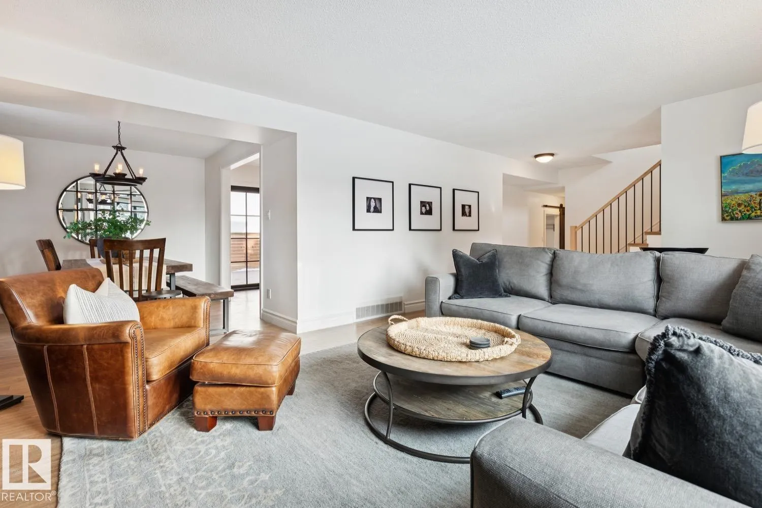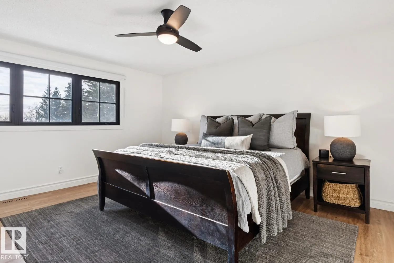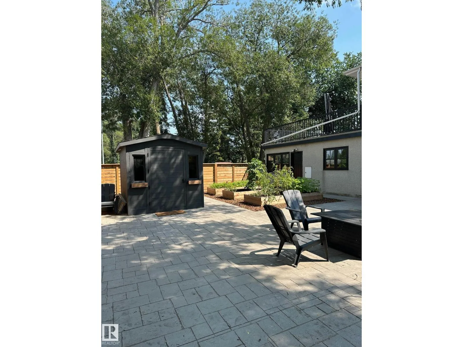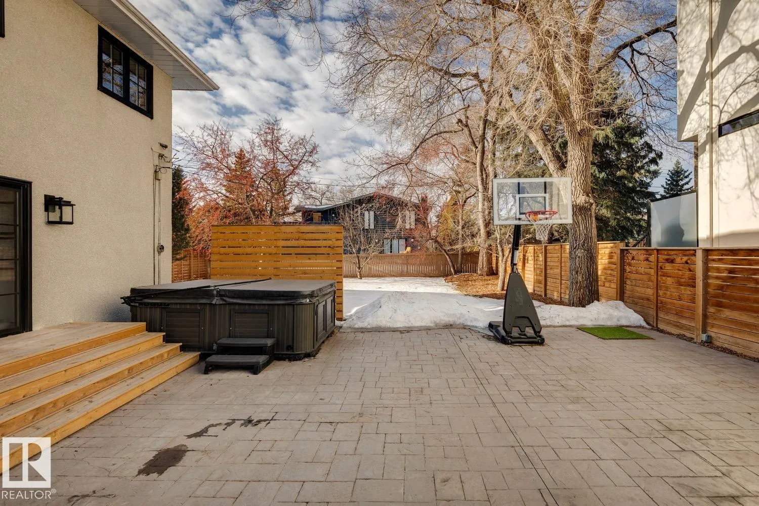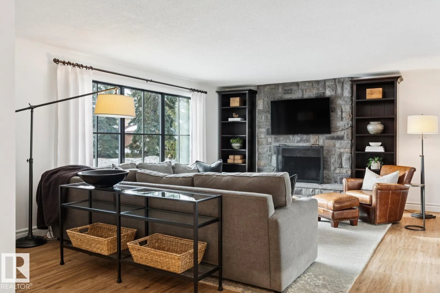 This is the one youâve been waiting for! Welcome to this elegantly renovated two-storey, with a huge rooftop patio, in the highly desirable neighbourhood of Rio Terrace. Situated on a expertly manicured 11,290 SF lot, and across the street from the North Saskatchewan River Valley, this 4-bedroom home offers exceptional space and function for modern family living. The main floor is spacious and bright, featuring a magazine worthy living room with stone-facing fireplace and massive south facing windows. Kitchen was designed with the chef in mind, and adjacent dining room is the spot to host all your dinner parties. Down the hall you'll find a large office/den with access to the backyard & side gate - perfect for a home based business! Upstairs youâll find three generous bedrooms including a stunning primary retreat with a massive walk-in closet & 3-piece ensuite, plus a full main bath. The basement is fully finished with large rec/family room, half-bath and 4th bedroom! Double attached garage, A/C & more! (id:27476)