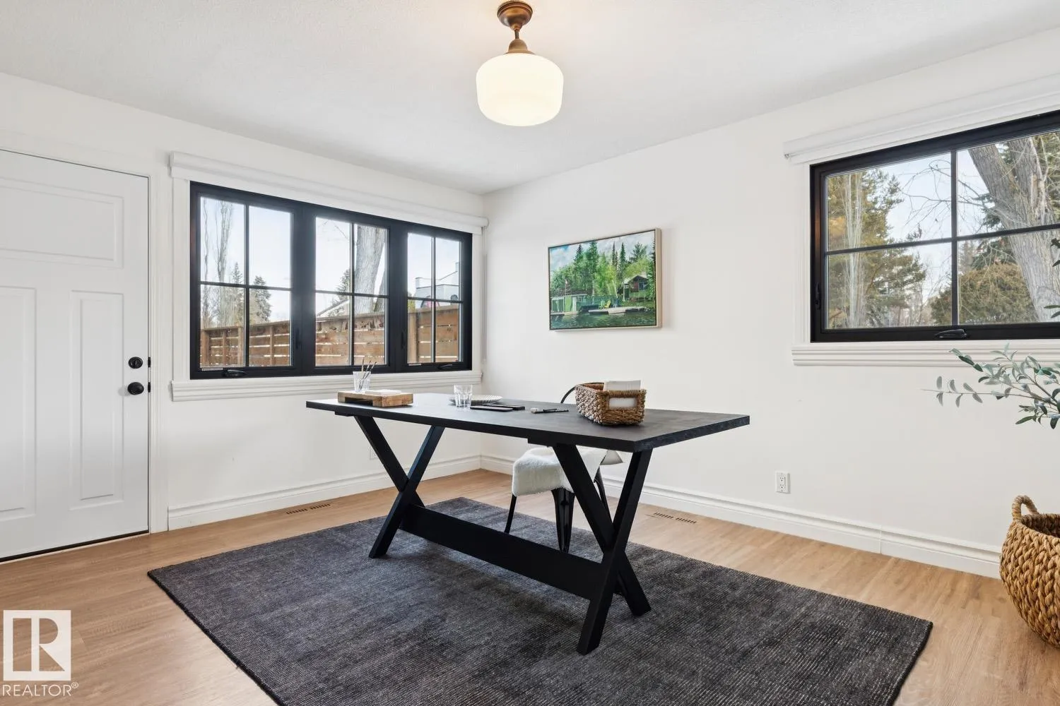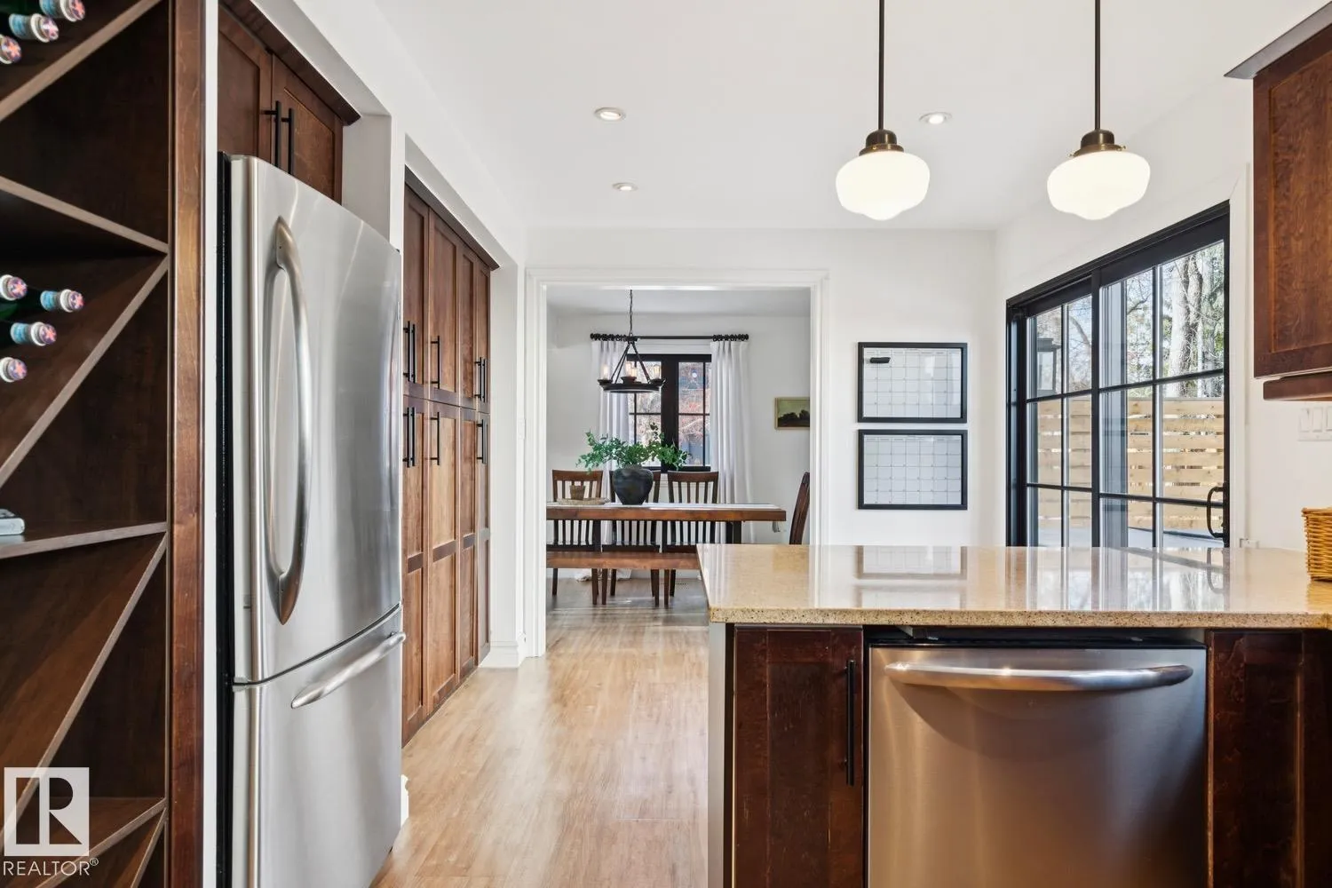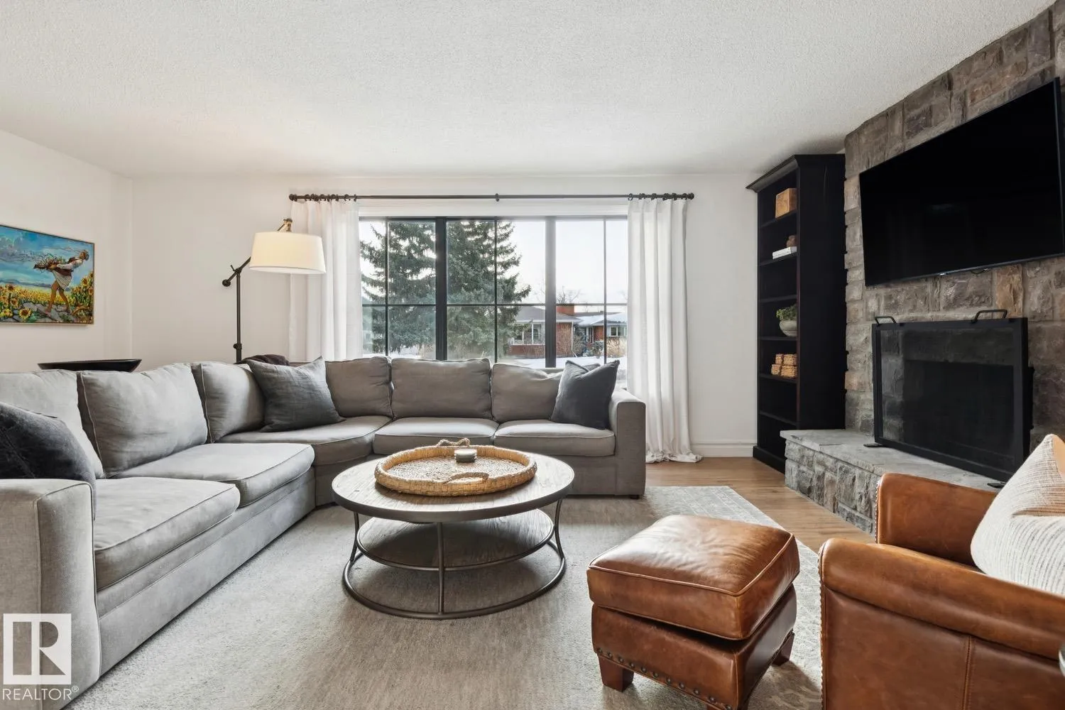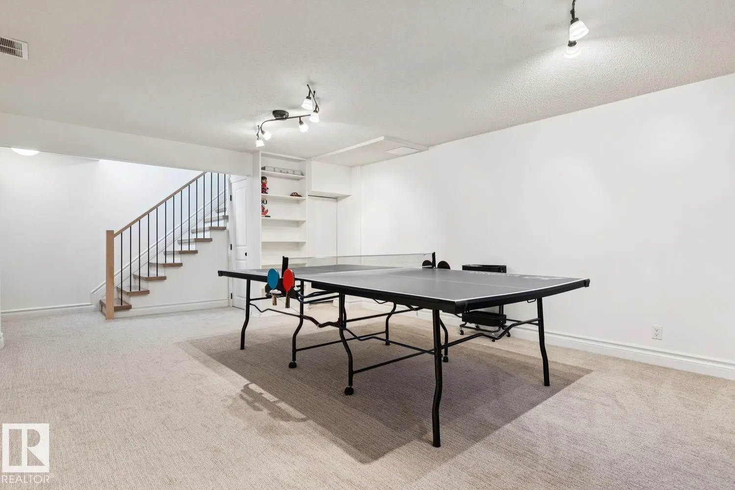 This is the one youâve been waiting for! Welcome to this elegantly renovated two-storey, with a huge rooftop patio, in the highly desirable neighbourhood of Rio Terrace. Situated on a expertly manicured 11,290 SF lot, and across the street from the North Saskatchewan River Valley, this 4-bedroom home offers exceptional space and function for modern family living. The main floor is spacious and bright, featuring a magazine worthy living room with stone-facing fireplace and massive south facing windows. Kitchen was designed with the chef in mind, and adjacent dining room is the spot to host all your dinner parties. Down the hall you'll find a large office/den with access to the backyard & side gate - perfect for a home based business! Upstairs youâll find three generous bedrooms including a stunning primary retreat with a massive walk-in closet & 3-piece ensuite, plus a full main bath. The basement is fully finished with large rec/family room, half-bath and 4th bedroom! Double attached garage, A/C & more! (id:27476)