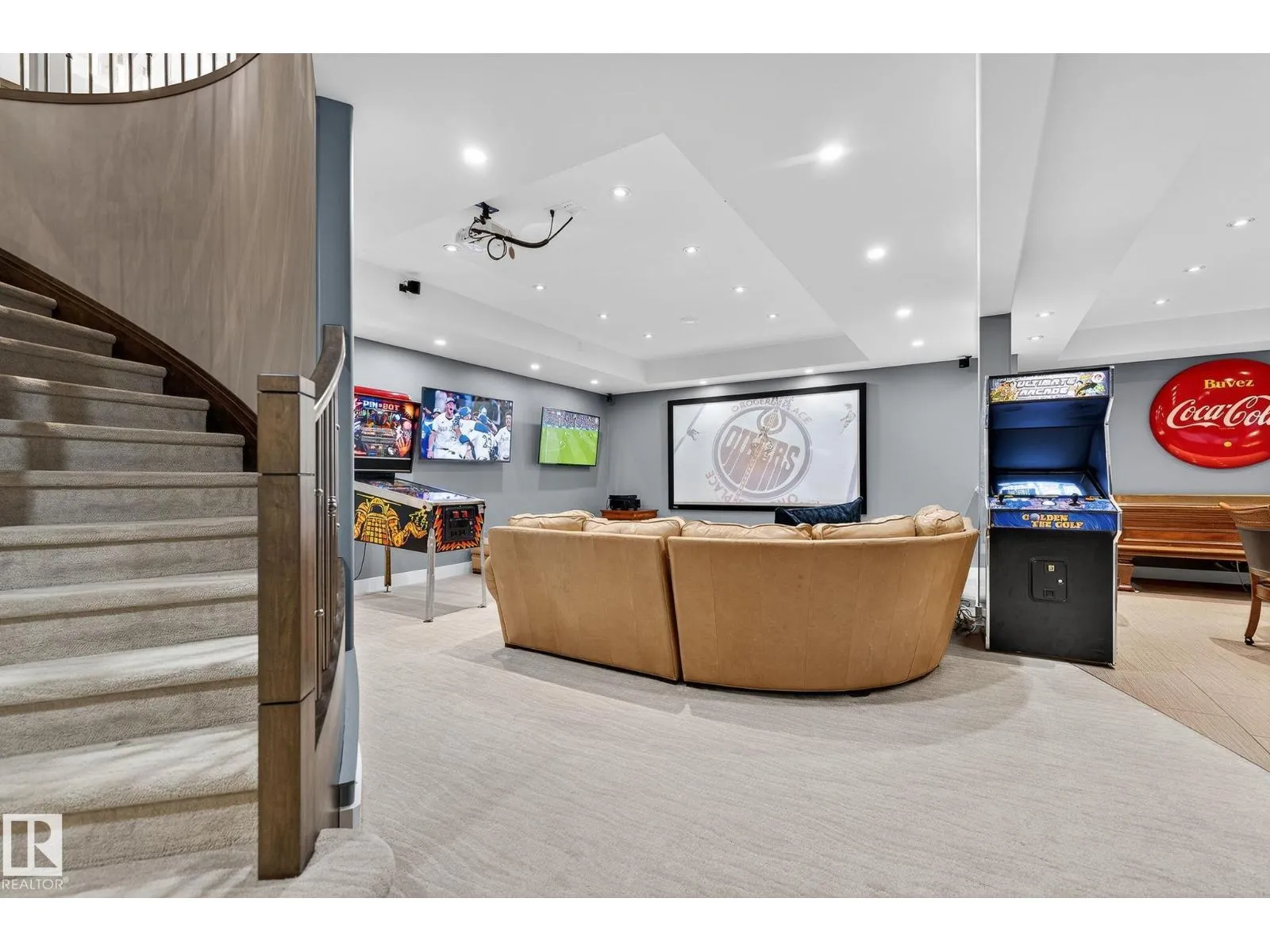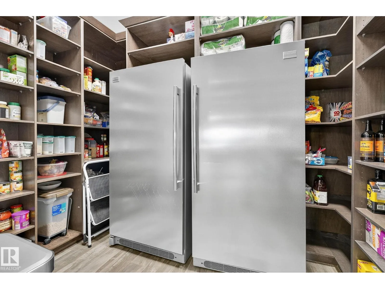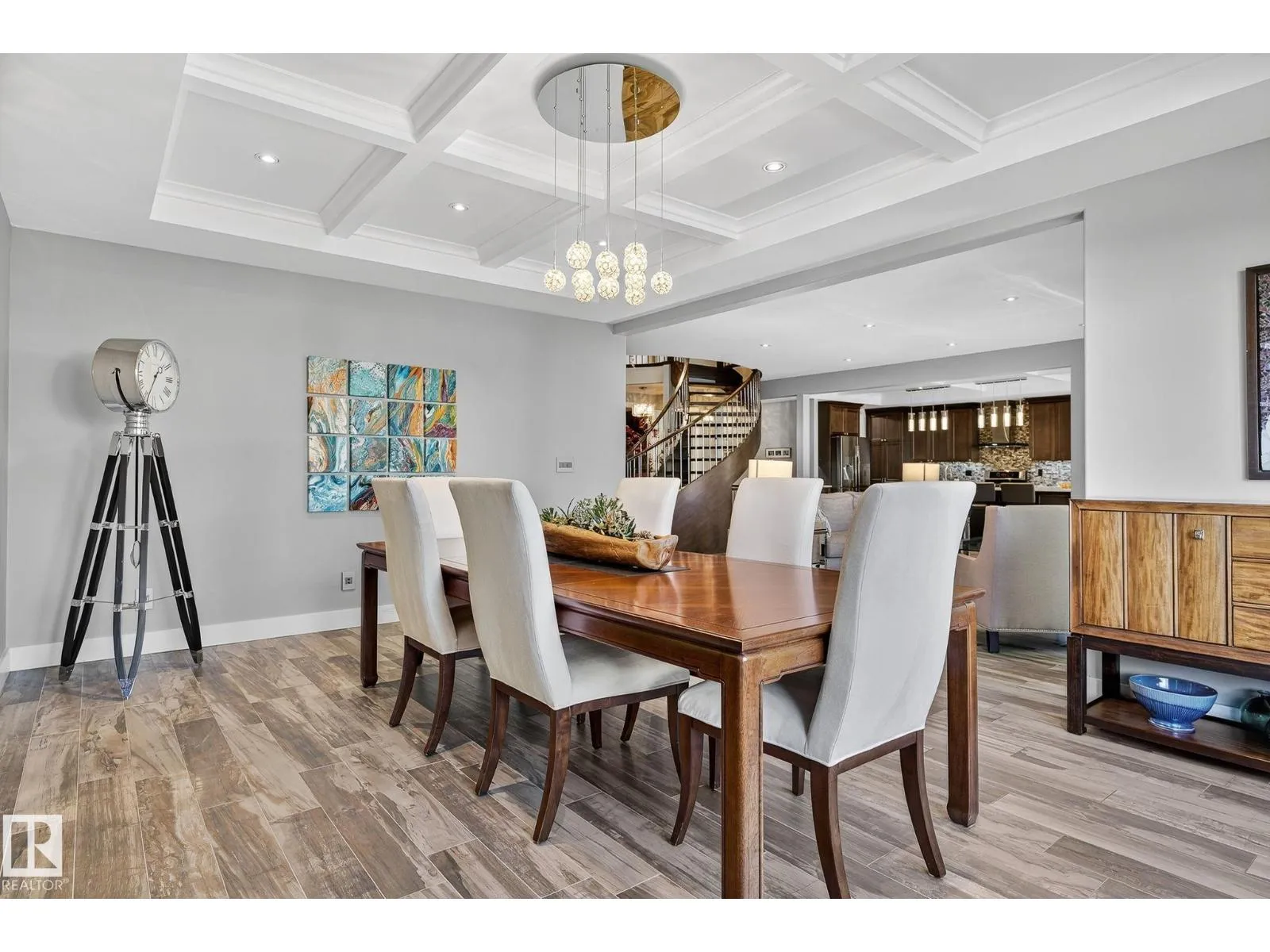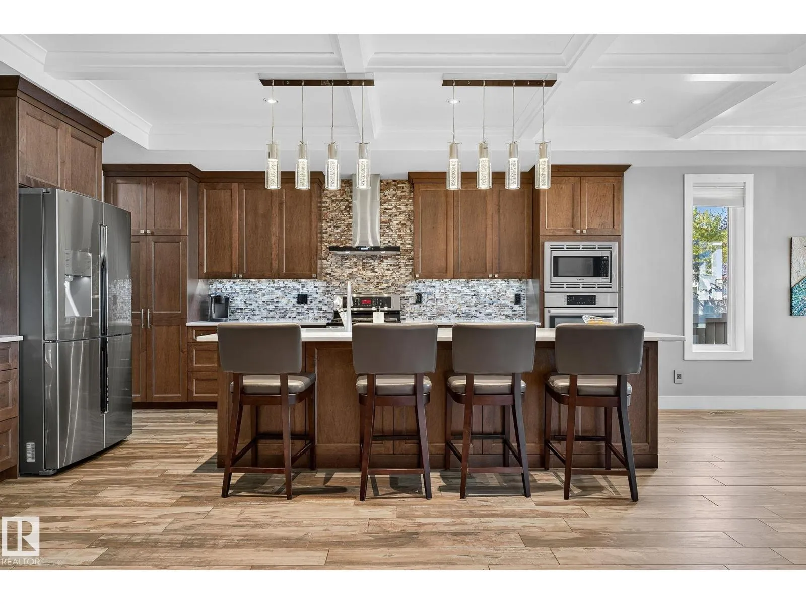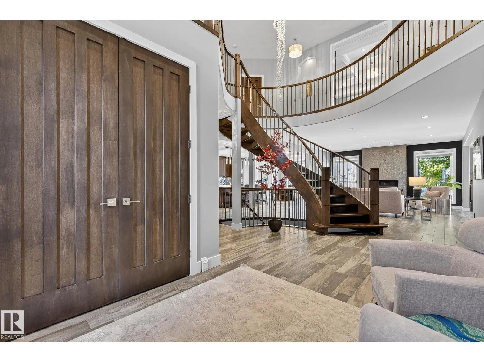 Exquisite custom-built estate in the prestigious Properties of Donsdale, one of Edmontonâs most sought-after communities. Offering 6,952sqft just steps from the river valley, this home seamlessly blends luxury, functionality & craftsmanship. Featuring an open floor plan with 9ft ceilings on all floors, spiral staircase, warm durable tile flooring & plenty of natural light. The chefâs kitchen stuns with quartz counters, dual ovens, dishwashers, fridges, massive pantry & coffered ceilings. Highlights include a presidential office, grand dining room, spacious mudroom. Upstairs, the primary suite offers dual walk-ins, a spa ensuite w/ heated floors, jetted tub & fireplace. Three additional bedrooms each enjoy walk-in closets & private ensuites + laundry & a cozy bonus room. The finished basement boasts zoned in-floor heat, wet bar, private HIDDEN BOOKSHELF theatre, multi-TV sports area, hockey & art room or 2 bedrooms. Oversized triple heated garage w/ drains & low maintenance turf yards + so much more. (id:27476)