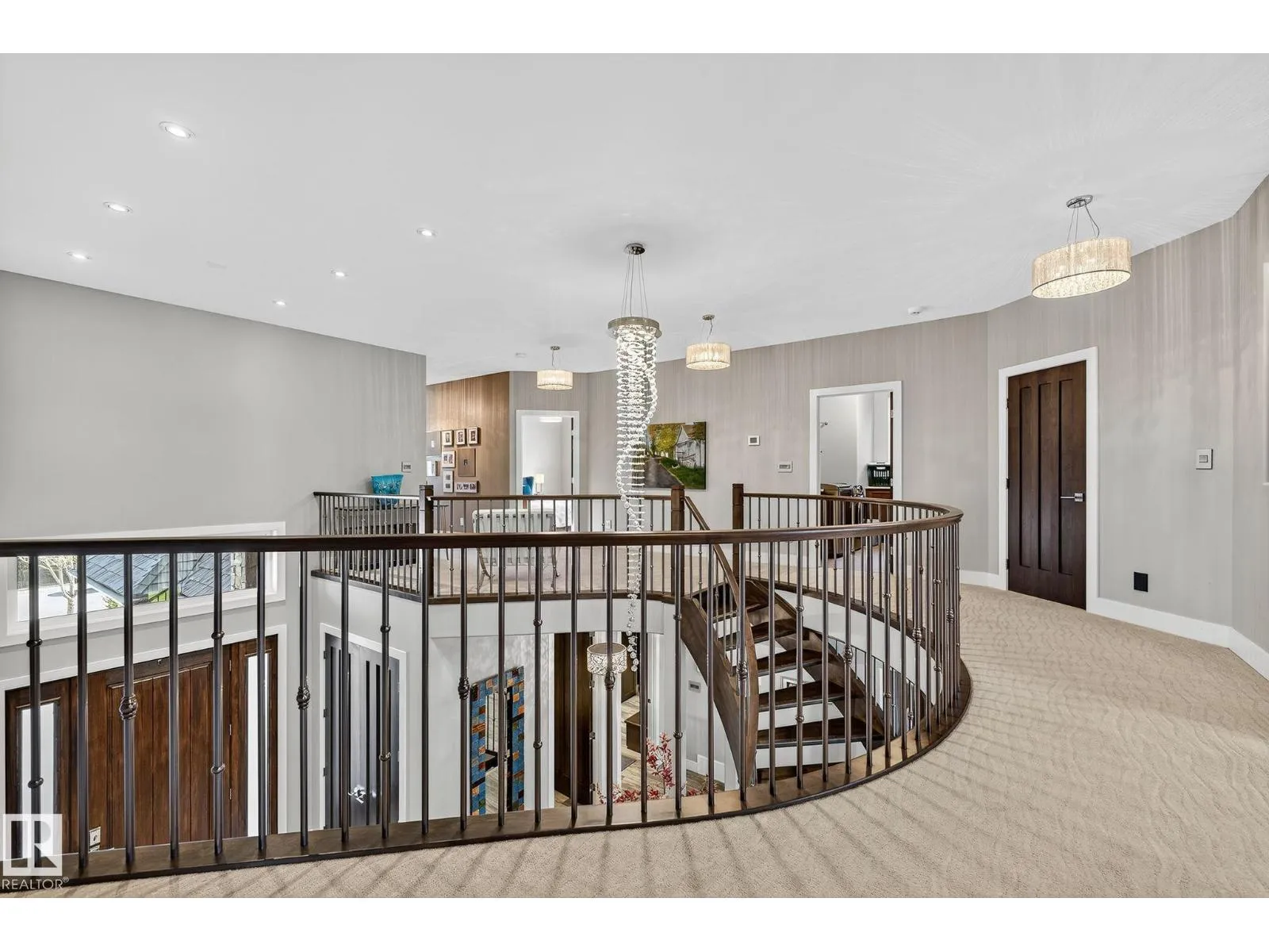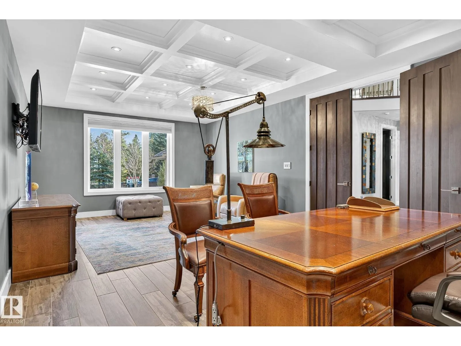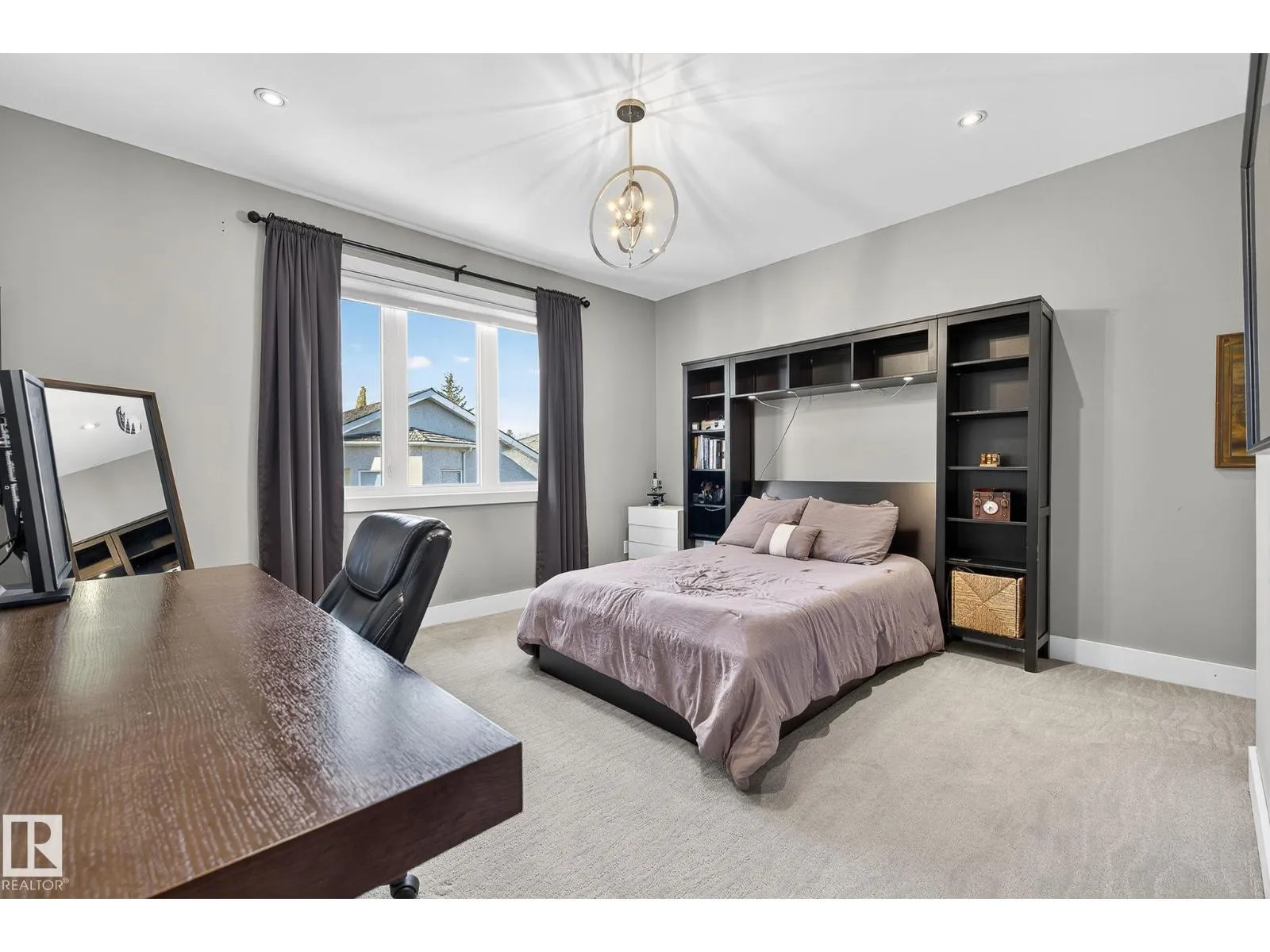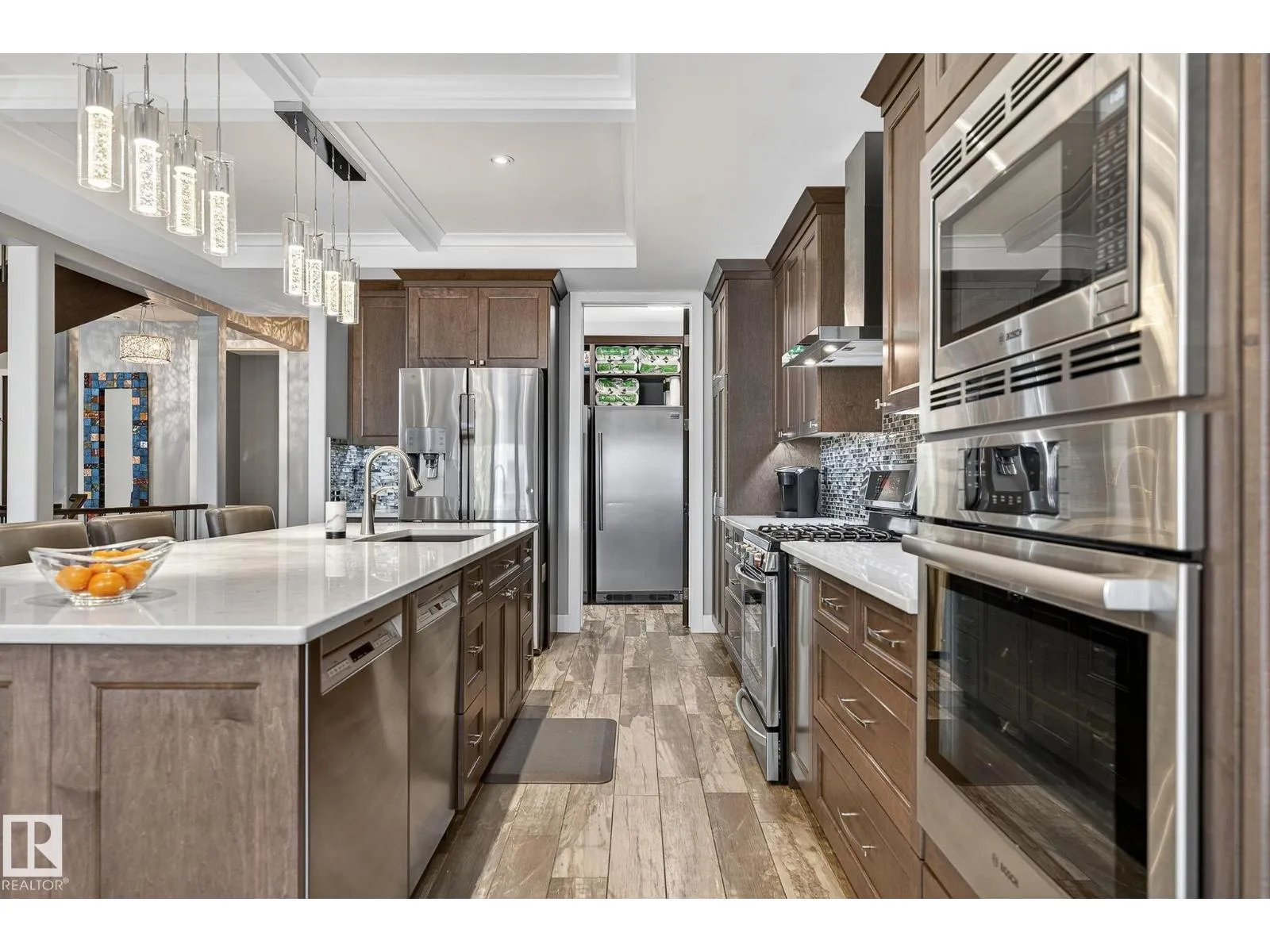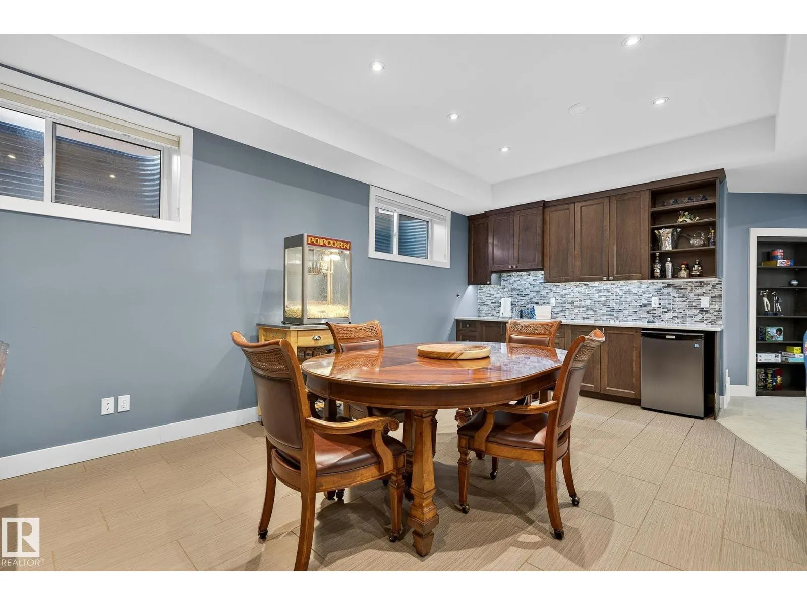 Exquisite custom-built estate in the prestigious Properties of Donsdale, one of Edmontonâs most sought-after communities. Offering 6,952sqft just steps from the river valley, this home seamlessly blends luxury, functionality & craftsmanship. Featuring an open floor plan with 9ft ceilings on all floors, spiral staircase, warm durable tile flooring & plenty of natural light. The chefâs kitchen stuns with quartz counters, dual ovens, dishwashers, fridges, massive pantry & coffered ceilings. Highlights include a presidential office, grand dining room, spacious mudroom. Upstairs, the primary suite offers dual walk-ins, a spa ensuite w/ heated floors, jetted tub & fireplace. Three additional bedrooms each enjoy walk-in closets & private ensuites + laundry & a cozy bonus room. The finished basement boasts zoned in-floor heat, wet bar, private HIDDEN BOOKSHELF theatre, multi-TV sports area, hockey & art room or 2 bedrooms. Oversized triple heated garage w/ drains & low maintenance turf yards + so much more. (id:27476)