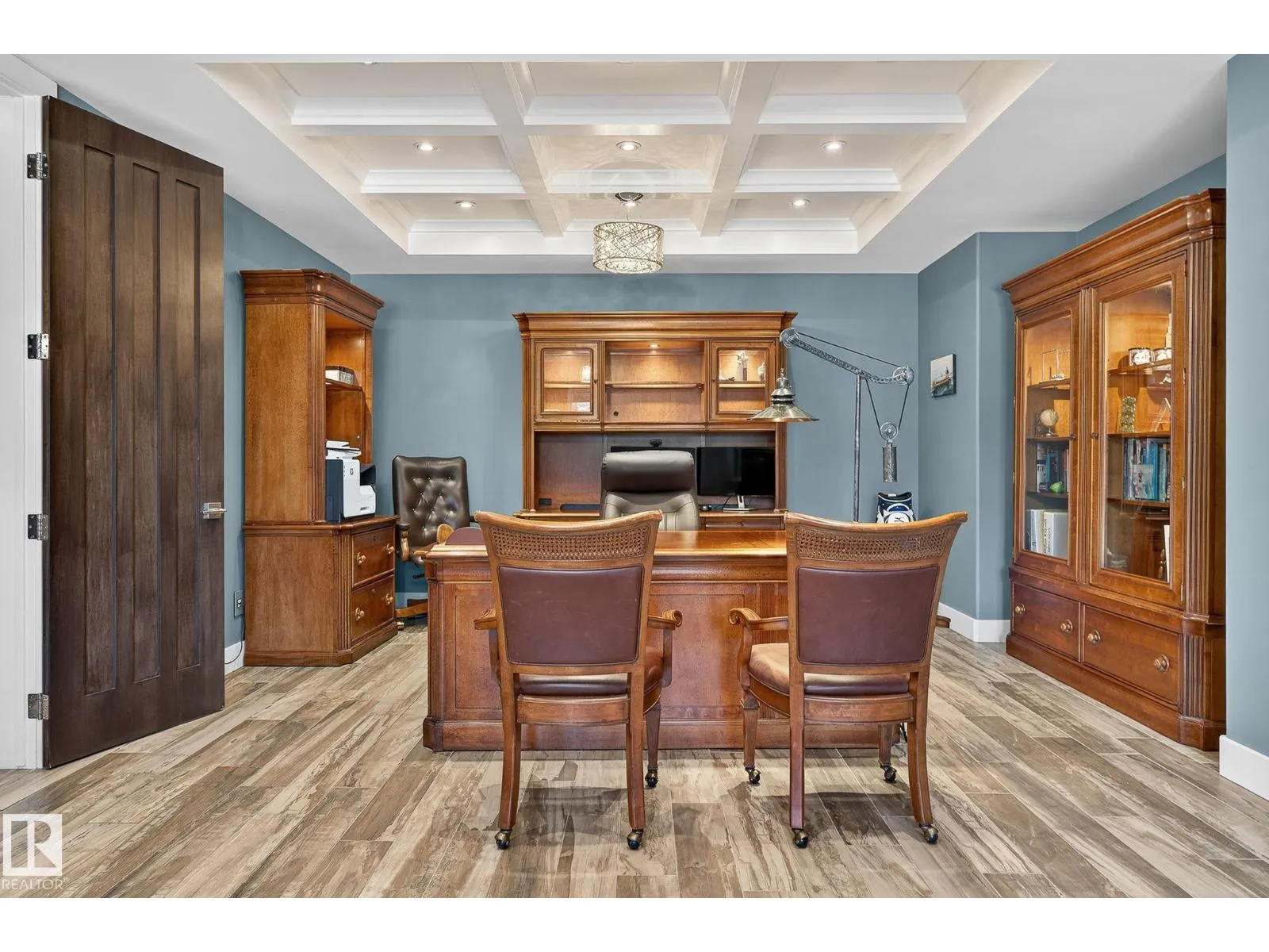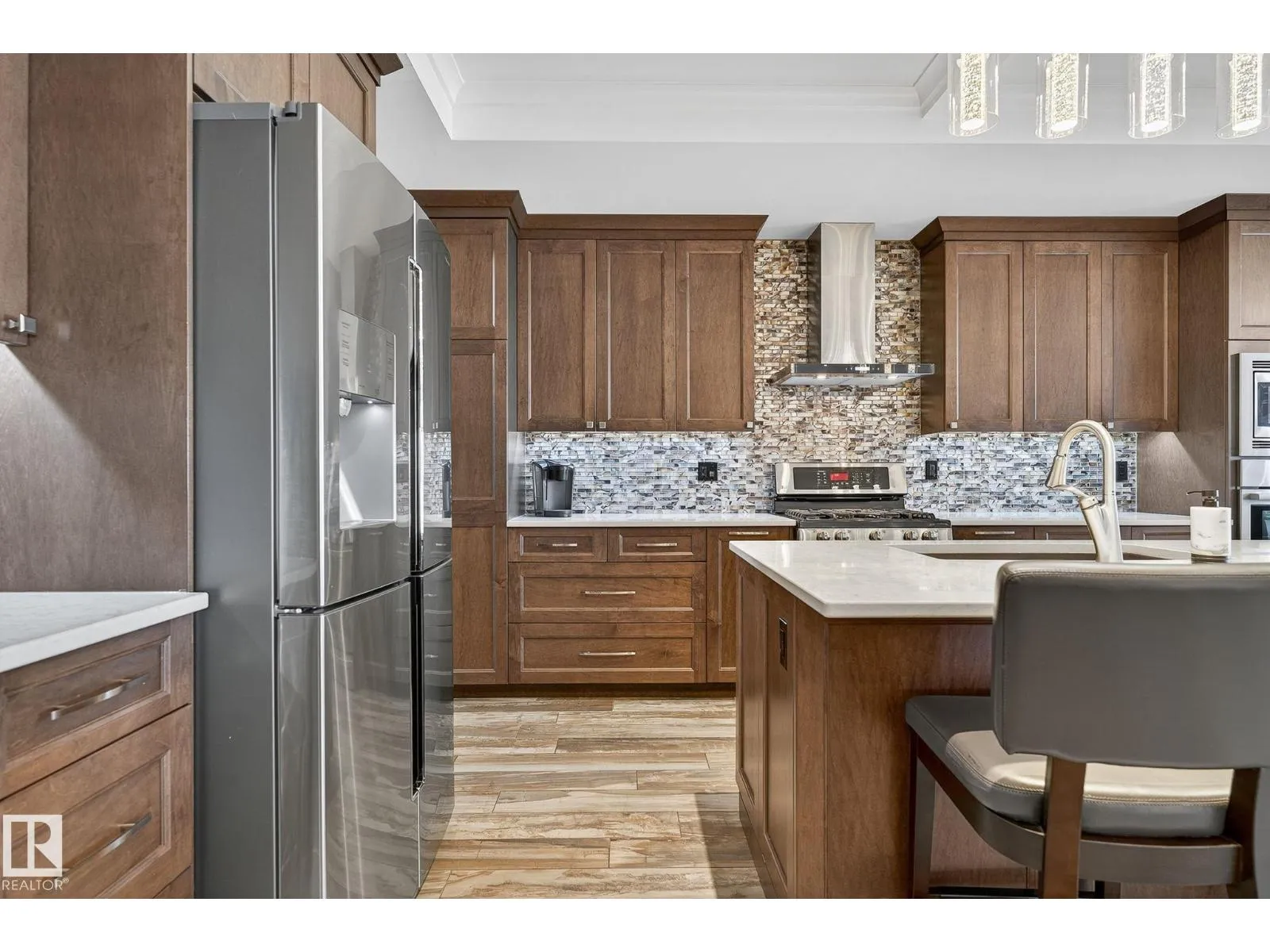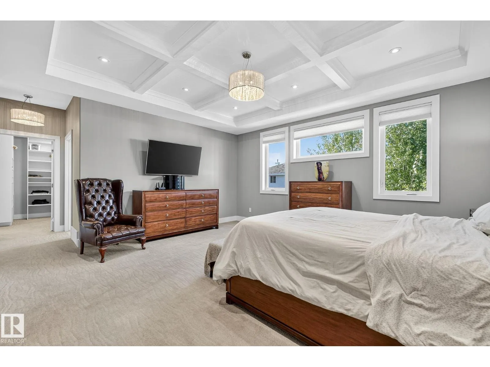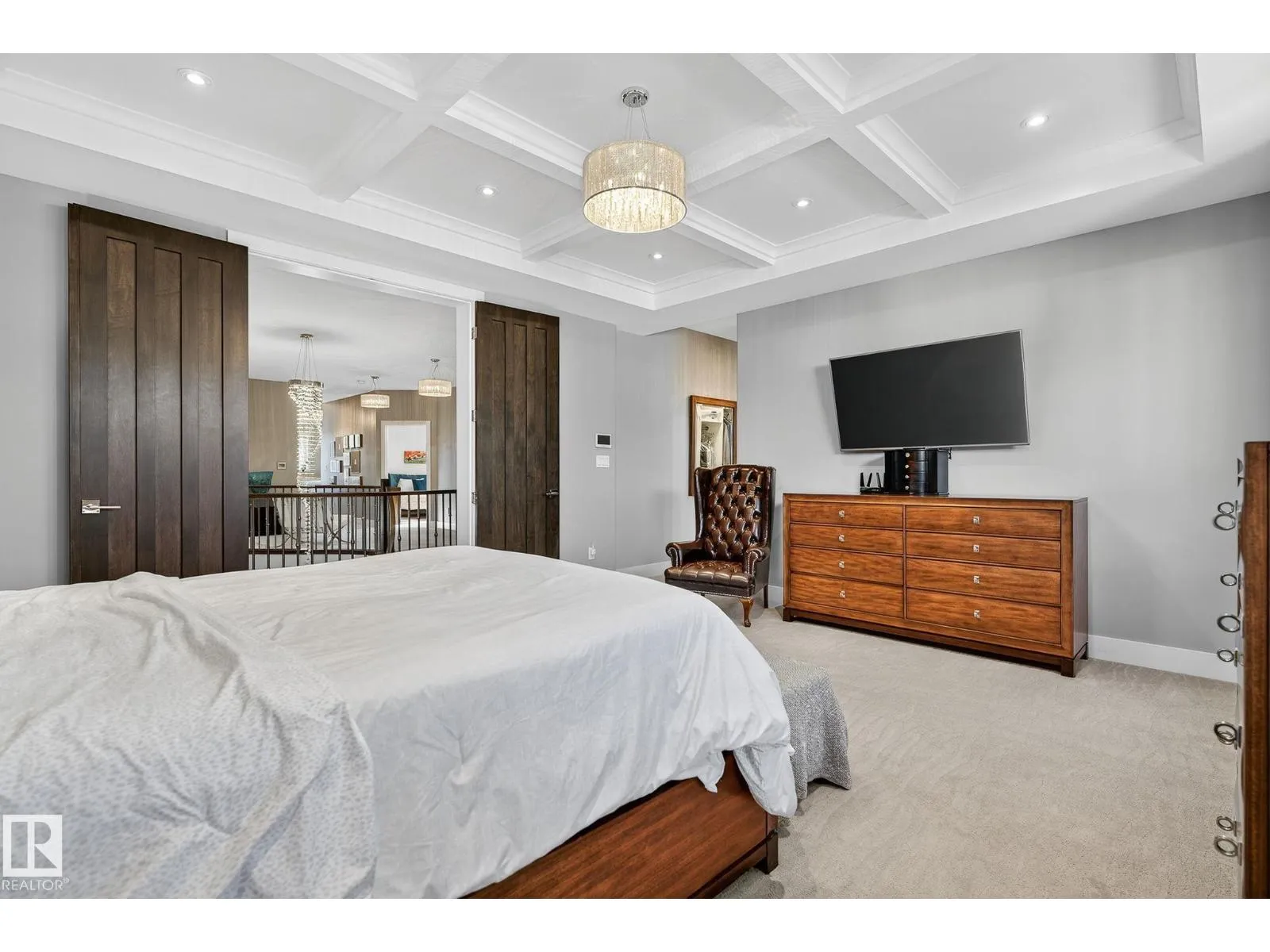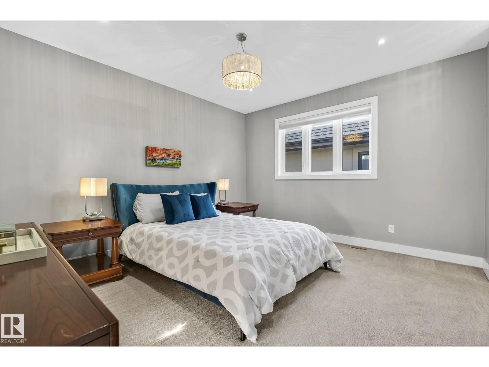 Exquisite custom-built estate in the prestigious Properties of Donsdale, one of Edmontonâs most sought-after communities. Offering 6,952sqft just steps from the river valley, this home seamlessly blends luxury, functionality & craftsmanship. Featuring an open floor plan with 9ft ceilings on all floors, spiral staircase, warm durable tile flooring & plenty of natural light. The chefâs kitchen stuns with quartz counters, dual ovens, dishwashers, fridges, massive pantry & coffered ceilings. Highlights include a presidential office, grand dining room, spacious mudroom. Upstairs, the primary suite offers dual walk-ins, a spa ensuite w/ heated floors, jetted tub & fireplace. Three additional bedrooms each enjoy walk-in closets & private ensuites + laundry & a cozy bonus room. The finished basement boasts zoned in-floor heat, wet bar, private HIDDEN BOOKSHELF theatre, multi-TV sports area, hockey & art room or 2 bedrooms. Oversized triple heated garage w/ drains & low maintenance turf yards + so much more. (id:27476)