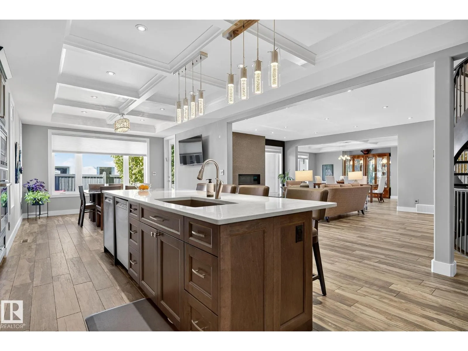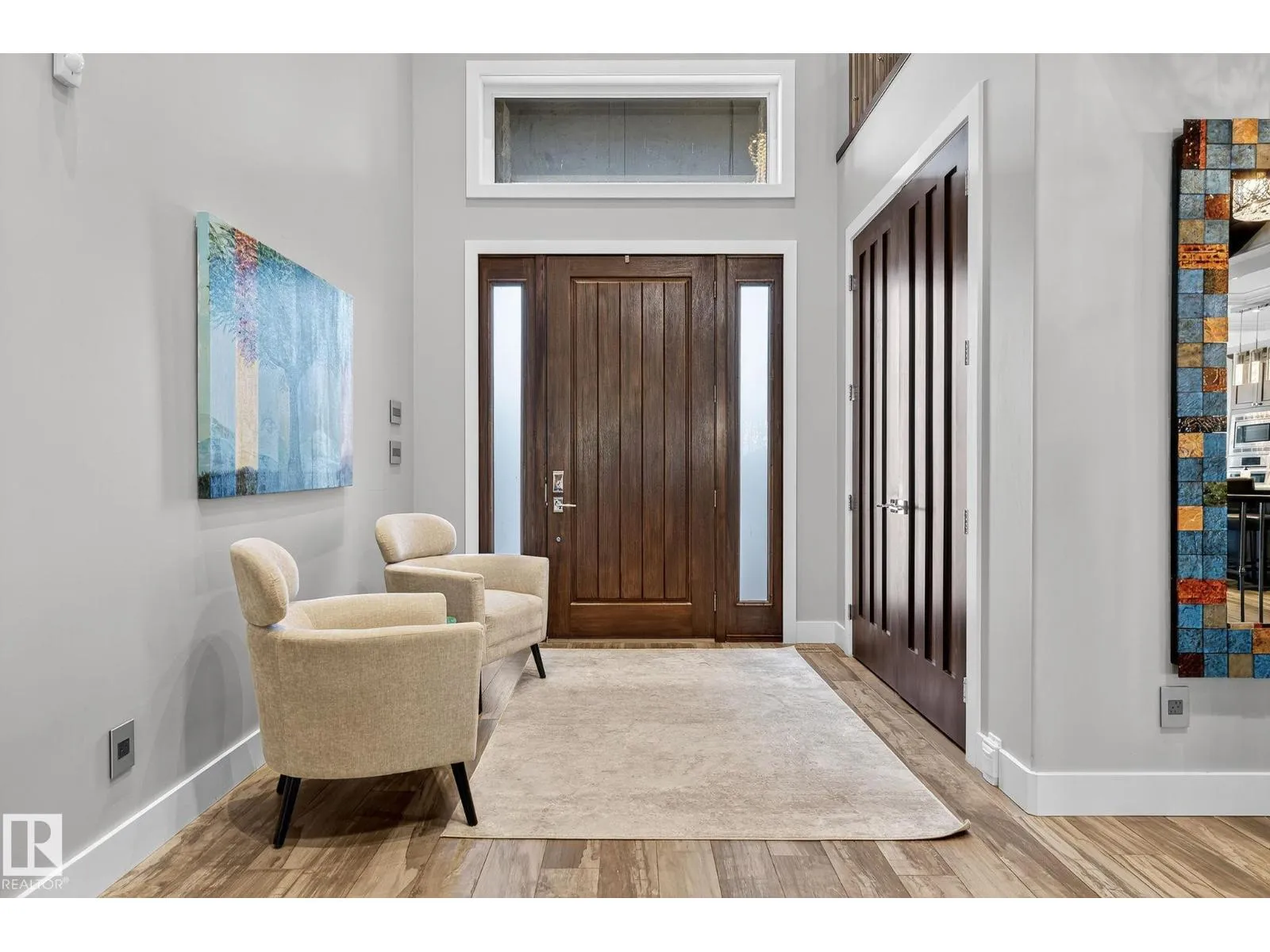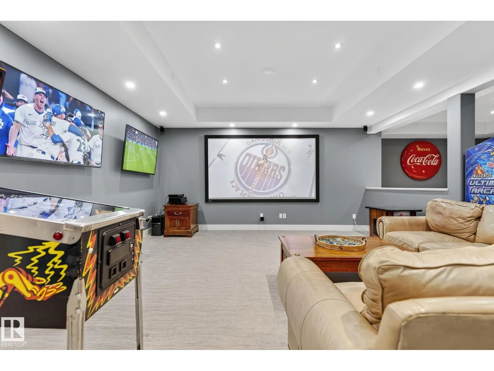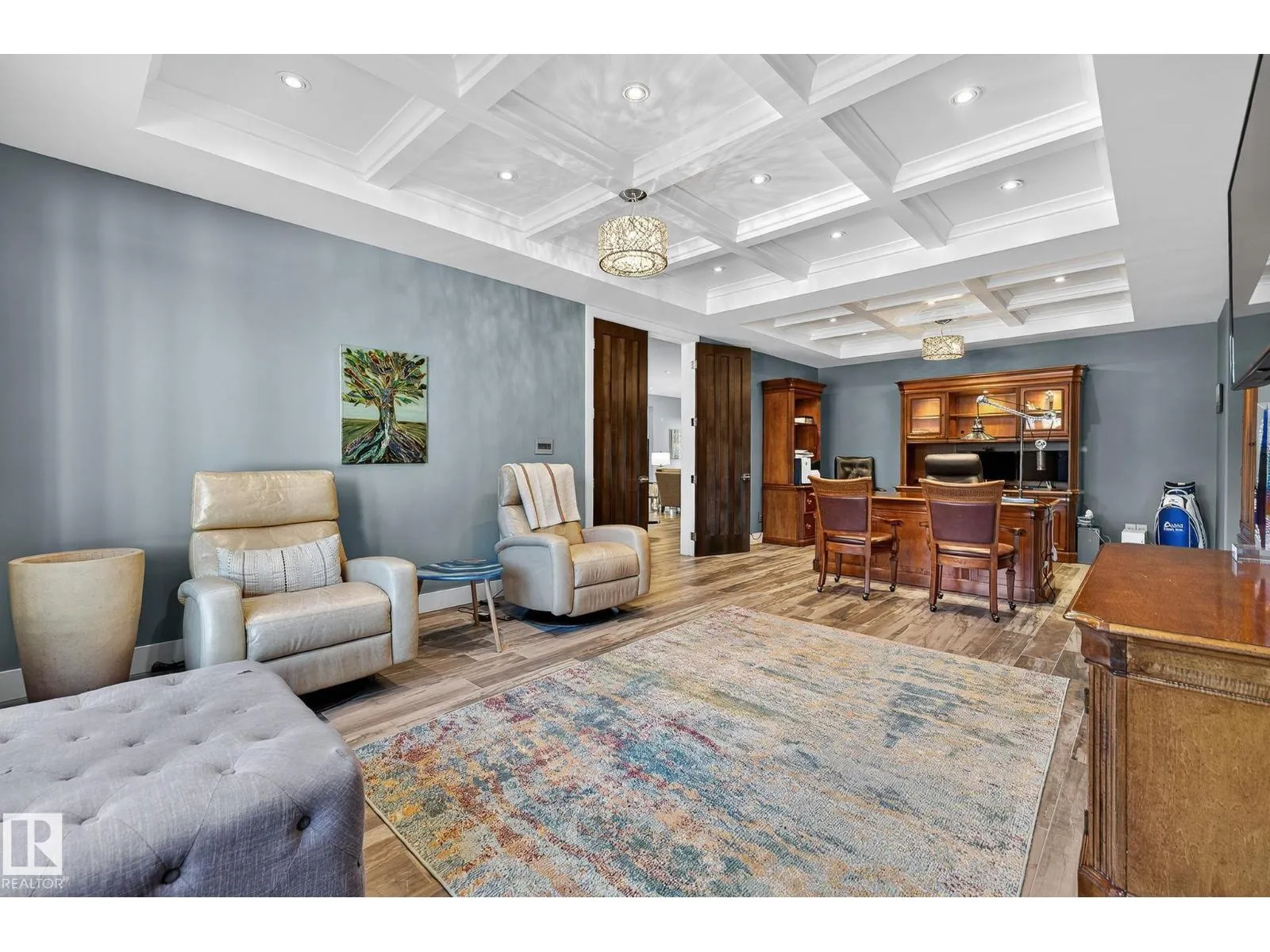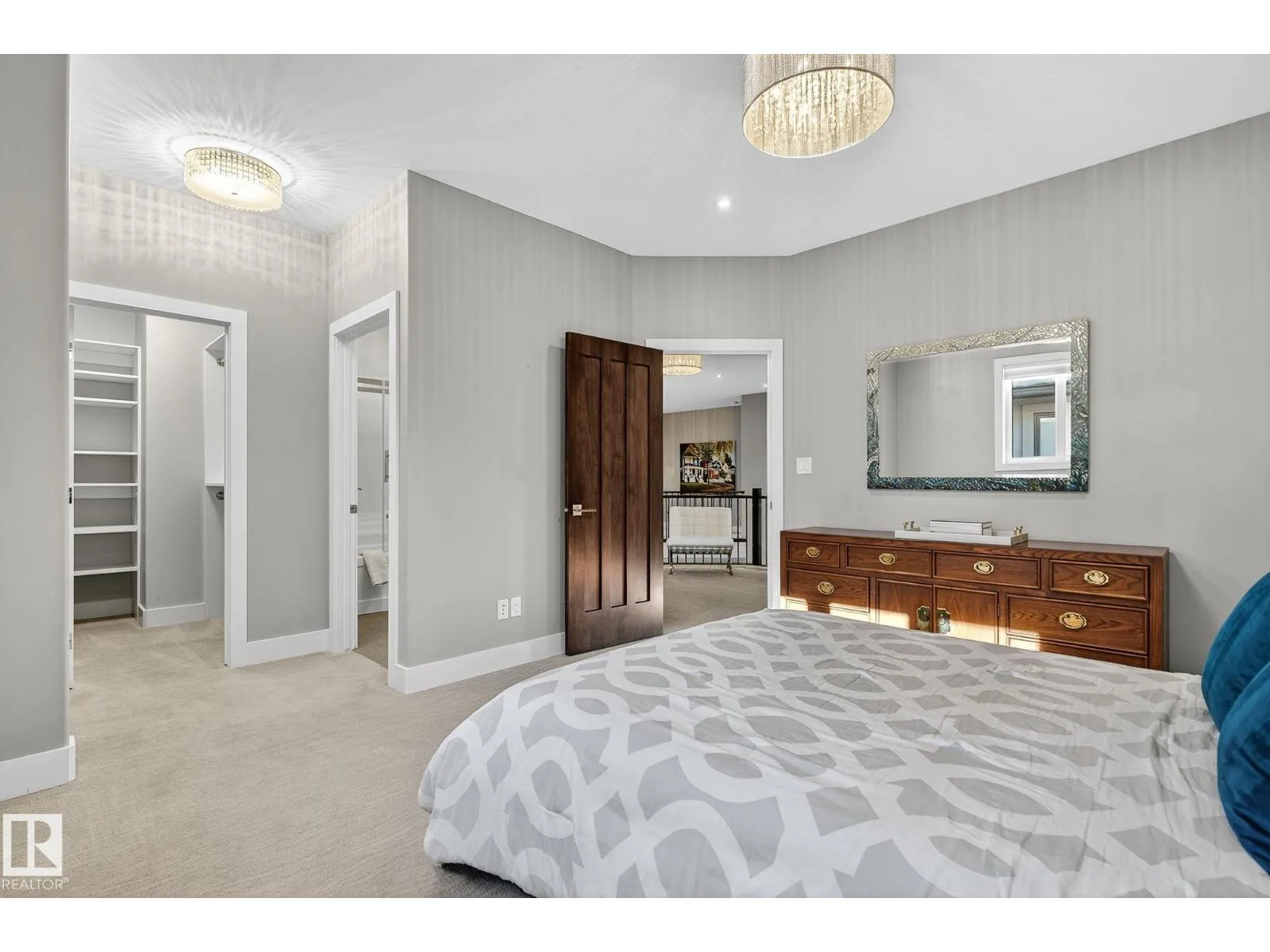 Exquisite custom-built estate in the prestigious Properties of Donsdale, one of Edmontonâs most sought-after communities. Offering 6,952sqft just steps from the river valley, this home seamlessly blends luxury, functionality & craftsmanship. Featuring an open floor plan with 9ft ceilings on all floors, spiral staircase, warm durable tile flooring & plenty of natural light. The chefâs kitchen stuns with quartz counters, dual ovens, dishwashers, fridges, massive pantry & coffered ceilings. Highlights include a presidential office, grand dining room, spacious mudroom. Upstairs, the primary suite offers dual walk-ins, a spa ensuite w/ heated floors, jetted tub & fireplace. Three additional bedrooms each enjoy walk-in closets & private ensuites + laundry & a cozy bonus room. The finished basement boasts zoned in-floor heat, wet bar, private HIDDEN BOOKSHELF theatre, multi-TV sports area, hockey & art room or 2 bedrooms. Oversized triple heated garage w/ drains & low maintenance turf yards + so much more. (id:27476)
