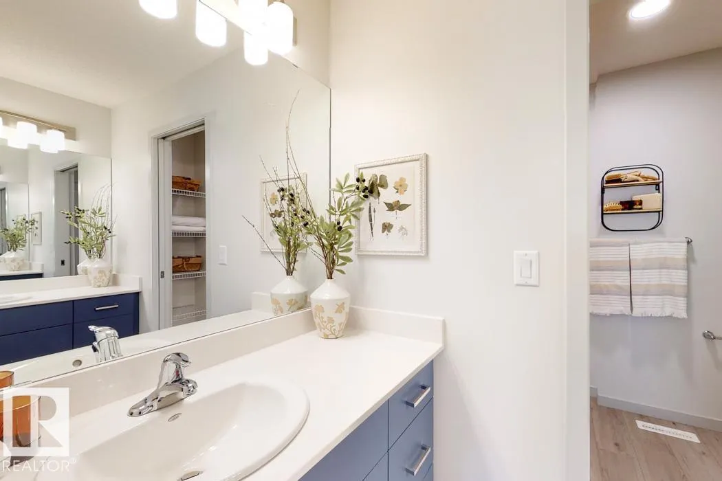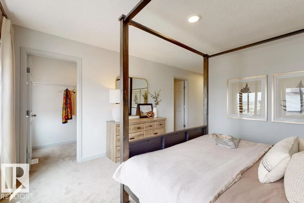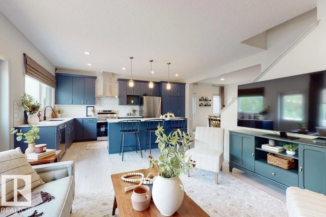 Built by Sterling Homes, this front-attached home in The Uplands at Riverview offers rare flexibility and striking design, including a main-floor bedroom with a full bath and open-to-below staircase views. Triple-pane windows and 9â ceilings brighten the open layout. The great room with an electric fireplace overlooks the yard, while the kitchen features quartz counters, a large island, upgraded cabinetry, a chimney hood fan, a built-in microwave, full-height backsplash, and an expanded pantry. Upstairs offers a primary suite with two walk-in closets and a spa-inspired ensuite, a bonus room, two bedrooms, an upper laundry, a side entrance, and a double attached garage. (id:27476)
