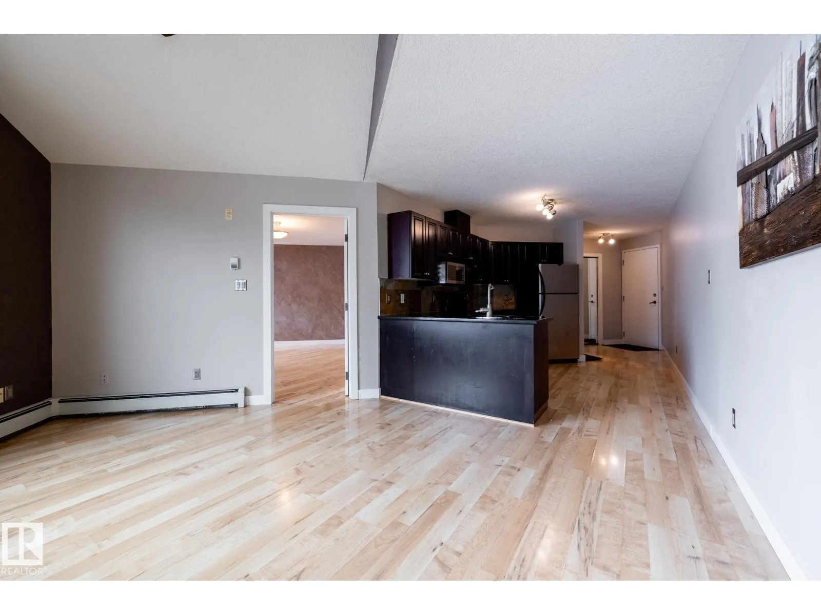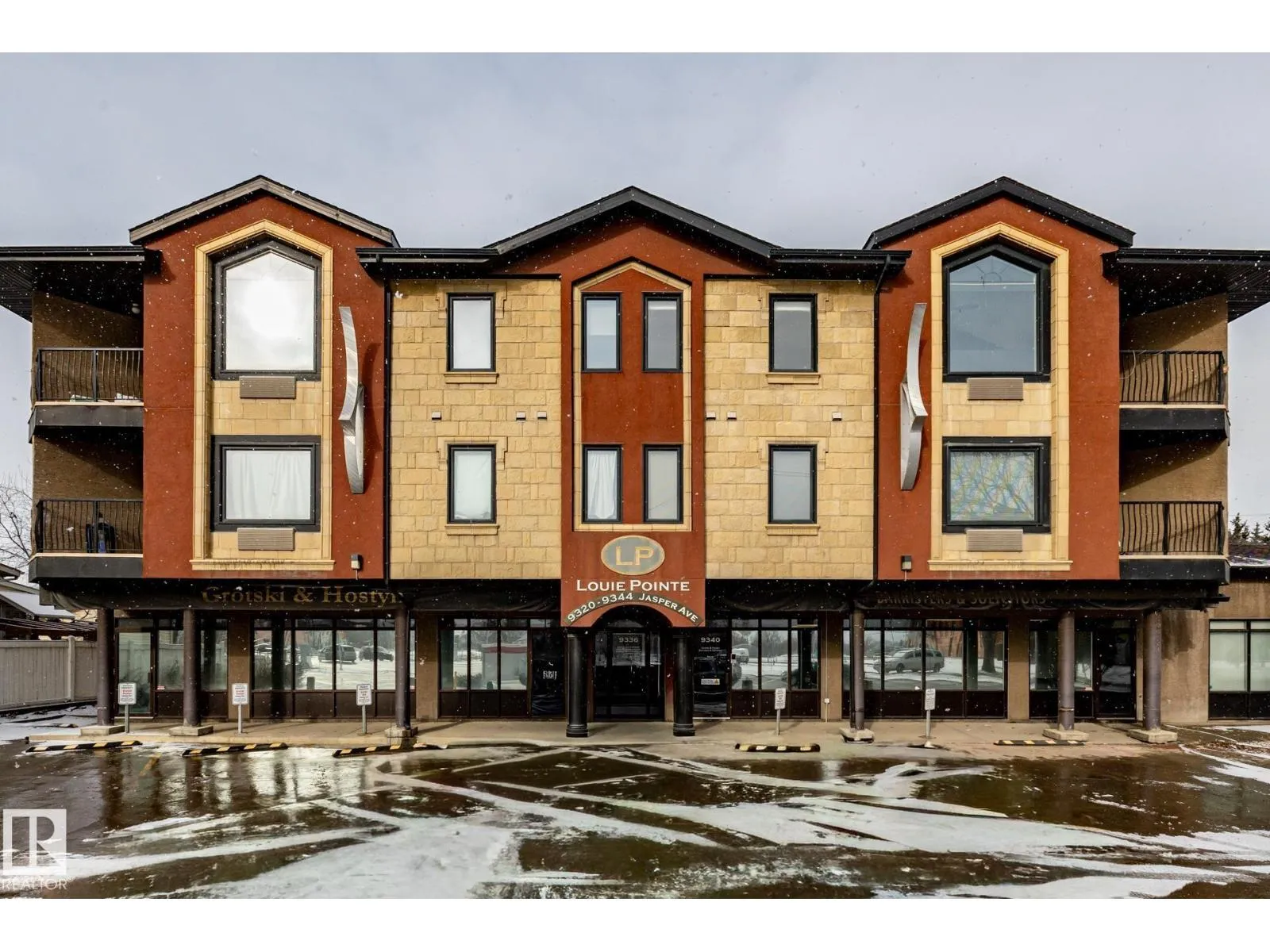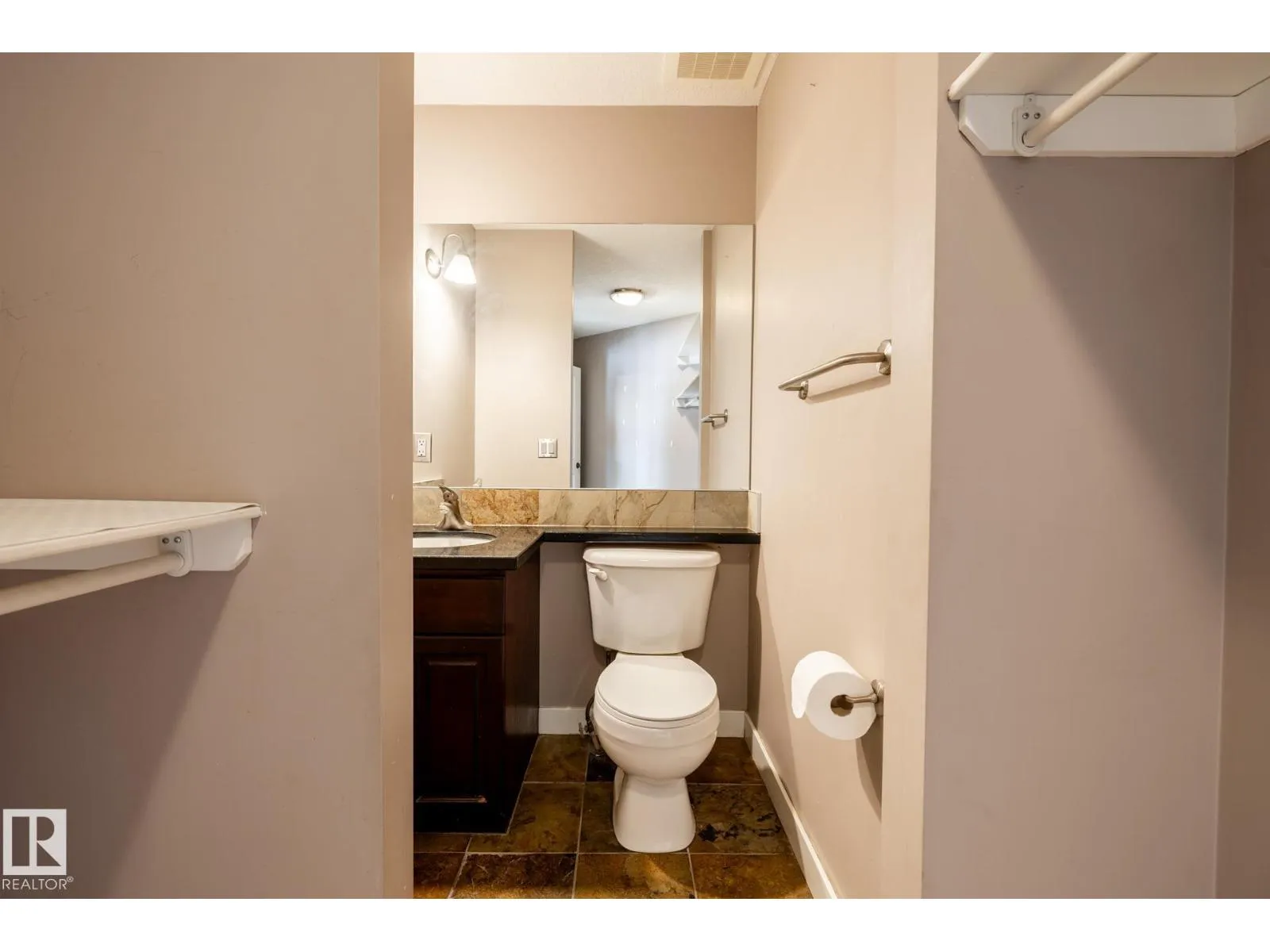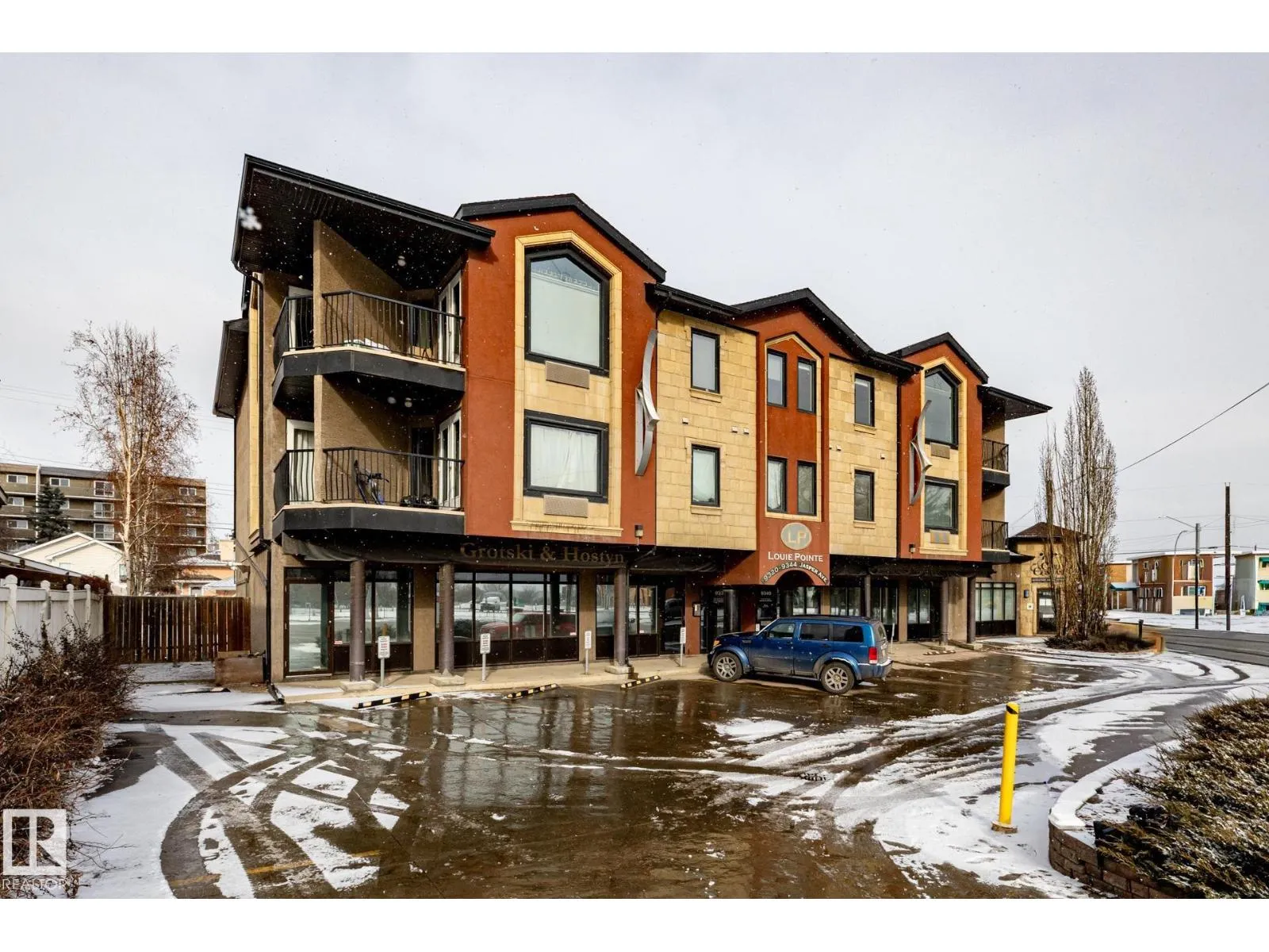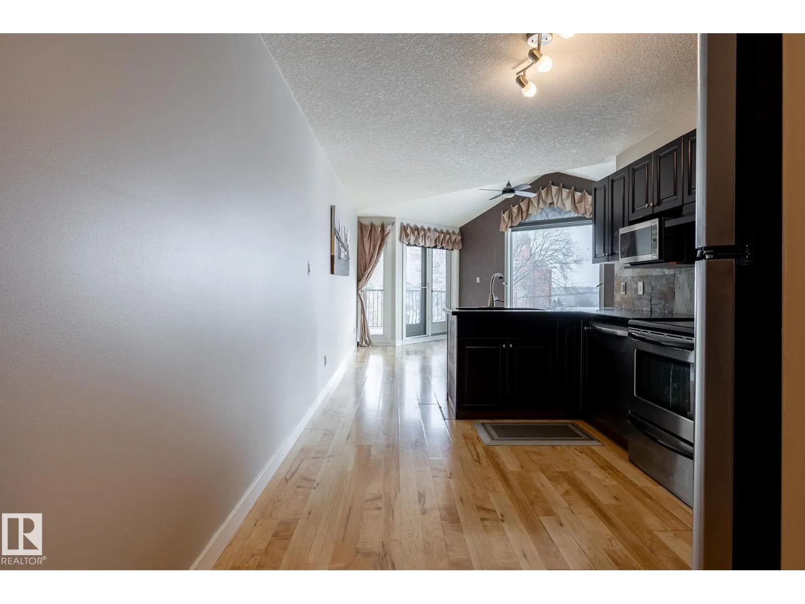 Top floor executive condo in the upscale Louie Pointe building in The Quarters on Jasper Ave. This former show home suite features vaulted ceilings and south-facing views toward Jasper Avenue and the River Valley. The bright, open-concept layout offers hardwood flooring, granite countertops, slate tile backsplash, stainless steel appliances, and air conditioning. Rare 1 bedroom + 1.5 bath design includes a spacious primary suite with walk-in closet and 2-piece ensuite, plus a full main bath for guests. Modern lighting and upgraded slate finishes throughout. Enjoy a south-facing balcony, large storage cage, outdoor parking stall with plug-in, and free common laundry for residents. Stone exterior curb appeal and concrete construction between units for added sound reduction. Walk to the River Valley, Downtown, LRT, restaurants, and more. Exceptional value in a prime central location. (id:27476)