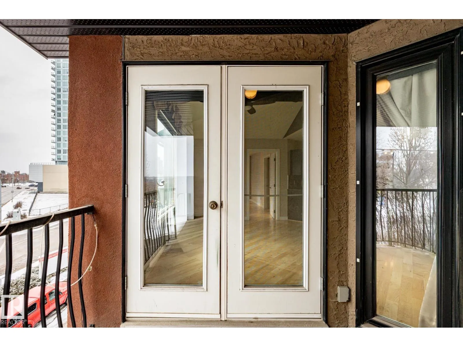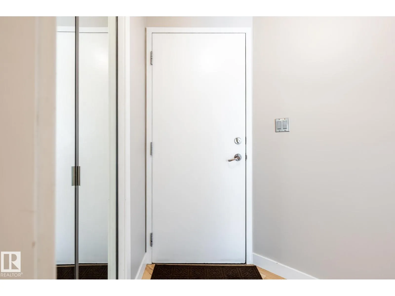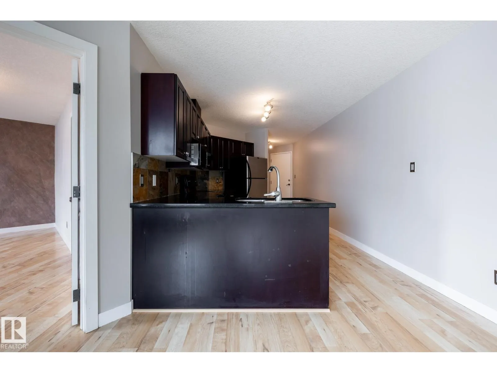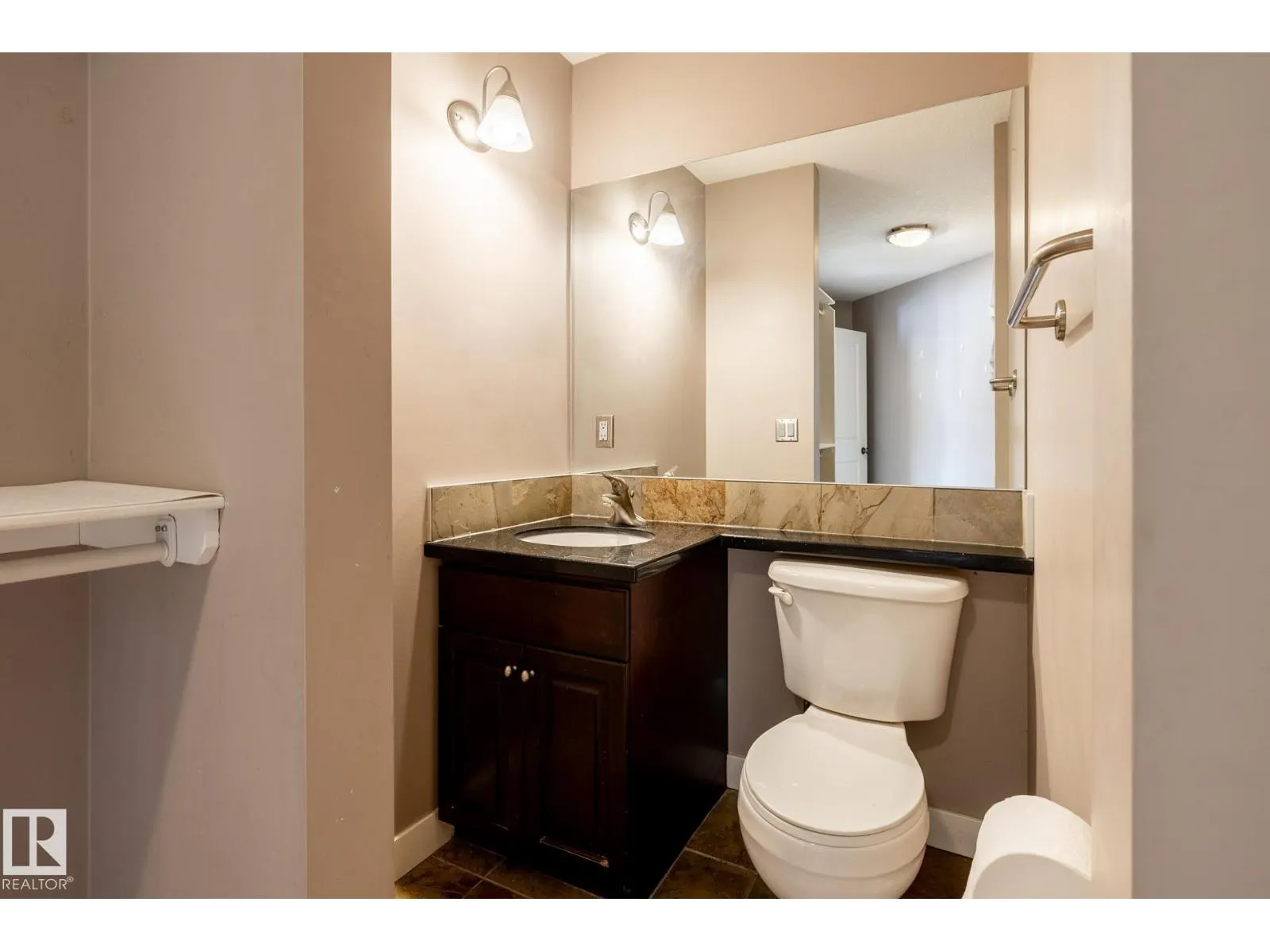 Top floor executive condo in the upscale Louie Pointe building in The Quarters on Jasper Ave. This former show home suite features vaulted ceilings and south-facing views toward Jasper Avenue and the River Valley. The bright, open-concept layout offers hardwood flooring, granite countertops, slate tile backsplash, stainless steel appliances, and air conditioning. Rare 1 bedroom + 1.5 bath design includes a spacious primary suite with walk-in closet and 2-piece ensuite, plus a full main bath for guests. Modern lighting and upgraded slate finishes throughout. Enjoy a south-facing balcony, large storage cage, outdoor parking stall with plug-in, and free common laundry for residents. Stone exterior curb appeal and concrete construction between units for added sound reduction. Walk to the River Valley, Downtown, LRT, restaurants, and more. Exceptional value in a prime central location. (id:27476)