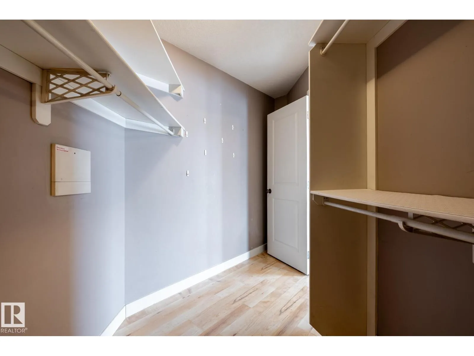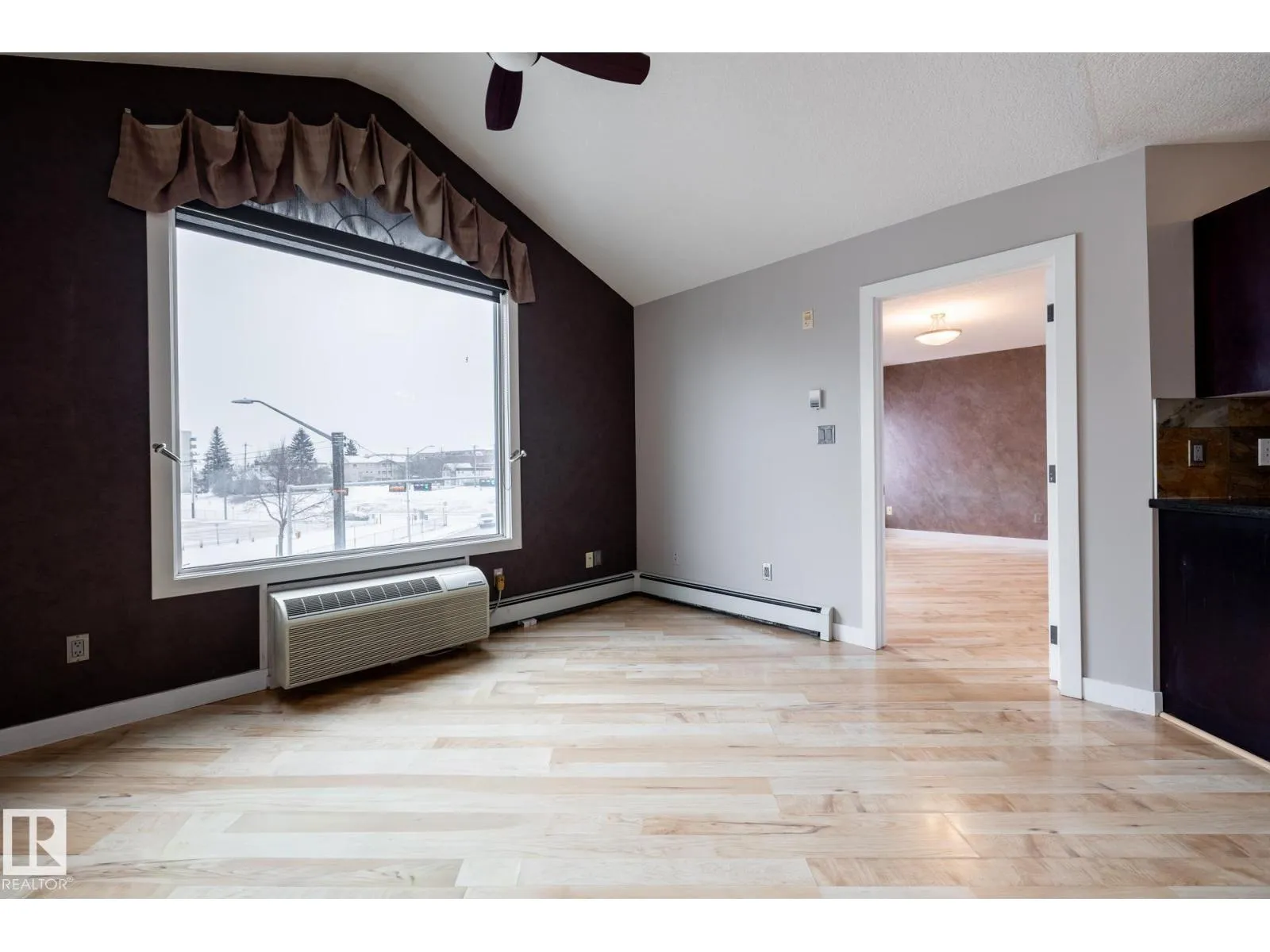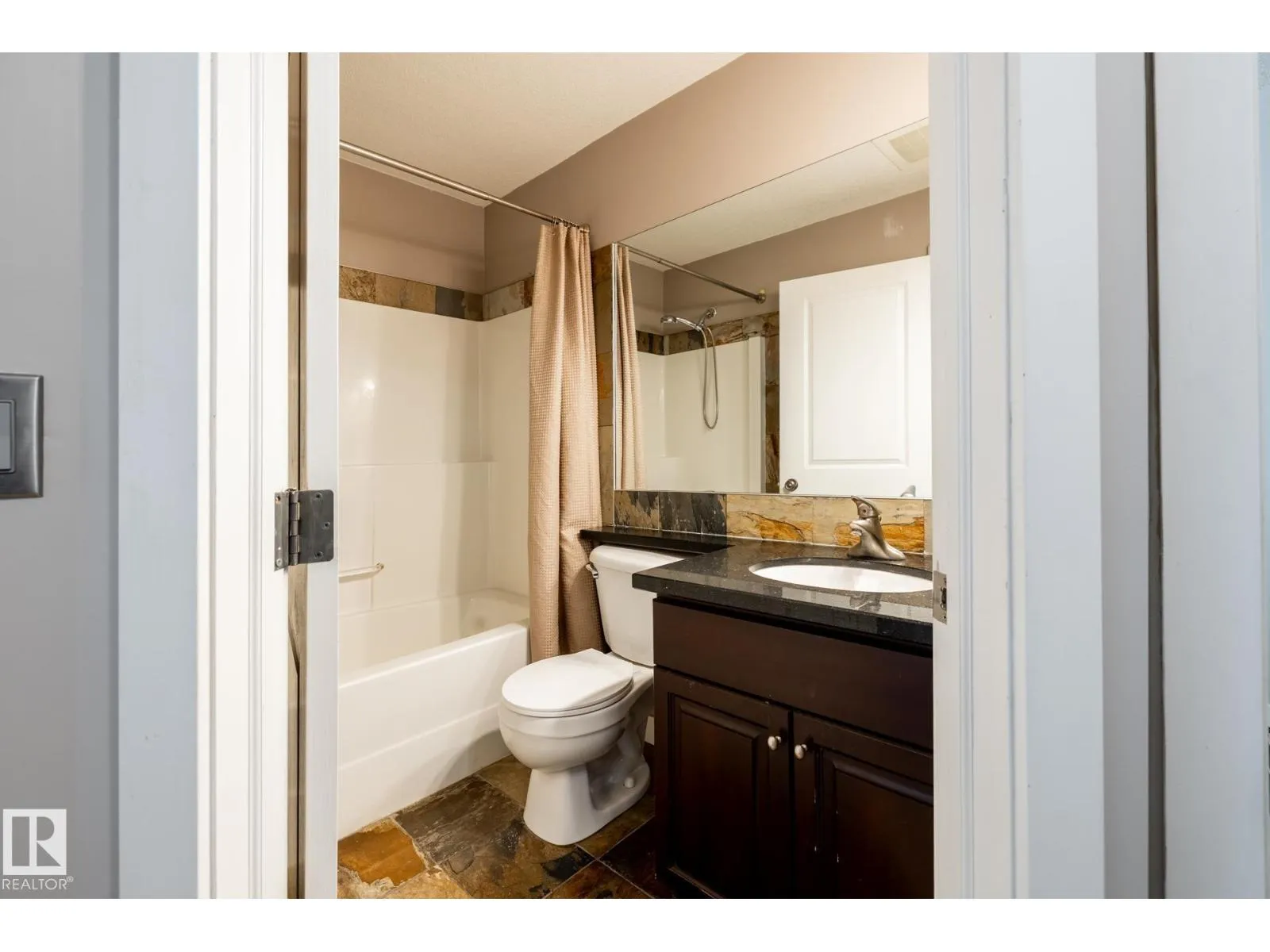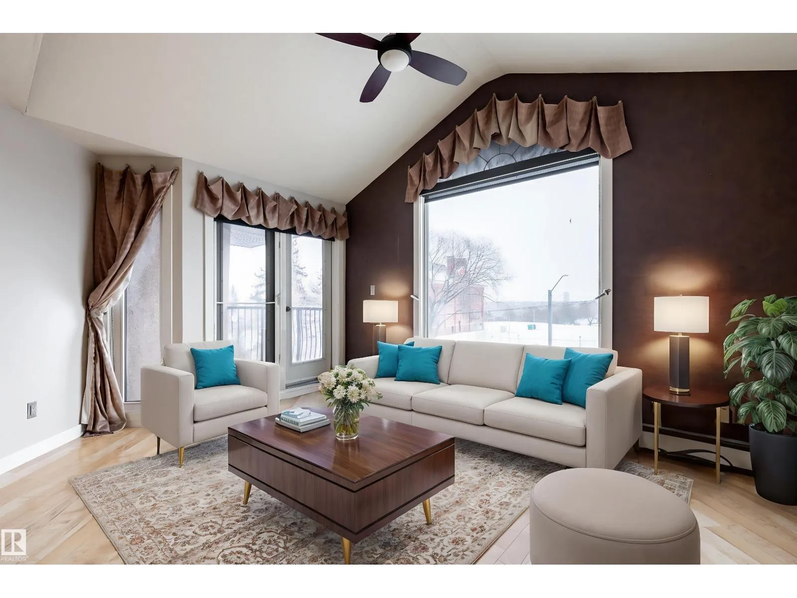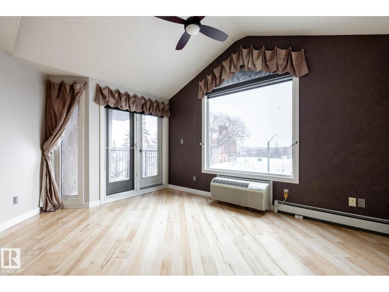 Top floor executive condo in the upscale Louie Pointe building in The Quarters on Jasper Ave. This former show home suite features vaulted ceilings and south-facing views toward Jasper Avenue and the River Valley. The bright, open-concept layout offers hardwood flooring, granite countertops, slate tile backsplash, stainless steel appliances, and air conditioning. Rare 1 bedroom + 1.5 bath design includes a spacious primary suite with walk-in closet and 2-piece ensuite, plus a full main bath for guests. Modern lighting and upgraded slate finishes throughout. Enjoy a south-facing balcony, large storage cage, outdoor parking stall with plug-in, and free common laundry for residents. Stone exterior curb appeal and concrete construction between units for added sound reduction. Walk to the River Valley, Downtown, LRT, restaurants, and more. Exceptional value in a prime central location. (id:27476)