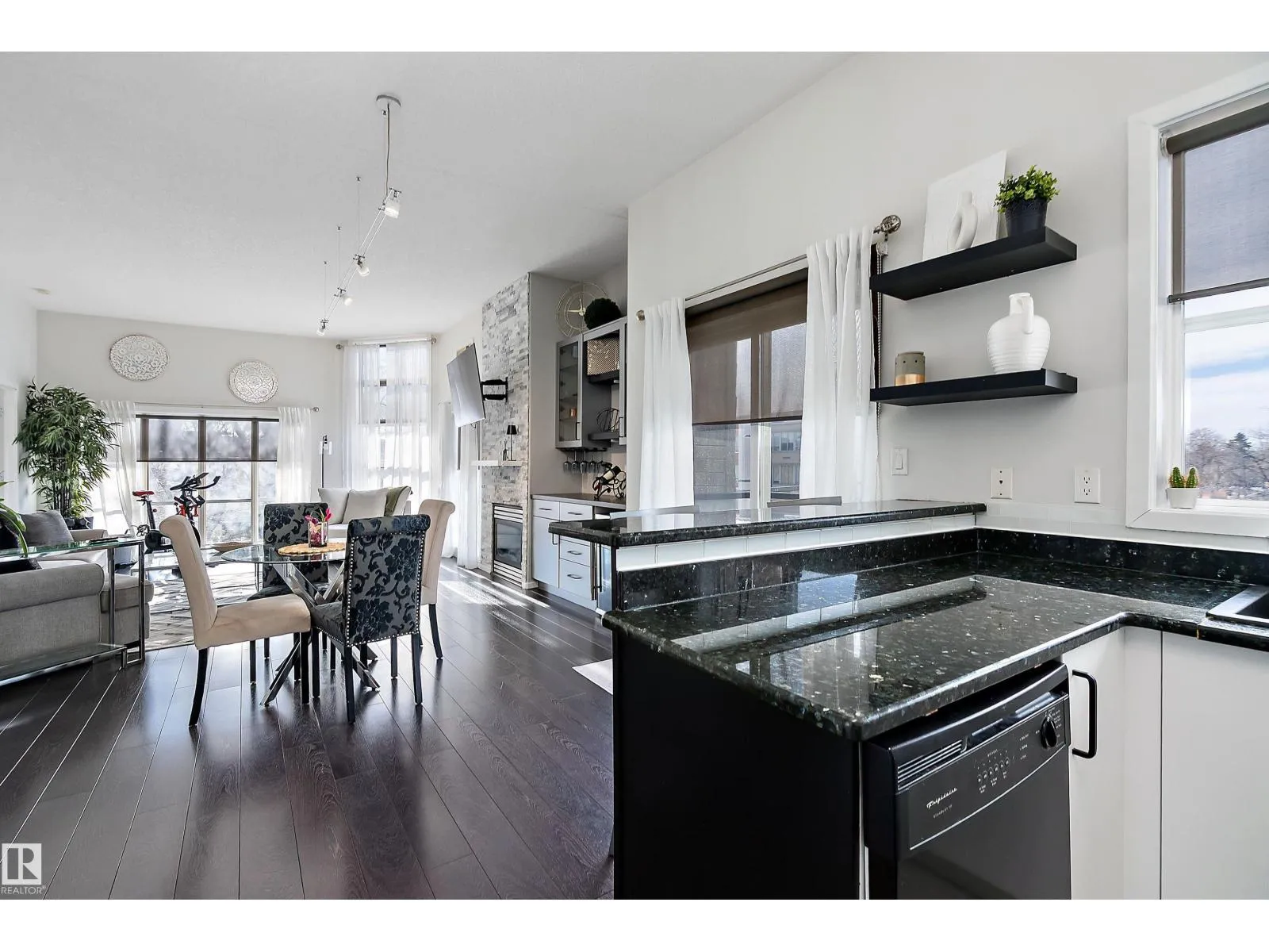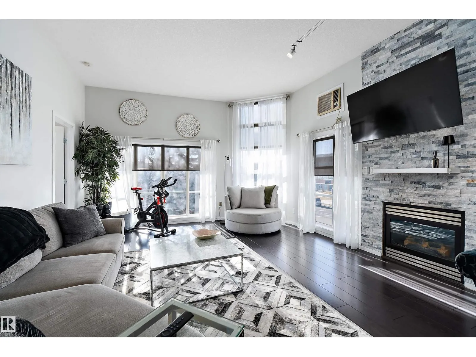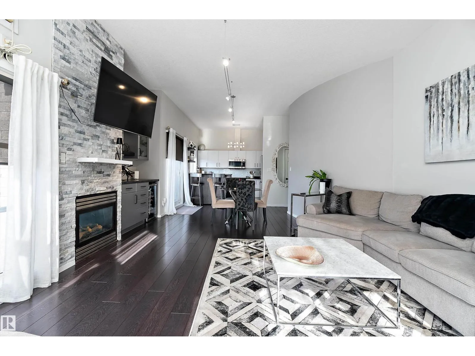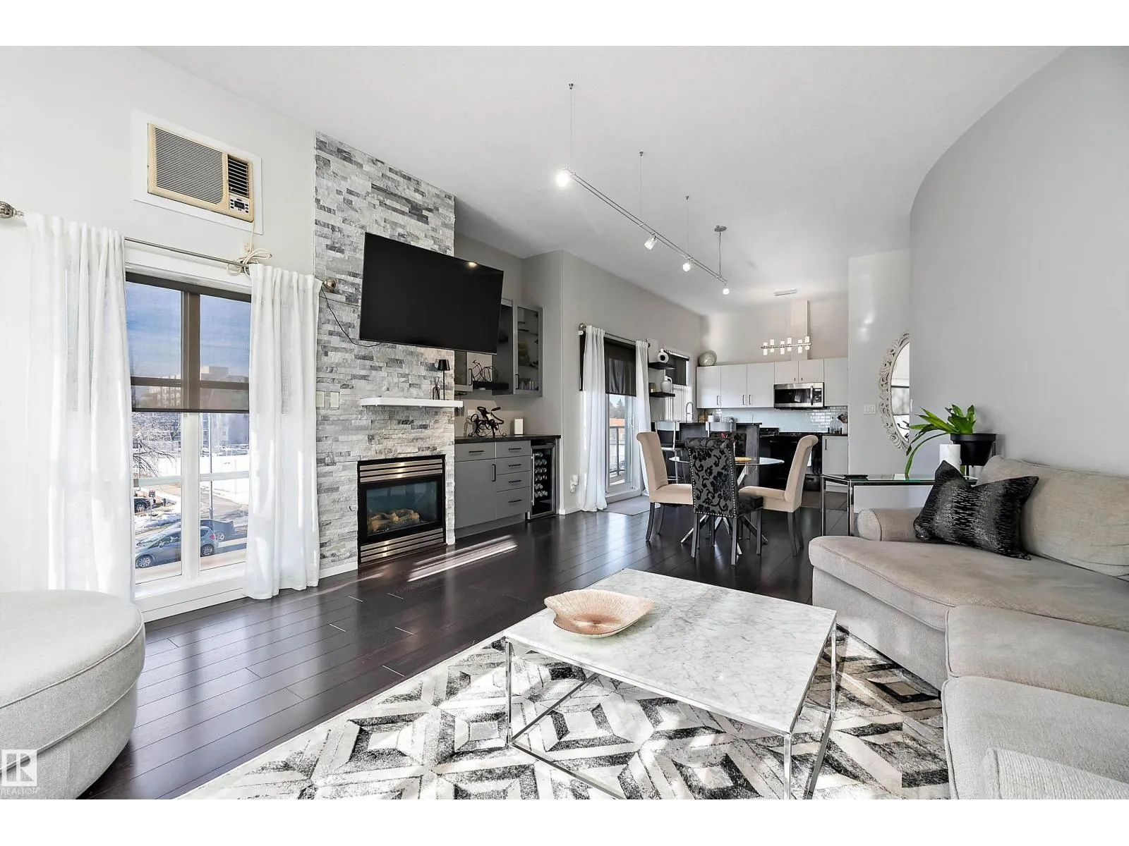 This impressive 1-bedroom plus den condo blends modern living with warm, contemporary design, featuring soaring 10-foot ceilings, expansive windows, and striking architectural details that make the space feel bright, open and full of character. The main living area is anchored by a stunning stone feature wall with a gas fireplace, creating the perfect mix of comfort and urban flair. The kitchen is beautifully finished with granite countertops, sleek cabinetry, and a raised peninsula ideal for casual dining or entertaining. The versatile den offers great flexibility for a home office, creative space, or guest area. In the spacious south-facing primary bedroom, natural light pours in while generous storage adds everyday function. Complete with in-suite laundry, air conditioning, and a private balcony with city views, this home is just steps from Rogers Place, the Ice District, MacEwan University, NAIT, LRT, the Royal Alexandra Hospital, and some of Edmontonâs best dining and entertainment. It's a must see. (id:27476)