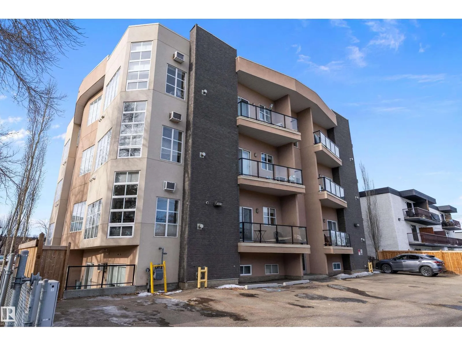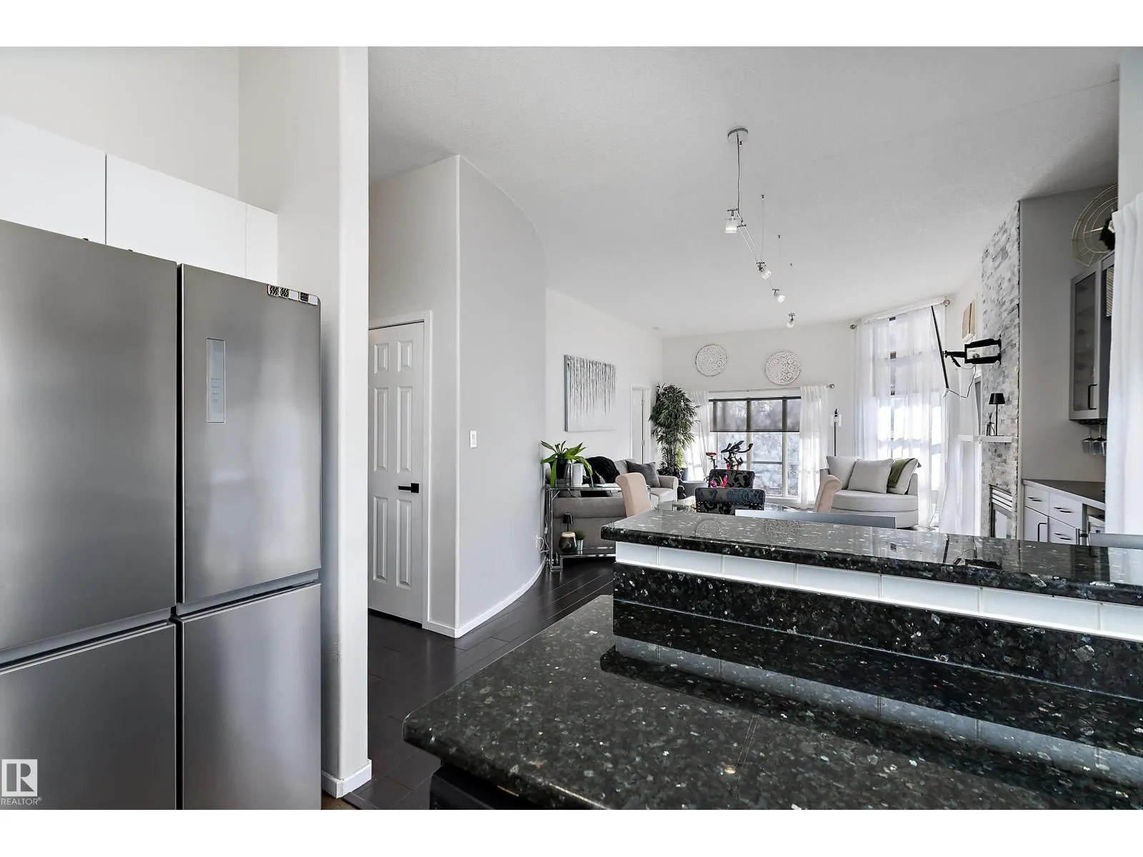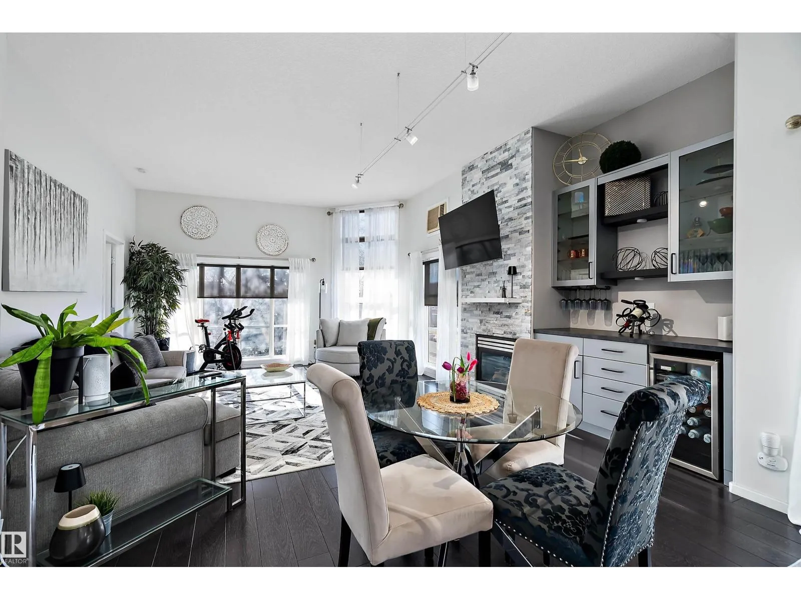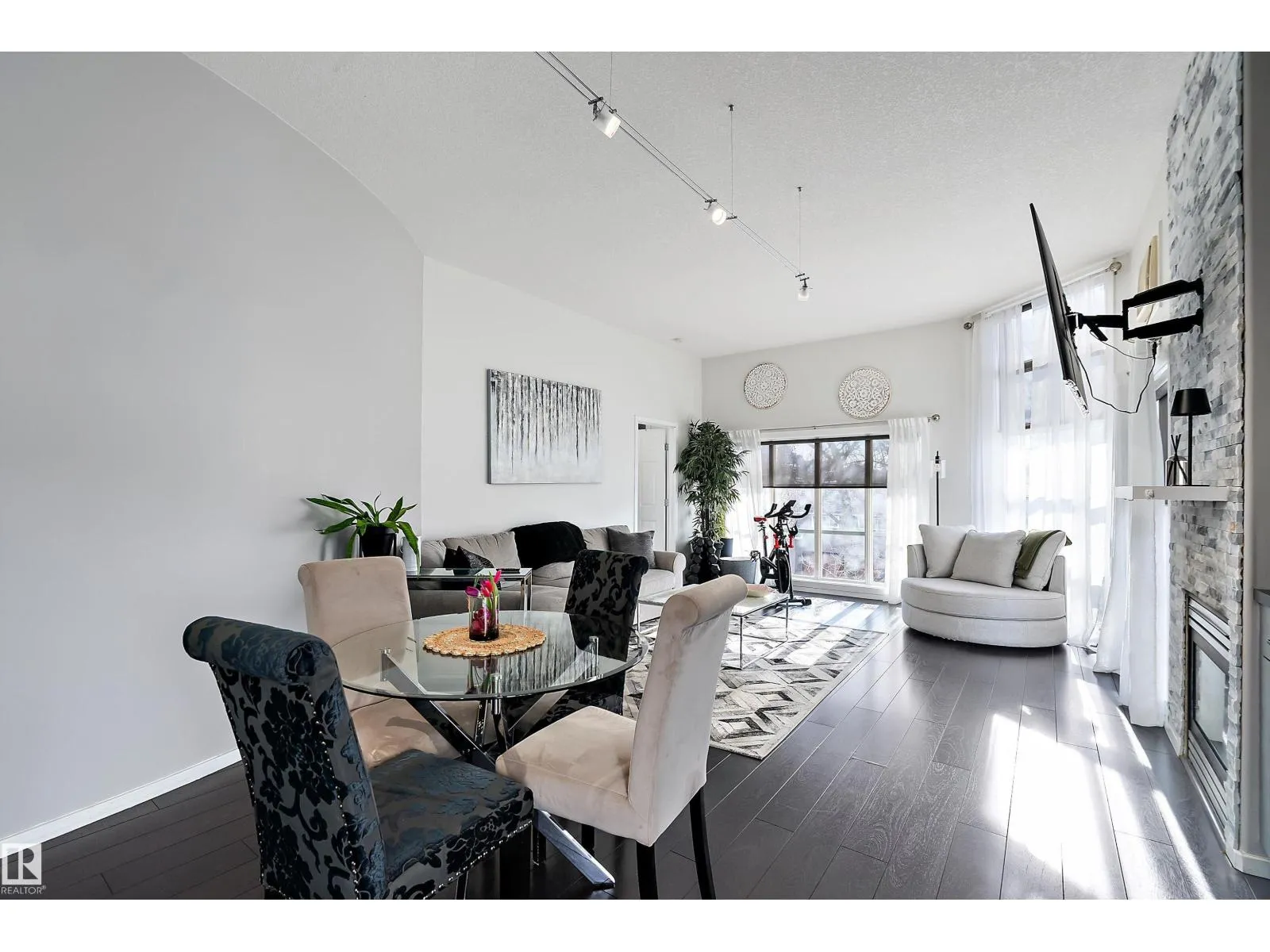 This impressive 1-bedroom plus den condo blends modern living with warm, contemporary design, featuring soaring 10-foot ceilings, expansive windows, and striking architectural details that make the space feel bright, open and full of character. The main living area is anchored by a stunning stone feature wall with a gas fireplace, creating the perfect mix of comfort and urban flair. The kitchen is beautifully finished with granite countertops, sleek cabinetry, and a raised peninsula ideal for casual dining or entertaining. The versatile den offers great flexibility for a home office, creative space, or guest area. In the spacious south-facing primary bedroom, natural light pours in while generous storage adds everyday function. Complete with in-suite laundry, air conditioning, and a private balcony with city views, this home is just steps from Rogers Place, the Ice District, MacEwan University, NAIT, LRT, the Royal Alexandra Hospital, and some of Edmontonâs best dining and entertainment. It's a must see. (id:27476)