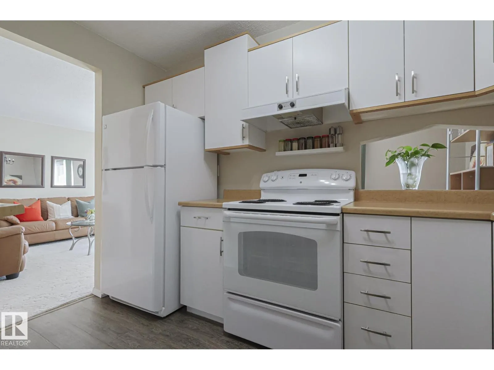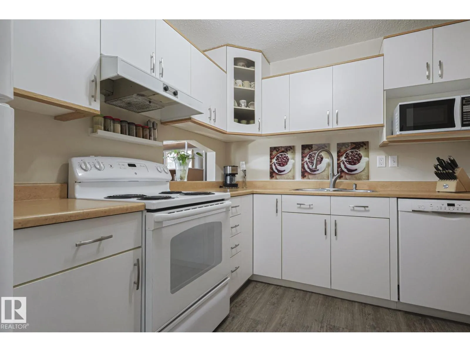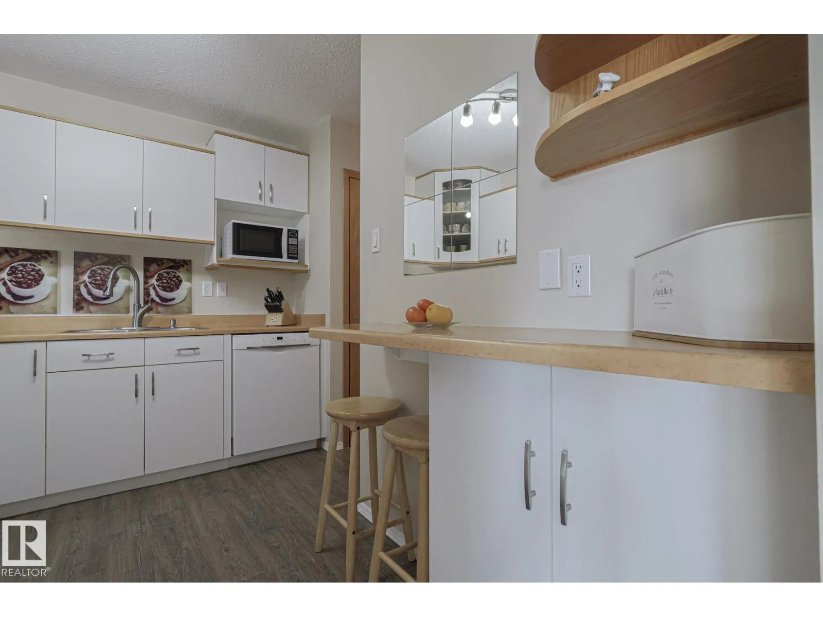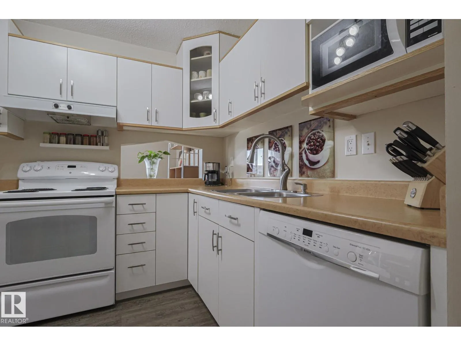 Welcome to this top-floor end unit ideally located steps from Millbourne Mall, where groceries, dining, medical services, everyday shopping, multiple bus stops and schools are all within easy walking distance. This well-cared-for home has been owner-occupied for 25 years and shows pride of ownership throughout. Two large bedrooms with wall-to-wall closets, a separate dining area, and excellent storage including a linen closet and large dedicated in suite storage closet. The well kept kitchen offers vinyl plank flooring, white cupboards with slide-out drawers, an added coffee bar area, and a Bosch dishwasherâan upgrade not found in most units. In-suite washer and dryer, a portable air conditioner, large west-facing balcony, east-facing bedrooms, and parking located on an end spot. The spacious bathroom features tile flooring, newer fixtures, sink, medicine cabinet, and extra storage. Non-smoking and pet-free. An ideal low maintenance place to call home! (id:27476)