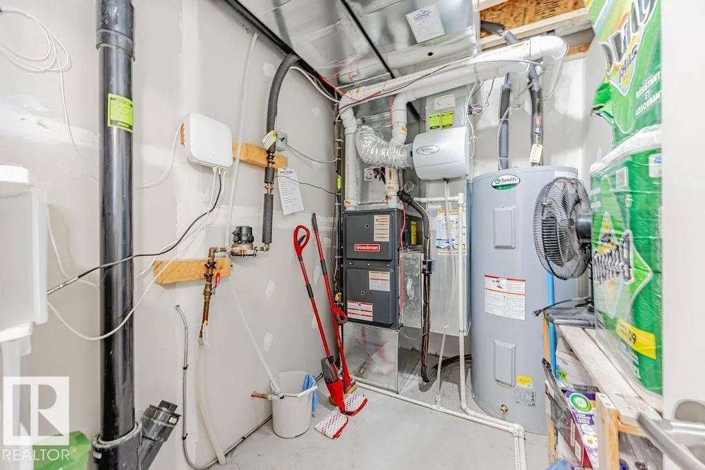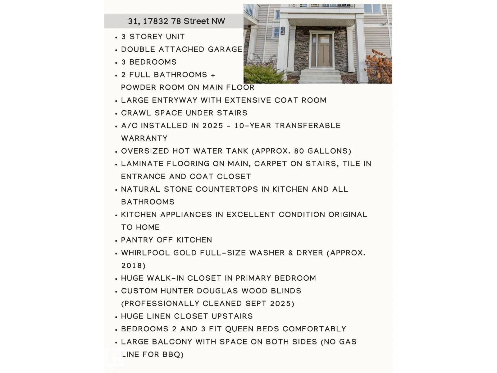 3-storey townhome in near-new condition offering 1,611 sq ft, 3 bedrooms, 2 full baths + 1 half bath. Double attached garage (19â3â x 21â6â) with hose bib for washing cars or cleaning garage. Large entry w/coat room & storage crawl space under stairs. Main floor laminate, tile in entry/closet, carpet on stairs & bedrooms. Kitchen: Natural stone countertops, pantry, all appliances included. Whirlpool Gold full-size washer/dryer. Natural stone counters in all baths. Powder room on main. Primary fits king suite, huge walk-in closet. Beds 2 & 3 fit queens. Large linen closet. Custom Hunter Douglas wood blinds (cleaned Sept 2025). A/C (2025) and humidifier with 10-year transferable warranty. 80-gal hot water tank. Deck overlooking Poplar Lake. Professionally managed by Pivotal Property Mgt. Condo fees $233.10; 2025 taxes $3,421.94. K-9 school (950 capacity) opening Fall 2028 in Crystallina - Our Lady of Hope Catholic Elementary/Jr High. Possession flexible, furniture negotiable. Lot size: 170.43 m2 (id:27476)