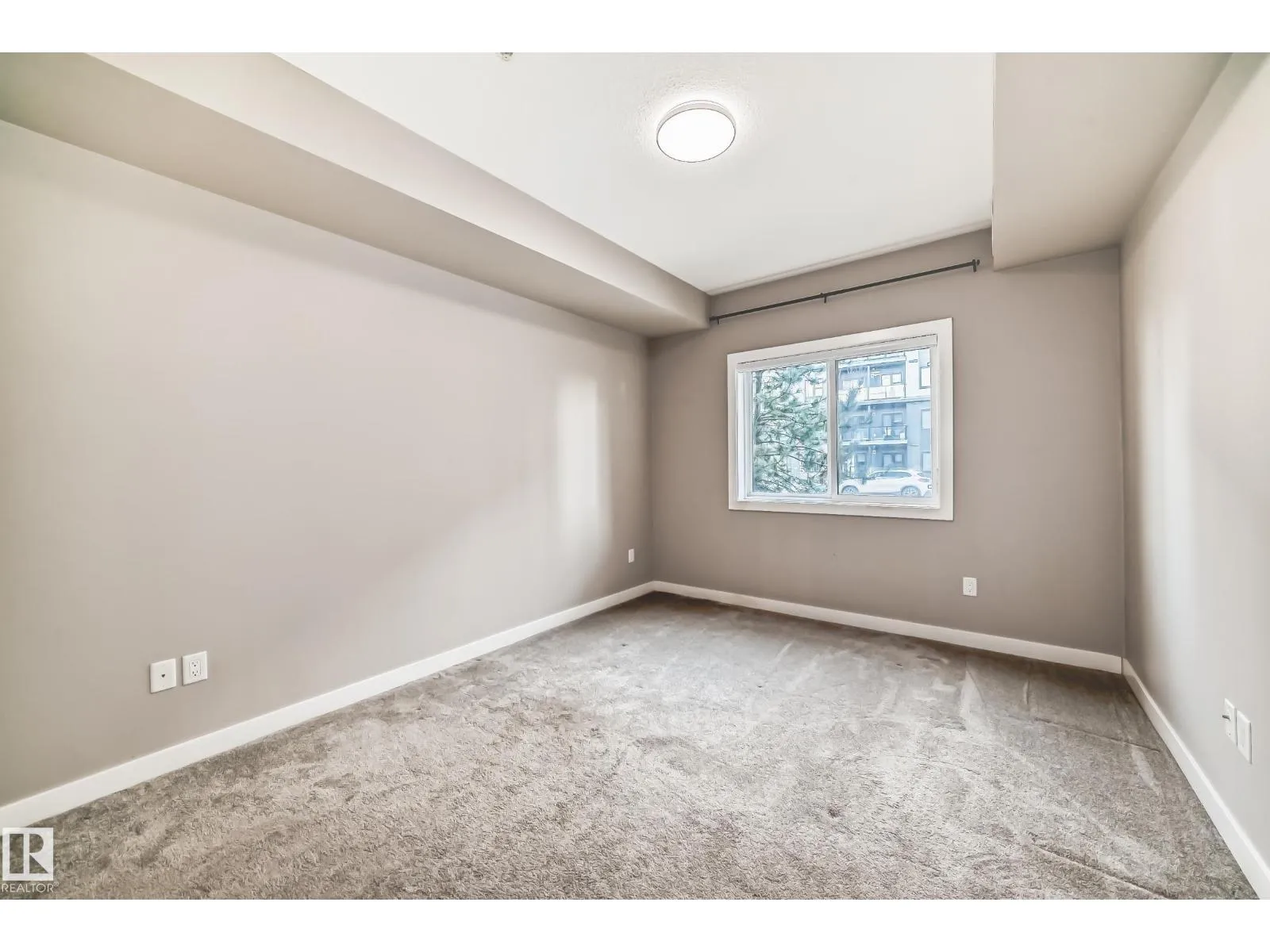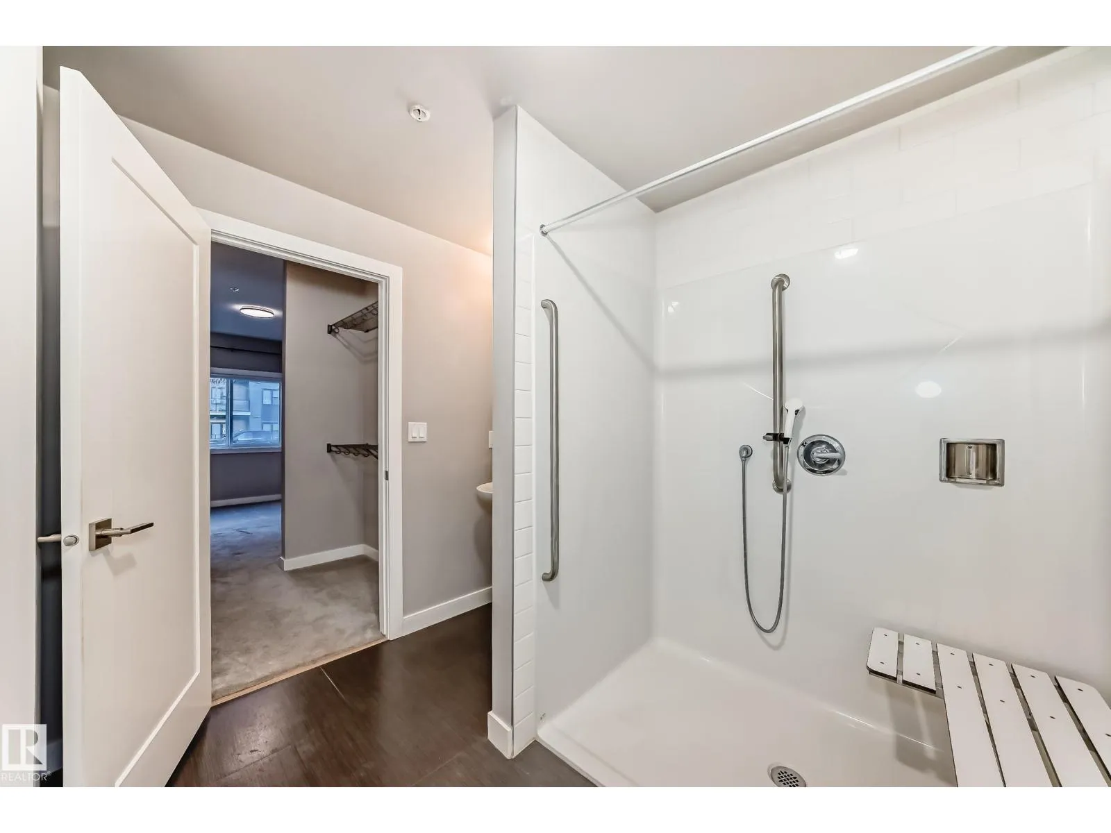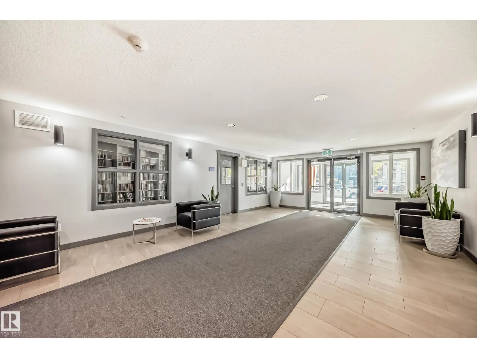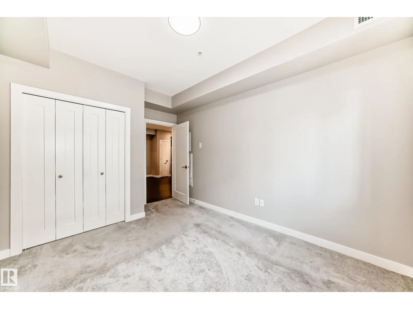 Welcome to this well-appointed 2 bed, 2 bath main-floor condo offering exceptional accessibility just steps from the elevator and lobby. Builder size is 1,000 sq ft with a smart layout that separates the bedrooms with a spacious central living area for added privacy. The primary suite features an accessible ensuite with roll-in shower. The kitchen showcases quartz countertops, soft-close cabinetry and modern finishes. Luxury vinyl plank flooring highlights the main areas, with carpet in the bedrooms. Enjoy in-suite laundry, energy-efficient heat pump heating and cooling, and included window coverings. The gated patio with BBQ gas hookup is perfect for entertaining and provides easy access to amenities and the beautiful walking trails of historic Griesbach. Fire-protectant treated building offers a games room, library, fitness centre, car wash bay and underground parking. (id:27476)