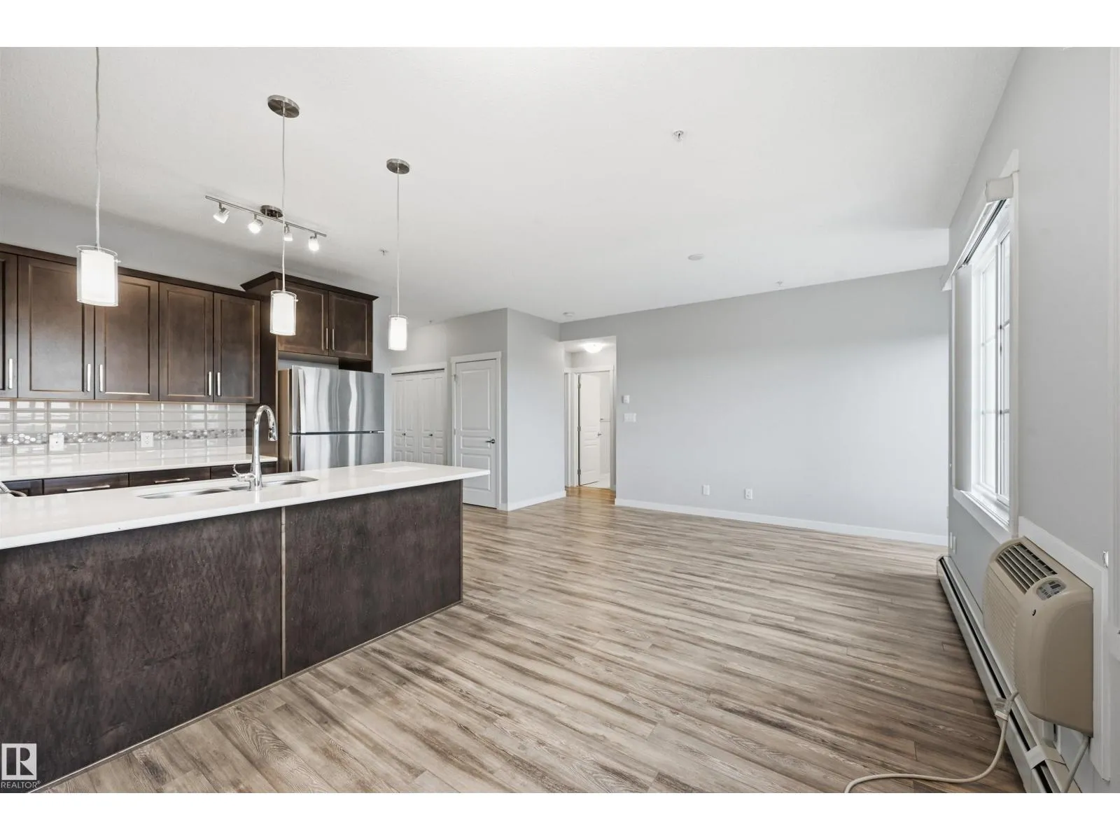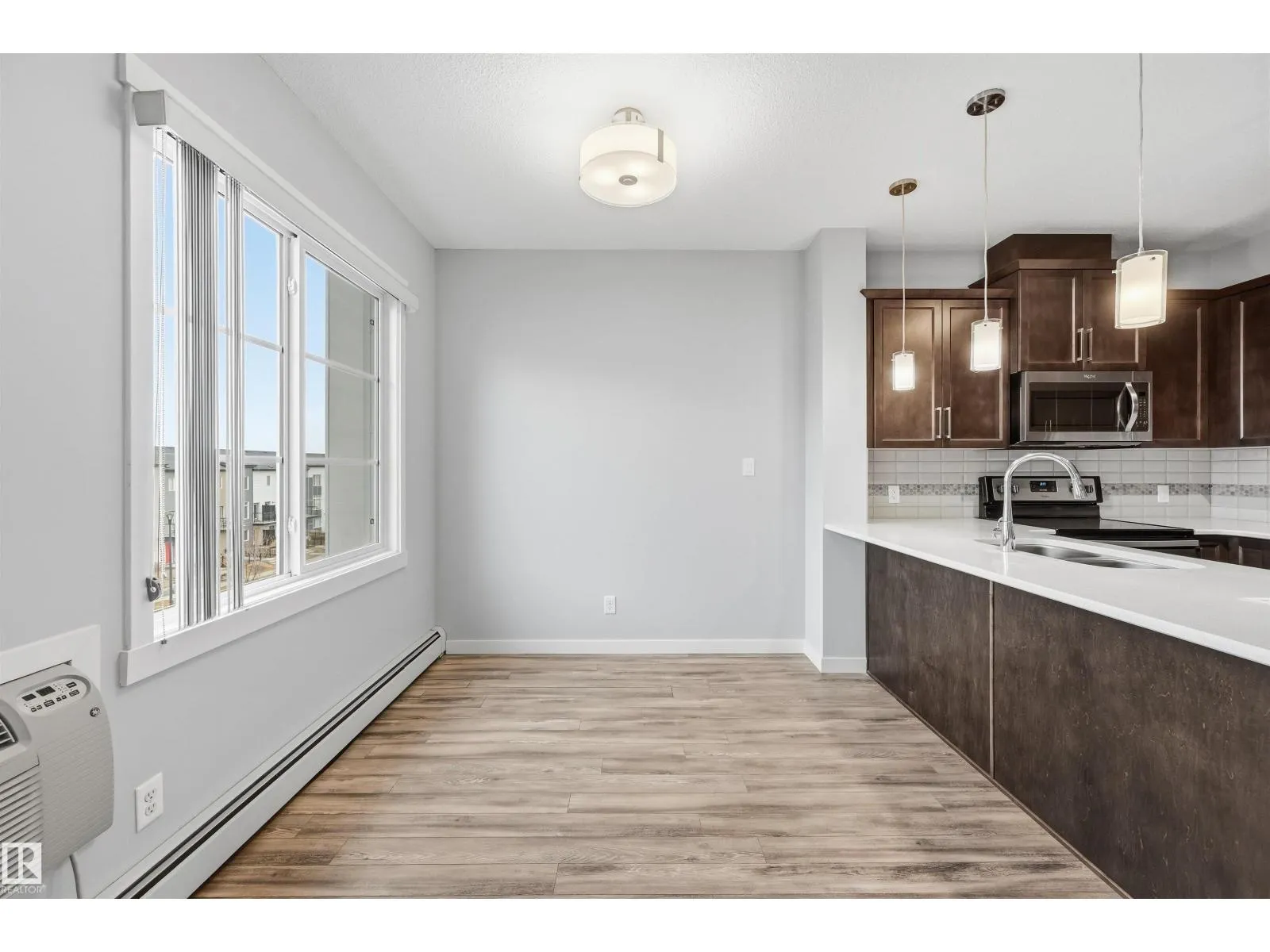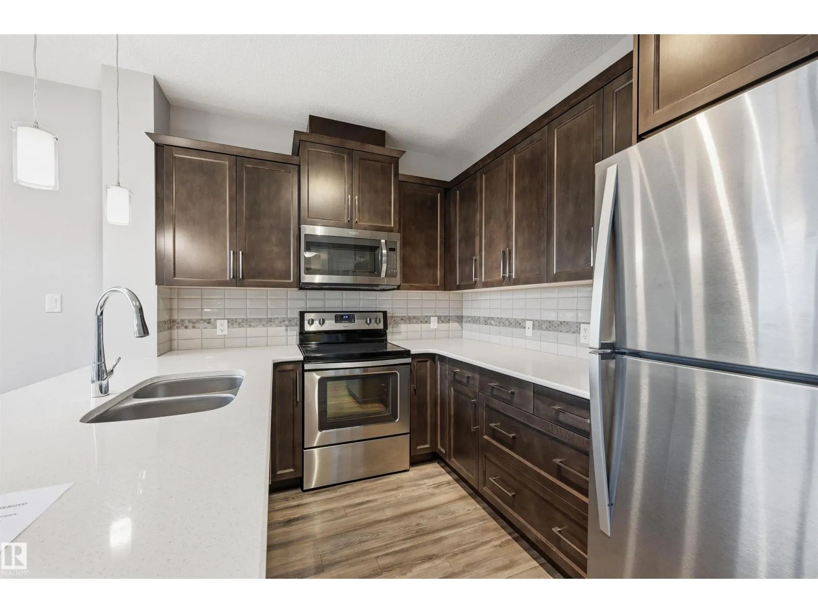 Well maintained and spacious TOP FLOOR 1 bed+den condo w/ AIR CONDITIONING! ALL UTILITIES INCL IN CONDO FEE - perfect for first time home buyers or investors. Prime location in South East Edmonton at Village at Walker Lake, close to everything! Unit features 9' ceilings, quartz countertops, laminate flooring, stainless steel kitchen appliances & a large island with eating bar. Open concept floor plan seamlessly connects the dining nook and roomy living room/patio. Primary bedroom has a unique layout and well-sized closet. The den is perfect for a home office space or a cozy second bedroom. Comes with a HEATED UNDERGROUND parking stall. Visitor parking available. Conveniently located close to schools, public transportation, grocery stores, shopping & dining at South Edmonton Common, walking trails & ponds. Easy access to major commuter routes including Ellerslie Rd and Anthony Henday for effortless city wide commuting. (id:27476)