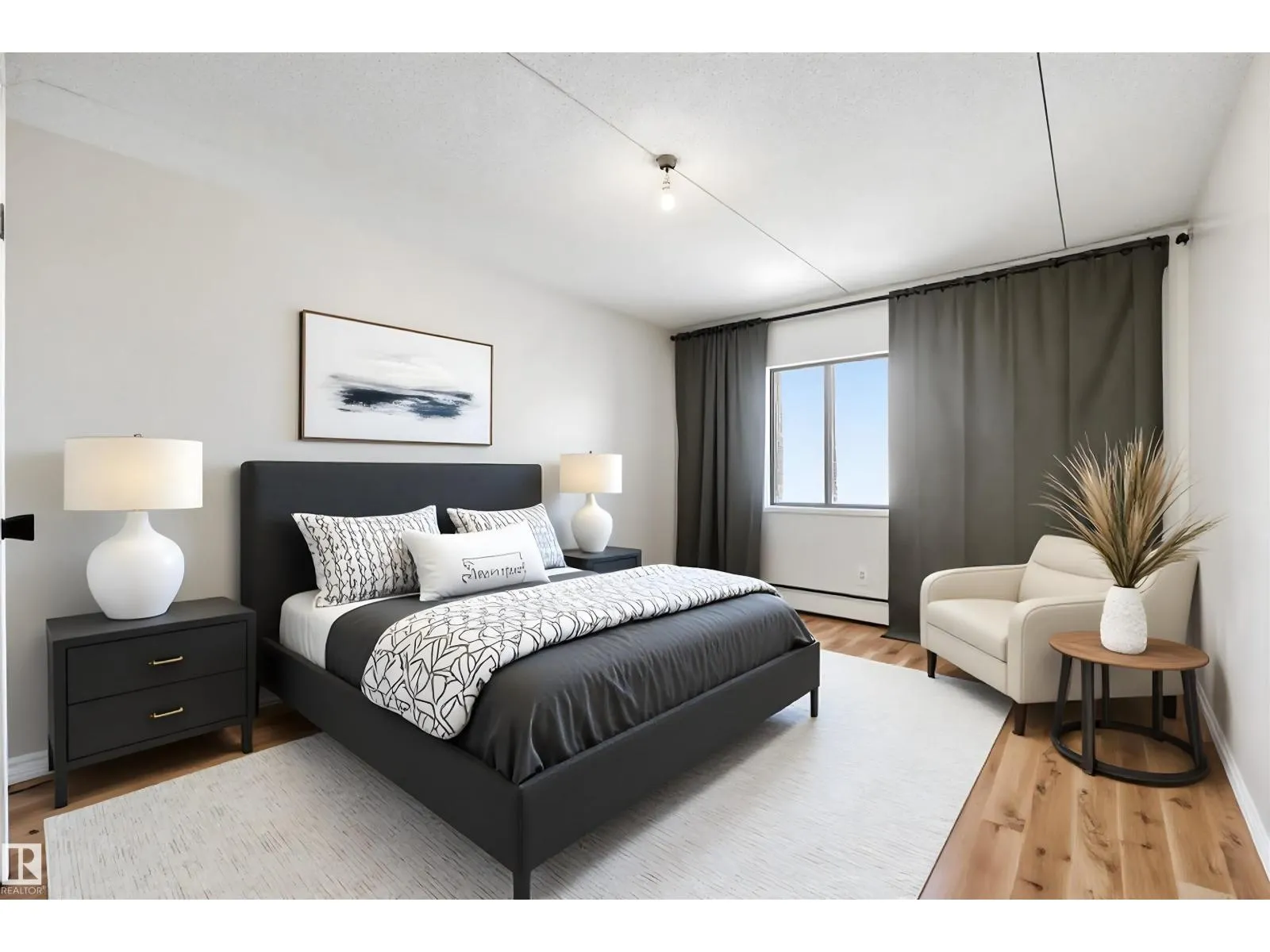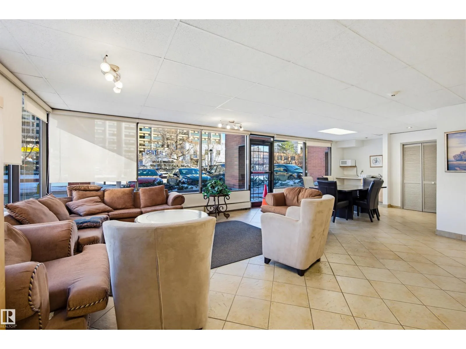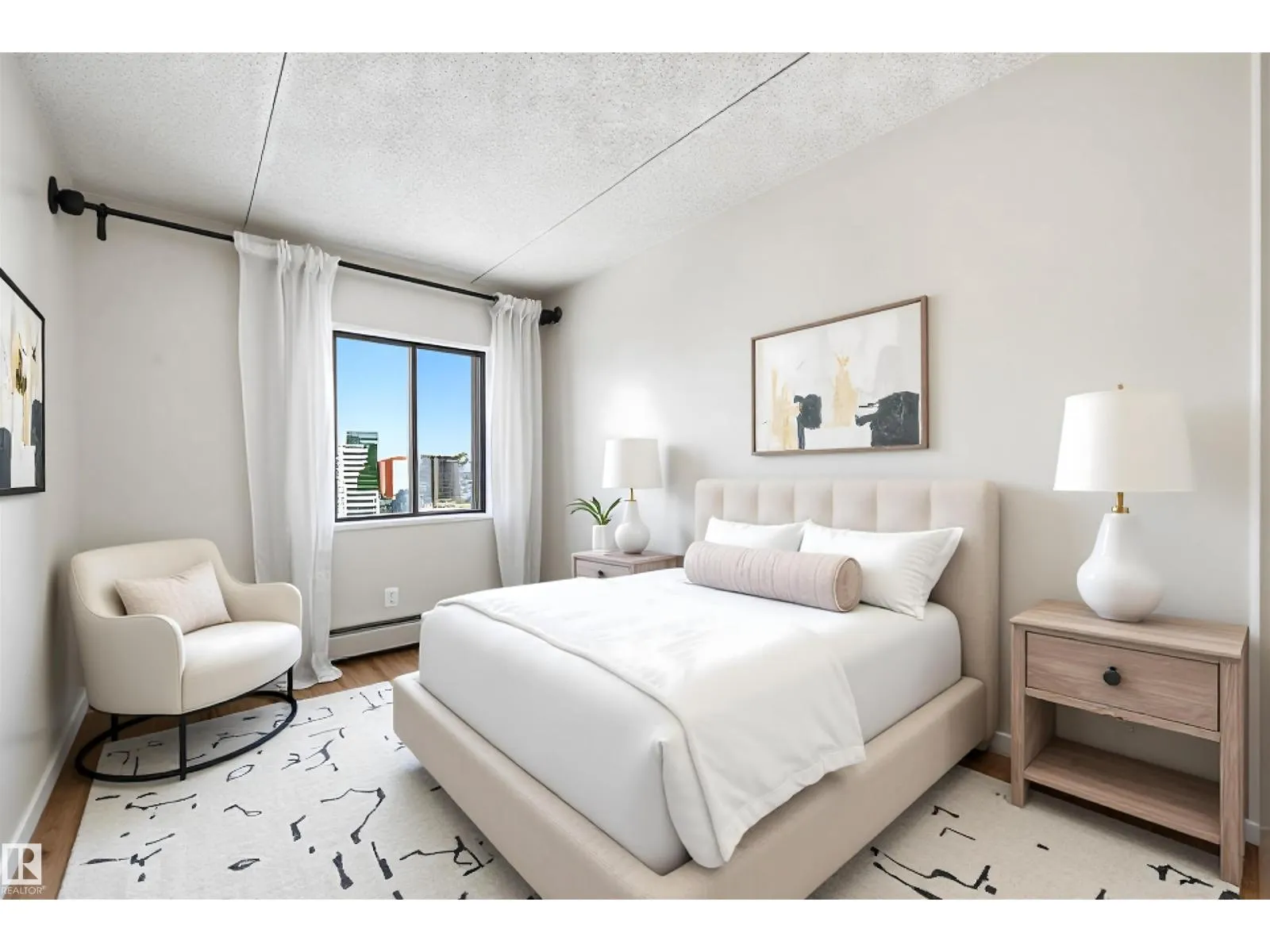 Two-bedroom condo in Rosedale Place, perfectly suited for students and professionals. Located steps from Grandin LRT and within walking distance of river valley trails, shops, restaurants, downtown, the University of Alberta, and MacEwan. The updated kitchen features quartz countertops, stainless steel appliances, and a glass tile backsplash. Laminate flooring in the living area and tile in the kitchen and bathroom. The spacious primary suite offers a large walk-through closet; the second bedroom is generous in size. The bright living room opens via sliding doors onto a balcony with downtown views. Well-maintained building amenities include exercise and party rooms. Includes an underground parking stall. Condo fees cover electricity, heat, and water/sewer. Ready for a quick possession. (id:27476)