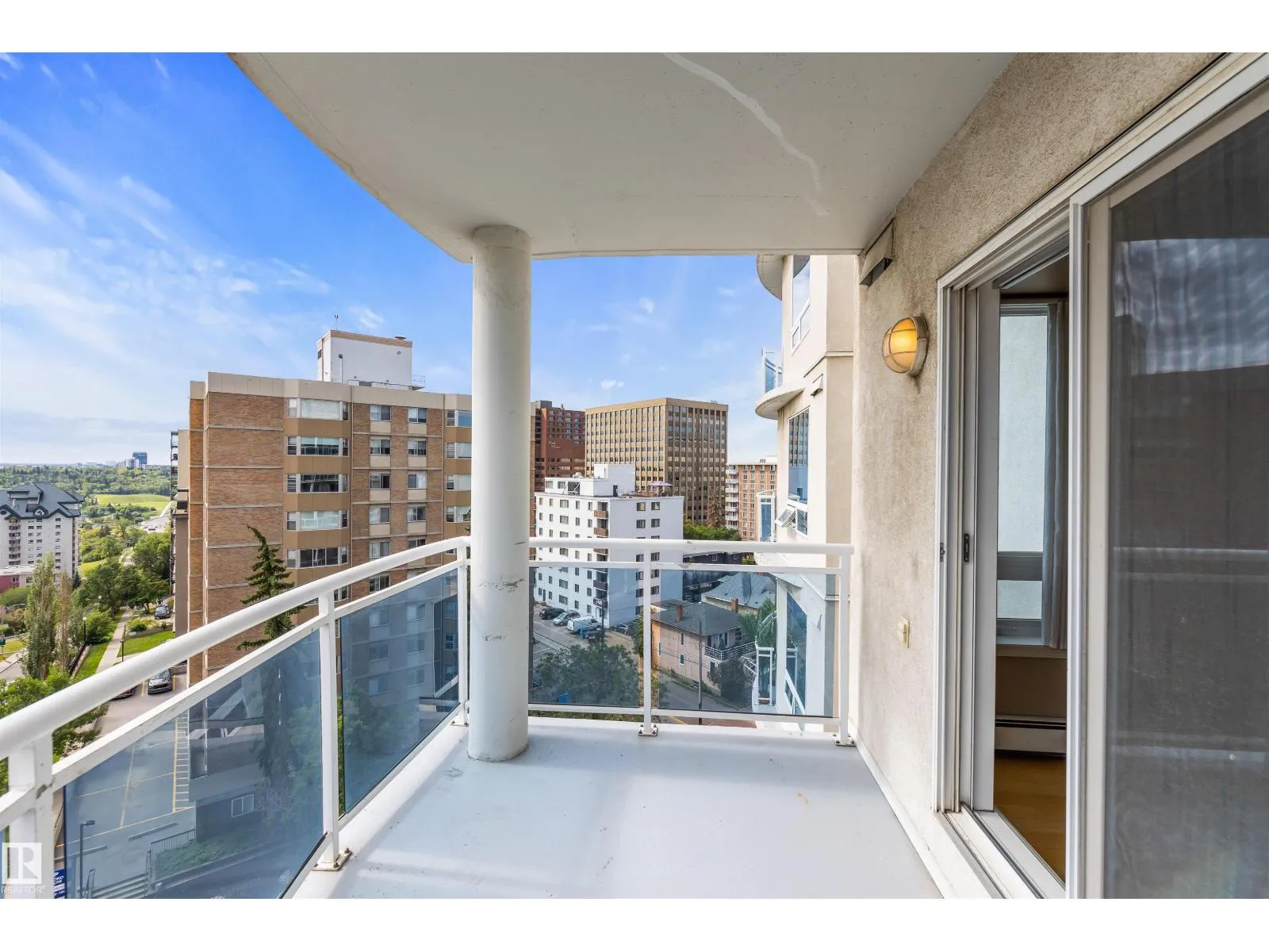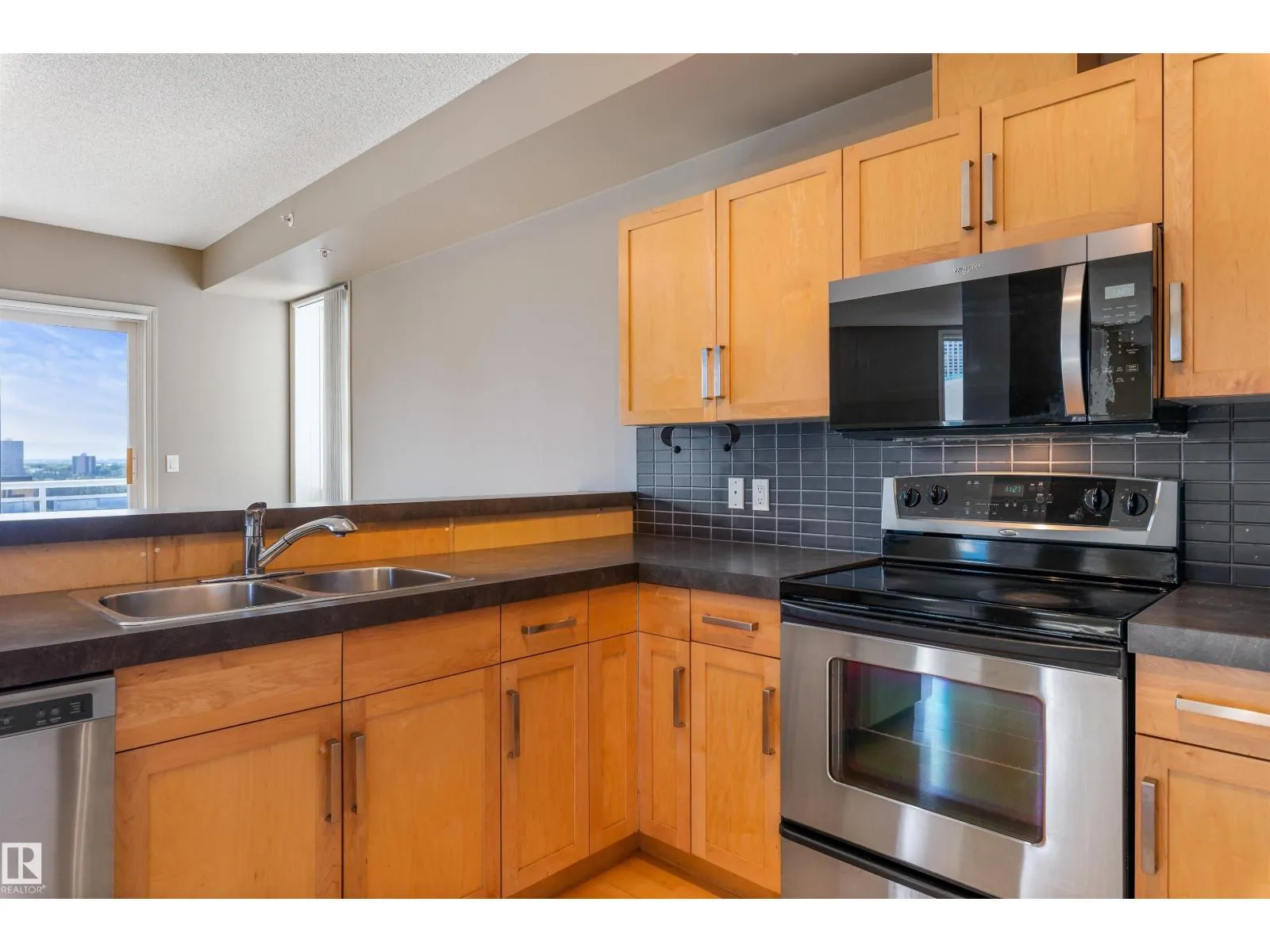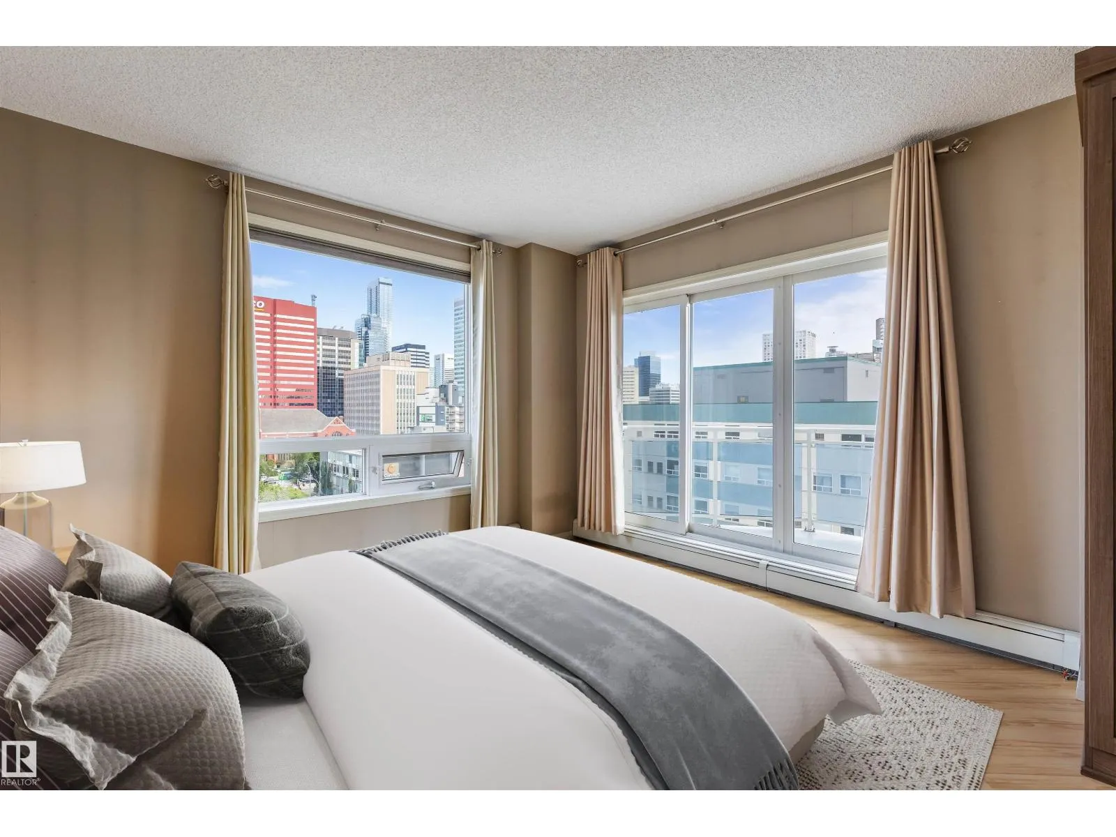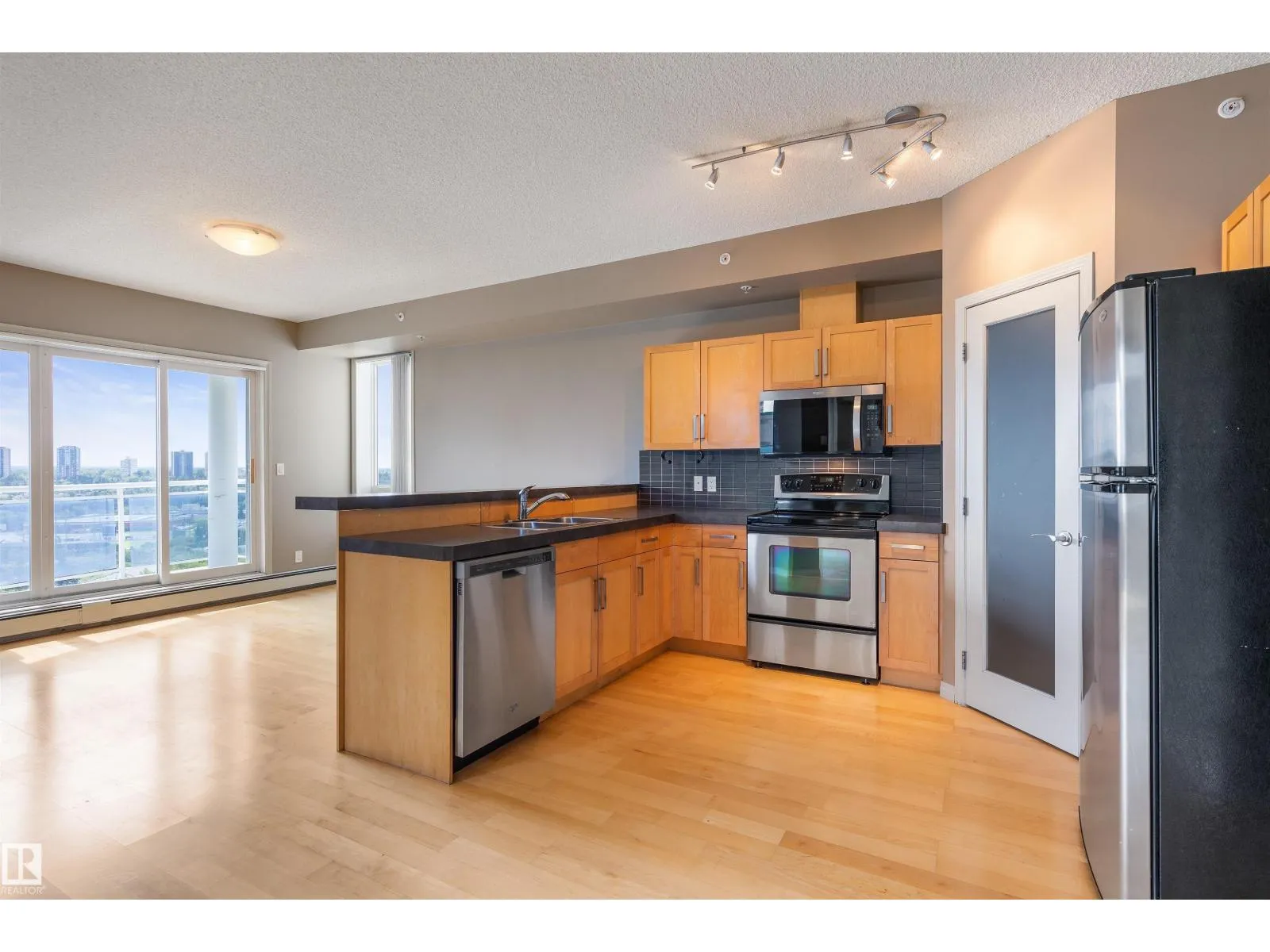 Corner suite with river valley views and nearly 1,370 sq ft - one of the largest floor plans in the Omega building. This spacious 2 bedroom, 2 bathroom condo offers a bright open layout designed for comfortable downtown living. Large windows capture south, east, and north exposures, filling the home with natural light. The kitchen features maple cabinetry, stainless steel appliances, raised eating bar, and corner pantry, flowing into a generous dining area perfect for entertaining. Enjoy 2 private balconiesâone off the living room with river valley views and gas BBQ hookup, and another off the primary bedroom with city views. The primary suite includes built-in wardrobes and a 4-piece ensuite, while the second bedroom offers a walk-in closet with adjacent full bath. Additional features include in-suite laundry, large storage, A/C, titled underground parking, pet-friendly building, access to a fitness room, on-site café/bakery. Steps to river valley trails, Jasper Ave, restaurants, & amenities. (id:27476)