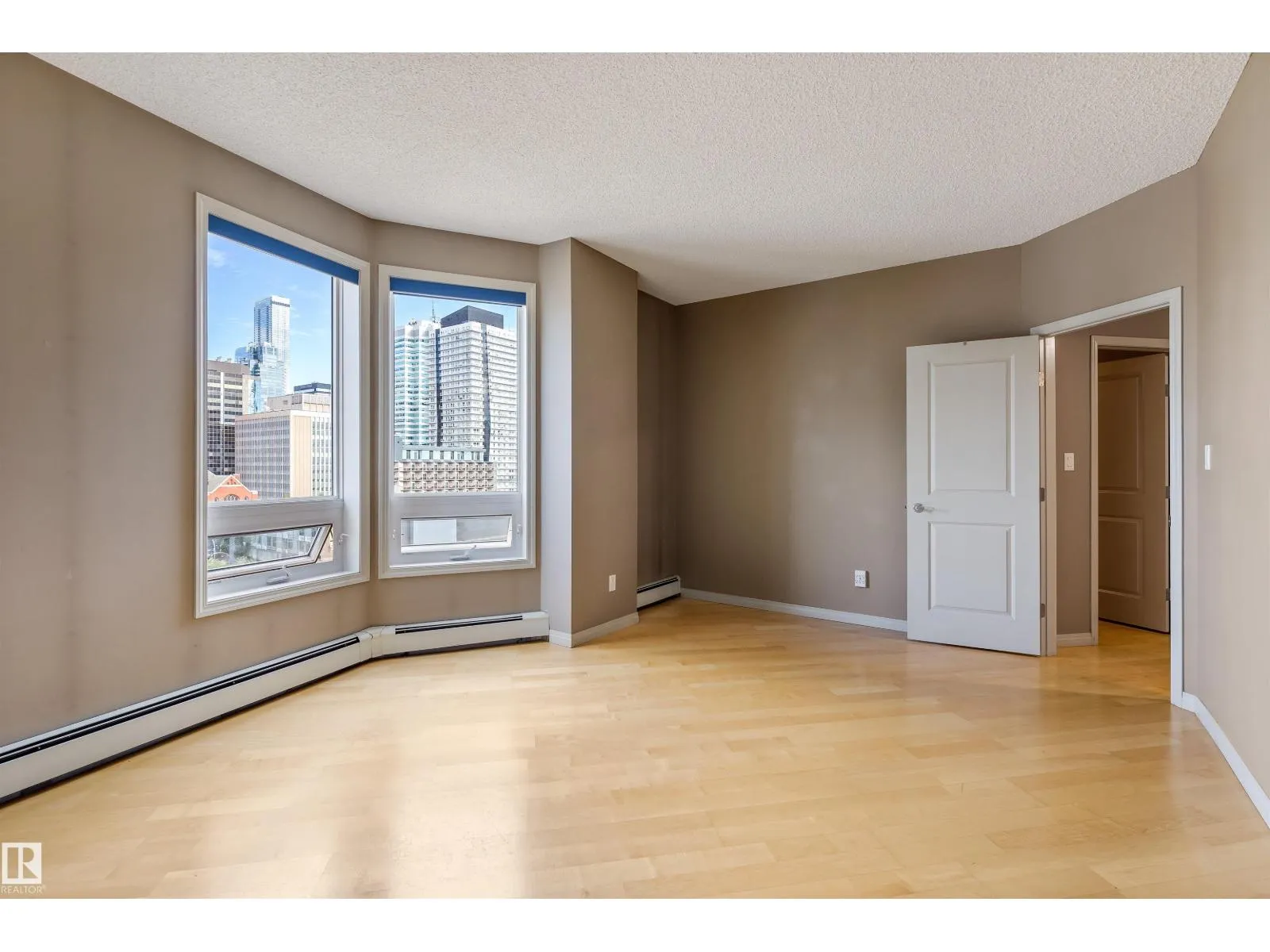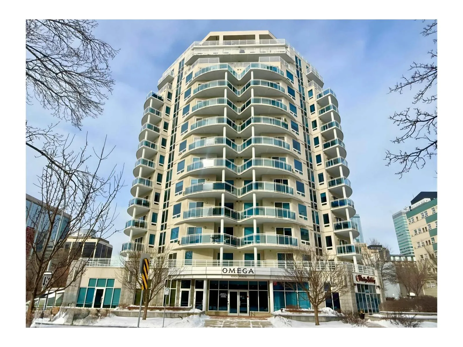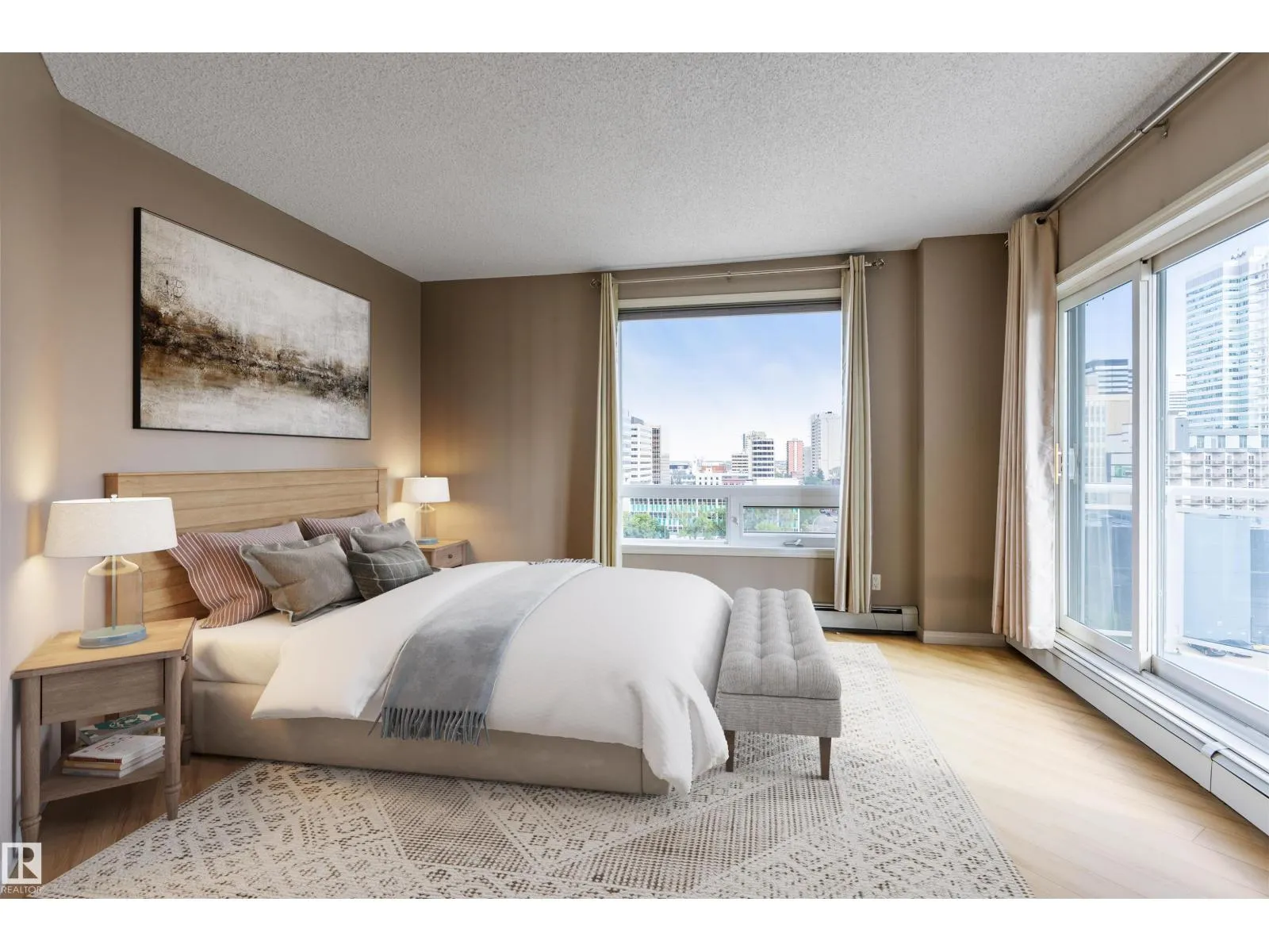 Corner suite with river valley views and nearly 1,370 sq ft - one of the largest floor plans in the Omega building. This spacious 2 bedroom, 2 bathroom condo offers a bright open layout designed for comfortable downtown living. Large windows capture south, east, and north exposures, filling the home with natural light. The kitchen features maple cabinetry, stainless steel appliances, raised eating bar, and corner pantry, flowing into a generous dining area perfect for entertaining. Enjoy 2 private balconiesâone off the living room with river valley views and gas BBQ hookup, and another off the primary bedroom with city views. The primary suite includes built-in wardrobes and a 4-piece ensuite, while the second bedroom offers a walk-in closet with adjacent full bath. Additional features include in-suite laundry, large storage, A/C, titled underground parking, pet-friendly building, access to a fitness room, on-site café/bakery. Steps to river valley trails, Jasper Ave, restaurants, & amenities. (id:27476)