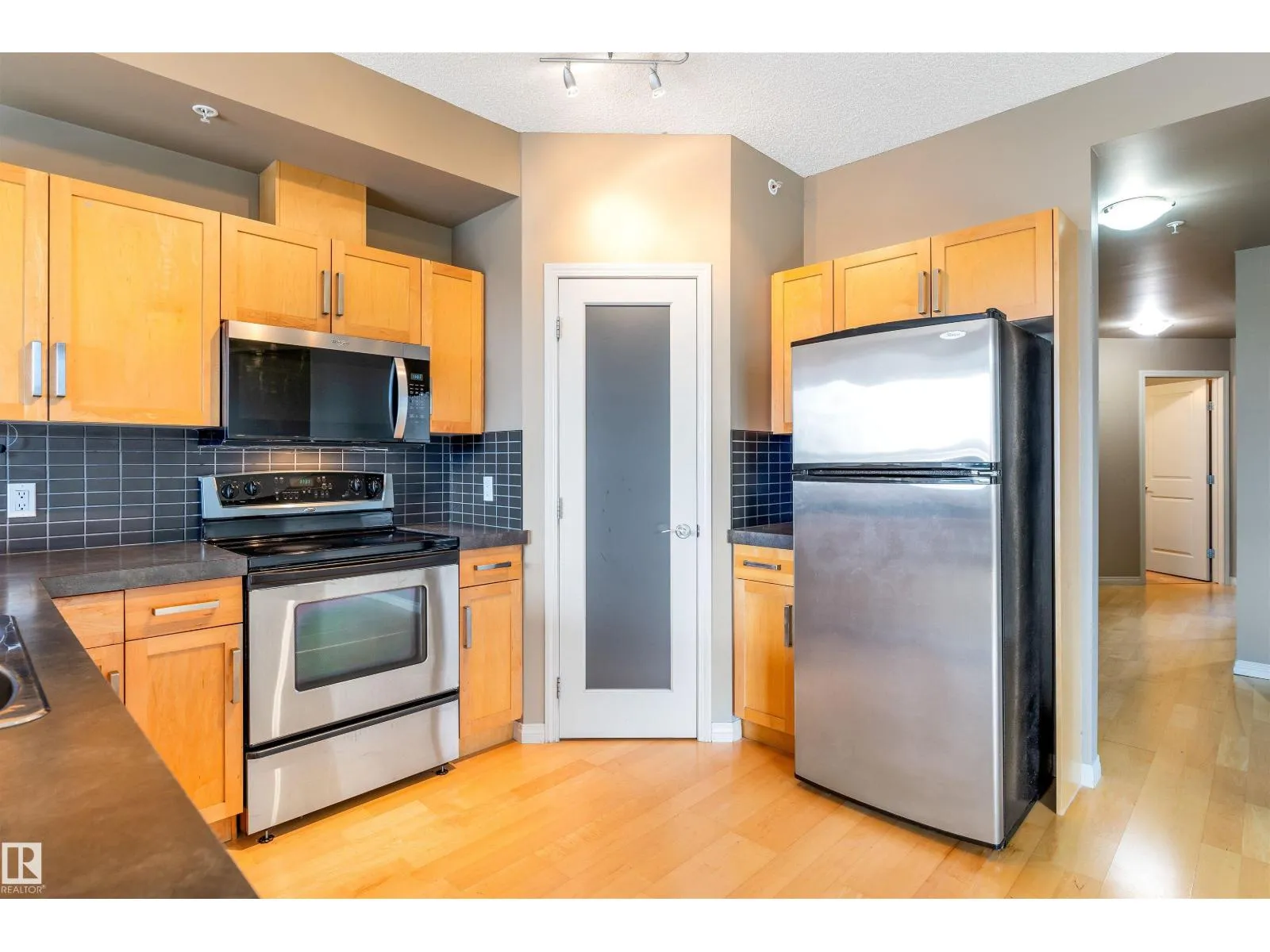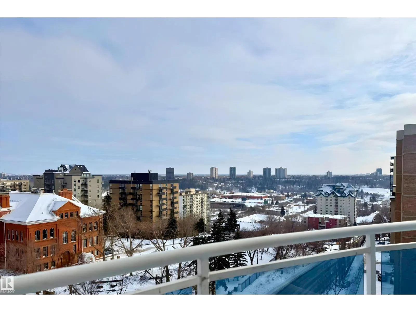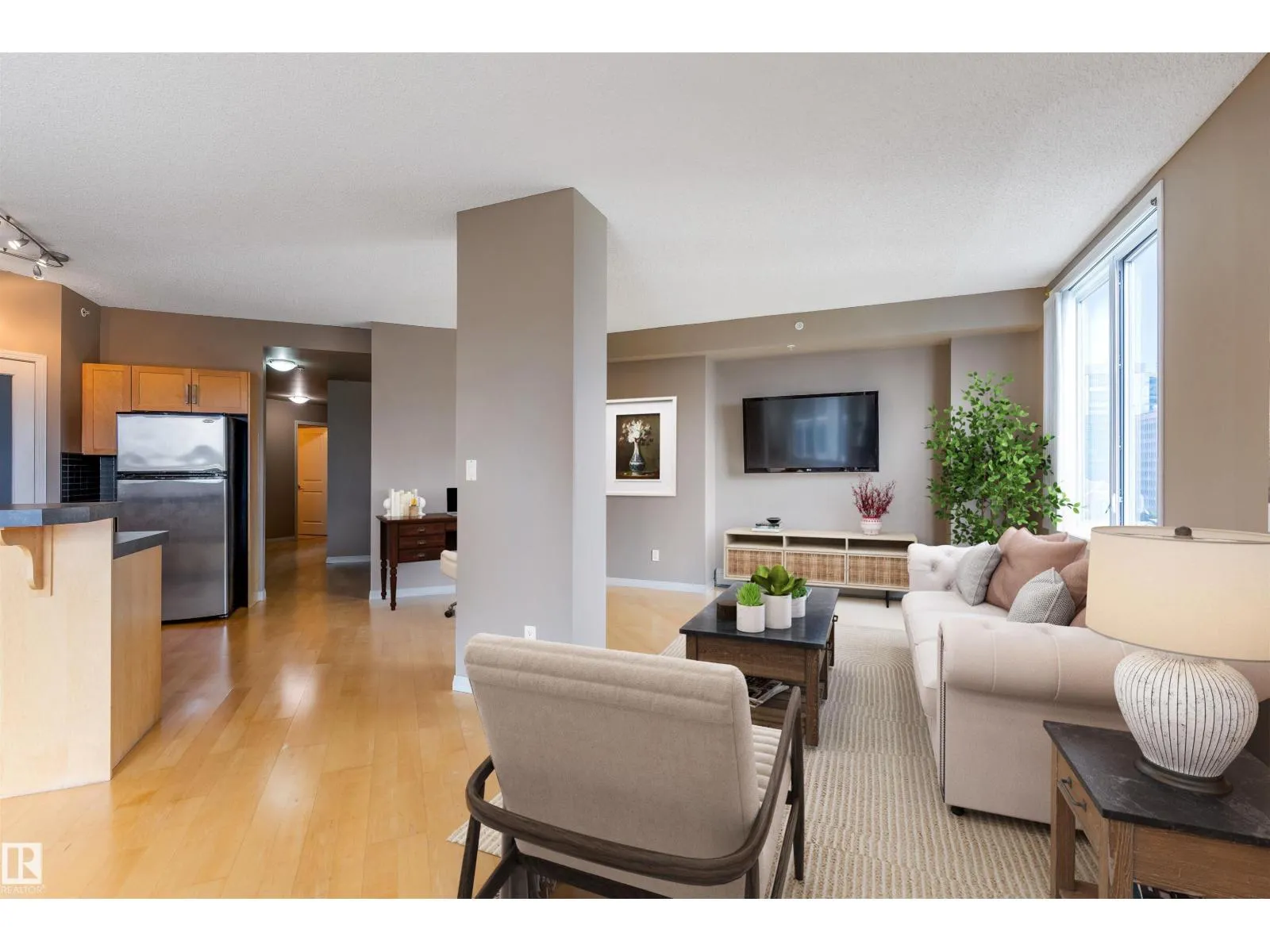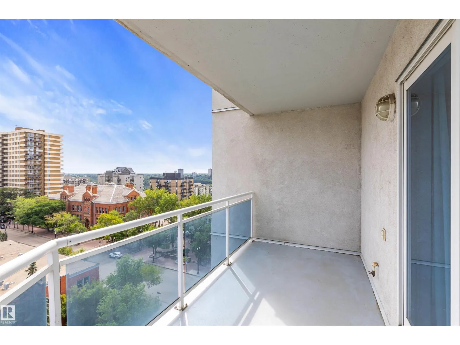 Corner suite with river valley views and nearly 1,370 sq ft - one of the largest floor plans in the Omega building. This spacious 2 bedroom, 2 bathroom condo offers a bright open layout designed for comfortable downtown living. Large windows capture south, east, and north exposures, filling the home with natural light. The kitchen features maple cabinetry, stainless steel appliances, raised eating bar, and corner pantry, flowing into a generous dining area perfect for entertaining. Enjoy 2 private balconiesâone off the living room with river valley views and gas BBQ hookup, and another off the primary bedroom with city views. The primary suite includes built-in wardrobes and a 4-piece ensuite, while the second bedroom offers a walk-in closet with adjacent full bath. Additional features include in-suite laundry, large storage, A/C, titled underground parking, pet-friendly building, access to a fitness room, on-site café/bakery. Steps to river valley trails, Jasper Ave, restaurants, & amenities. (id:27476)