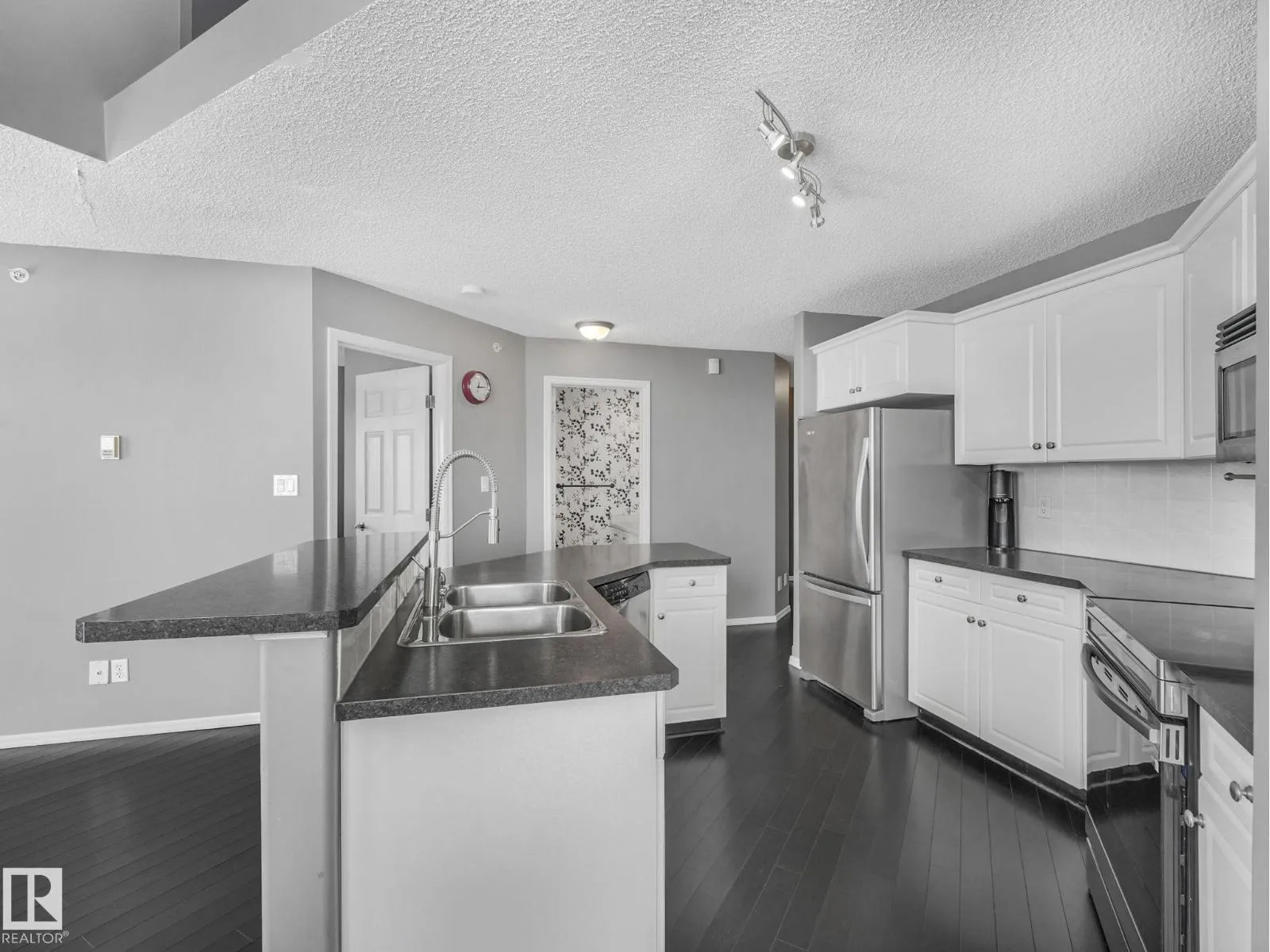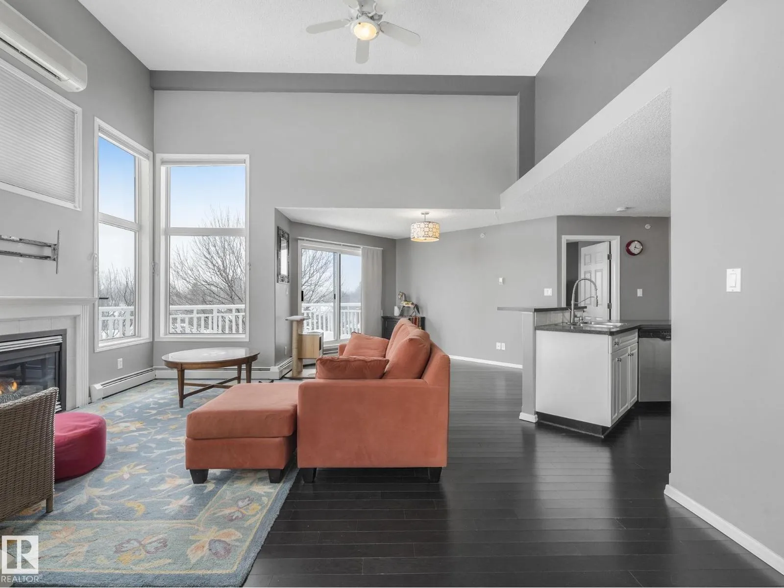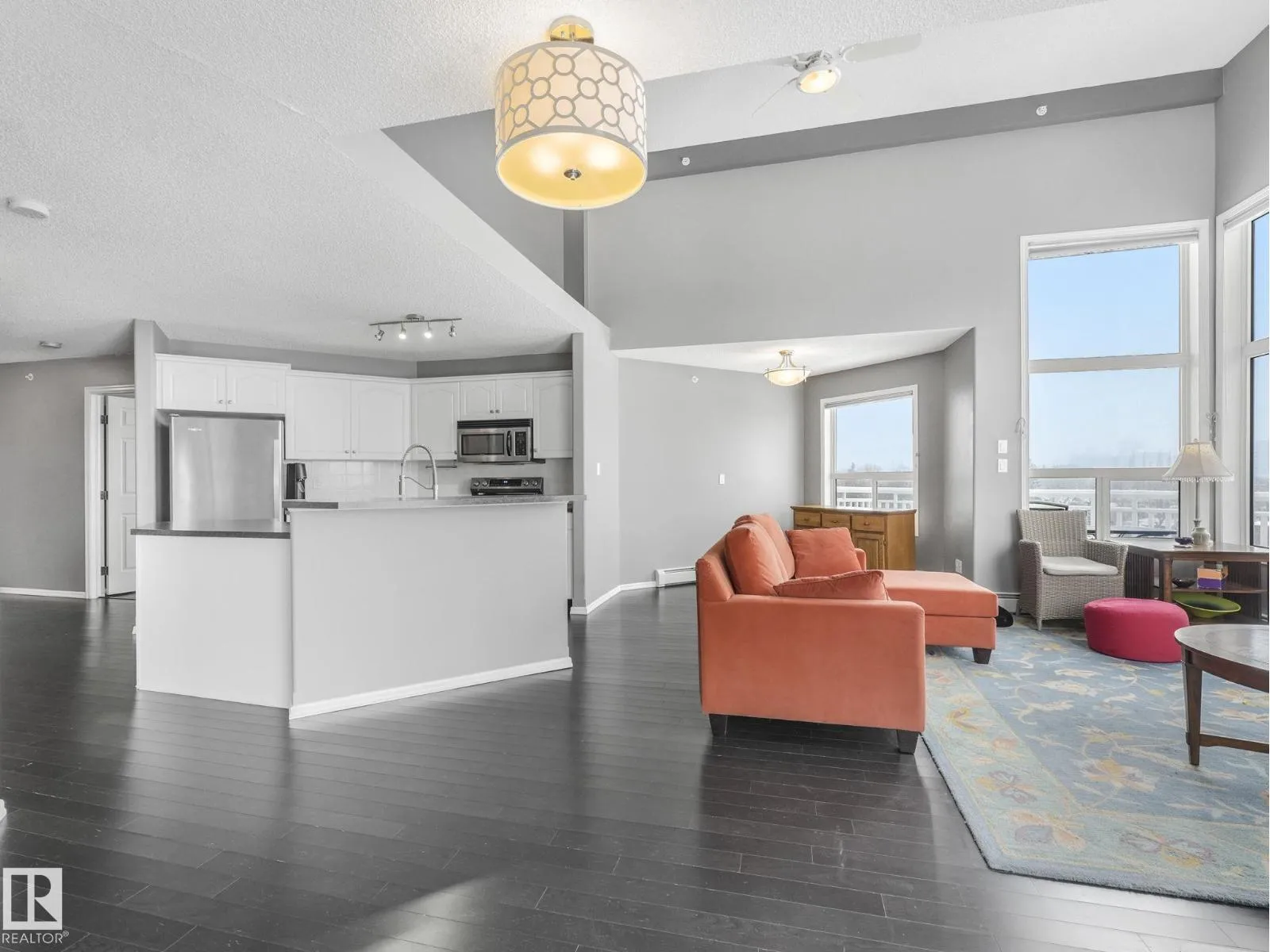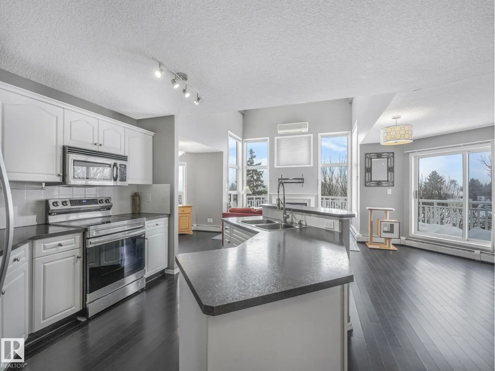 MODERN, BRIGHT, 14' CEILINGS, CORNER PENTHOUSE in St. Lawrence Court in sought-after Westmount. Enjoy over 1000+ square feet in this top floor, 2 bedroom, 2 bathroom condo with open living area, 14' ceilings, great views, gorgeous SW exposure, tons of natural light and air conditioning. Dark floors throughout, mostly NEW stainless steel appliances, fireplace, and in-suite laundry are just a few more features. Take the party outside on the massive wrap around balcony with city views and then relax in one of two spacious bedrooms. The unit also comes with 2 titled underground parking stalls & storage cage. Amenities include the gated, courtyard, social room, fitness rooms & secured underground parking with car wash. Pet friendly building, max 2 animals per unit with board approval. No size limits! Is Centrally located on 124 St, walk to Tiramisu, the Westmount Farmers Market, The Viking, art galleries, right beside Massage, Chiropractor, Physiotherapy, Acupuncture and more! Enjoy an upscale, walkable lifest (id:27476)