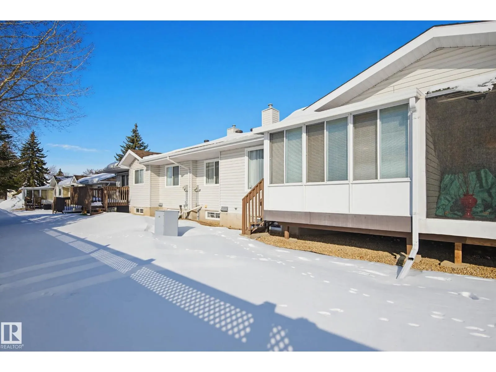 Quiet adult living in Bearspaw! This sought-after community at Horizon Blackmud Creek is the place to be. The setting is private, and there are walking trails and the ravine close by for your leisure. This home has bungalow living, with 2 bedrooms, the Primary one being a king-size and sunny south-facing. You will enjoy a nice floor plan with a 3-season sunroom off the living room, a large kitchen with plenty of cabinets and storage, and an attached single garage that is insulated and drywalled. The basement is fully finished with a large laundry room, ample storage, and a workbench. You can spread out in the large recreation room for family get-togethers, featuring a wet bar and a 2nd bathroom. Located in a well-maintained complex, it is just waiting for a new homeowner to love it! (id:27476)