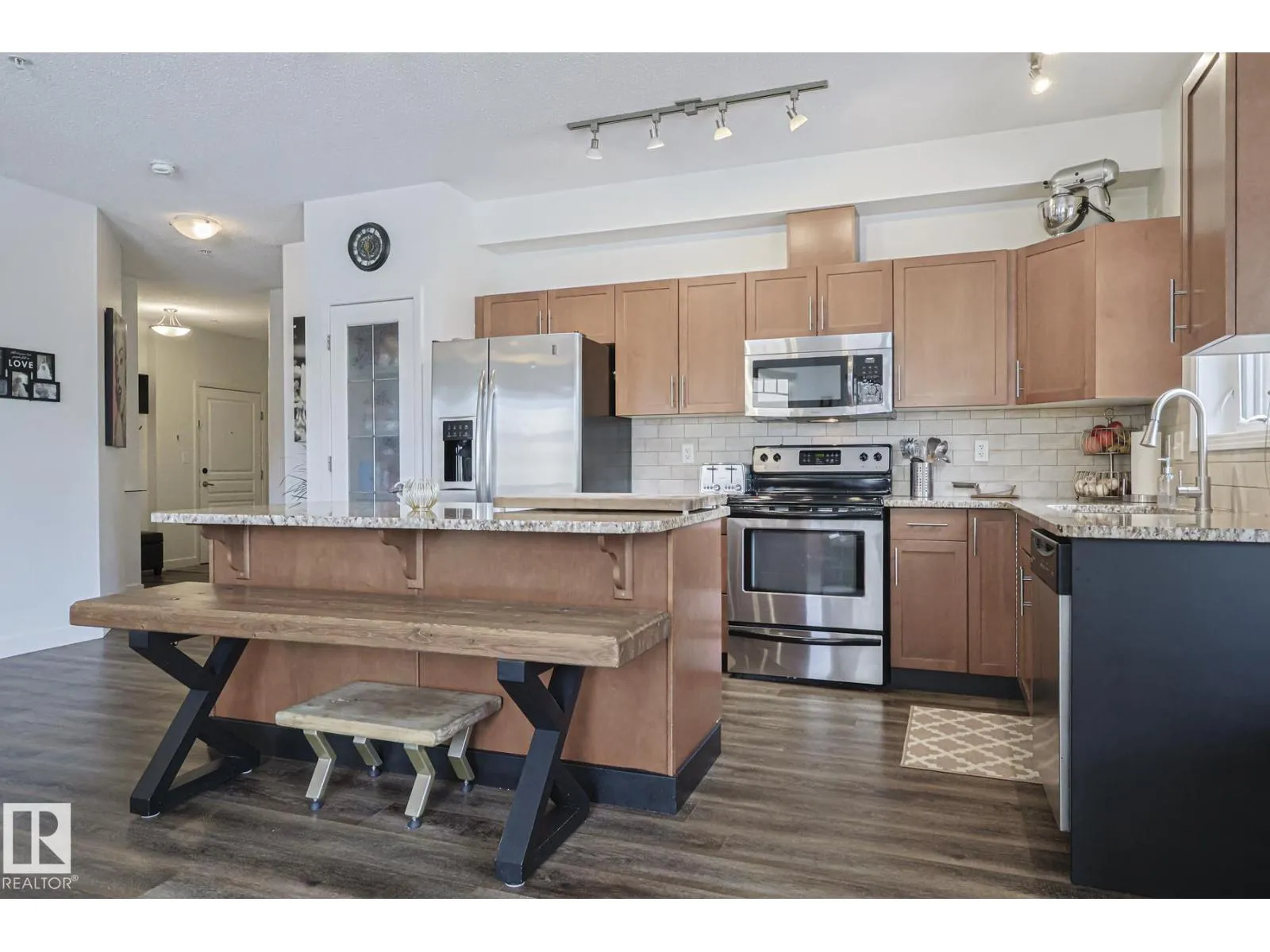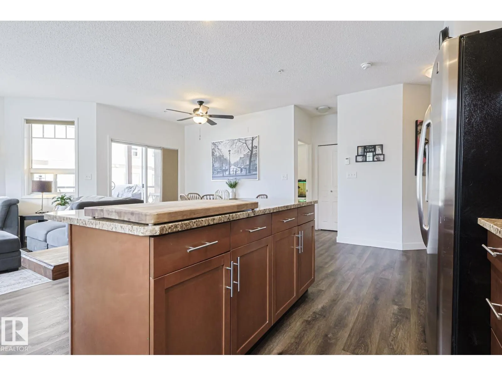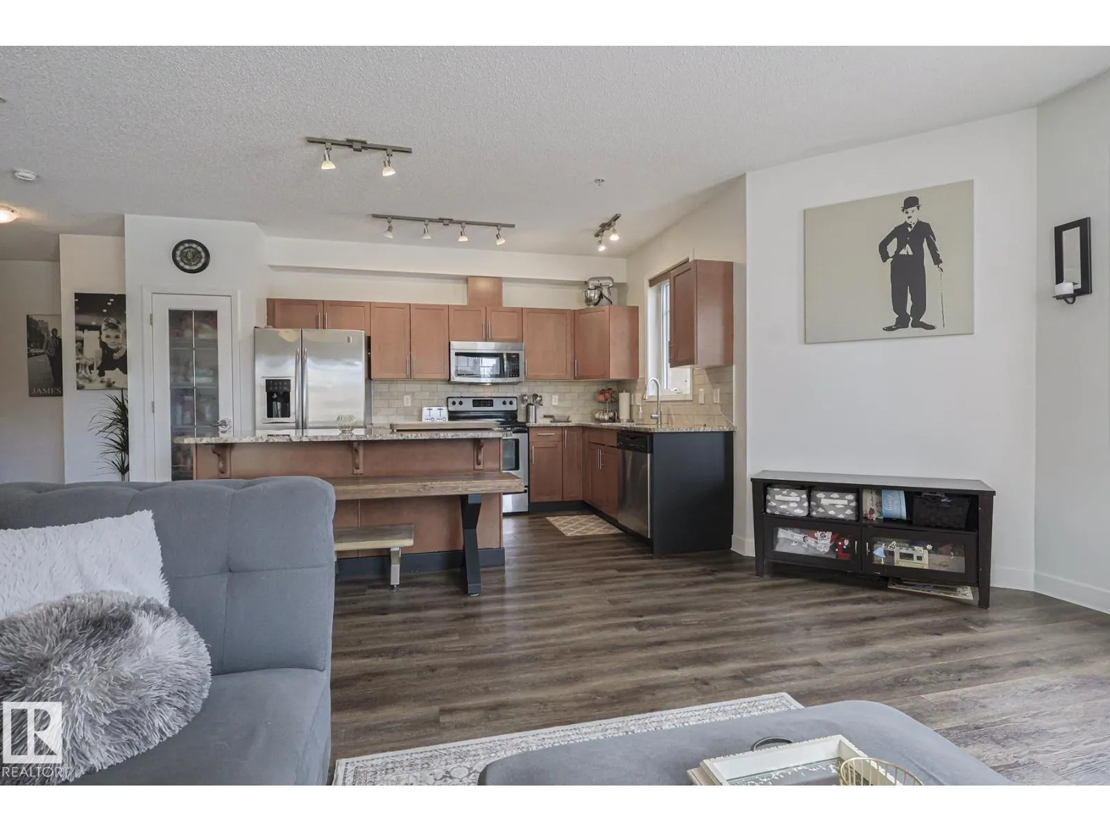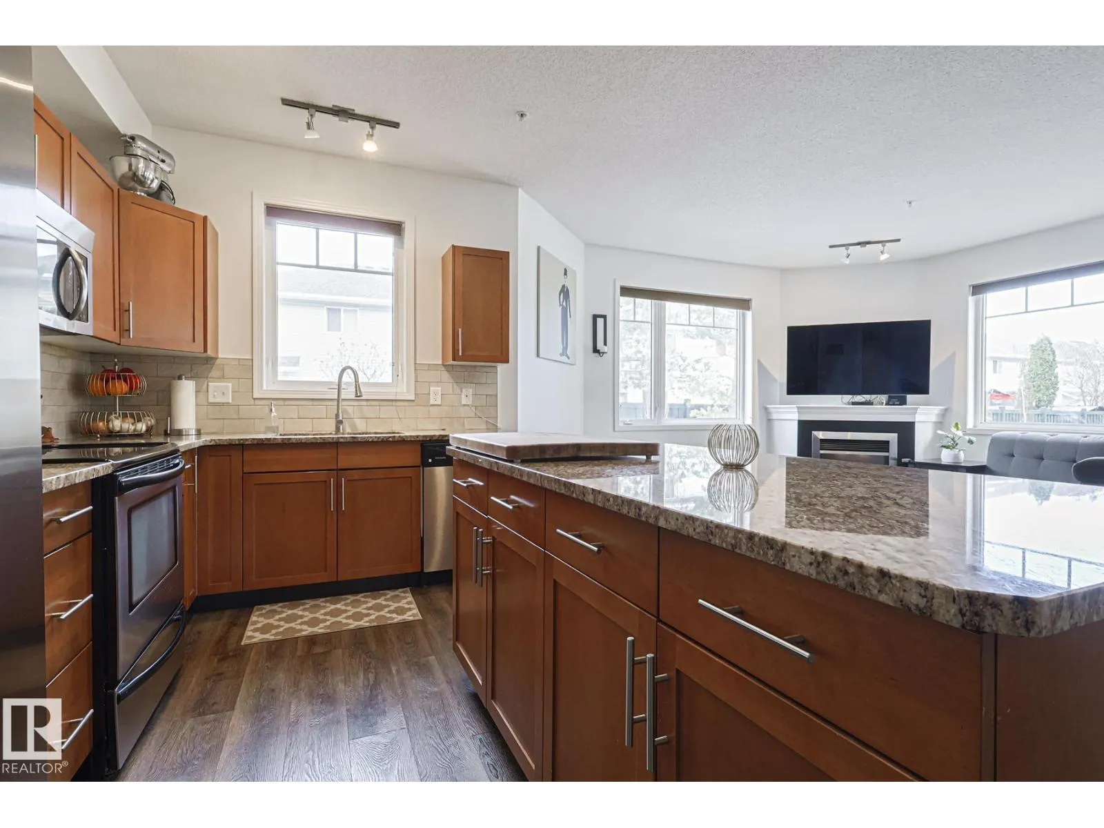 Welcome to this stunning corner unit with 9â ceilings which offers the perfect blend of style, comfort, and convenience. The open-concept kitchen features stainless steel appliances, granite countertops and a functional island with seating - making it ideal for both everyday living and entertaining. Rich wood cabinetry and a convenient pantry provide ample storage. The spacious primary bedroom includes a walk-in closet and private ensuite. The second bedroom is big enough to fit in king size bed and second full bathroom is across the living space âperfect for guests, or a home office. Relax in the inviting living room with a beautiful corner fireplace, adding warmth and charm to the space. The unit offers private balcony, in-suite front load washer and dryer, one secured heated underground parking stall. The building offers social room, gym and a guest suite. Minutes to park, lake, shopping, school and transportation and a perfect place to call home (id:27476)