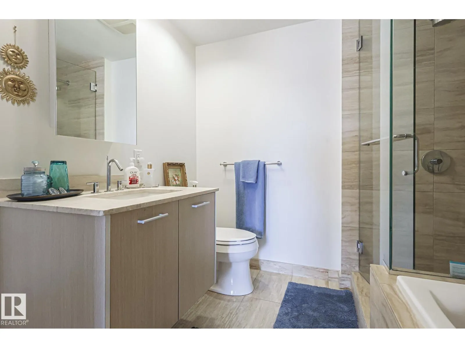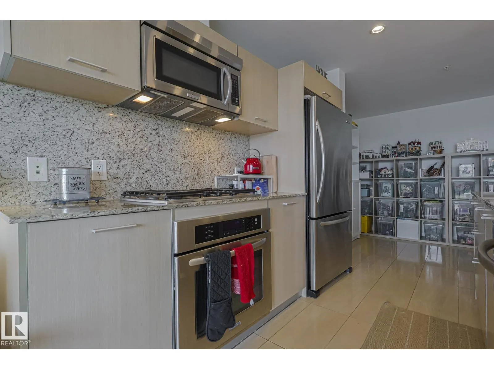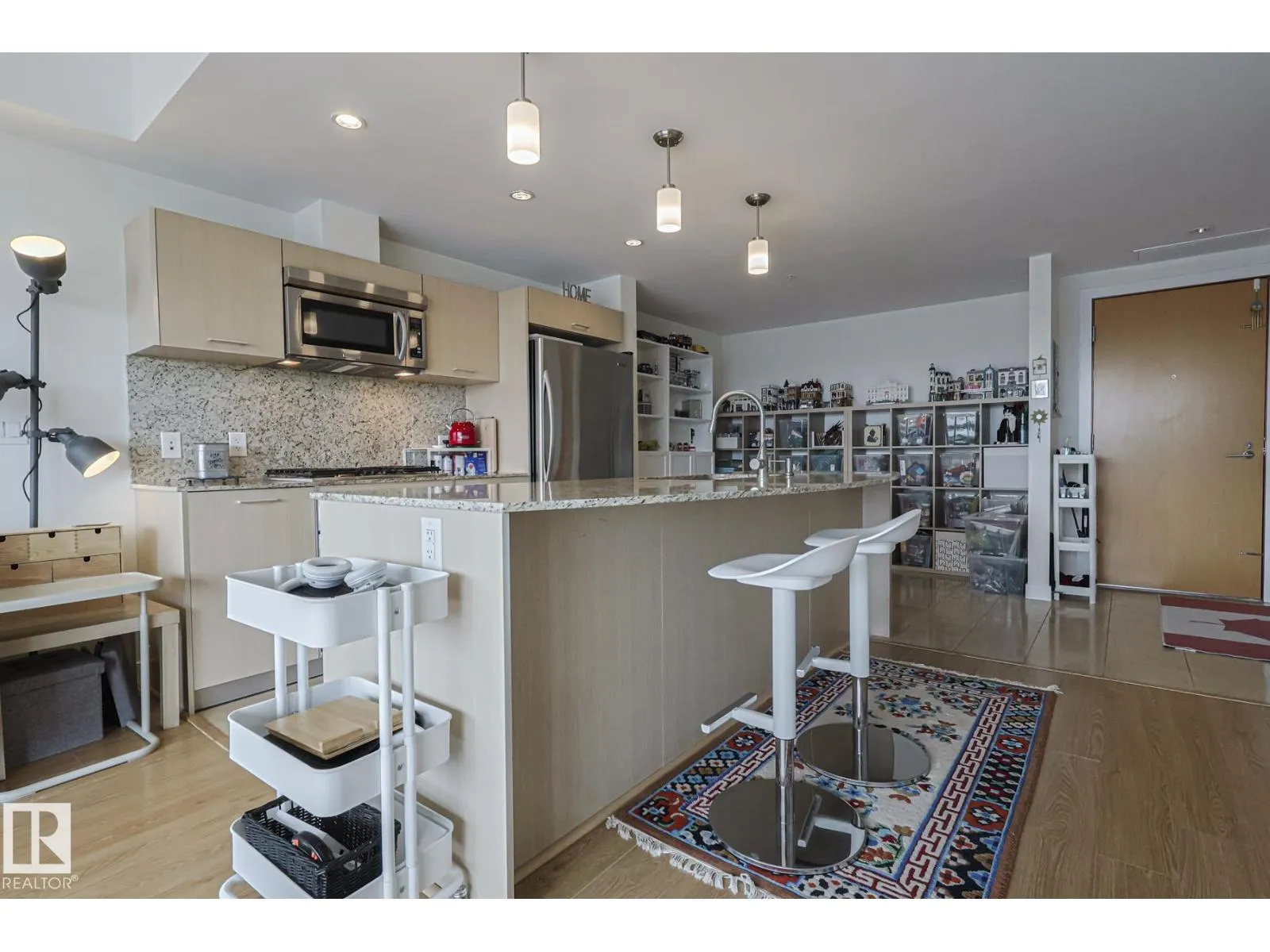Modern loft style condo in sophisticated One Century Park. Step inside this south facing unit with a gourmet kitchen featuring huge island, granite countertops, beautiful cabinets, gas stove, stainless steel appliances (fridge has a water dispenser/ice-maker) and ceramic tile flooring. Large dining area or could be used as an office or den. Spacious livingroom with large south facing windows, natural colour and laminate flooring as well as access to the balcony to enjoy a morning coffee or bbq your next meal. Bathroom features soaker tub, glass shower ceramic tile flooring and puck lighting complete this space. This home has central air-conditioning, been recently repainted and all new closet doors. Titled underground parking (199) and titled storage cage (531) also separate bike locker. Gym is located just down the hall. Condo fee includes heat, water and electricity. The 65 TV is included as well with the sale. (id:27476)