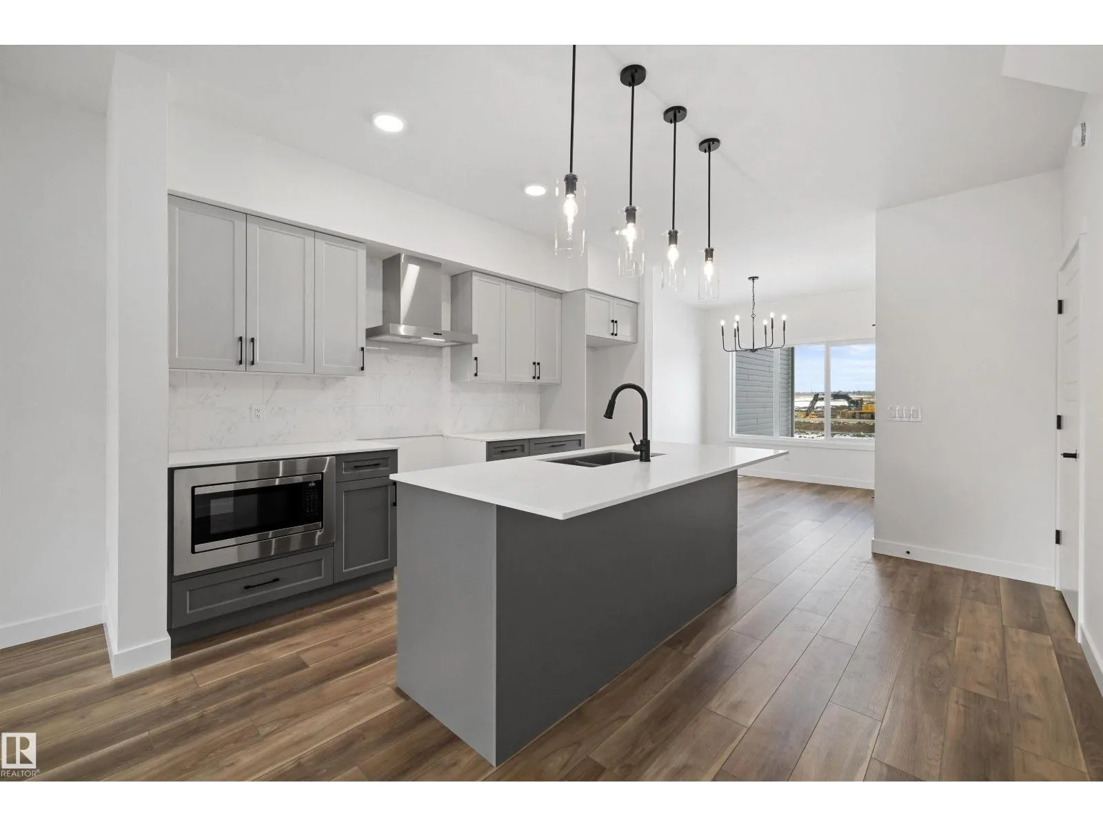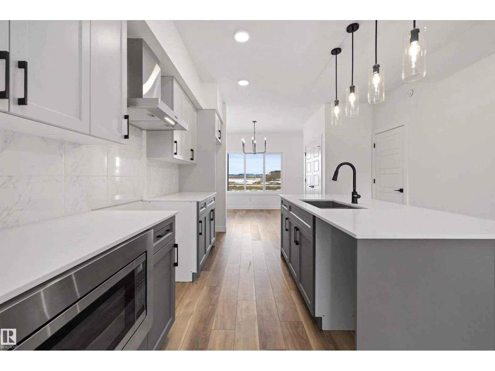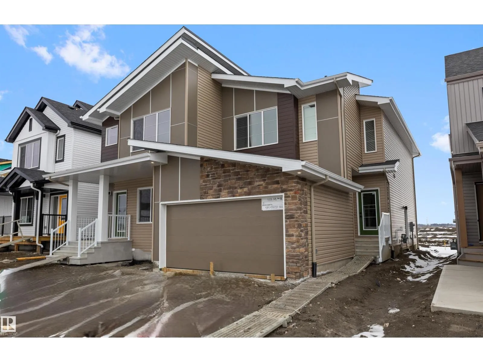 Built by Sterling Homes, this bright and stylish duplex in Marquis blends modern design with everyday comfort in a growing community known for quiet streets, ponds, and future schools. The welcoming foyer leads to an open-concept main floor filled with natural light from triple-pane windows. The kitchen features quartz countertops, a large island with seating, upgraded soft-close cabinetry, full-height tile backsplash, chimney hood fan, built-in microwave, and a corner pantry. Upstairs, the primary suite offers a walk-in closet and a 4-piece ensuite with double sinks and a glass-enclosed shower. Two additional bedrooms, a full bath, bonus room, and convenient upper-floor laundry complete the level. Highlights include luxury vinyl plank flooring, upgraded railings, separate side entrance, basement rough-ins for future development, and a double attached garage with floor drain. (id:27476)