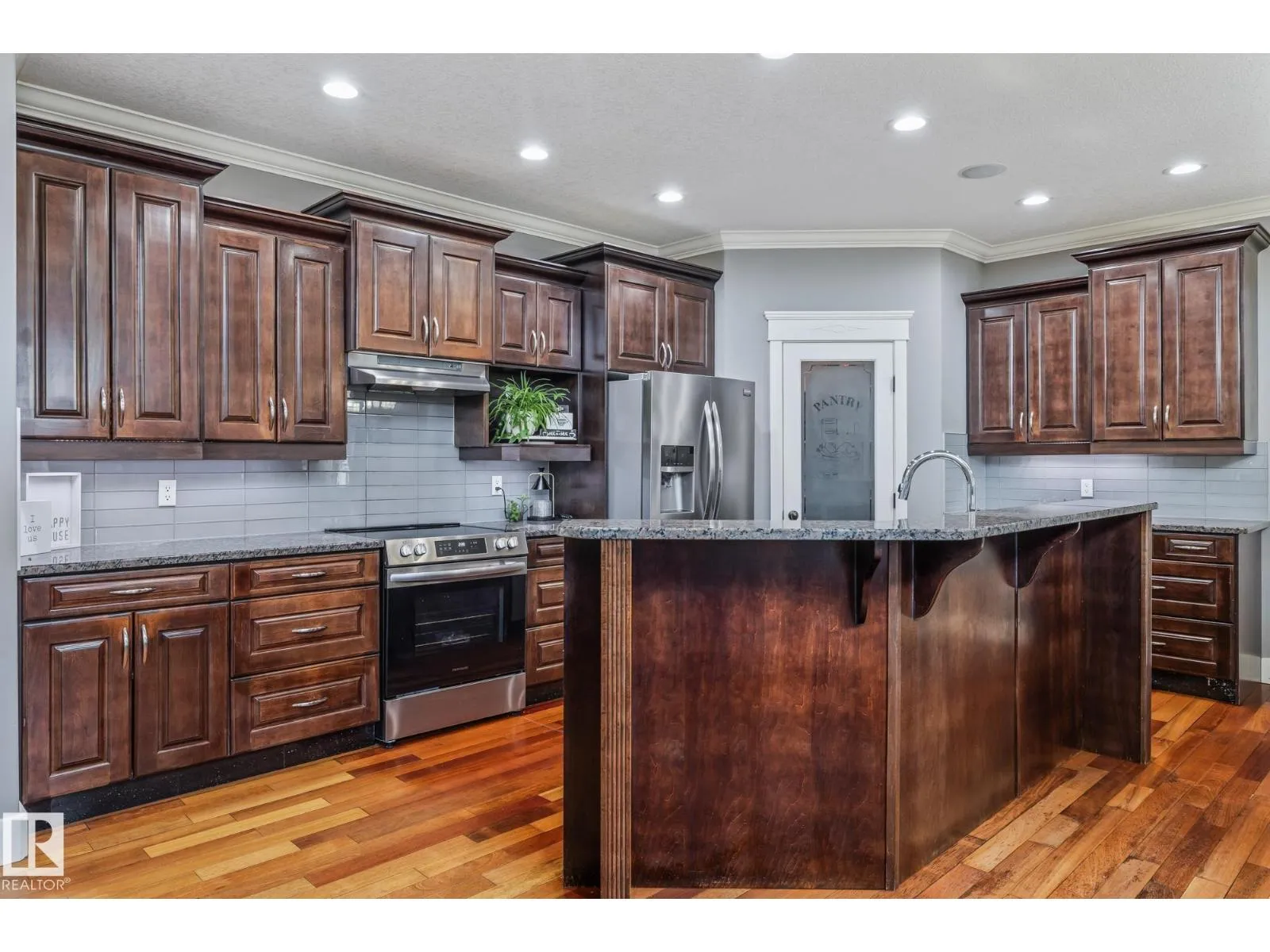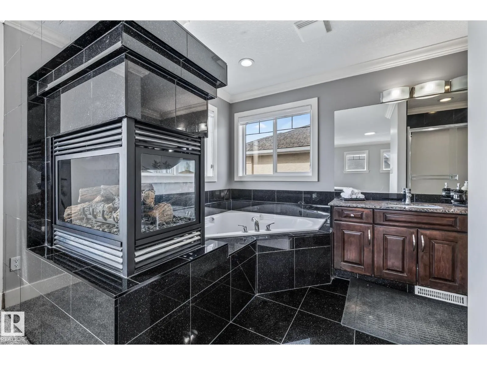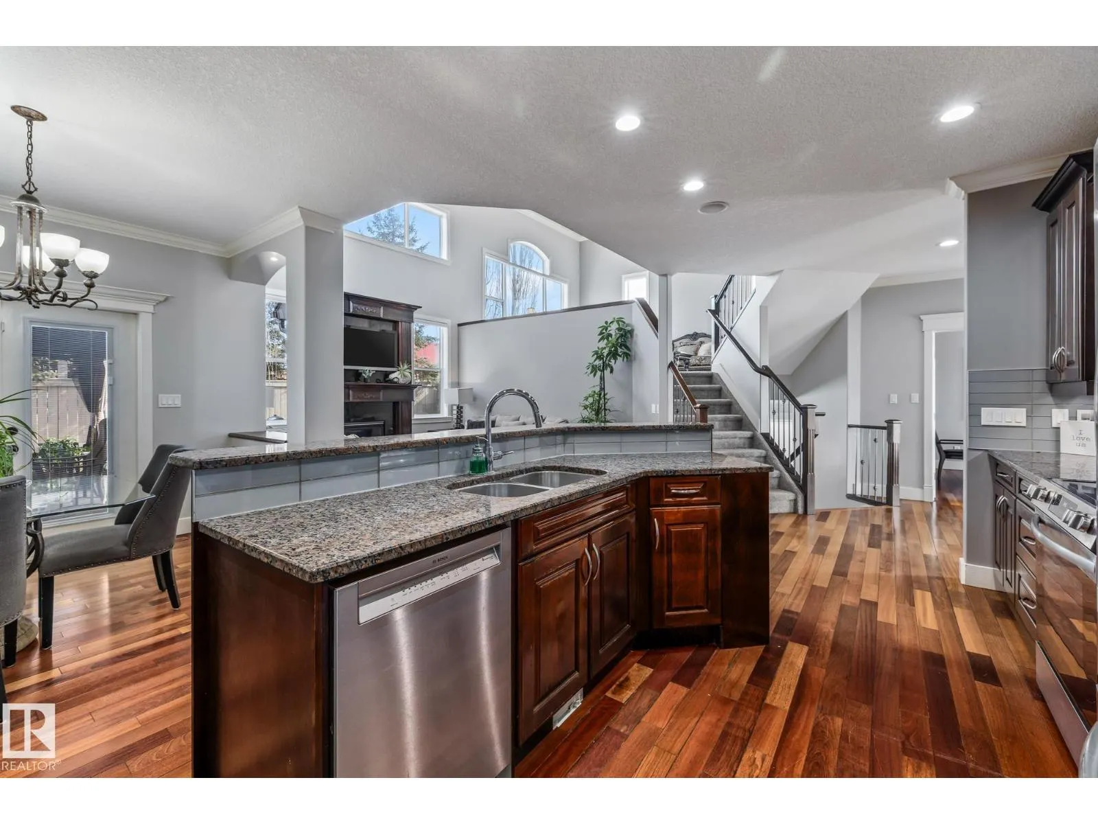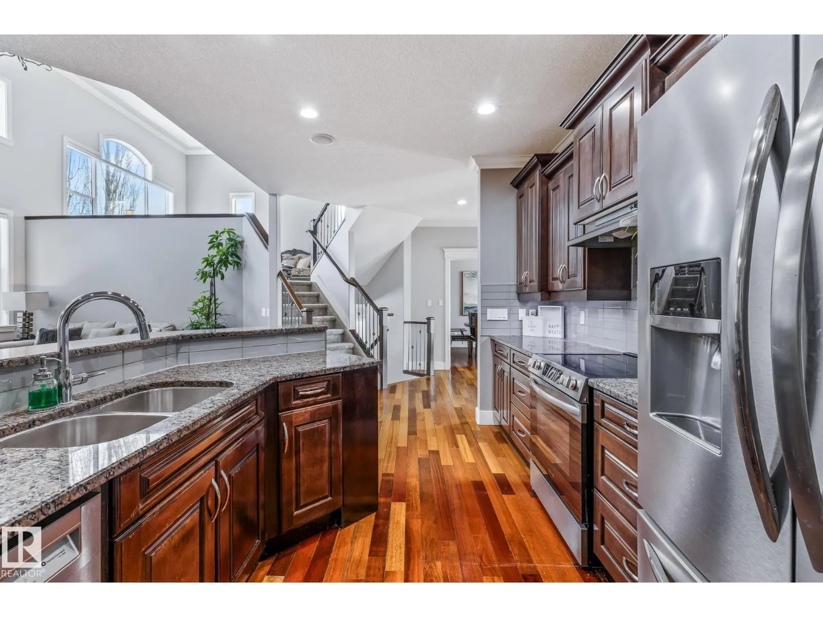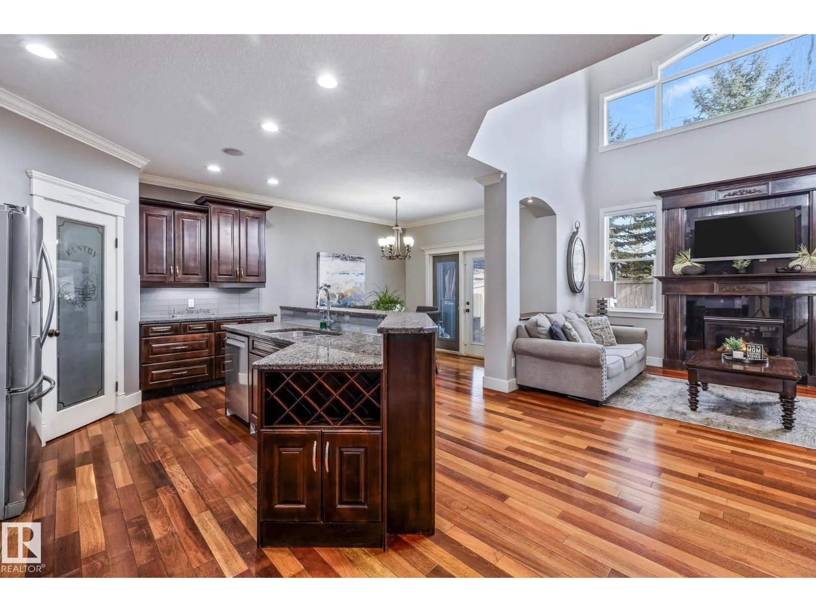 Stunning custom 5-level split with just under 4,000 sq ft of total living space in prestigious Richford. Full of character, craftsmanship, and elegant design, featuring 9 ft ceilings, stained maple hardwood, and large windows. Main floor offers a cozy family room with gas fireplace, chefâs kitchen with granite countertops, stainless appliances, maple cabinetry, under-cabinet lighting, huge pantry, breakfast nook, den/formal dining, and 2-pc bath. Upper levels include bonus room, luxurious primary suite with spa-like 5-pc ensuite and 3-sided gas fireplace, two additional bedrooms, 4-pc bath, and laundry. Fully finished basement (2024) with bar, bedroom, and full bath ideal for entertaining guests. Triple attached garage, 50-year shingles, newer HWT, acrylic stucco, fully landscaped fenced yard, and exquisite curb appeal. Perfect for families or professionals seeking space, style, and comfort. Minutes to South Edmonton Common, airport, and major commuter routes, combining luxury living with convenience. (id:27476)