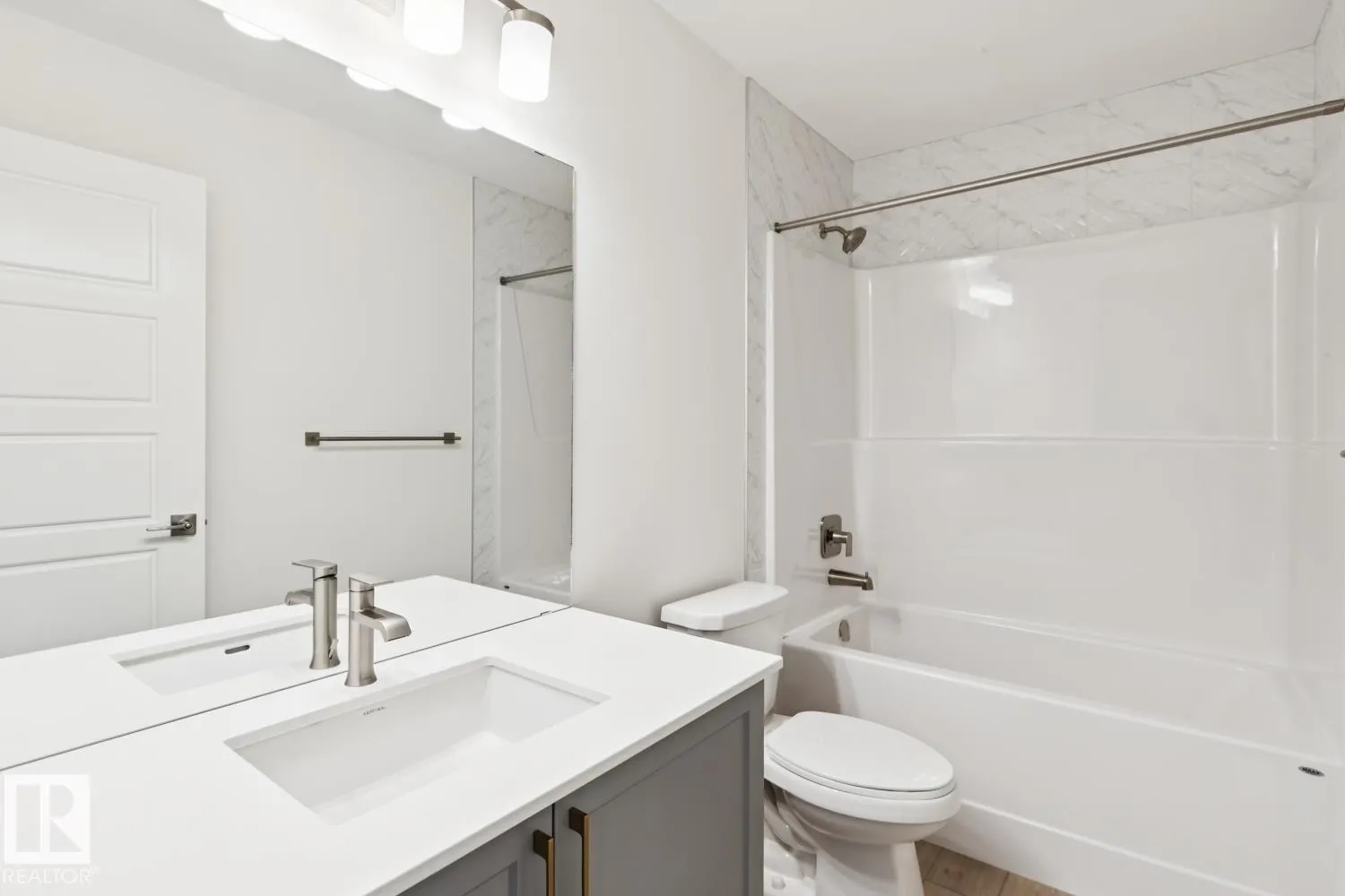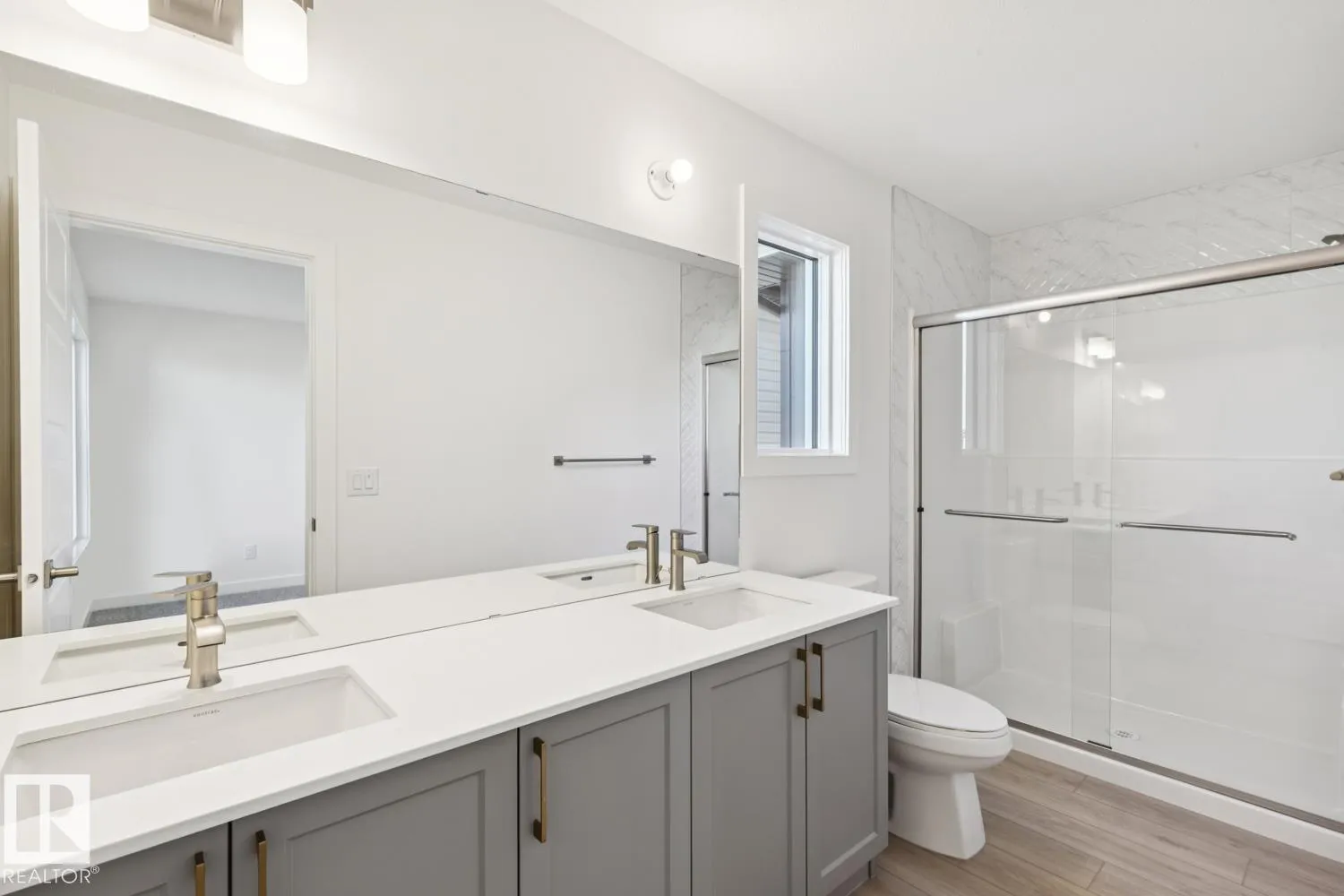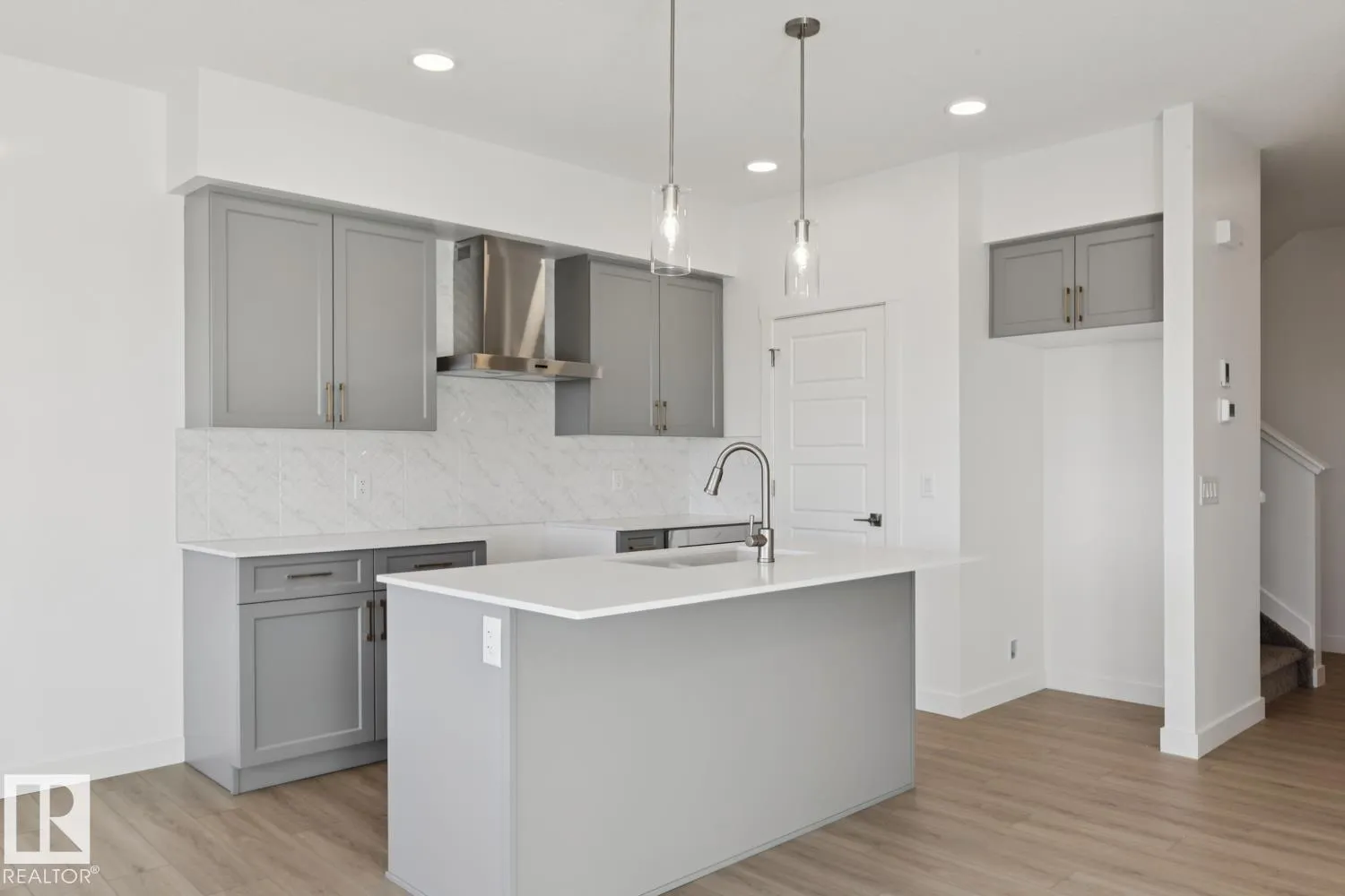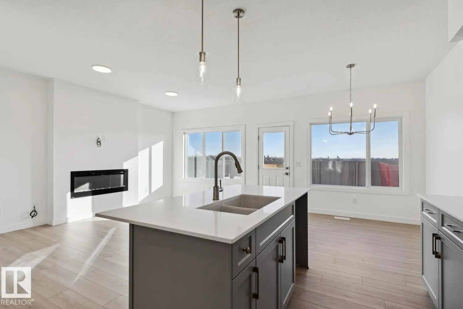 Built by Sterling Homes, this front-attached home in Rivers Edge offers bright, modern living in a nature-inspired west Edmonton community. Triple pane windows and 9â ceilings create an airy main floor that features a welcoming foyer and an open kitchen with quartz counters, a large island, built-in microwave, chimney hood fan, full-height backsplash, and a corner pantry. The great room includes an electric fireplace and large rear windows, with a garden door leading to the backyard. A half bath completes the main level. Upstairs, the primary suite offers a walk-in closet with a window and a 4-piece ensuite with double sinks and a glass-door shower. A bonus room, full bath, upper-floor laundry, and two additional bedrooms complete the layout. With luxury vinyl plank flooring, upgraded railings, a separate side entrance, a double garage with floor drain, and basement rough-ins, this home blends comfort and convenience in a growing riverside neighbourhood. (id:27476)