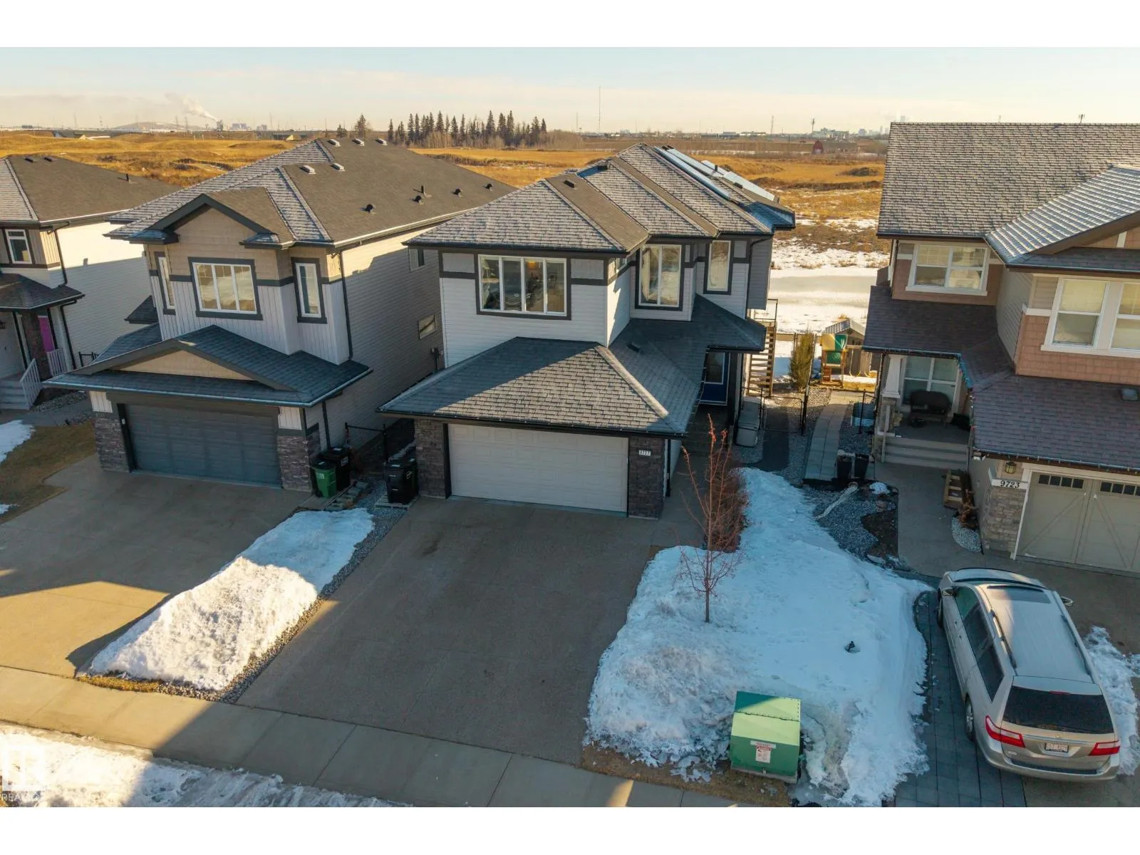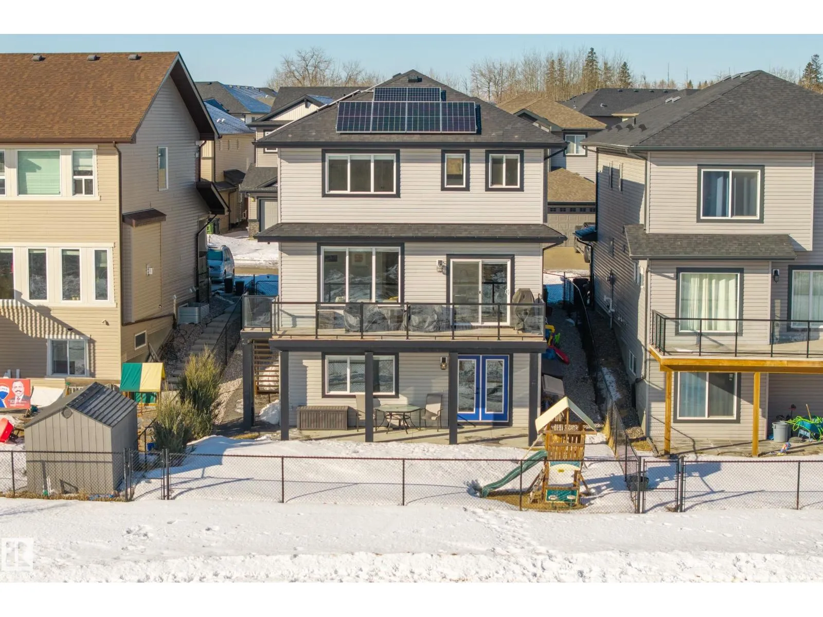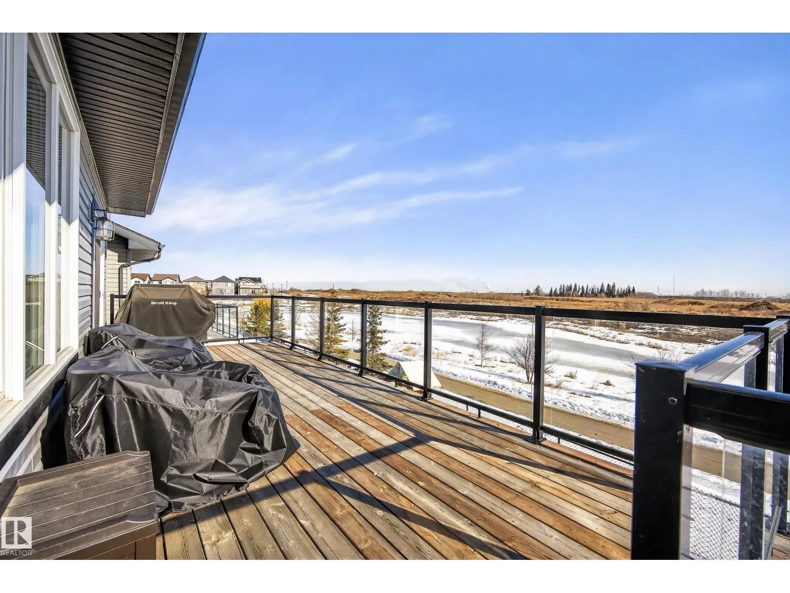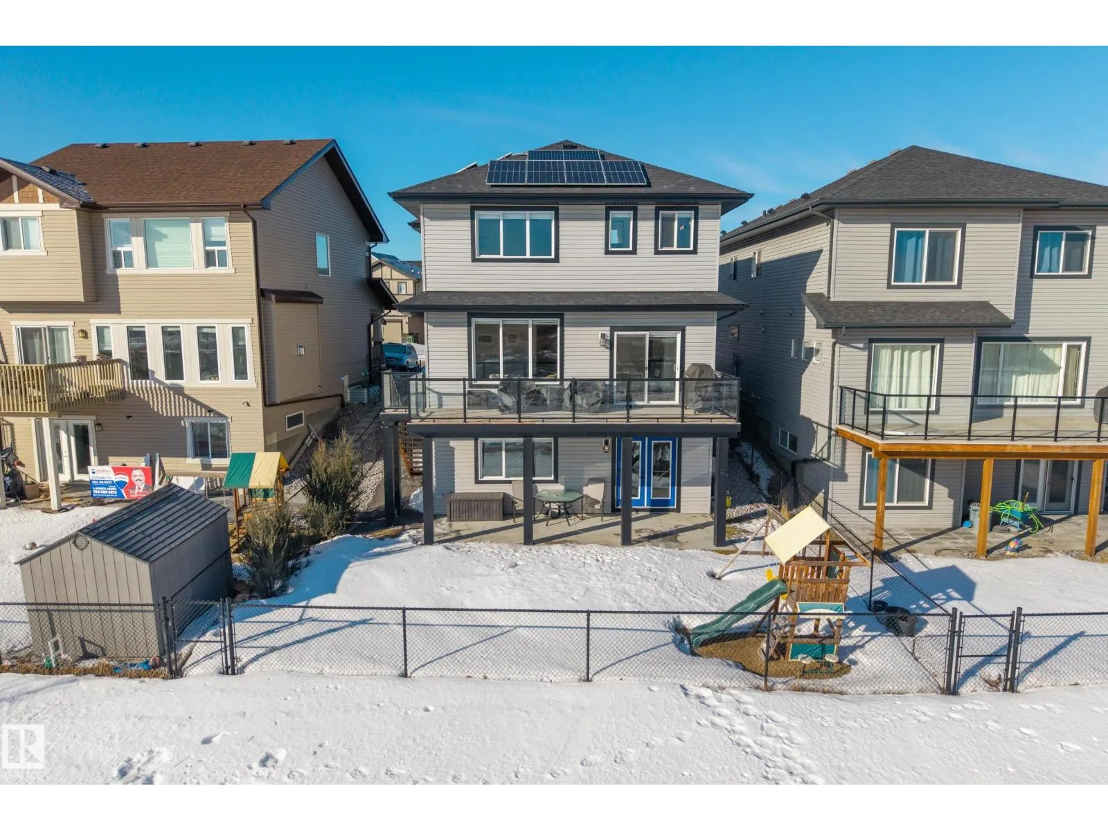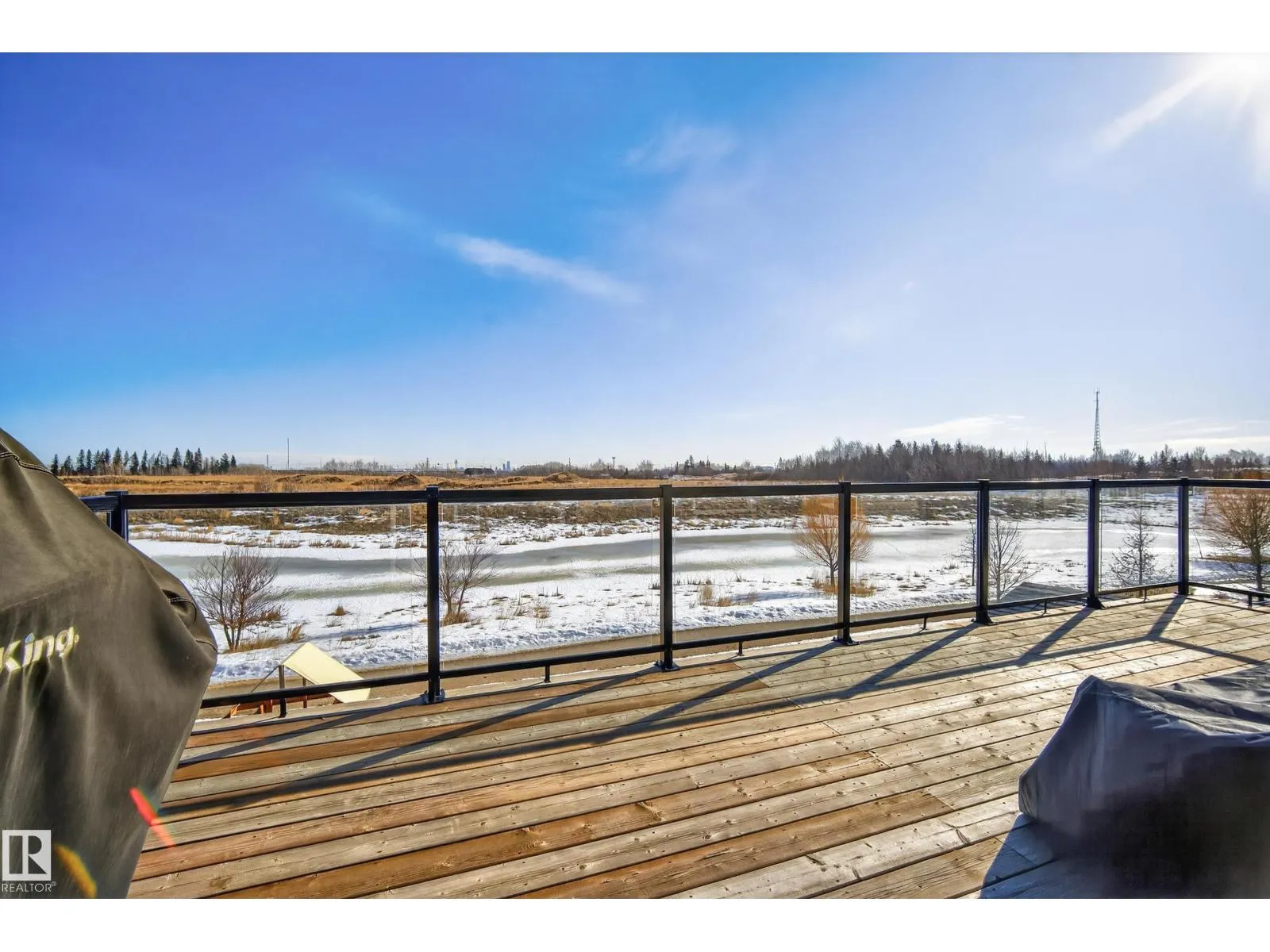 Rare pond-backing home on a quiet street with a walkout basement and double garage. The main floor features a beautiful kitchen with an oversized island, floor-to-ceiling cabinetry, butlerâs pantry, and massive 64-inch fridge/freezer. Just off kitchen is the impressive 10'x26' deck with glass railings, perfect for relaxing or entertaining while enjoying peaceful pond views and local wildlife. The inviting living room offers a cozy electric fireplace, while maple-stained railings lead upstairs to a bright vaulted bonus room. The upper level includes upgraded bathrooms with tile accents, quartz countertops, and floating cabinetry with under-cabinet lighting. The walkout basement with 9-ft ceilings adds a bedroom and great living space with a 90-inch projector screen for movie nights. Step outside to a 260 sq ft concrete patio with electrical roughed in for future hot tub and exterior stairs from the deck. Energy saving features include 6.2kW of solar panels and upgraded high-efficiency furnace and AC unit. (id:27476)