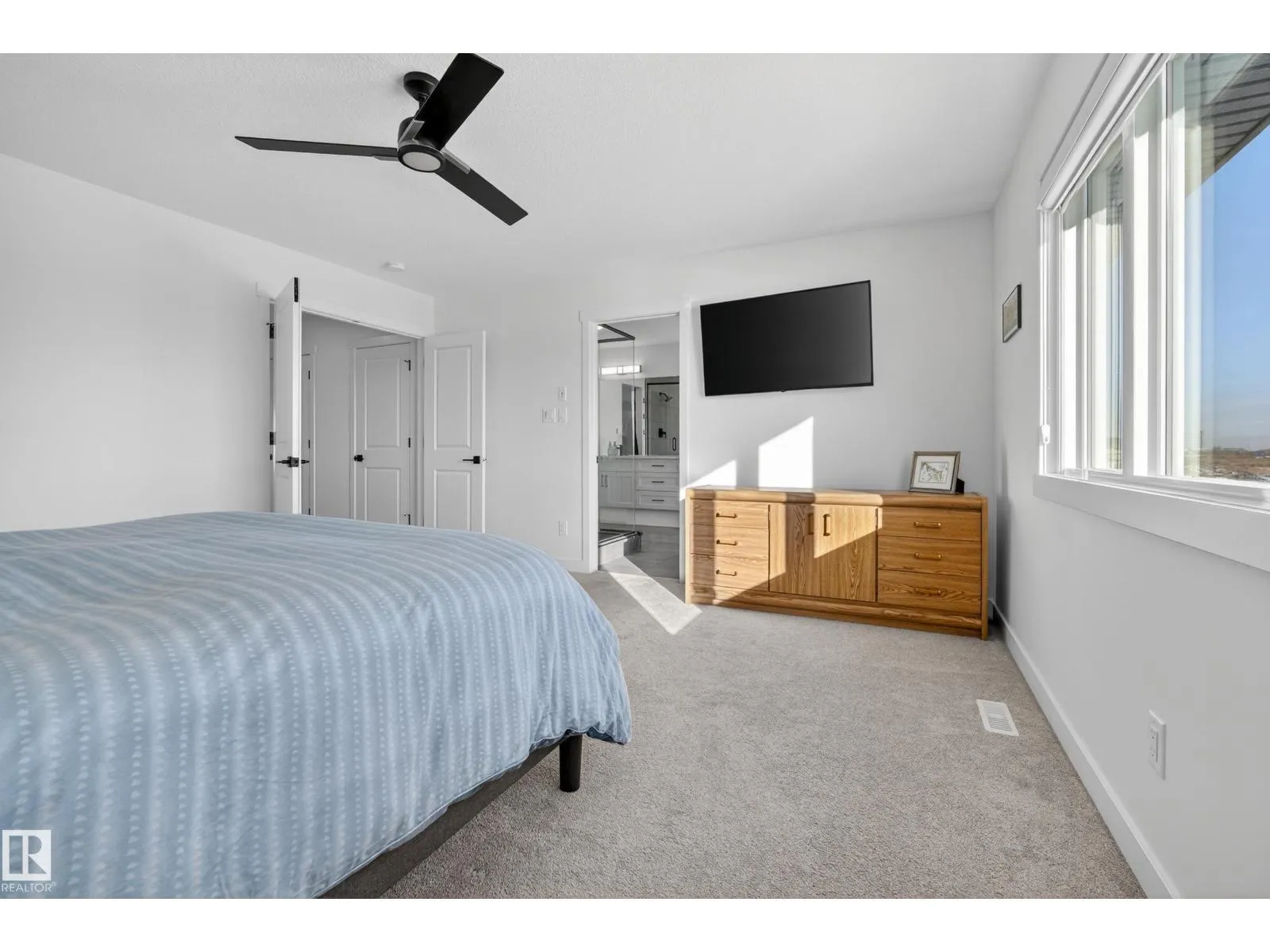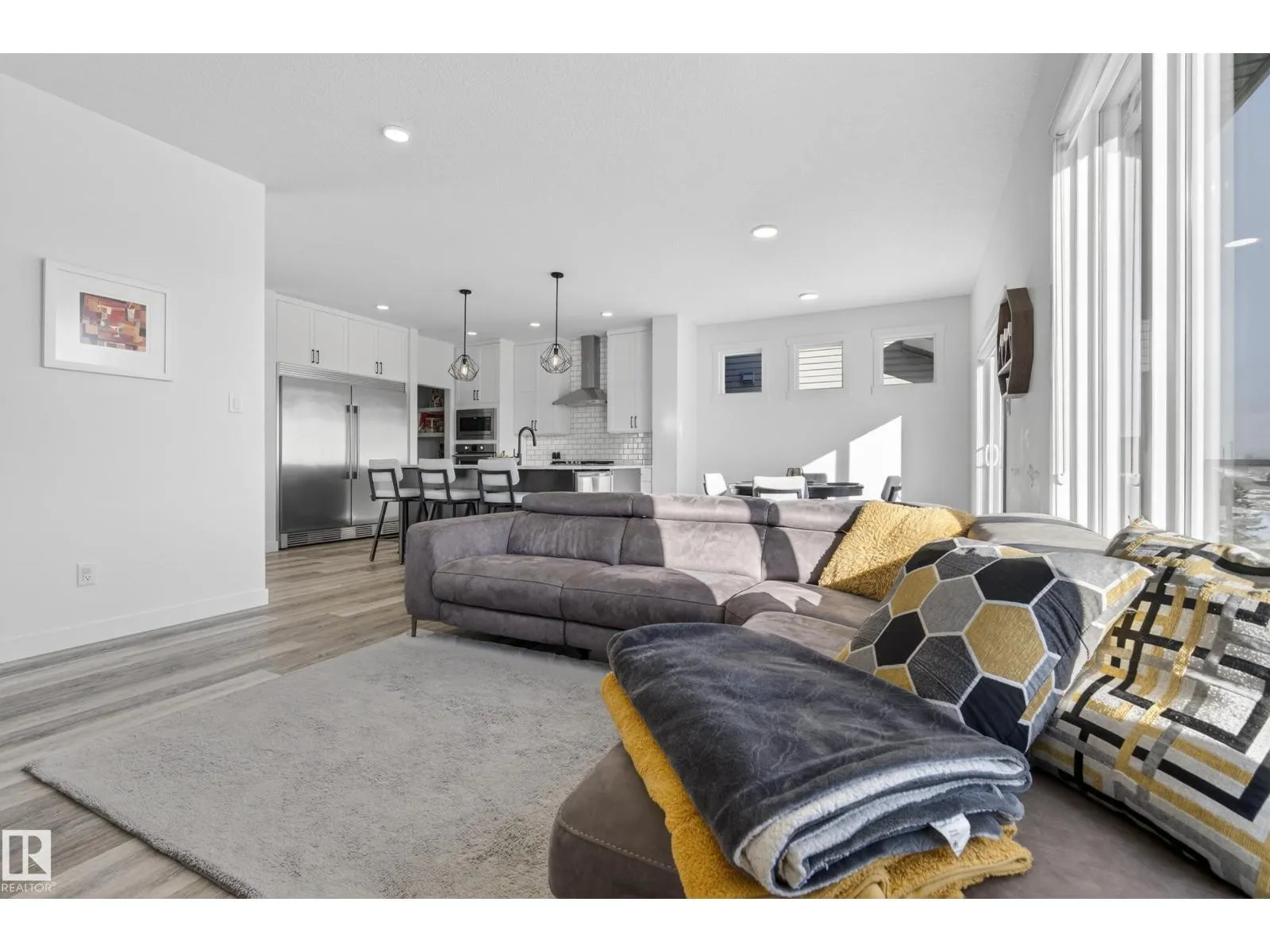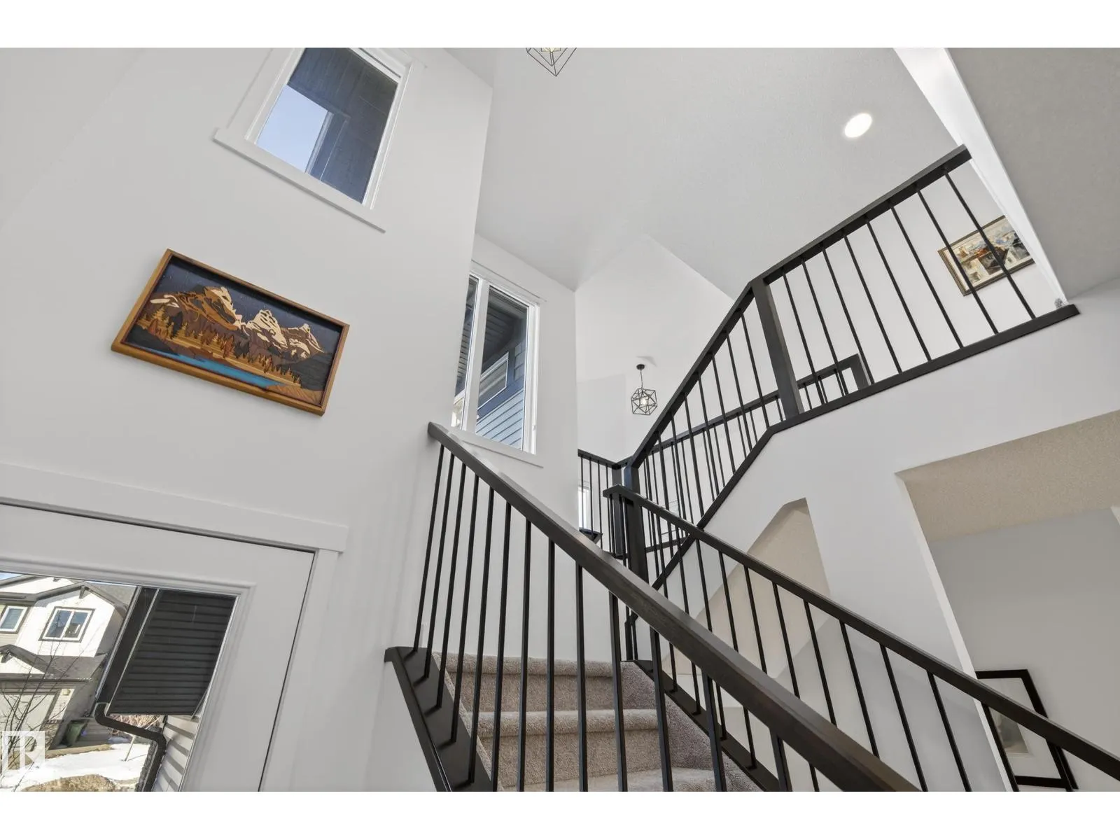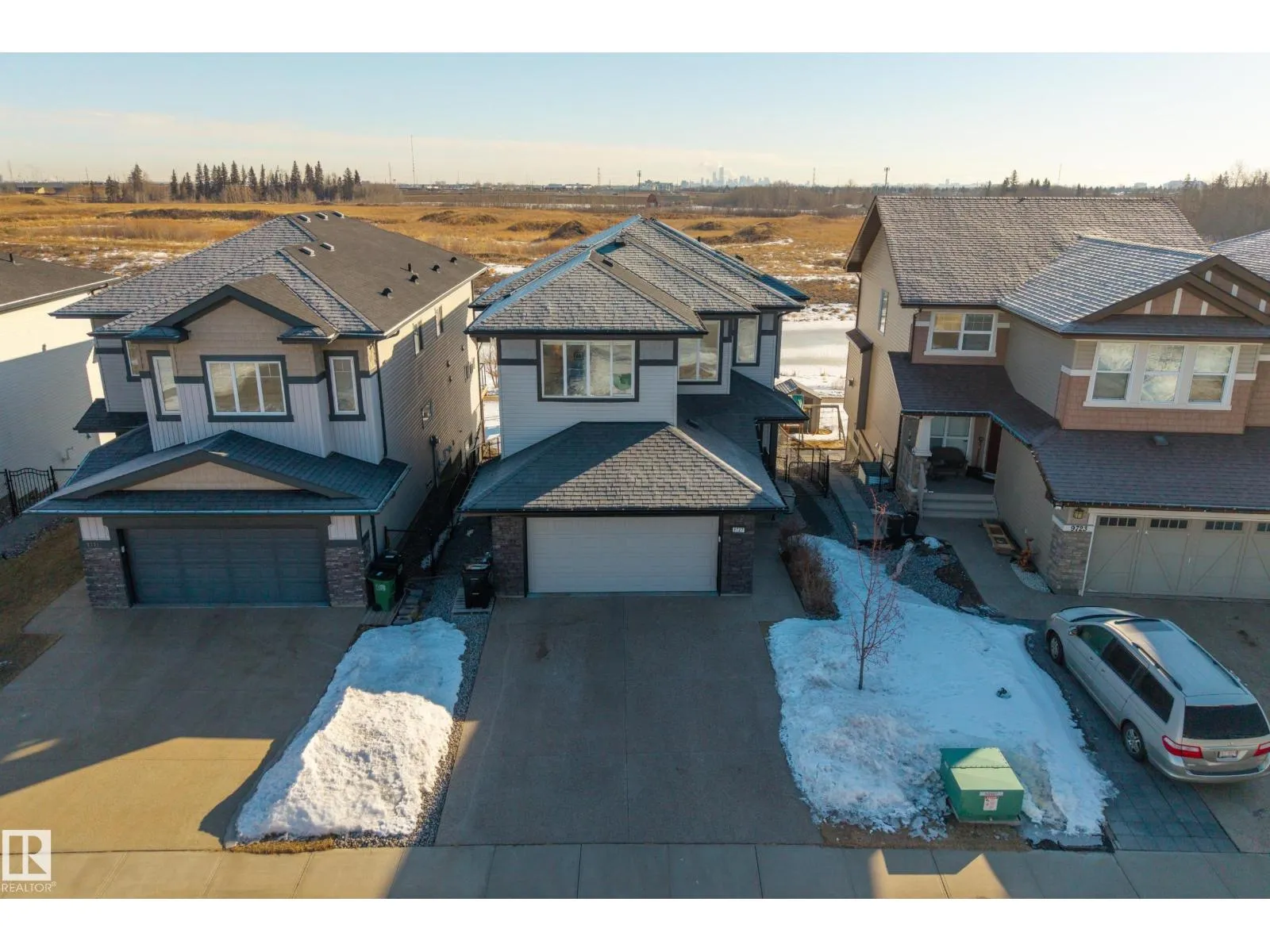 Rare pond-backing home on a quiet street with a walkout basement and double garage. The main floor features a beautiful kitchen with an oversized island, floor-to-ceiling cabinetry, butlerâs pantry, and massive 64-inch fridge/freezer. Just off kitchen is the impressive 10'x26' deck with glass railings, perfect for relaxing or entertaining while enjoying peaceful pond views and local wildlife. The inviting living room offers a cozy electric fireplace, while maple-stained railings lead upstairs to a bright vaulted bonus room. The upper level includes upgraded bathrooms with tile accents, quartz countertops, and floating cabinetry with under-cabinet lighting. The walkout basement with 9-ft ceilings adds a bedroom and great living space with a 90-inch projector screen for movie nights. Step outside to a 260 sq ft concrete patio with electrical roughed in for future hot tub and exterior stairs from the deck. Energy saving features include 6.2kW of solar panels and upgraded high-efficiency furnace and AC unit. (id:27476)