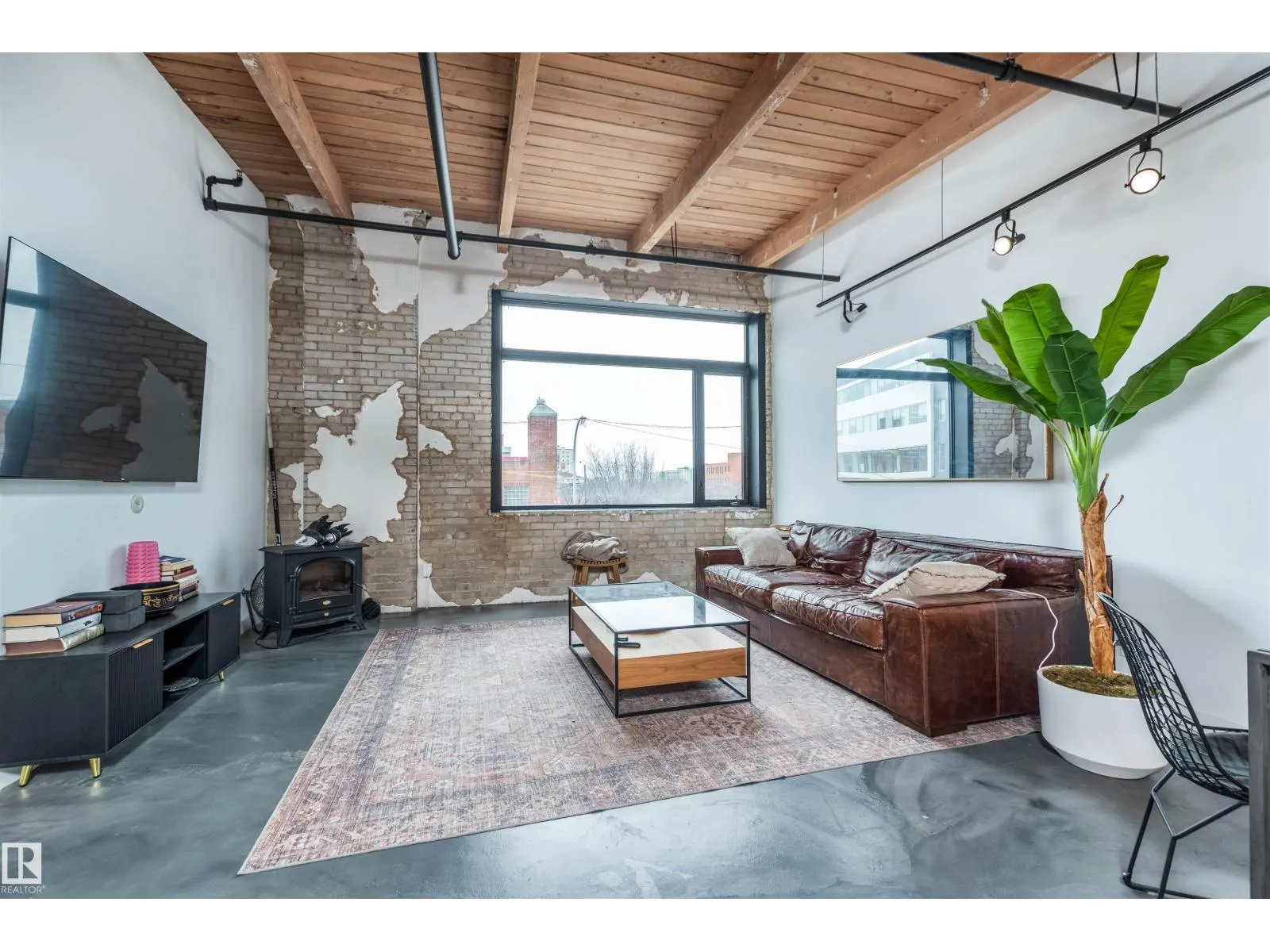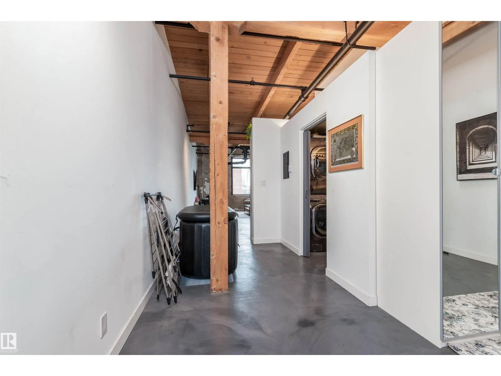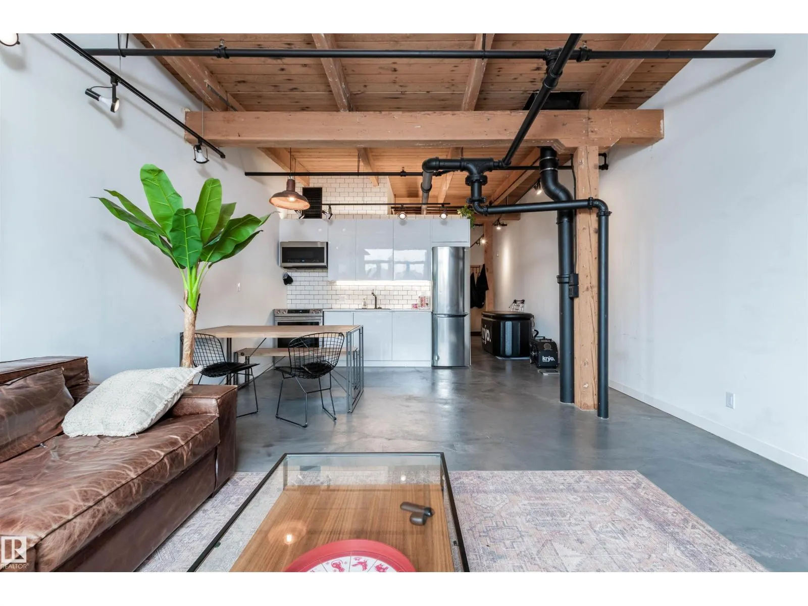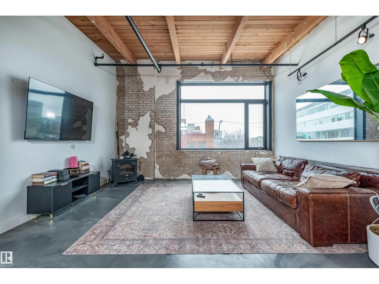 Welcome to Seventh Street Lofts and this stylish top-floor unit in the historic John Deere building, right in the heart of downtown Edmonton. Just steps to Grant MacEwan, Rogers Place, the LRT, shopping, dining, and transit, this unique loft blends industrial character with modern comfort. Renovated in 2018, it features updated appliances, concrete flooring, exposed beams and piping, a soaring 12-ft cedar ceiling, and an original brick feature wall. West-facing windows and a skylight in the bedroom fill the space with natural light. A rare loft layout places the bathroom between the bedroom and living area, offering added privacy and extra storage. This unit also includes in-suite laundry and an assigned parking stall. Airbnb-friendly building offers excellent flexibility and income-generating potential. (id:27476)