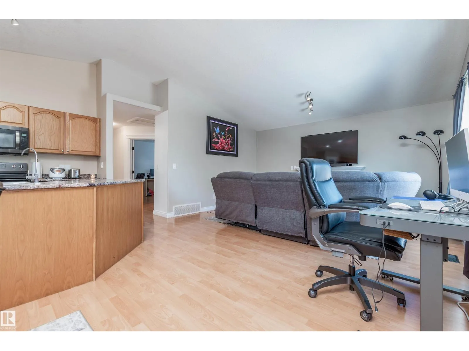 Beautiful, 1,270 sq ft, wheelchair accessible, centrally air conditioned bungalow located on a corner lot in desirable Hollick-Kenyon. This open and bright home features a spacious front entrance, vaulted ceilings, updated lighting, and laminate flooring throughout the main floor. The large living room offers a cozy gas fireplace, while the kitchen includes black appliances, ceramic tile, and a convenient corner pantry. The dining area features patio doors to a large deck overlooking a fully fenced backyard. There are 2 bedrooms and 4 pce bath on the main floor. The primary bedroom includes a walk in closet and private 4-pce ensuite, The fully finished basement offers high ceilings, large windows, a spacious recreation room, two additional bedrooms, and a large 3-pce bathroom with a double shower, seat, and rain shower. This home also features an attached oversized double garage. Ideally located close to schools, shopping, and Anthony Henday. (id:27476)