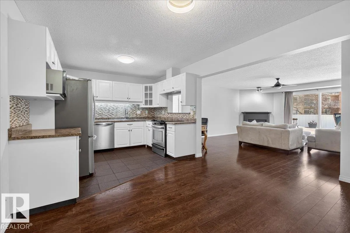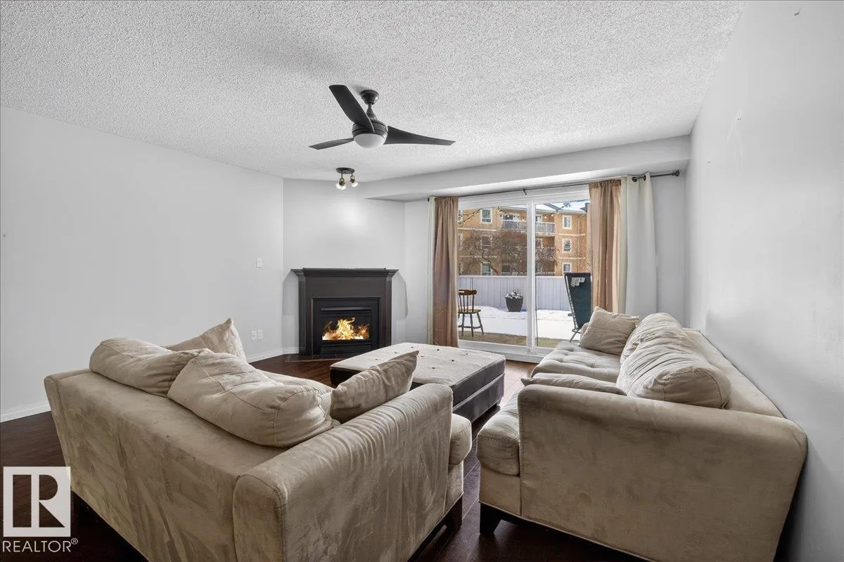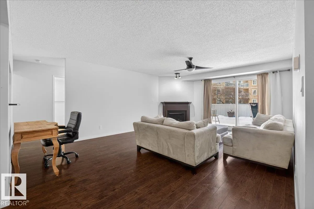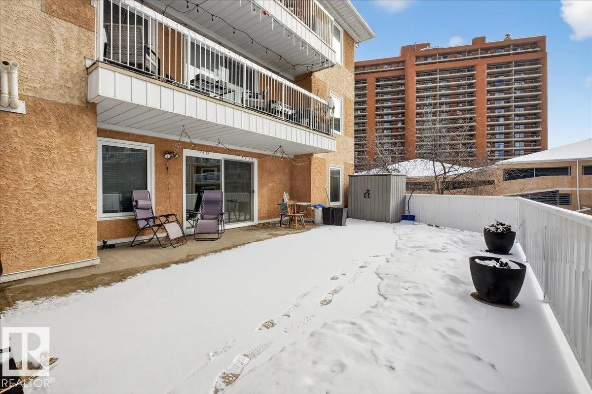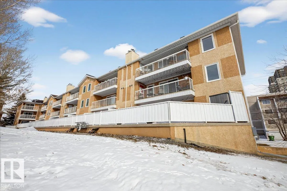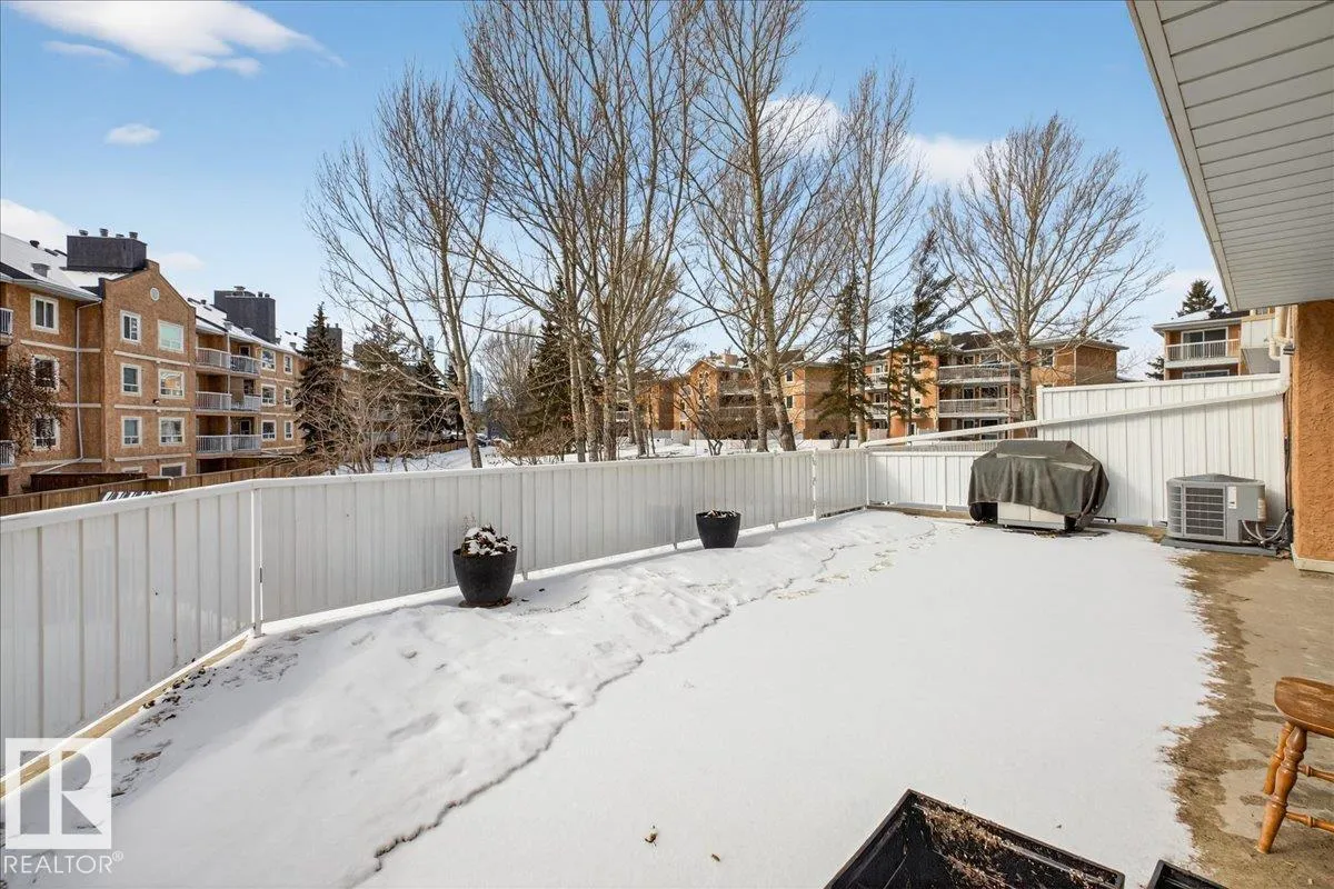 Enjoy downtown living without sacrificing space in this spacious condo offering over 1,300 sq ft of living space, just steps from the River Valley. This bright 3 bedroom, 2 full bathroom unit features a large exclusive-use south-facing patio/deck overlooking the courtyardâperfect for summer, complete with a natural gas BBQ line and additional storage. The updated kitchen offers white cabinetry, newer stainless steel appliances, ample counter space, and laminate flooring, opening to the dining area with a passthrough to the expansive living room filled with natural light from patio doors. The primary bedroom fits a king-sized bed and includes a 4-piece ensuite. Additional highlights include central A/C, a gas fireplace, in-suite laundry, and TWO heated underground parking stalls. Building amenities include an exercise room and sauna. Ideally located minutes to Downtown, Rogers Place, LRT, Little Italy, and Commonwealth Stadium. (id:27476)